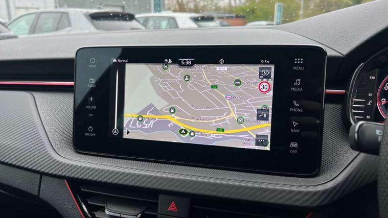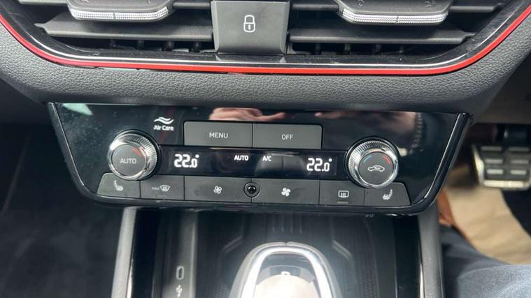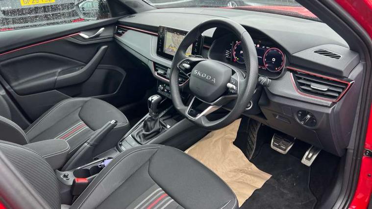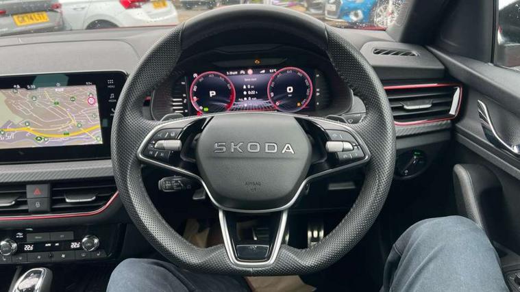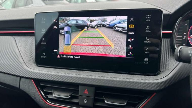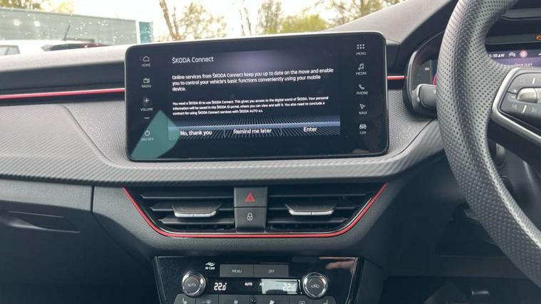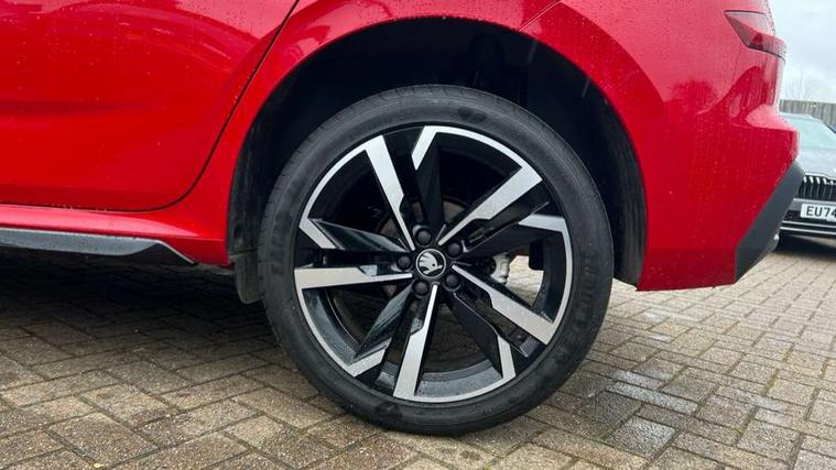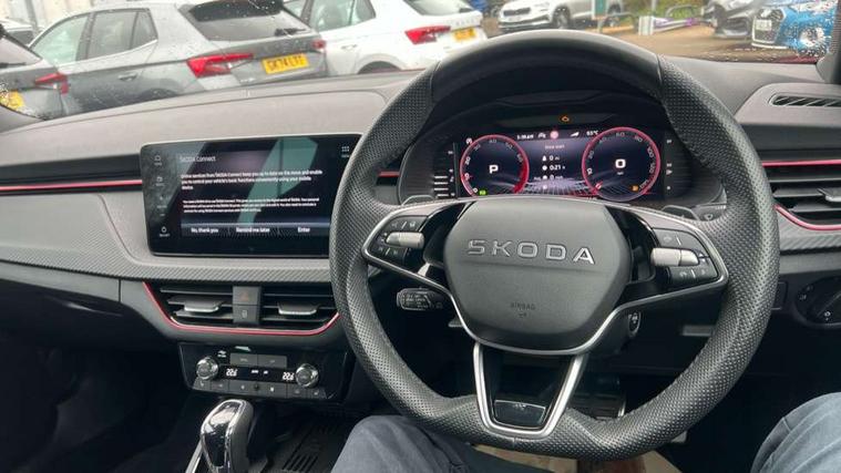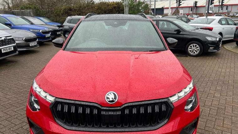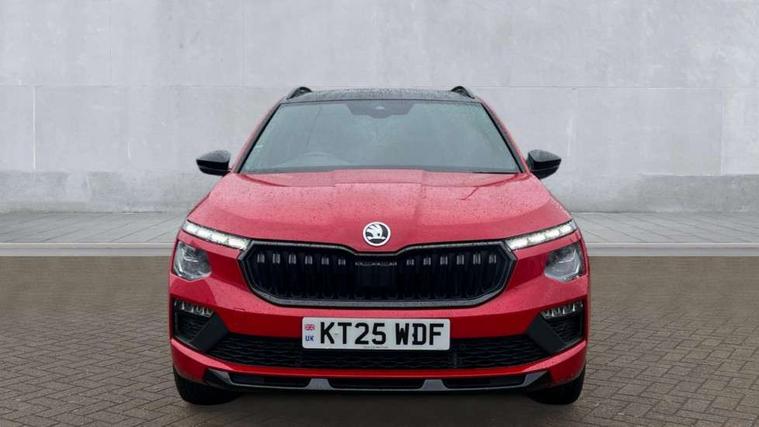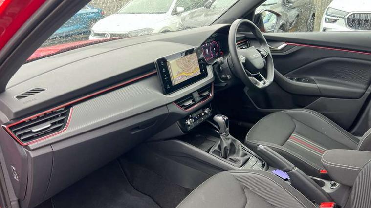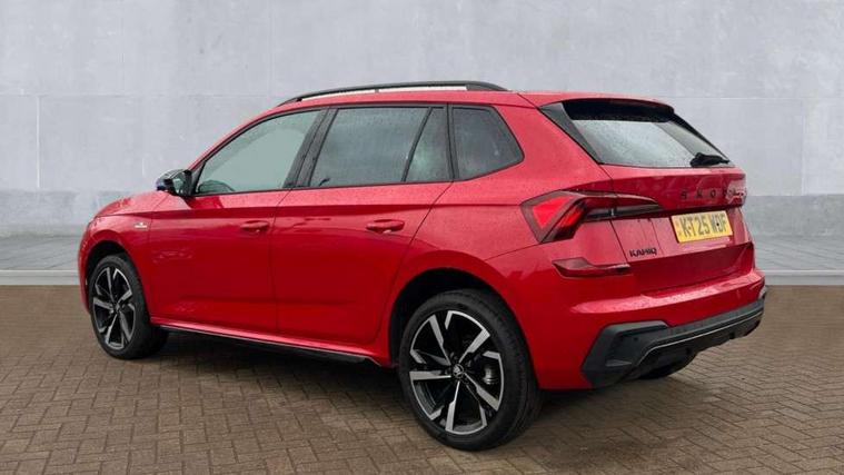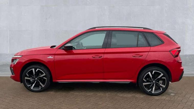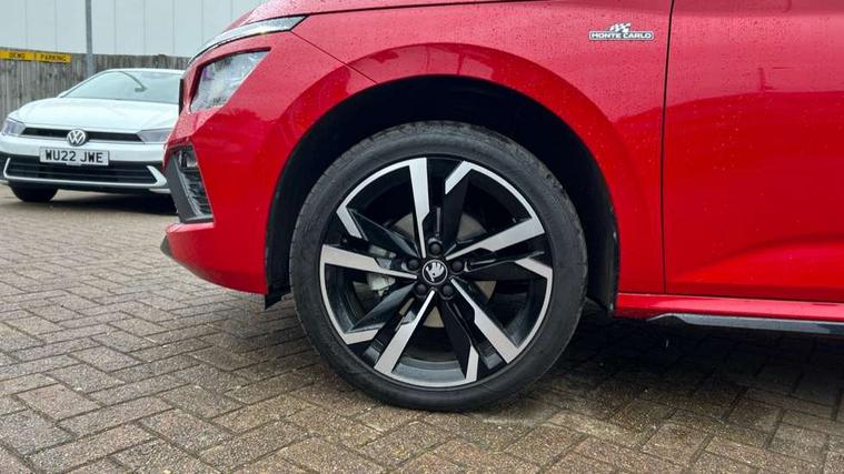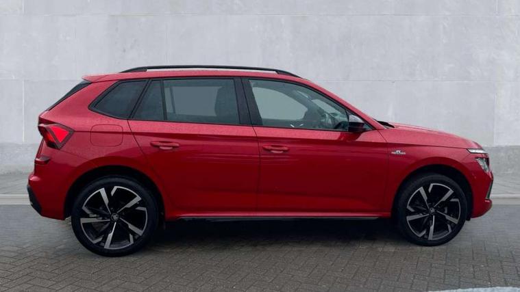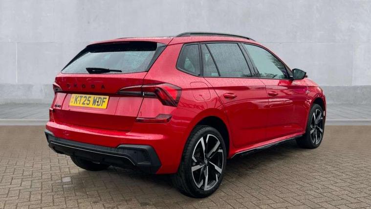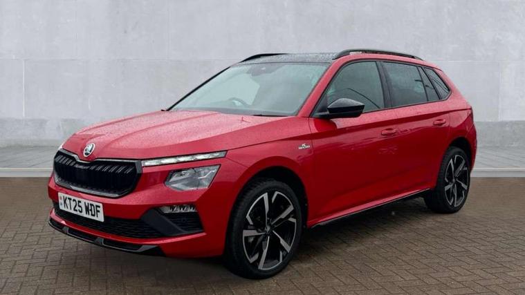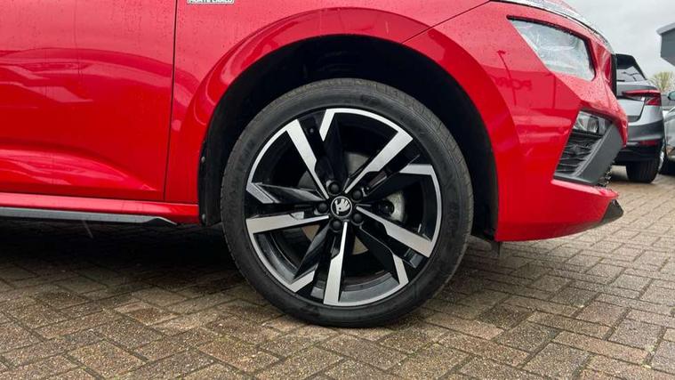 Advanced driver attention and drowsiness monitor, Bluetooth system, E-call, Front assist system, PAS, Rear parking sensors, Rear view camera, Service indicator, Speed limiter, Traffic sign recognition, Virtual cockpit with 10.25" display, Voice control system, Wireless smartlink, 4 USB C ports, 8 Speakers, 9.2" Skoda navigation display, DAB Digital radio, Auto dimming rear view mirror, Automatic headlight control with coming home and leaving home feature, Black door mirrors, Black radiator grille, Black rear diffuser, Black roof spoiler, Body colour bumpers, Body colour door handles, Boot lettering in black, Extended tailgate glass, Fixed panoramic sunroof with black roof rails, Front and rear electric windows, Heated rear window, LED daytime running lights, LED high beam, LED low beam, LED third brake light, Light sensors, Monte carlo plaque, Privacy glass, Rear side wing doors, Rear wiper, Ticket holder inside windscreen, 12V socket in luggage compartment, 3 seat bench in 2nd row, Aluminium pedals, Ambient lighting in white/red, Art leather carbon decor inserts, Art leather carbon door inserts, Black roof lining, Cargo elements, Chrome inner door handles, Driver and passenger sun visors with vanity mirror, Dual zone climate control, Front and rear roof lights, Front centre armrest, Front head restraints, Glove compartment with illumination, Height adjustable driver seat, Height adjustable front passenger seat, Ice scraper, Inner circulation control with pollen filter, ISOFIX on front passenger seat, Isofix preparation for back seats, Leather gearknob and handbrake lever, Manual lumbar support for front seats, Monte Carlo cloth upholstery, Net package and top tether hooks in boot space, Net under rear shelf, Pocket on the back of both front seats include mobile phone pockets, Rake/reach adjustable steering wheel, Reading lights, Rear centre armrests, Red hotstamping, Single front passenger seat, Sports seats, Textile floor mats, Third rear headrest, Top tether for front passenger seat, Umbrella in driver's door, Light and view plus package - Kamiq, 3x3 point rear seatbelts, Airbags - driver and front passenger, Disc brakes, ESP, Extended and predictive pedestrian/cyclist protection, Front passenger airbag deactivation switch, Front side airbags with curtain airbags, Hill hold control, Manual leather parking brake, Manual rear child locks, One tone horn, Seatbelt reminder for driver an co-driver, Traction control, Tyre pressure monitor, Anti-theft alarm system with interior monitoring, backup horn, towing protection and remote central locking with SAFE system, Anti-theft wheel bolts, Electronic engine immobilizer, 18" Ursa black diamond cut alloy wheels,