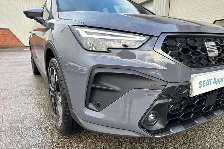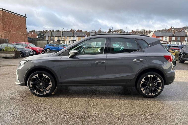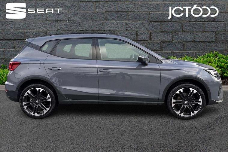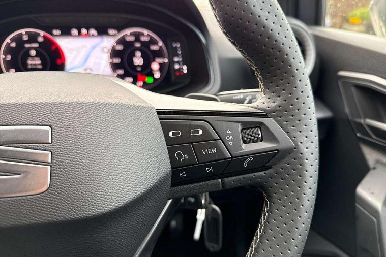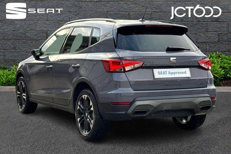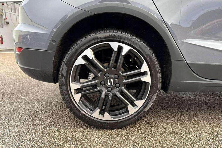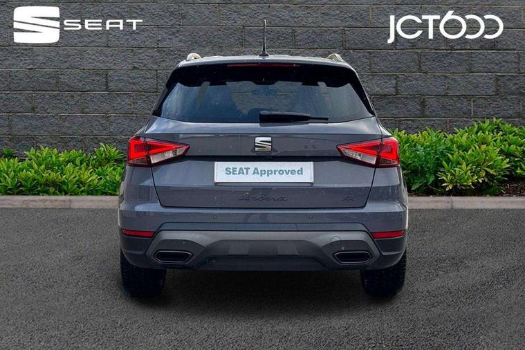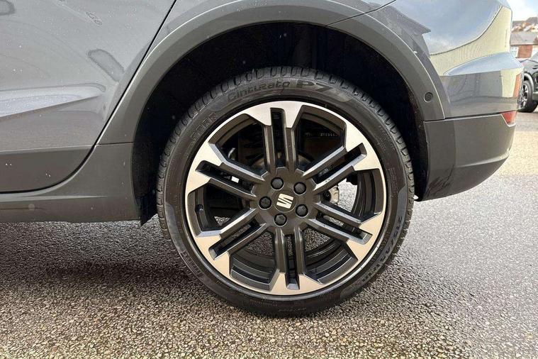 'Lights On' Reminder warning buzzer, 10" Digital cockpit, Digital clock, E-call, Electric speed sensitive power steering, Front parking sensors, Full link smartphone integration with mirror link, wireless apple carplay, Google android auto + USB Type C cable for apple and android devices, Low fuel warning light, Outside temperature display, Rear view camera, RPM counter, SEAT Drive profile - Four different models normal-sport-eco-individual, steering response, throttle response and gear shifts mode, Trip computer, Wireless phone charger, 9.2" colour touchscreen with navigation system, voice control and USB port (type c), Bluetooth interface for hands free and audio streaming, DAB digital radio and AM/FM radio, Steering wheel mounted audio controls, Anti theft roof antenna, Auto dimming interior rear view mirror, Automatic activation of hazard warning lights, Black roof rails and window surrounds, Body coloured bumpers, Body coloured door handle inserts, Dark tinted rear windows, Electric front/rear windows, Electrically adjustable, heated and folding door mirrors, Front fog lights with cornering function and rear fog light, LED 3rd brake light, LED daytime running lights, LED rear tail lights and licence plate lights, Protective side mouldings, Rain sensing wipers, Rear side wing doors, Rear spoiler, Rear window wash/wipe, Roof colour door mirrors, SEAT design Full LED automatic headlamps with dynamic headlight range control, coming and leaving home feature, Twin exhaust pipe styling with double flow exhaust pipe, Visible VIN plate, 2 cupholders, 3 seat bench in 2nd row, 60/40 split folding rear seat, Aircare filter, Black headliner, Cloth upholstery with embossed textile/Sport bucket seats, Double boot floor, Driver sunvisor with covered mirror + card holder, Dual zone climate control, Front courtesy light with front reading lights, Front seat back storage pockets, Heated front seats, Height adjustable front seats, Height/reach adjustable steering column, Illuminated air vent surrounds, Interior ambient lighting, Interior light in footwell, central console and door panel, ISOFIX points in outer rear seats with top tether anchorage points, Passenger sunvisor with vanity mirror, Perforated flat bottomed leather steering wheel/gear knob/handbrake with red stitching and FR logo, Red coloured interior air vents, Single front passenger seat, Steering wheel mounted gearshift paddles, Two front and three rear height adjustable headrests, Interior chrome pack - Arona, Safe and driving pack (S) - Arona, Storage pack - Arona, 3 point seatbelts on all rear seats, ABS, Active front headrests, Child locks on rear doors, Driver and front passenger airbags with front passenger airbag de activation, front side and curtain airbags, Emergency Brake Assist (EBA) and front assist, Front and rear seatbelt reminder, Hill hold control, Multi-Collision braking, Tiredness recognition system, Traction control, Tyre pressure monitoring system, Anti-theft alarm (perimeter and interior monitoring) with backup horn and towing protection, Central locking with radio remote control, interior controls and SAFELOCK, Deadlock, Electronic engine immobiliser, KESSY Keyless entry and go, Locking wheel bolts, 18" Performance machined alloy wheels in black,