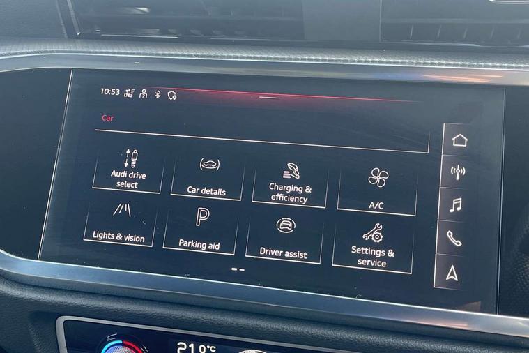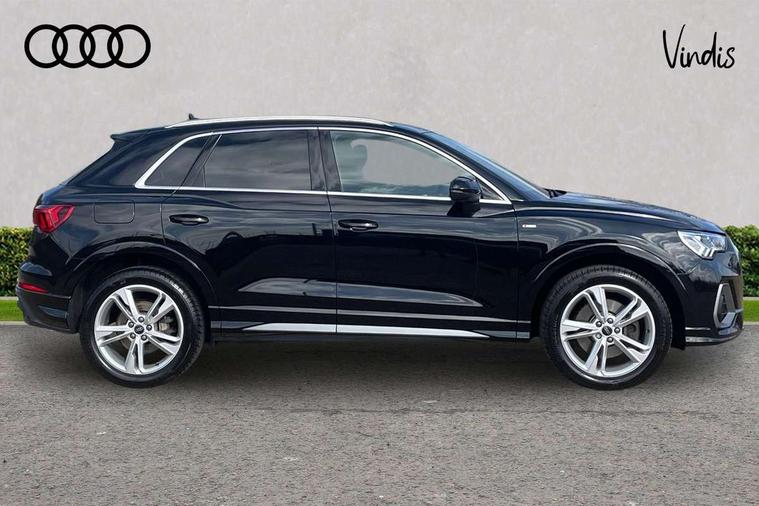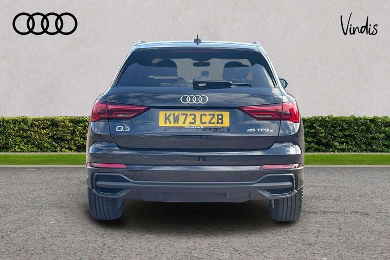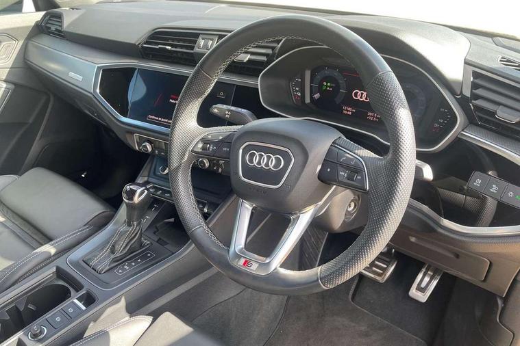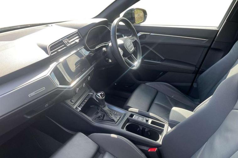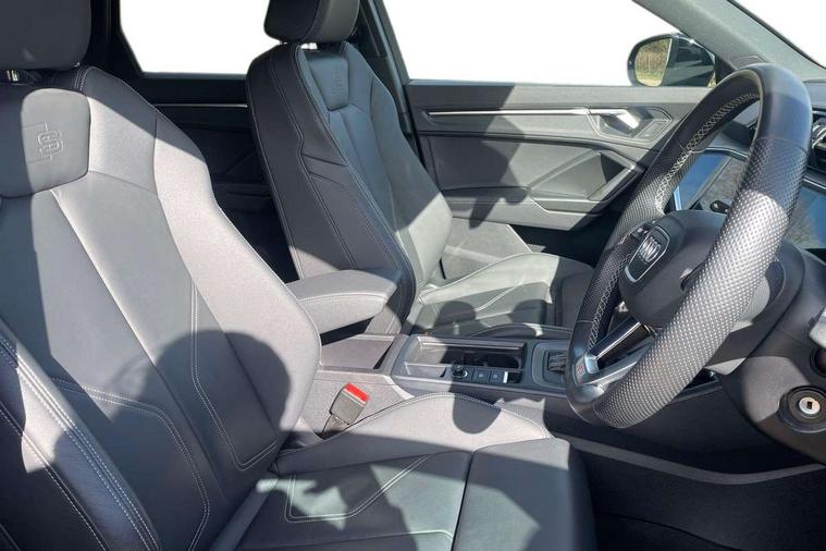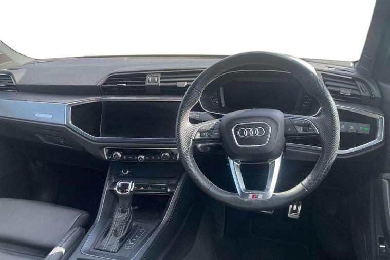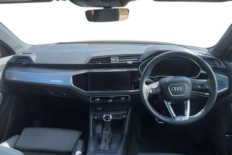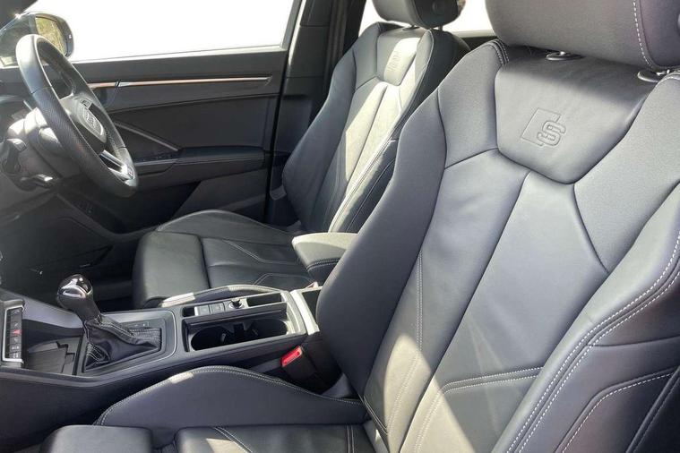 Amazon alexa Integration, Audi drive select, Audi lane departure warning, Audi Virtual Cockpit - 10.25" display, Bluetooth interface, Camera based traffic sign recognition, Legal emergency call, MMI Navigation Plus with high resolution 10.1 inch touchscreen colour display, Power operated tailgate, Progressive steering, Service interval indicator, Smartphone interface includes wireless Apple carplay/Android Auto, Start stop system with recuperation, Voice control system with natural language interaction, 3 pin 10 amp domestic charging cable, 3.6 kw On-board charger, Type 2 mode 3 32 amp charging cable, Type 2 socket for AC charging, 2 USB-C ports with charge and data functions, 6 passive loudspeakers, DAB digital radio module, Acoustic windscreen, Aluminium roof rails, Aluminium window trim, Anthracite black radiator grille, Auto dimming frameless rear view mirror, Body colour front spoiler blade, Body coloured bumpers, Electrically folding, adjustable and heated door mirrors with integrated LED side indicators and kerb view function for passenger side, Front and rear electric windows, Front fog lights, Front side air inlets in matt platinum grey, Grille vertical bars in aluminium silver/Matt, High gloss black finish B and C pillars, LED Dynamic rear indicators, LED headlights with LED daytime running lights, LED rear lights, LED third brake light, Privacy glass dark tinted rear and rear-side windows (from B-pillar backwards), Rain and light sensors, Rear diffuser grille in grained matt black, Rear diffuser strip in matt anthracite black, Rear side wing doors, Rear wiper, S line badges on front wings, S Line front and rear bumpers, Side skirt insert in matt Platinium grey, Variable front intermittent wipers, 12V socket in rear centre console, 3 seat bench in 2nd row, 3 spoke leather multifunction steering wheel features S badging and grips in perforated leather with contrast stitching, 40:20:40 folding with manual adjustment for 60:40 forwards/backwards position and backrest angle, Adjustable rear seat bench/backrest with centre armrest and cupholder, Black cloth headlining, Dual zone electronic climate control, Front and rear black floor mats with contrast stitching in rock grey, Front and rear headrests, Front and rear roof module including reading lights, Front centre armrest, Glove compartment lighting, Height and reach adjustable steering wheel, Illuminated door sill trims with S logo, ISOFIX child seat mounting for front passenger with airbag deactivation and outer rear seat including top tether attachment point for outer rear seats, Luggage compartment light, Manual front seats with height adjustment, Perforated leather gearknob, Single front passenger seat, Stainless steel luggage compartment sill finisher, Stainless steel pedals, Ambient lighting pack - Q3, Non smoking pack - Q3, 3x3 point rear seatbelts, 6 airbags - Driver, front passenger, curtain and side windows, Audi pre-sense front with pedestrain and cyclist recognition, Electrically operated child locks on rear doors, Electromechanical parking brake, Electronic stabilisation control including ABS, ASR and EDL, Front seatbelt reminder, Hill descent control, Hill hold assist, Pre sense basic, Seatbelt monitoring, Tyre pressure warning, Warning triangle and first aid kit, Anti theft alarm, Anti theft wheel bolts, Immobiliser, Remote central locking, Aluminium look interior elements, Dark matt brushed aluminium inlay, Detail dashboard around MMI touch colour display in glass look, black with surround in aluminium look, Leatherette door armrest, Tool kit, Tyre repair kit,