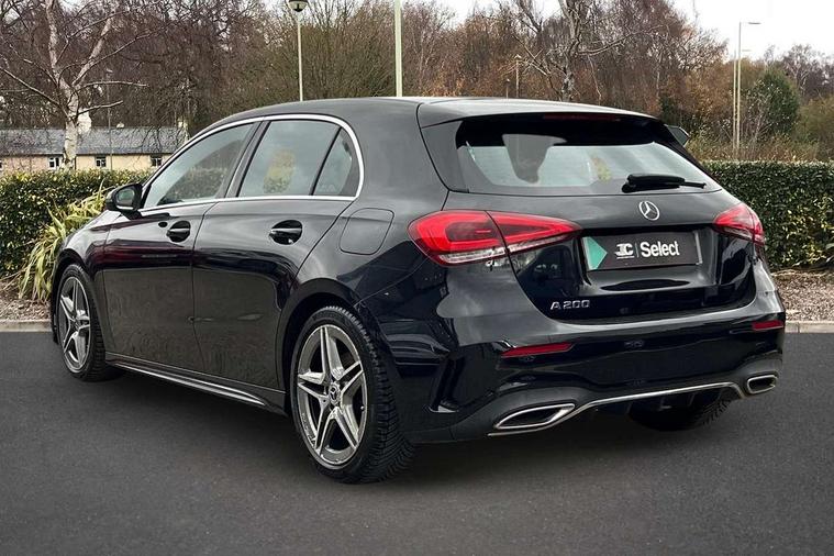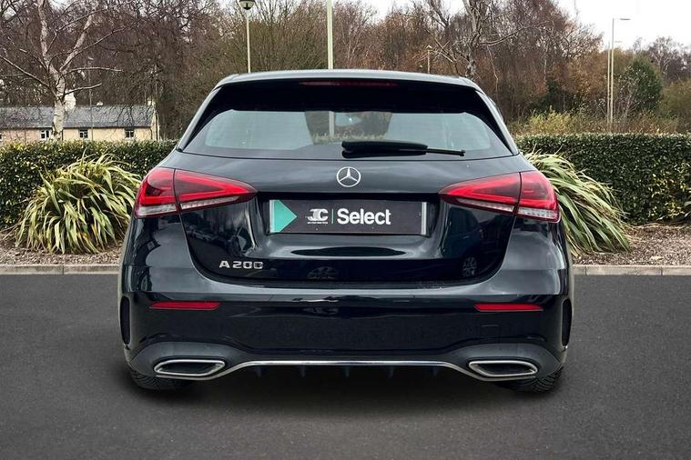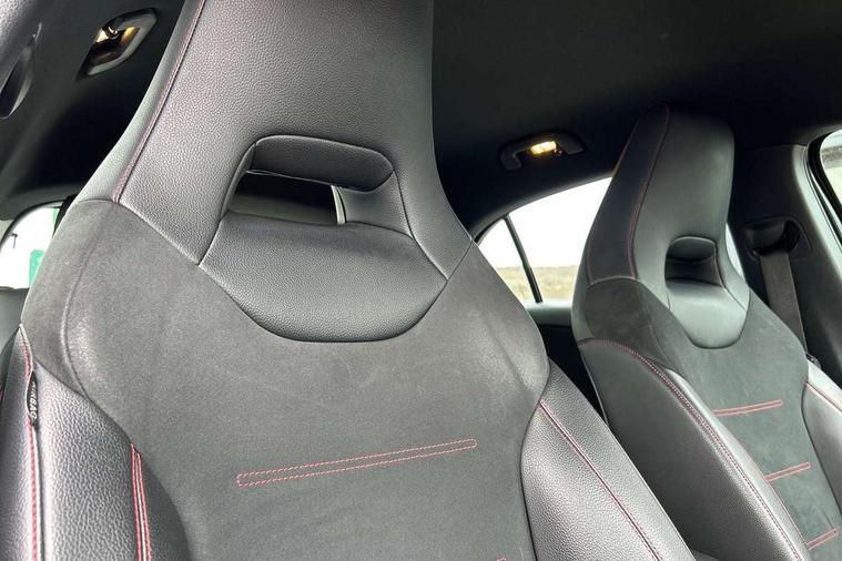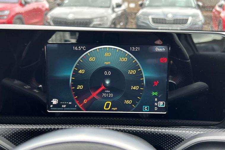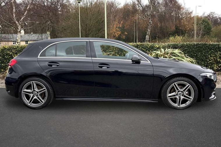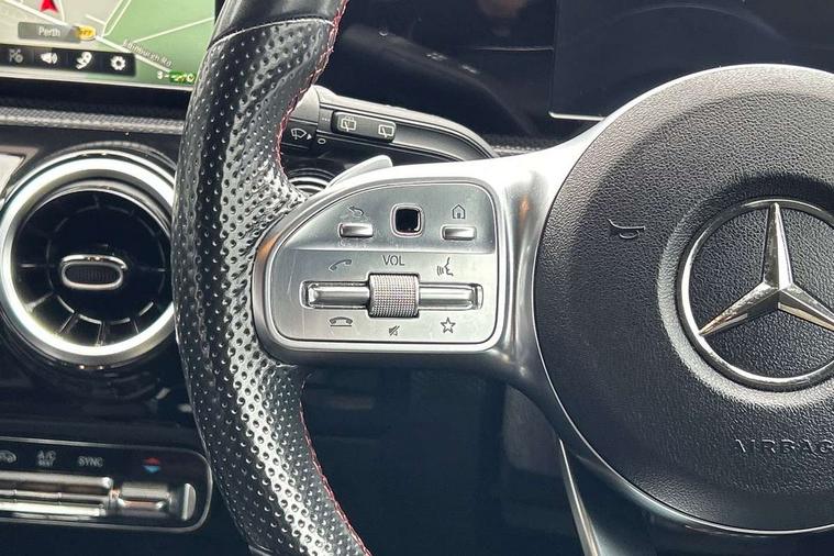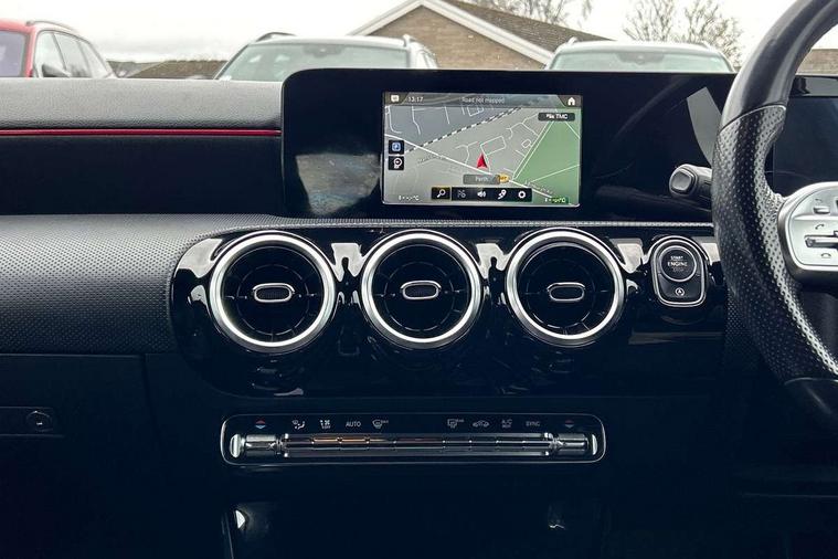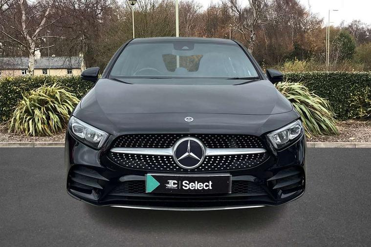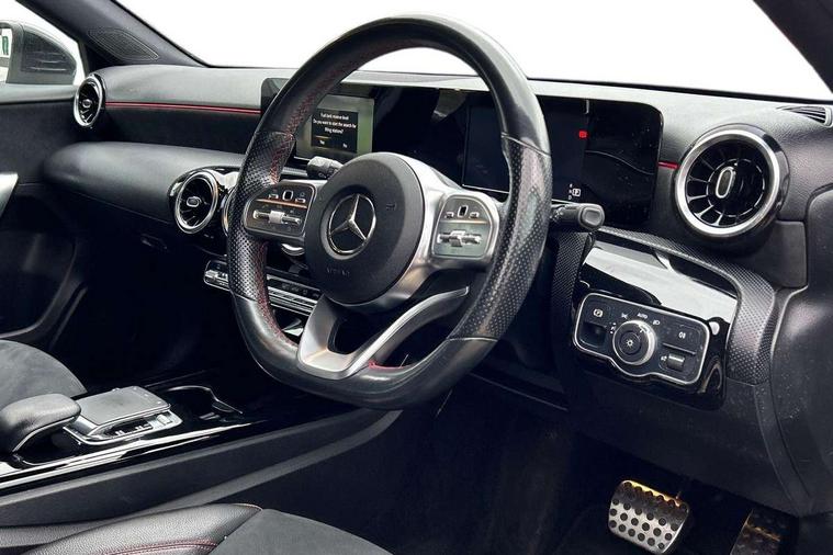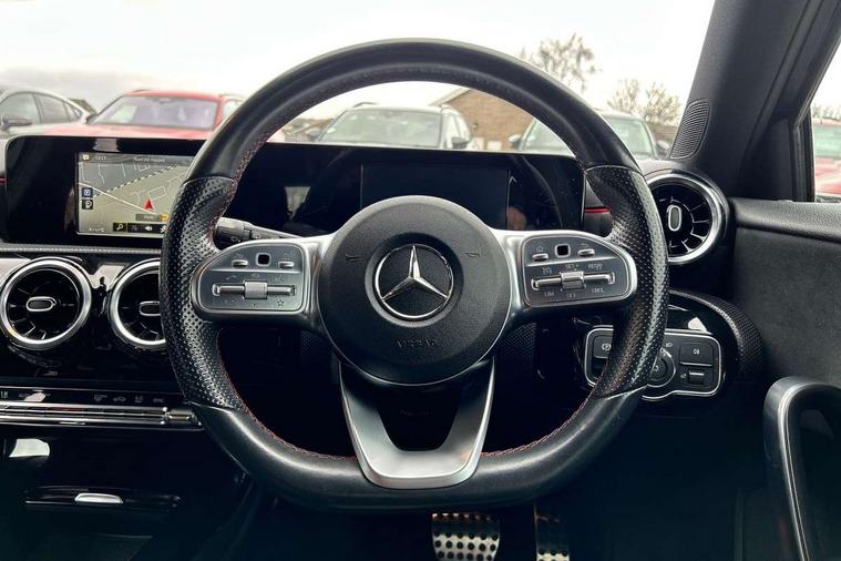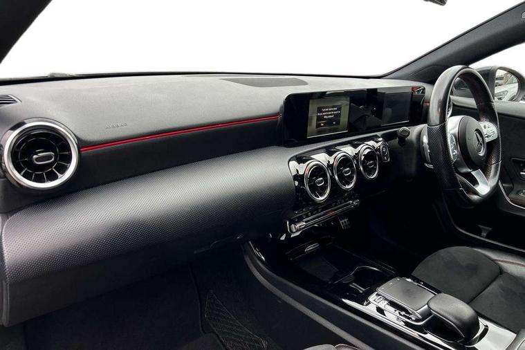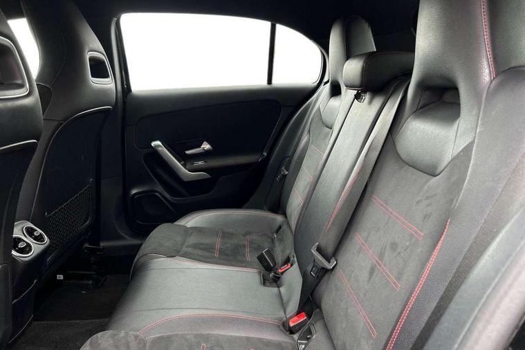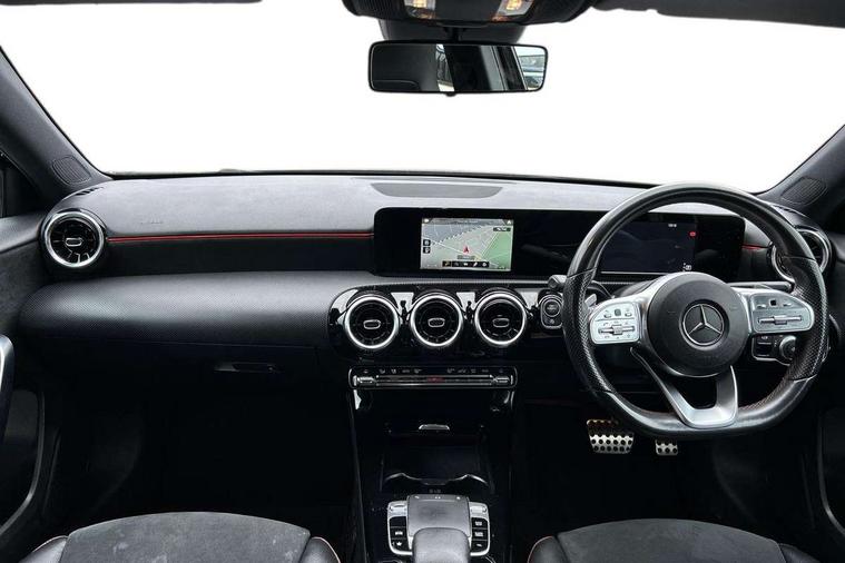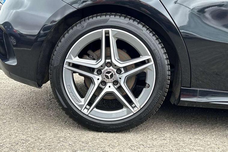 7" colour screen in instrument panel, 7" tablet style colour display, Active lane keep assist, Attention assist, Bluetooth interface for hands free telephone, Bulb failure indicator, Cruise control + speed limiter, Direct steering, DYNAMIC SELECT with a choice of driving modes (ECO, Comfort, Sport, Sport+ and Individual), External temperature gauge, HDD Navigation system, Low fluid warning light, Mercedes connect me with remote online services, Radio aerial integrated into roof spoiler, Reversing camera, Service indicator (ASSYST PLUS), Speed sensitive power steering, Stop/start system, Trip computer, Voice control system, Warning lamp for direction indicators, Lowered comfort suspension, 2 USB ports in centre console, DAB Digital radio, MBUX Multimedia system including digital instrument cluster and phone mirroring, Adaptive brake lights, AMG body styling, Body colour bumpers, Body colour door handles, Body colour side skirt, Body coloured door mirrors, Chrome beltline trim, Diamond radiator grille with chrome pins and silver louvre + chrome insert, Electric adjustable heated door mirrors, Electric front windows, Electric rear windows, Headlamp assist, Heated rear window with timer, High level third brake light, LED daytime running lights, LED Headlights, LED rear lights, Rain sensor windscreen wipers, Rear fog lights, Rear wiper, Twin Trapezoidal tailpipes, 1/3 to 2/3 split folding rear seats, 12V socket, 3 spoke flat bottomed nappa leather sport steering wheel, AMG floor mats with red stitching, Artico man-made leather/Dinamica upholstery, Auto Mercedes-Benz child seat recognition sensor, Black headlining, Brushed stainless steel sports pedals with rubber studs, Controller on centre console with chrome surround, Dual zone automatic climate control, Exit lights, Footwell lights, Front and rear reading lights, Front centre armrest with storage compartment, Front door sills with Mercedes Benz lettering, Front head restraints, Front seat backs luggage nets, Front sport seats, Gearshift paddles on steering wheel, Height adjustable front seats, Height/reach adjustable steering column, Illuminated cup holders, Illuminated glovebox, Illuminated storage compartment, Integrated head restraints, Interior door handle illumination, Isofix rear child seat preparation, Load securing rings in luggage compartment, Luggage compartment cover, Multifunction steering wheel, Oddments tray lighting, Reading lights, Rear head restraints, Storage compartment under load area floor, Sunvisors with illuminated vanity mirrors, Touchpad, Twin front cupholders, Seat comfort pack - A Class, 3 rear 3 point seatbelts, ABS with Brake Assist, Active bonnet, Brake calipers with Mercedes-Benz lettering + perforated brake discs, Child proof door locks, Crash responsive emergency lighting, Drivers knee airbag, Dual stage driver/passenger airbags, Electronic parking brake, ESP with ASR, Front and rear seatbelt reminder, Front head airbags, Front passenger seat occupancy sensor, Front side airbags, Hill start assist, Tyre pressure monitoring system, Warning triangle and first aid kit, Window airbags, Alarm system/interior protection/immobiliser, Keyless ignition, Remote central locking, Chrome air vent surrounds, 18" AMG 5 twin spoke light alloy wheels in titanium grey with highsheen finish, Tirefit sealant with electric air pump,