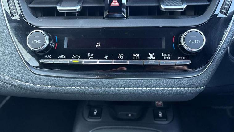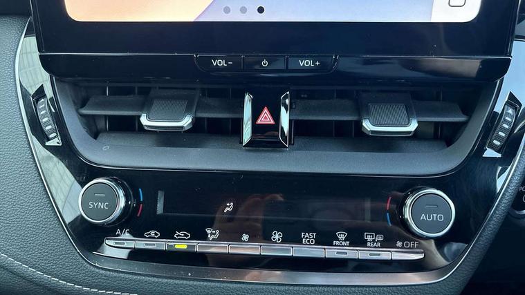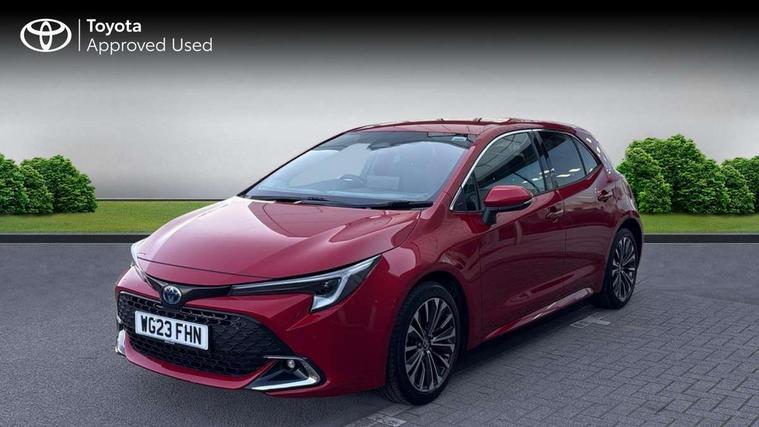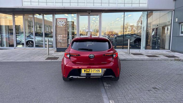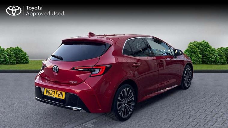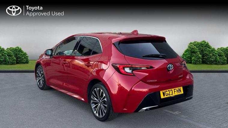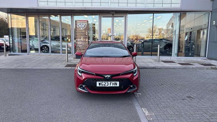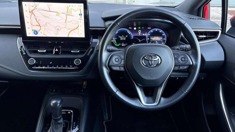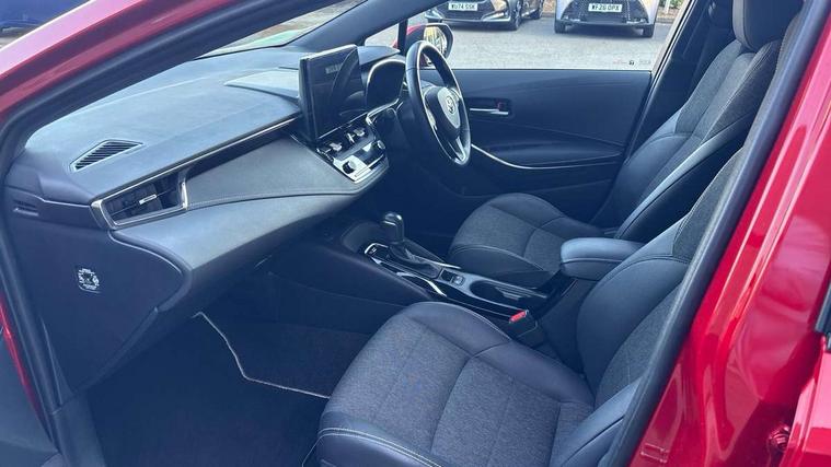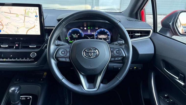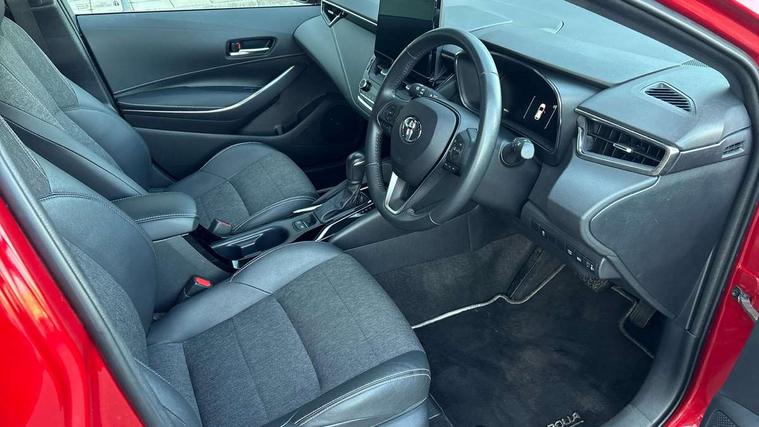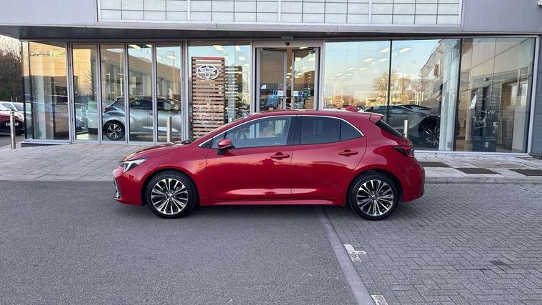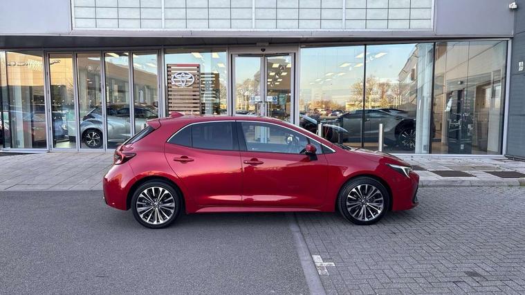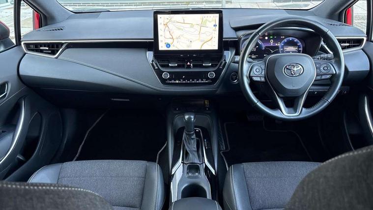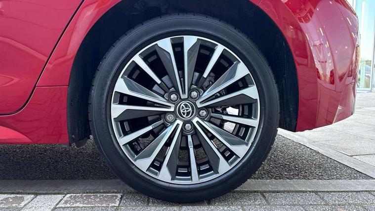 10.5" Multimedia display screen, Attention assist, Bluetooth telephone connectivity, Connected car functionality upgrade, tracker, remote status and e-care, Drive mode select (Eco, Normal), E-call, Electrically assisted power steering, EV drive indicator, Front and rear parking sensors with auto brake, Full Digital 12.3" TFT Digital Combimeter, Key reminder warning, Lane Departure Alert (LDA) switch on steering wheel, Memory on adjustable speed limiter, MyT connected services, Proactive driving assist (PDA), Reversing camera, Smartphone integration with Apple CarPlay and wired android auto, Tailgate, Toyota remote services, Toyota smart connect navigation, Wireless charger, Gasoline particulate filter, Vehicle Stability Control (VSC), 6 speakers, AM/FM radio, DAB Digital radio, Front USB-C in dashboard, Smart voice assist/ Voice recognition, USB and Aux in connectors + 12V front outlet, Anti-jam protection on power windows, Auto up and down function on all power windows, Automatic folding mirrors, Automatic headlights with high beam assist, Black centre and side air vents, Black metallic meshed front grille, Black toyota logo in front, Body coloured bumpers, Body coloured door mirrors, Body coloured front spoiler, Body coloured outside door handles, COROLLA alloy door scuff plates, Electrochromatic mirror, Follow me home headlights, LED daytime running lights, LED dual beam projector headlights, LED front fog lights, LED High mounted stop light, LED multi reflector in headlights, LED rear combi lights with LED lightguide, Manual headlight levelling system, New grille pattern, Noise reduction layer on windscreen, Piano black diffuser, Power adjustable heated door mirrors, Power front windows, Power rear windows, Privacy glass with UV filter, Rain sensing wipers, Rear bumper decoration with chrome plated inserts, Rear side wing doors, Rear under guard with chrome ornament, Rear window defogger, Rear window wiper, Reverse tilting door mirrors, Roof spoiler, Satin chrome insert on front air vents, Satin chrome insert on front door assist grips, Shark fin antenna, Tailgate release with push button, Time adjustment on intermittent wiper, Turning signal integrated indicators in door mirrors, Unique lower skirt, Unique side rocker with black insert, UV-filter on driver and passenger windows, 2 Shopping bag hooks in luggage compartment, 3 rear headrests, 3 seat bench in 2nd row, 3 spoke leather steering wheel with satin insert + gear knob, 4 tie down hooks in luggage compartment, 60/40 split folding rear seat, Adaptive cruise control (ACC) switch on steering wheel, Adjustable speed limiter switch on steering wheel, Audio, multimedia and telephone switches on steering wheel, Black armrest on centre console box, Black gear shift console, Boot light, Centre room light, Driver and front passenger personal light, Driver and passenger assist grip, Driver and passenger sun visor with mirror and light, Dual zone automatic air conditioning with ECO mode switch, Fabric/synthetic leather upholstery, Front and rear cup and bottle holders, Front door pockets, Front head restraints, Front passenger seat, Front sliding synthetic leather armrest, Heated seats, Illuminated entry system in room lamp, ISOFIX seat fixing (2 fixings on rear outer seats), Leather gear shift with satin chrome on gear shift console, Manual height adjustable for driver and front passenger seat, Manually tilt with sliding driver and front passenger seat, Parcel shelf, Passenger seat back pocket, Pollen filter, Power adjustable lumbar support on driver seat, Power window switches with satin chrome inserts, Rear armrest with 2 cupholders, Rear passenger coat hooks (2), Remote air conditioning, Satin chrome inside door handles, Satin chrome surround on heater control panel, Satin chrome surround on speedometer, Sliding armrest on centre console box, Slow opening glovebox with lights, Textile floor mats, Tilt/telescopic steering column, Voice recognition switch on steering wheel, Whiplash Injury Lessening (WIL) feature (active headrest) for seats, White ambient lighting on open tray and front cup holder, Toyota safety sense 3 pack - Corolla, 3x3 point rear seatbelts, Adjustable driver and front passenger seat belt extender to top anchor point, Anti lock braking system + Electronic brake force distribution, Brake assist function, Child locks on rear doors, Downhill Assist Control (DAC), Electronic parking brake, Emergency brake light signal (EBS), Front passenger airbag on/off switch, Front seatbelt reminder, HAC - Hill start assist control, Rear seat belt reminder, Seatbelt pretensioners and force limiters, Supplemental restraint system (SRS) 7 airbags - dual driver, dual side curtain, side impact and driver knee airbags, Traction control, Tyre pressure warning system, Acoustic vehicle alert system (AVAS), Alarm with motion sensor and immobilizer, Power passenger window lock, Remote central locking + deadlocks, Satin chrome dash trim, Soft touch texture on upper dashboard, Stitching on lower dashboard, 17" Black machined face 5 double spoke alloy wheels, Tyre repair kit, Unique wheel finish with red wheel cap,