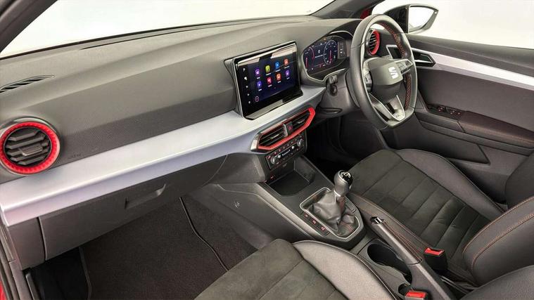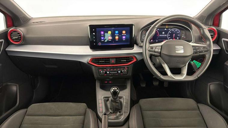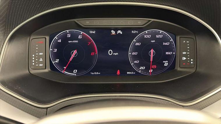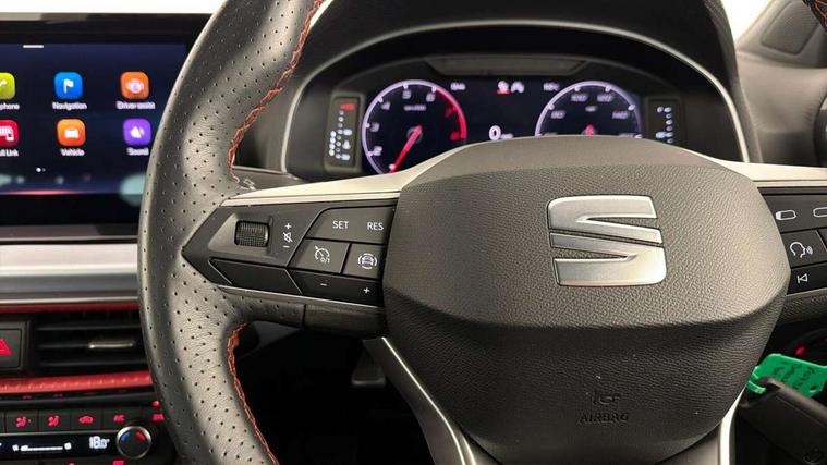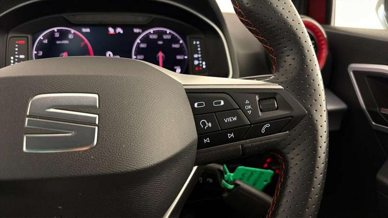 'Lights On' Reminder warning buzzer, 10" Digital cockpit, 9.2" touchscreen navigation system with type C USB socket, Voice control and DAB/AM/FM radio, Auto start and stop system, Bluetooth audio streaming with handsfree system, Digital clock, E-call, Full link smartphone integration with mirror link, wireless apple carplay, Google android auto + USB Type C cable for apple and android devices, Lane assist, Low fuel warning light, Outside temperature gauge, Power Steering, Seat connect with safety, service, remote and online, SEAT drive profiles and ECO function, SEAT logo boot release, Speed limiter, Trip computer, Sports suspension, Auxiliary input socket, Radio/MP3 player, SD card slot, Steering wheel mounted controls, Anti theft roof antenna, Auto dimming rear view mirror, Automatic rain sensing wipers, Black door mirrors, Body colour bumpers, Body colour door handles, Brilliant black window surrounds, Dark tinted rear windows, Electric adjustable/heated/folding door mirrors, Electric front windows, Electric headlight adjustment, Electric rear windows, Front/rear fog lights, FULL LED automatic headlights with dynamic headlight range control, coming and leaving home, LED daytime running lights, LED tail lights, Rear roof spoiler with FR twin exhausts, Rear side wing doors, Rear wiper, Third brake light, 3 seat bench in 2nd row, 60/40 split folding rear seat, Ambient interior lighting, Chrome detailing and black headlining, Comfort seats, Dual zone climate control with combination filter, Front courtesy lights, Front cupholders x 2, Front reading lights, Gear shift indicator, Glovebox, Height adjustable front and rear headrests (five), Height adjustable front seats, Height/reach adjust steering wheel, Illuminated air vent surrounds, Illuminated boot, Instrument lighting with brightness control, Isofix, Leather multifunction flat bottomed sports steering wheel, Microsuede cloth upholstery, Passenger sunvisor, Single front passenger seat, Storage pockets on back of front seats, Sunvisors with mirror and driver side card holder, 3 point seatbelts on all 3 rear seats, ABS, Active front headrests, Child locks on rear doors, Electronic stability control, Energy recovery system, Front assist forward collision warning and autonomous emergency braking, Front driver and passenger side airbags with curtain airbag and front passenger airbag deactivation, Hill hold control, Multi-Collision braking, Seat belt reminder for front and rear seats, Tiredness recognition system, Tyre pressure monitoring system, Electronic engine immobiliser, Locking wheel bolts, Perimeter alarm and interior monitoring with backup horn and tow away protection, Remote central locking + deadlocks, 18" Performance machined alloy wheels in black and grey,