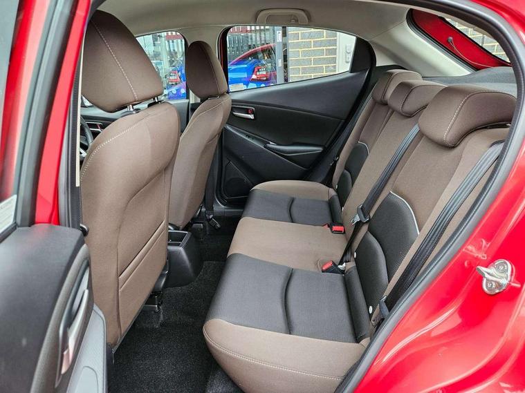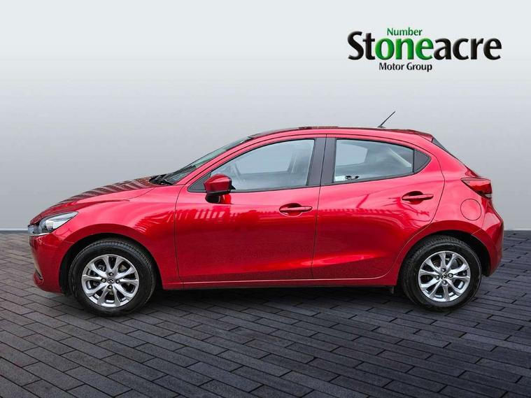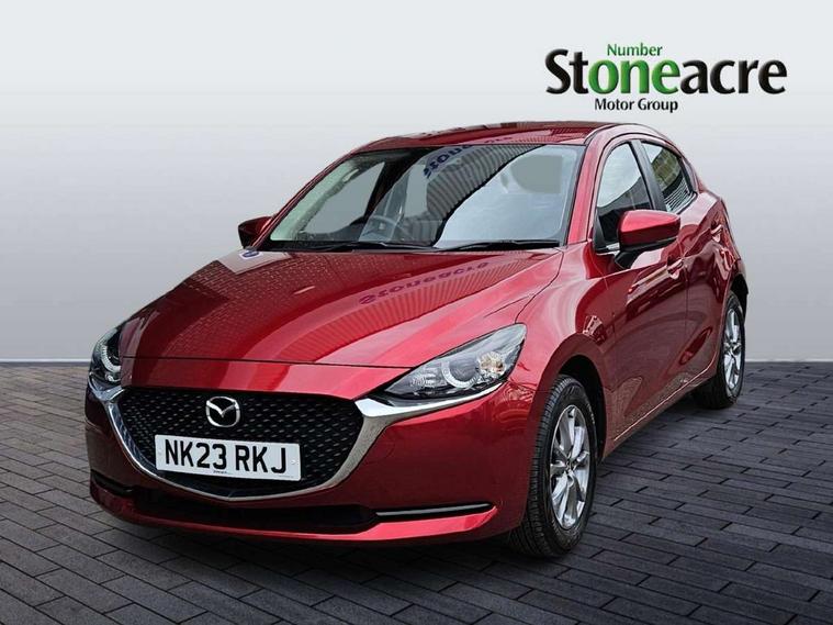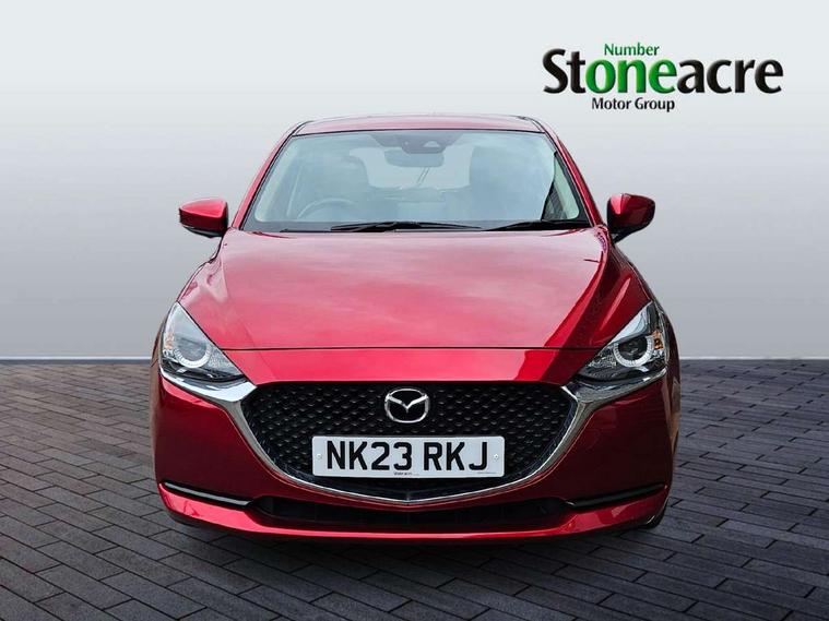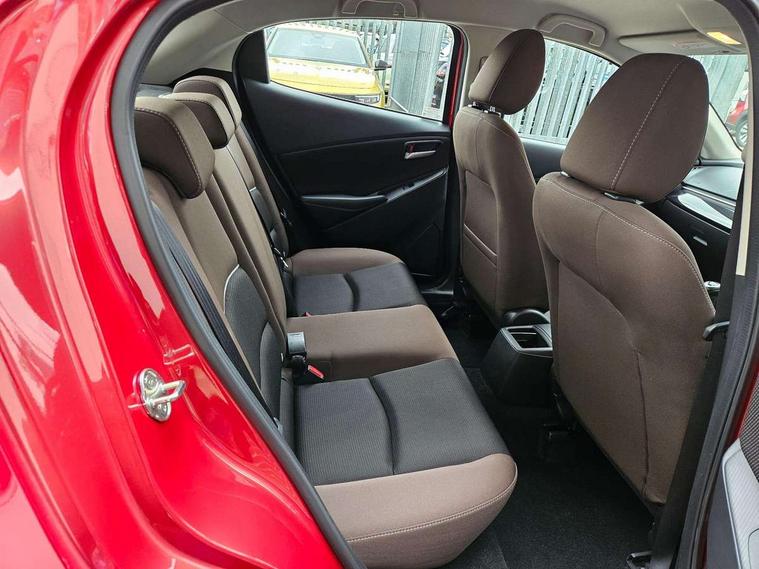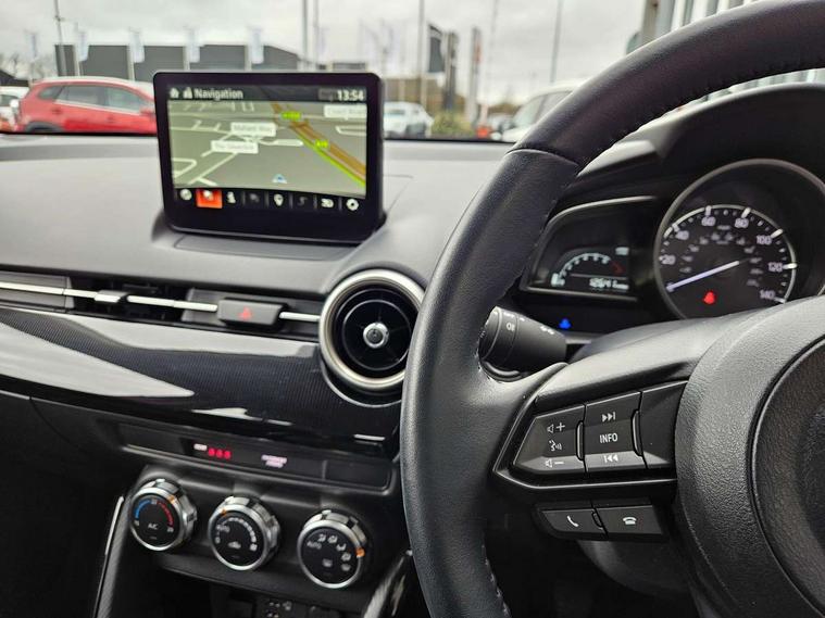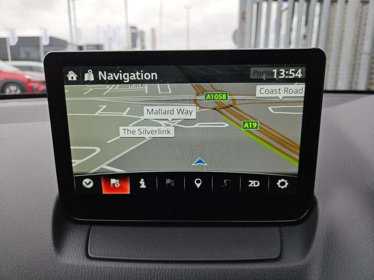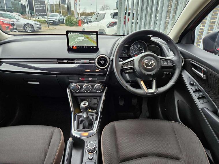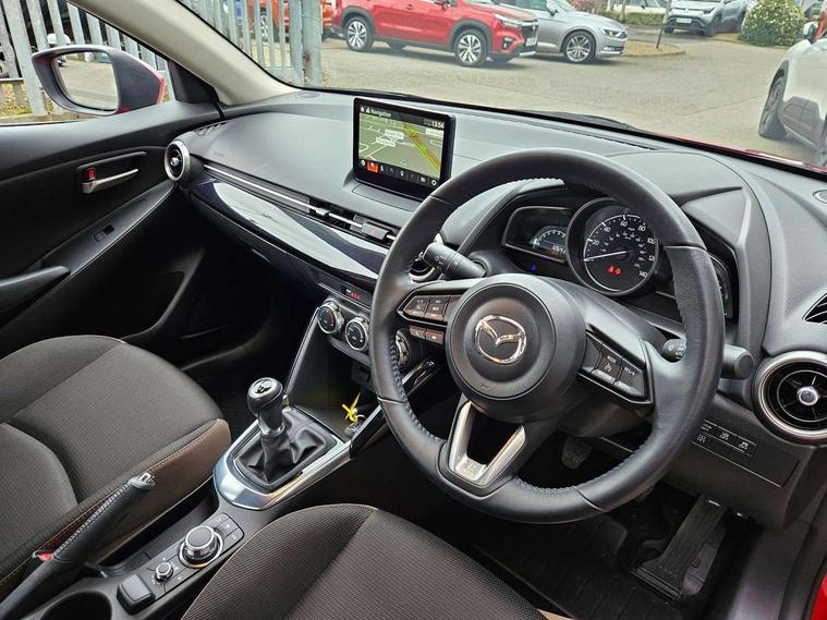 Adjustable speed limiter, Analogue speed display meter, Apple car play/Android Auto, Cruise control, Digital instrument cluster, Digital rev counter, E-call, Emergency stop signalling system, Engine start/stop button, Integrated bluetooth, Lane departure warning system, Lane keep assist, Mazda connect with 8" colour touch screen, Navigation system, PAS, Rear parking sensor, Service indicator, Trip computer, i-stop, AM/FM/DAB radio with 6 speakers with USB and AUX inputs, Multimedia Commander including separate volume dial, Steering wheel mounted audio/bluetooth controls, Auto dimming rear view mirror, Auto headlight levelling, Body colour door mirrors, Body coloured front bumper with black lower bezel, Body coloured rear bumper with black lower mouldings, Chrome finish signature wing on front grille, Coming/leaving home lighting function, Dusk sensing headlights, Electric adjustable/heated/folding door mirrors, Electric front/rear windows with one touch auto up/down for driver's window, Halogen daytime running lights, LED Headlights, LED indicator lights, LED third brake light, Rain sensing front wipers with adjustable sensitivity and speed, Rear side wing doors, Rear wiper, Satin black front grille, 3 seat bench in 2nd row, 60/40 split rear seats, Climate control air conditioning, Cloth upholstery, Driver, Front passenger and two rear grab handles with coathooks, Drivers seat manual slide recline and height adjustment, Drivers/front passengers covered vanity mirrors and drivers ticket holder, Folding rear seats, Front centre storage with two cupholders, Front head restraints, Front passenger and driver door pockets, Front passenger seat manual slide, recline and height adjust, Front passenger seatback pockets, Gear shift indicator, Glovebox, Interior courtesy light with integrated spotlight, ISOFIX child seat anchorage points attached on outer rear seats, Leather handbrake, Leather steering wheel and gear knob, Luggage compartment light, Satin silver dials, Single front passenger seat, Three height adjustable rear head restraints, Tilt/telescopic adjustable steering wheel, 2x3 point front seatbelts with pre-tensioners, 3 point seatbelts on all rear seats, Anti-lock braking system (ABS), Autonomous emergency braking, Collision mitigation braking system, Dynamic stability control + Traction control, ESP, Front and rear curtain airbags, Front driver, passenger and rear seat seatbelt warning, Front dual stage driver and single stage front passenger airbags, Front side airbags, Front smart city brake support, G-Vectoring control plus, Hill launch assist, Manual child lock in rear doors, Passenger airbag cut-off switch, Tyre pressure monitoring system, Deadlocking system, Immobiliser, Power door locks, Remote central locking, Thatcham accredited alarm and immobiliser, Black dashboard, 15" Silver alloy wheels, Emergency tyre repair kit,