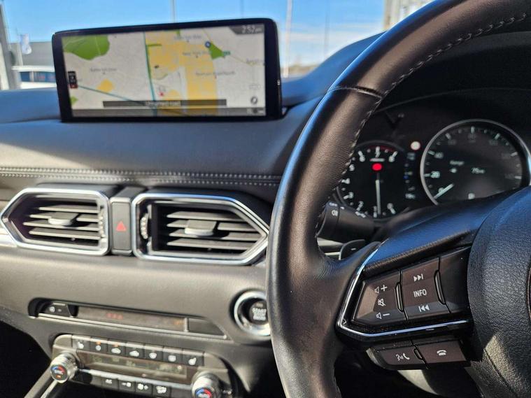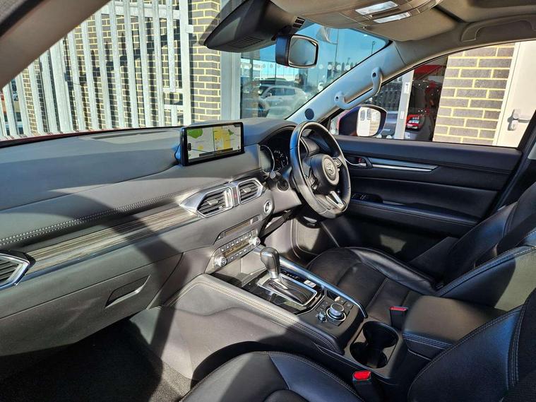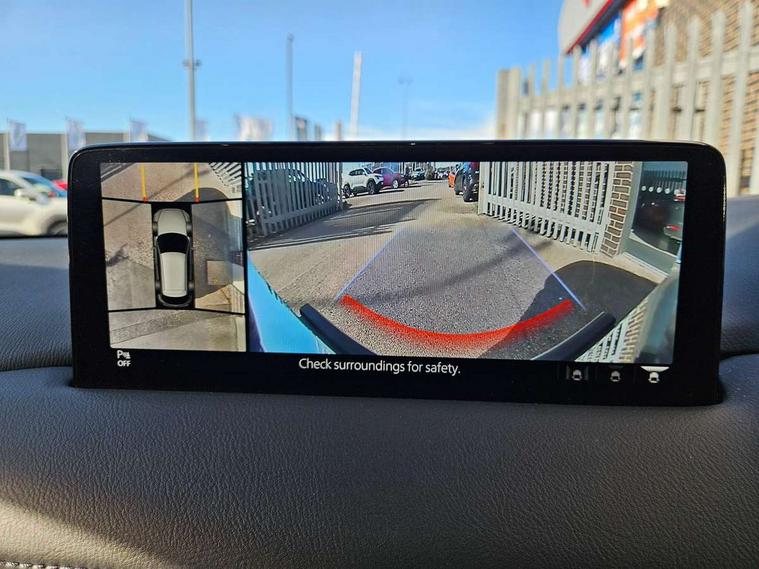 10.25" display with Mazda Connect infotainment, 7" colour TFT display, Advanced blind spot monitoring, Bluetooth connectivity with voice control, Collision prevention assist, Connected services, Cruising Traffic Support, Drive mode selector, Electric power steering, Emergency stop signalling system, Engine start/stop button, Forward collision warning, Front and rear parking sensors, Integrated navigation system, Intelligent speed assist, Lane departure warning system, Lane keep assist, Power liftgate, Qi wireless phone charging, Radar cruise control with Stop and Go, Rear cross traffic alert, Reversing camera, Service indicator, Traffic sign recognition (TSR), Trip computer, Windscreen projected colour active driving display (HUD) with memory, Wireless apple car play/android Auto, Cylinder Deactivation, i-stop, AM/FM radio, Bluetooth audio streaming, Bose premium sound system with 10 speakers, DAB Digital radio, Multimedia Commander including separate volume dial, Steering wheel mounted audio controls, Adaptive front lighting system, Auto dimming rear view mirror, Automatic headlights, Black inlay dashboard panel, Body colour door mirrors, Body colour roof spoiler, Body coloured front and rear black lower bumper mouldings, Coming/leaving home lighting function, Door mirror integrated indicators, Dual chrome tailpipes, Dusk sensitive headlamps, Electric front/rear windows with one touch auto up/down, Front grille in gloss black finish, Front grille in gloss black finish with chrome signature wing, Gloss black B and C pillars garnish, High beam assist, Intermittent rear wash/wipe, LED auto levelling, LED daytime running lights, LED front fog lights, LED Headlights, LED third brake light, Power folding and heated door mirrors, Power tilt/slide sunroof, Privacy glass (rear side windows only), Rain sensing front wipers, Rear side wing doors, Satin black side mouldings, Scuff plates, Shark fin antenna, Signature LED rear combination lights, Variable intermittent front wash/wipe, Vinyl with wood grain metal inlay door trim panel, Windscreen wiper de-icer, 12v electrical power outlet, 3 seat bench in 2nd row, 3 stage heated front seats, 40:20:40 Karakuri fold-flat seat system, 6 way electric adjustable passenger seat, 8 way electric driver seat with lumbar support + memory, Cargo room flat floor board with waterproof undertray, Driver seat power slide, recline and height adjustment, Driver, Front passenger and two rear grab handles with coat hooks, Driver/passenger front seatback pockets, Driver/passenger sunvisors + illuminated vanity mirrors (drivers with ticket holder), Dual zone climate control, Folding centre armrest with 2 cup holders, Front and rear door pockets, Front centre storage with two cupholders, Front passenger seat power slide, recline and height adjustment, Heated steering wheel, Humidity sensor, Illuminated glovebox, Interior dome light with integral spotlight, ISOFIX child seat anchorage points attached on outer rear seats, Karakuri tonneau cover, Leather upholstery, Leather wrapped steering wheel and gear knob, Light roof lining, Luggage compartment LED lighting, Luggage compartment power outlet, Paddle shifts, Rear air vents, Rear headrests, Rear seat recline, Roof mounted sunglasses holder, Single front passenger seat, Three height adjustable head restraints, Tilt/height adjustable steering wheel, USB Connectivity (2x front Type-C, 2x rear Type-B), White interior LED illumination lighting, 3 point front seatbelts with pre-tensioners, 3 rear 3 point seatbelts, ABS, Advanced Smart City Brake Support - SCBS, Child locks on rear doors, Driver and front passenger side airbags, DSTC-Dynamic Stability and Traction Control, Dual front airbags, Electronic brake force distribution, Electronic parking brake with auto hold, ESP, Front and rear curtain airbags, Front passenger airbag deactivation, G-Vectoring control, Hill hold assist, Seatbelt reminder front and rear, Single stage passenger airbags, Smart brake support with forward obstruction warning, Tyre pressure monitoring system, Automatic door locking when moving off, Deadlock, Immobiliser, Power door locks, Remote central locking, Smart keyless entry, Thatcham Cat.1 alarm, 19" diamond cut black alloy wheels, Tyre repair kit,