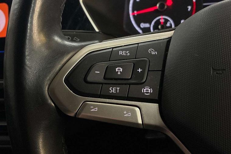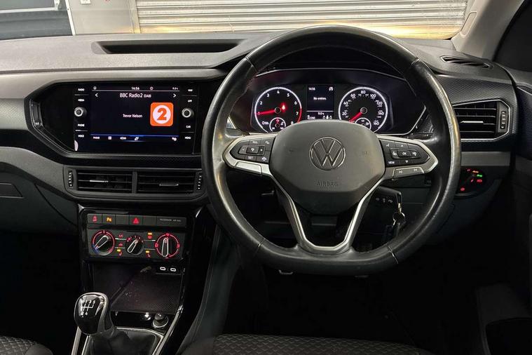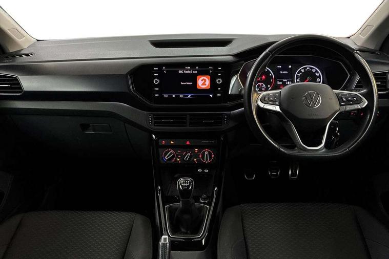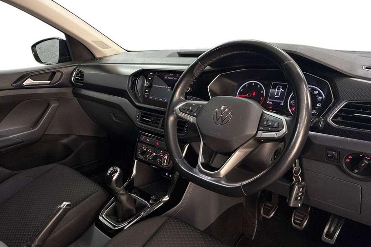 'Lights On' Reminder warning buzzer, Adaptive cruise control including front assist, forward collision warning, autonomous emergency braking, speed limiter, Bluetooth telephone and audio connection for compatible devices, Car information display, Driver alert system, eCall emergency call system, Front and rear parking sensor with ultrasonic, audible with audio volume reduction when activated and optical parking display via vehicle audio system, Lane assist, Multifunction computer with visual gear change recommendation for fuel consumption, Power assisted speed sensitive steering, Ready 2 Discover system with 8" display including streaming and internet, Speedo, rev counter, electronic odometer, trip, service interval display, exterior temperature and fuel gauge, Stop/start system, Voice activation, Warning sound and light for doors and tailgate open, Warning sound and light for front seatbelts unfastened, We Connect Go Dongle, Wireless Car net app connect with Apple CarPlay, combined functionality of Apple CarPlay/Android Auto and MirrorLink, Battery regeneration during braking, Misfuel prevention device, 2x USB connection with USB charging sockets and in rear centre console, DAB Digital radio receiver, Diversity antenna for FM reception, Front and rear 6 speakers, Multi device interface (MDI) with USB connection, Music playback - MP3, WMA and AAC files, Premium USB cable for Apple or Android smartphone compatibility, Simultaneous pairing of 2 compatible mobile devices, Title and cover art display, Automatic dimming interior rear view mirror, Automatic hazard lights activation under emergency braking, Black non metallic door mirror housings, Black roof rails, Body colour door handles, Body coloured bumpers, Chrome plated radiator grille inserts, air vent surrounds and light switch surrounds, Dusk sensor + automatic driving lights, Electric adjustable/heated door mirrors, Front and rear electric windows, Front fog lights with static cornering function, Galvanised body, Halogen clear headlights range adjustable via infotainment system with automatic headlight activation and separate LED daytime running lights, Heated rear window, High level 3rd brake light, Lower door sills and door pillars in black, Manual coming/automatic leaving home lighting function, Rain sensor, Rear lights incorporating LED technology, Rear tinted glass 65% approx light absorbing from B pillar backwards, Rear window aerial, Rear windscreen washer and wiper with interval delay, Reflectors in all doors, Tailgate with integrated roof spoiler, United badge on B-pillar, United door sill protector, Windscreen wipers/ intermittent wipe + 4 position delay, 12V Accessory socket in centre console, 2 Front and rear reading lights incorporating LED technology, 3 rear head restraints and 3 rear three point seat belts with ECE label, 60/40 split folding rear seat backrest, Brushed stainless steel pedals, Drawer under drivers seat, Driver and front passenger sunvisor with vanity mirror, Driver's sunvisor with ticket holder, Dust and pollen filter, Front + rear carpet mats, Front centre armrest with storage compartment, Front footwell ambient lighting, Front seat back storage pockets, Front seats with adj lumbar support, Glovebox, Heating and fresh air system with 4 stage blower, Height/reach adjust steering wheel, Instrument lighting white adjustable panel illumination, Interior light with delay, Isofix child seat preparation for 2 rear child seats, Luggage compartment cover, Luggage compartment lighting, Manual air conditioning, Manual front seats with height adjustment, Moveable and foldable Rear bench seat, Storage compartment in drivers and front passengers door, Three spoke multi-function leather trimmed steering wheel and gearknob, Variable boot floor, Waveform cloth upholstery, White ambient lighting, Winter pack - T-cross, Anti-lock Braking System (ABS) with Hydraulic Brake Assist (HBA), Automatic post collision braking system, Driver and front passenger safety-optimised head restraints, Drivers and Front Passengers airbags with front passengers airbag deactivation switch, ESC with EDL, ASR, EDTC and trailer stabilisation function, Extended and proactive pedestrian protection, Front and rear curtain airbags, Front disc brakes and rear drum brakes, Front seat side impact airbags, Height adjustable 3 point automatic front seatbelts with pretensioners, Hill start assist, Pre crash preventive occupant protection, Rigid safety cell with front and rear crumple zones, Tyre pressure loss indicator, Volkswagen roadside assistance, Alarm with interior protection and deactivation via infotainment system, Child security locks in rear doors, Electronic engine immobiliser, Remote central locking with 2 remote folding keys, Remote tailgate unlocking using key fob, Atlantic Blue inserts in dash and doors, 16" Dublin black diamond turned alloy wheels + anti theft wheel bolts, Tyre mobility kit and compressor,