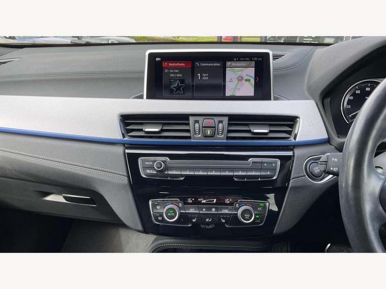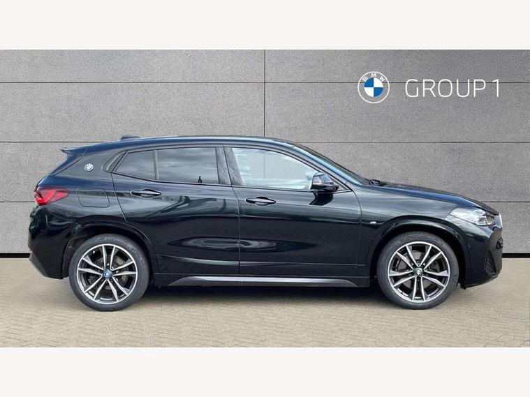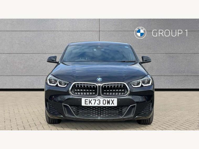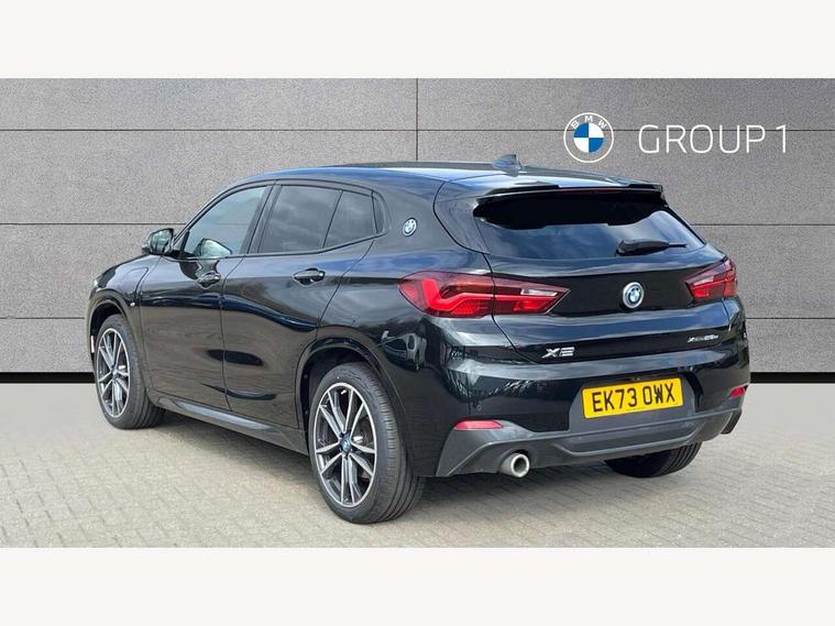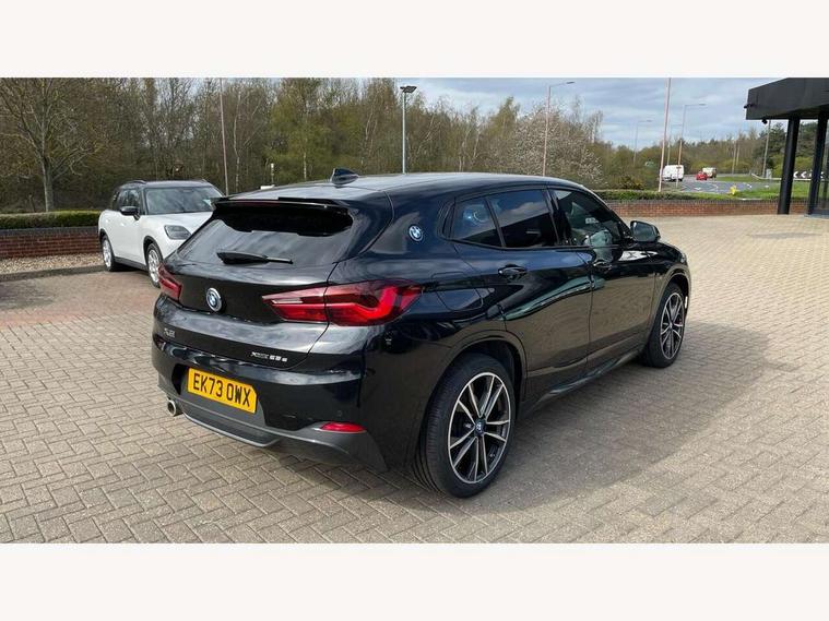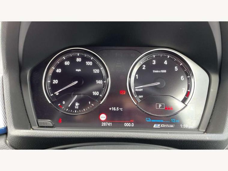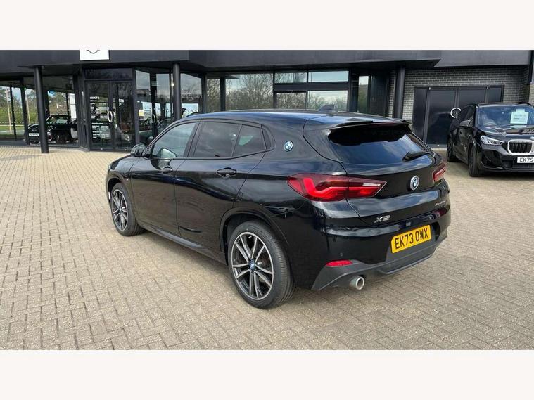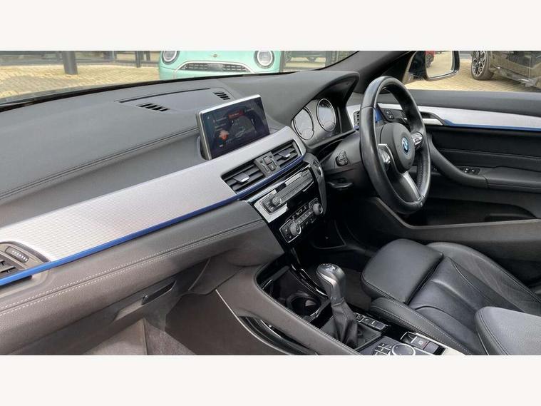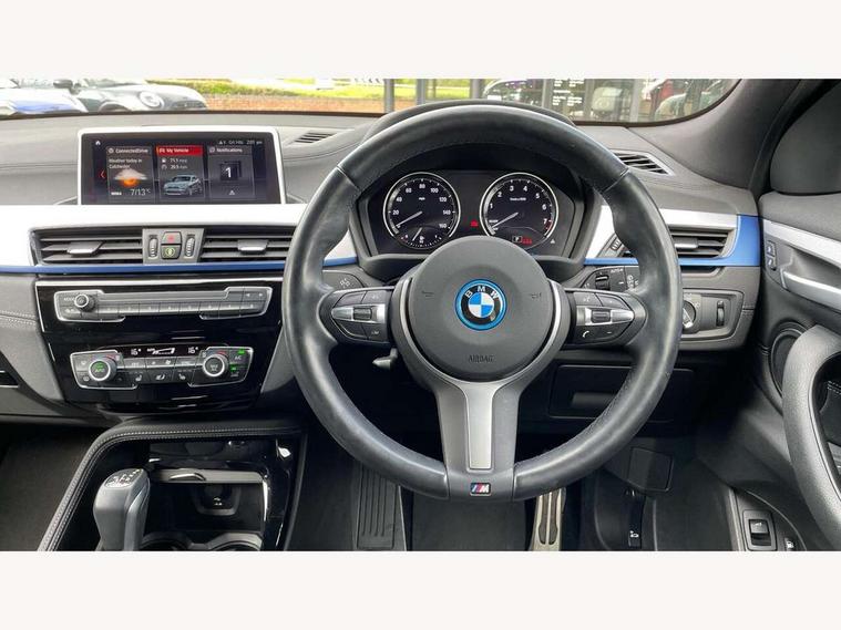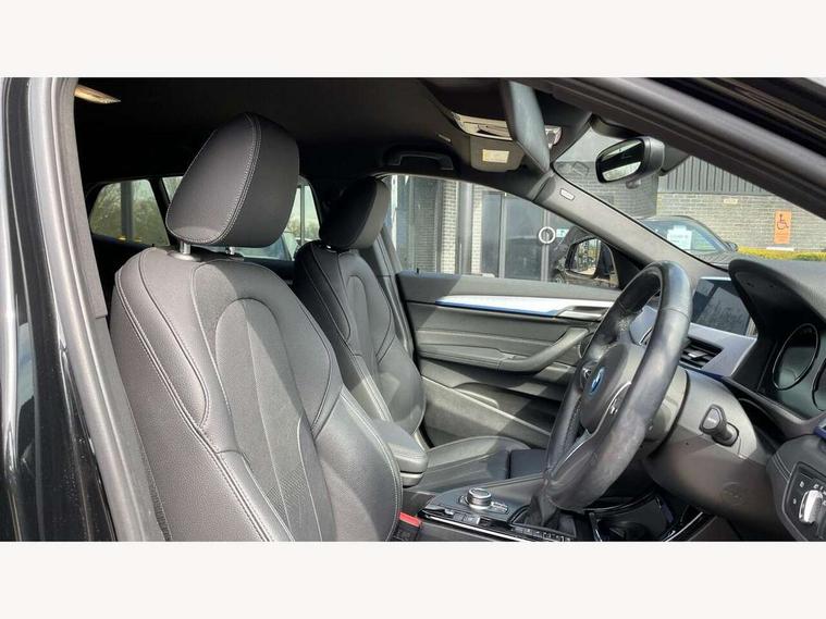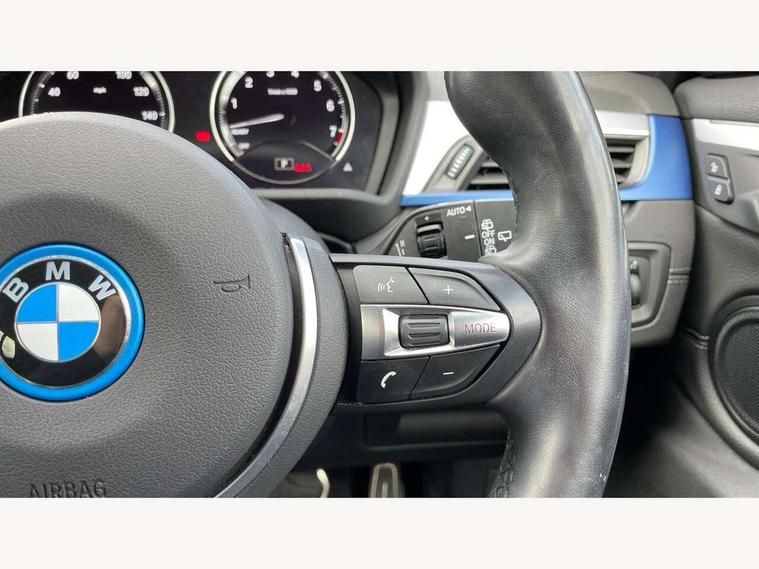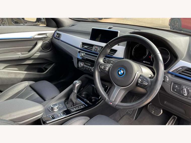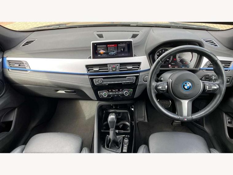 Active Guard incl approach control warning with city brake function and person warning with city brake function, Apple CarPlay preparation, Automatic powered electric bootlid, BMW ConnectedDrive online services, BMW Navigation system with 8.8" monitor, BMW Online services, BMW Teleservices, Brake pad wear indicator in front and rear, Check Control warning system for monitoring of lights and door/luggage compartment open warning, Connected eDrive Services, eDrive button activates auto eDrive, max eDrive and save battery modes, eDrive specific displays in instrument cluster and CID, Electric Power Steering (EPS) with Servotronic, Electro hydraulically controlled multi plate clutch in rear axle, Energy efficient operating strategy, Front axle single joint with specific axle kinematics to minimise drive influences on steering + provide increased rigidity agile driving behaviour, Instrument cluster with black optic and 5.7" colour display + speedometer + tachometer + fuel gauge + instant fuel economy, Integrated owners handbook, Lights on warning by audio warning signal when ignition is switched off, On board computer - average speed+fuel consumption, service interval, clock/date, odometer/trip meter, outside temperature display and ice warning, Operation by iDrive with direct selection buttons and 8 programmable buttons, Optimum shift indicator, Park assist system, Personal Profile, Real time traffic information, TMC for lifetime of vehicle, Variable and stepless distribution of drive torque between front and rear axle, 12V compressor with integrated sealant injection bottle and hose, 2.4kW AC charging with 5m cable, AC Fast Charging, Aluminium lightweight construction including crankcase, Anti roll bar front and rear, Automatic transmission, Balancer shaft, Double VANOS, Drive performance control with ECO PRO comfort + sport mode, eDrive exterior sound, Electric engine installed under rear seats driving the rear wheels, Electronic differential lock, High precision injection, Lithium-ion high voltage battery (10.0 kWh) fitted under rear seats, Performance Control, Transmission of power to rear axle via front axle differential and two-part cardan shaft, Twin tube gas filled shock absorbers with degressive characteristic curve, xDrive electric drive, after activation of the electric motor and common drive via all four wheels, 6 Speaker Loudspeaker system, Bluetooth audio streaming, BMW professional radio, DAB Digital radio, Steering wheel mounted audio/telephone controls, Adjustable headlights, Aero curtain, Automatic windscreen wipers and automatic headlight, Automatically dimming rear view mirror, BMW badge on bonnet, tailgate with integrated tailgate release and C pillars, Body colour door handles, Body colour mirror caps, Body colour roof trims, Chrome kidney grille with black vertical slats, Clear lenses direction indicator lights, Dark shadow front air intakes, Daytime running lights, Differentiation of xEV Vehicles - Blue ring around BMW roundel on wheel hub/tailgate/bonnet/c-pillar/steering wheel and side panel inscription, Direction indicator side lights integrated in exterior mirrors using LED technology, Door mirror integrated indicators, Dynamic brake lights, Electric folding exterior mirrors with anti-dazzle, Electrically adjustable and heated door mirrors glass aspheric on driver's side and convex on passenger side, Engine designation on electric bootlid - right, Fingertip control / anti-trap function on electric window, Front and rear bumper system, Front and rear electric windows, Green tinted heat protection glazing, Heated windscreen washer jets, High gloss black front side air intake with matt black insert, High gloss black in window frame, recess covers and B-Pillar trim, High gloss shadowline in window frame, recess covers, mirror frame and B-Pillar/C- pillar trim, High level third brake light, M logo designation in side chrome, M Sport spoiler, Model designation in left tailgate, Rear fog lights, Rear side wing doors, Rear tail lights with LED technology and 3D design, Rear window aerial, Rear window wiper with wash/wipe function, Reversing light in rear light cluster, Shark fin antenna, Single exhaust tailpipes with chrome finishers 90mm in left, Visible VIN plate, Welcome lighting, 2 cupholders in front centre console, 3 Spoke M sport nappa leather multifunction steering wheel, 40:20:40 manually split folding rear seat with two tilt positions for backrest, Anthracite headlining, Armrest in centre section of rear seat backrest and folding, Automatic two zone climate control air conditioning, Child seat ISOFIX attachment for two outer rear seats and front passenger seat with anchorage points, Conditioned based service, Contrast stitching on centre console and mid section of dashboard to match upholstery seam, Driver and front passenger seat heating, Driver/passenger sunvisors with ticket holders, Floor mats with black surround and M flag detail on front mats, Front and rear door armrests, Front armrest, Front axle always driven, Front door sill finishers with M designation, Front head restraints, Front sports seats, Illuminated charging socket with visual display of charge status, Interior light in front centre interior mirrors and rear centre auto interior light activation when door is opened when ignition switched off, Luggage compartment lighting, Luggage compartment loading edge with stainless steel insert, Luggage compartment with underfloor storage and four lashing eyes, Pre-conditioning of battery for optimum operating temperature, Pre-conditioning of interior via BMW Remote app or setting time within iDrive menu, Rake/reach adjustable steering wheel, Single front passenger seat, Three rear headrests, Additional interior lighting pack - X2, Extended storage pack - X2, M Sport aerodynamic pack - X2, 3 point seatbelts on all seats, front pyrotechnic belt tensioners, stopper and belt force limiters, rear coded belt buckles, Airbags - Front driver and passenger, front 