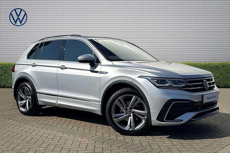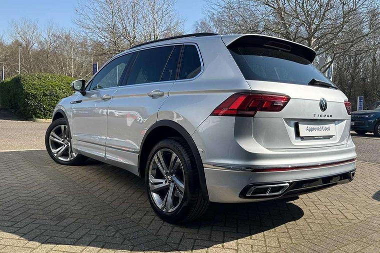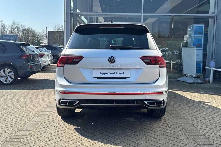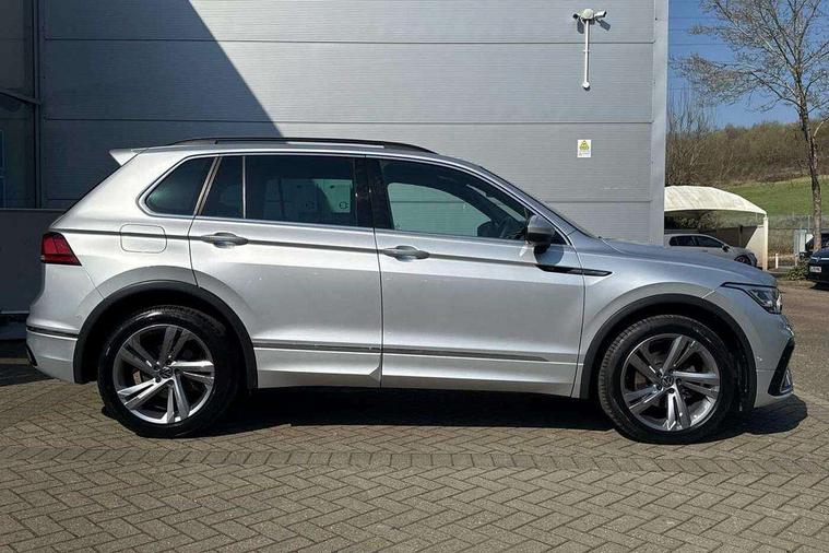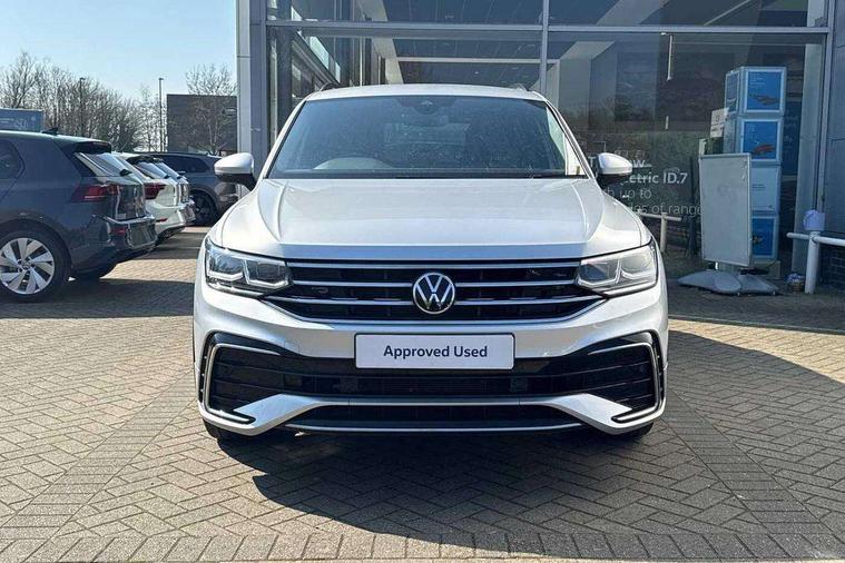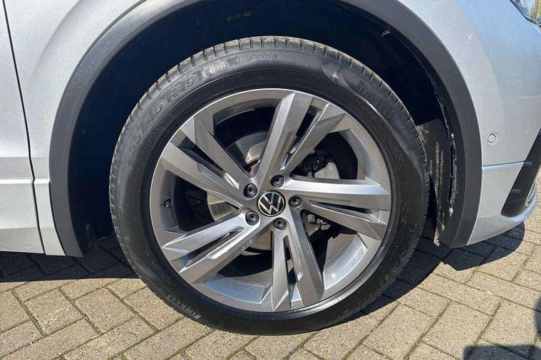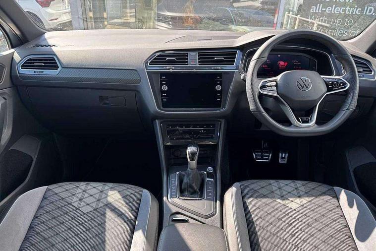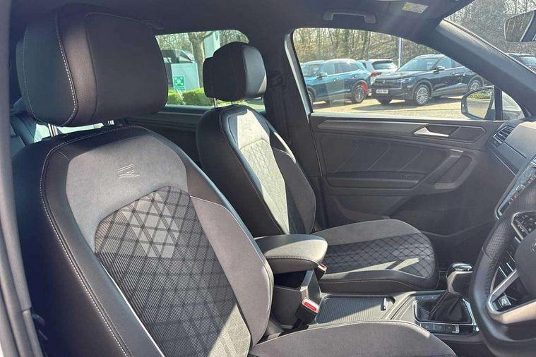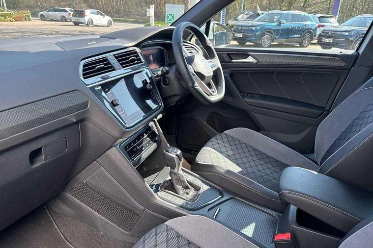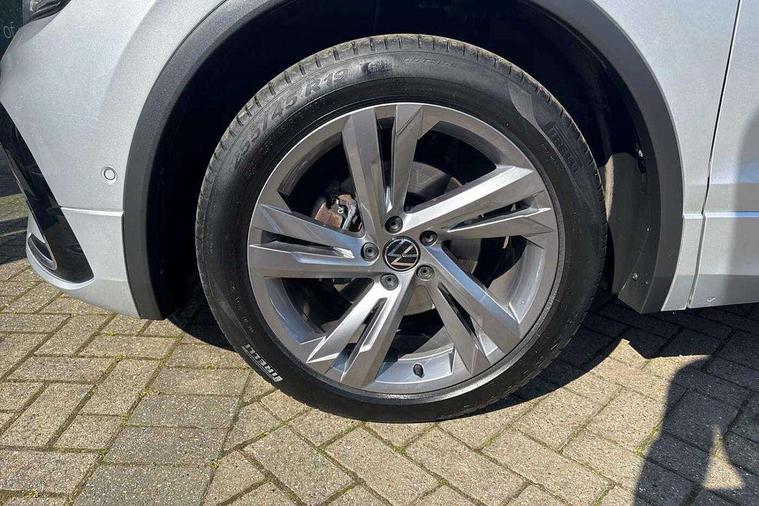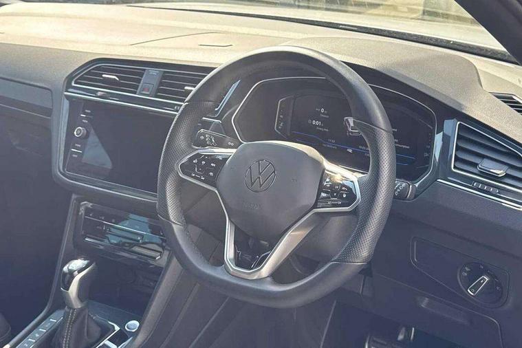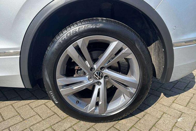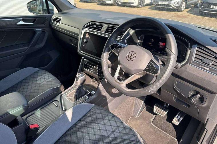 Adaptive cruise control ACC stop and go including speed limiter, App-Connect incl. App-Connect Wireless for Apple CarPlay and Android Auto, Bluetooth phone integration system, Comfort drive travel assist, Digital cockpit pro, Driver alert system, Driver profile selection, Dynamic road sign display, eCall emergency call system, Electromechanical speed sensitive power steering, Emergency assist, Front and rear parking distance sensors, Instrument cluster mph speedometer Great Britain, Lane keeping system Lane Assist, Lights on warning, Multifunction front facing camera, Outside temperature display, Premium multifunction display with multi colour display, Preparation for subsequent activation Navigation feature Discover Media includes Streaming and Internet, Remote control boot opening, Rev counter, Service interval indicator, Speed limit display, Start/stop system with regenerative braking, Tailgate/trunk lid unlocking from outside, Trip computer, Warning sound and light for doors and tailgate open, Battery regeneration during braking, Sports suspension, 8 Speakers, Digital radio reception DAB+, Diversity antenna for FM reception, Radio, Auto dimming interior rear view mirror, Automatic headlight control system, Body colored bumpers in R-Line style, Body colored exterior mirror housings, Body colour door handles, Chrome moldings on the side windows, Coming/leaving home lighting function, Dynamic headlight range control, Front and rear electric windows, Heated rear window, High level 3rd brake light, Laminated safety glass windshield, heat and sound insulating, LED headlamps with LED separate daytime running light and dynamic cornering light, LED rear combination lamps, LED rear number plate lights, License plate carrier in front and rear, Poor weather light and cornering light, Power adjustable, folding and heated door mirrors with surround lighting, front passenger exterior mirror lowering function, Privacy glass for rear side windows and rear window, R Line body kit, R Line side sills, Rain sensor, Rear exhaust tailpipe, Rear fog lamp, Rear side wing doors, Rear spoiler in R style, Rear windscreen washer and wiper with interval delay, Side and rear windows in heat insulating glass, Trailer Stability Programme, Unique R Line badging, Windscreen wipers/ intermittent wipe + 4 position delay, 12V outlet in center console rear and in luggage compartment, 12V outlet in front and tray, 2 LED front reading lights, 2 LED rear reading lights, 3 bench rear seats in 2nd row, 3 rear headrests, Air Care Climatronic 3 zone automatic climate control with enhanced air filter and controls in the rear, Art Velours greyson sports cloth upholstery, Backrest release for left front seat, Black headlining, Brushed stainless steel pedals and footrest, Carpet mats in front and rear with decorative stitching in Gray, Climate control unit rear with touch function, Door and side trim panel in foam film, insert in leatherette, Driver + front passenger lumbar support, Front footwell illumination, Front scuff plates in aluminum with R-Line logo, Front seats head restraints (x-adjustment), Height adjustable front seats, Height/reach adjust steering wheel, Isofix Preparation 2 Rear child seats, Leather gear knob, Rear bench seat asymetrically split folding, longitudinally movable and folding with load-through hatch and center armrest, Remote unlocking for rear seat backrest, Single front passenger seat, Sun visors with illuminated vanity mirrors, Top front comfort seats, Winter pack - Tiguan, 3 point seat belt for centre rear seats, 3 point seat belts with seat belt pretensioners for the outer rear seats, Curtain airbags for front and rear passengers, Driver/Front Passenger airbags, Drivers knee airbag, Electronic parking brake with auto hold, Electronic Stability Control with driver steering recommendation, ABS, ASR, EDL, EDTC and trailer stabilization, Front assist with autonomous emergency braking (for Adaptive Cruise Control ACC up to 130 mph), Front disc brakes, Front passenger airbag deactivation, Front side airbags, Height adjustable front 3 point seatbelts + pretensioners, Manual child proof rear door locks, Pedestrian monitoring system, Proactive passenger protection system in combination with front assist, Rear disc brakes, Two tone horn, Tyre pressure loss indicator, Warning sound and light for front seat belts if unfastened, Warning triangle, Anti theft alarm system with interior monitoring, backup horn and towing protection, Anti theft wheel bolts, Electronic engine immobiliser, Keyless locking and starting system keyless access with safelock, Chrome elements on the mirror switch power window switches and door pulls, Decorative inserts Carbon Gray for dashboard and front door trim panels, Interior door handle in matte chrome, 19" Valencia alloy wheels with AirStop tyres, Tool kit, Tyre mobility kit Includes 12V compressor and tyre sealant,