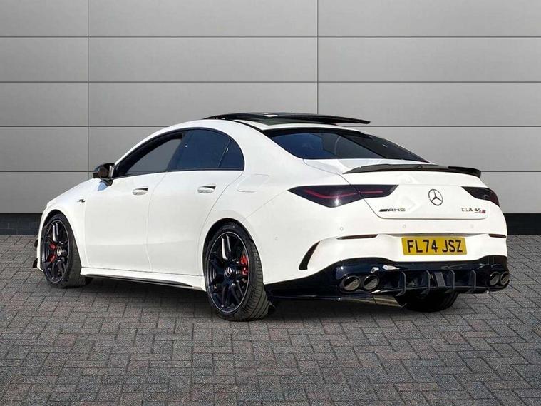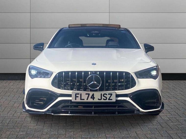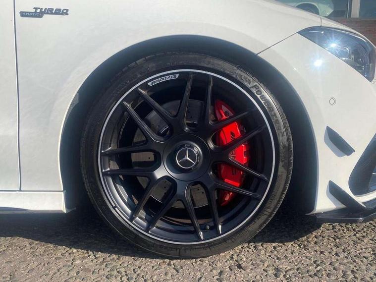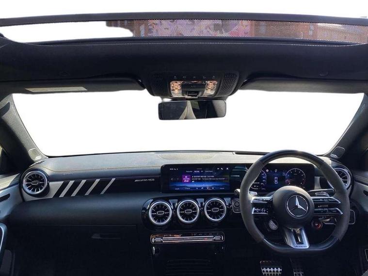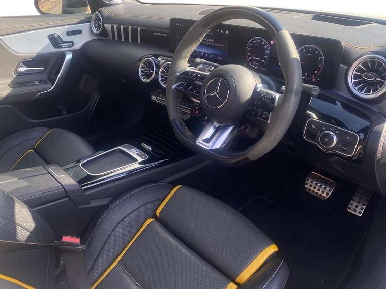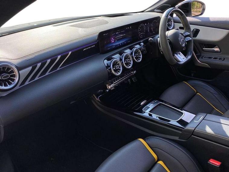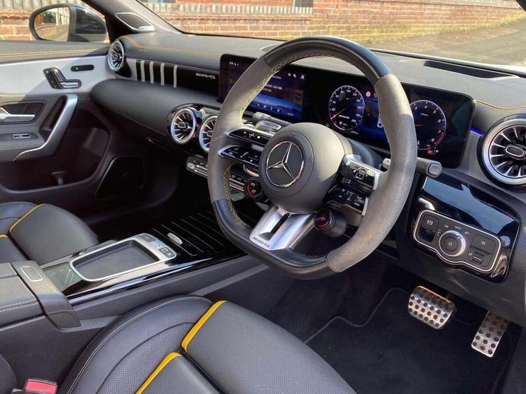 10.25 inch Instrument display with digital cockpit, 10.25 inch touchscreen central media display with AMG specific, AMG start up logo, visualisation of the AMG drive programs, vehicle and engine data, 360 degree parking camera, Active lane keeping assist, AMG DYNAMIC SELECT with drive modes(Slippery, Comfort, Sport, Sport+, Individual and Race) incl drift mode via steering wheel shift paddles+Race Start, AMG menu with sporty additional information - Gear indicator with yellow M symbol manual mode, Warm Up menu and Set Up menu, AMG speed sensitive power steering with two sets of steering characteristics, AMG track pace, Attention assist - Monitors steering behaviour and long journey fatigue, Bluetooth connection, Car wash mode, Cruise control with limiter, Direct steer system, ECO start/stop function, Fingerprint sensor, Fluid level warning indicator for fuel, oil, coolant and washer fluid, Hard-disk navigation, Head up Display, Hey Mercedes Voice activation, Lamp failure indicator, MBUX augmented reality for navigation, MBUX Interior assistant, Mercedes me connect including emergency call system, accident recovery, breakdown and maintenance management, Mercedes me remote services, Outside temperature gauge, Owners manual in English, Pre-installation of private car share, Radio aerial integrated into front and rear windshields, Service indicator (ASSYST), Smartphone integration with Apple CarPlay and Android auto, Traffic sign assist, Trip computer in multifunction display with current consumption indicator, Wireless charging in the front centre console, 4MATIC permanent four wheel drive, AMG performance 4MATIC+ with torque control distribution, AMG Ride Control suspension, Rear axle multi-link, Burmester lettering on the speakers, Burmester surround sound system (710W) with dolby atmos, speakers - 1 central, 1 woofer, 1 tweeter, 1 subwoofer with 60W, 2 in C pillar, DAB digital radio tuner, MBUX multimedia system, Pre installation for Mercedes Benz Link, USB (type C) ports (2) in stowage compartment and 1 in front of centre console, Adaptive brake lights, AMG body styling specific front apron, AMG side sill panels, AMG rear apron, AMG roof spoiler lip, Specific S labelling boot lid + front apron CLA 45, AMG emblem on the front instead of the "Mercedes-Benz" laurel wreath badge, AMG Front apron with flics as air deflector elements on the outer air intakes, AMG fuel filler cap in silver chrome with AMG lettering, AMG illuminated door sills with AMG lettering and with exchangeable cover, AMG specific radiator grille with vertical struts in high gloss chrome and AMG logo, AMG Sports exhaust system with two round tailpipes measuring 90 mm in diameter attached in rear apron, Body colour bumpers, Body colour door handles, Electric panoramic sunroof with automatic tilt and convenience closing fuinctions, rain sensor auto closing and electronic roller sunblind, Electric windows, Electrically adjustable and heated door mirrors with integrated LED indicators, Exhaust system with AMG Real Performance Sound (Balanced or Powerful settings), Front splitter and trim elements on the louvres in the outer air inlets in silver chrome, Front wings with TURBO 4MATIC lettering, Hand free access, Headlamp assist automatic headlamp activation, Heated glass rear windscreen + timer control, High level LED third brake light, Integrated LED daytime running lights, Interior mirror with black reading lamps and frameless, LED tail lamp, Multibeam LED headlamps with adaptive highbeam assist plus, Privacy glass with dark tinting on rear side windows and rear window, Rain sensing windscreen wipers with two sensitivity settings, Rear boot, Rear fog lamp, Rear side wing doors, Surround lighting with projection of brand logo, Two round twin tailpipe trim elements each measuring 90 mm in diameter and AMG lettering plus ribbing on the inside of the pipe, Valve control dependent on drive program, Variable front intermittent wipers, 3 seat bench in 2nd row, 40:20:40 split folding rear seat backrests, Air conditioning - Two zone thermotronic luxury automatic climate control with display, Air vents with surround in silver chrome, AMG brushed stainless steel sports pedals with rubber studs, AMG centre console finished with trim in silver chrome, AMG Performance sportily shaped seats with power adjustable front seats, special seat cushions + AMG badge backrests, AMG Performance steering wheel in nappa leather/microcut microfibre, AMG steering wheel buttons, Automatic child seat recognition sensor, Black roof lining, Floor mats with stitched AMG lettering, Fluorescent jacket, Front centre armrest with stowage, Front head restraints, Interior lighting - 64 colour Ambient lighting, Manually height and reach adjustable steering column, Memory function for driver and front passenger seat, Rear armrest with two integral cup holders for drinks, Rear head restraints, Silver coloured aluminium gear shift paddles on steering wheel, Single front passenger seat, Stowage compartment in centre console with retractable cover, Sunvisors with illuminated vanity mirrors, Twin front cupholders, Two outer rear seat isofix and top tether child seat fixing points, Aerodynamics pack - CLA, AMG driver's package - CLA, AMG Multi contour seat pack - CLA, AMG Night package - CLA 35/45, AMG performance seat pack (High End) - CLA 45 S 4Matic+ Plus, Keyless go comfort pack - CLA, Light and sight pack - CLA, Mirror pack with Self dimming rear view mirror - CLA, Seat comfort pack - CLA, Winter pack - CLA, Active bonnet pedestrain safety measure which detects an impact and raises bonnet by 65mm, Adaptive brake assist with hold function and hill start assist, AMG high performance brake system with red painted brake callipers and black AMG lettering at the front, ventilated and perforated brake discs, Anti lock braking system (ABS) with brake assist, Black seat belts, Brake pad wear warning indicator, Childproof locks manually operated for rear doors and electrically 