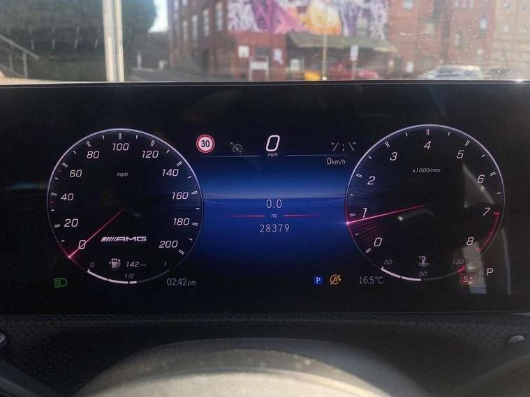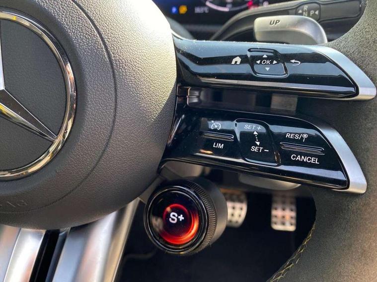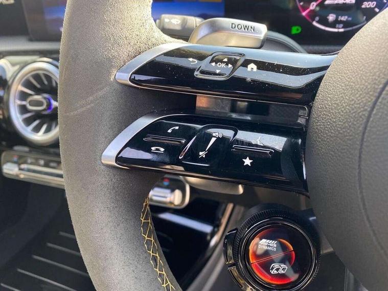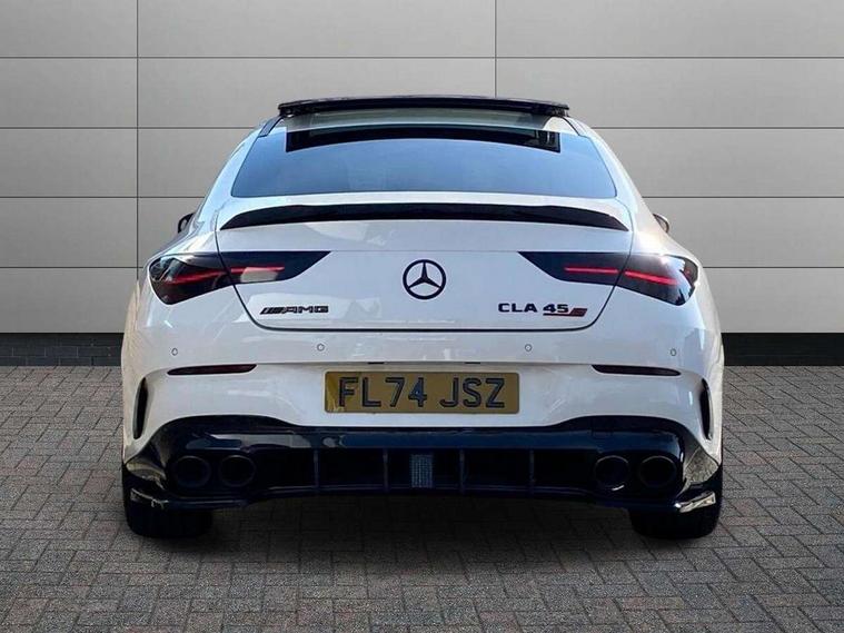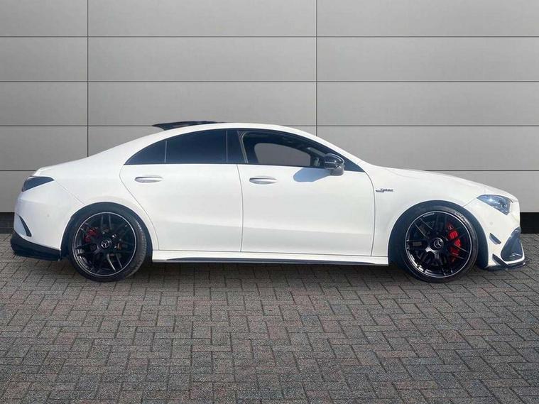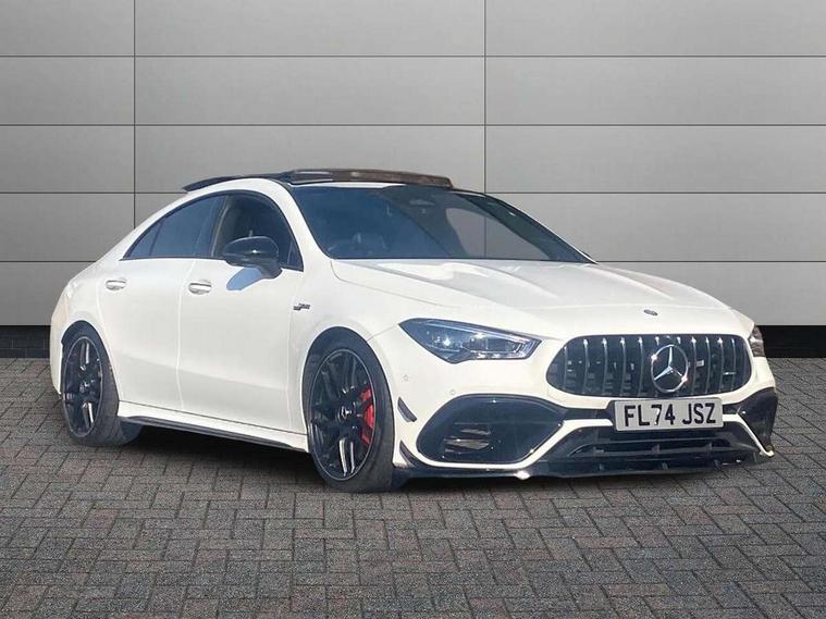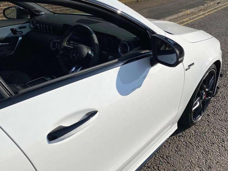 10.25 inch Instrument display with digital cockpit, 10.25 inch touchscreen central media display with AMG specific, AMG start up logo, visualisation of the AMG drive programs, vehicle and engine data, 360 degree parking camera, Active lane keeping assist, AMG DYNAMIC SELECT with drive modes(Slippery, Comfort, Sport, Sport+, Individual and Race) incl drift mode via steering wheel shift paddles+Race Start, AMG menu with sporty additional information - Gear indicator with yellow M symbol manual mode, Warm Up menu and Set Up menu, AMG speed sensitive power steering with two sets of steering characteristics, AMG track pace, Attention assist - Monitors steering behaviour and long journey fatigue, Bluetooth connection, Car wash mode, Cruise control with limiter, Direct steer system, ECO start/stop function, Fingerprint sensor, Fluid level warning indicator for fuel, oil, coolant and washer fluid, Hard-disk navigation, Head up Display, Hey Mercedes Voice activation, Lamp failure indicator, MBUX augmented reality for navigation, MBUX Interior assistant, Mercedes me connect including emergency call system, accident recovery, breakdown and maintenance management, Mercedes me remote services, Outside temperature gauge, Owners manual in English, Pre-installation of private car share, Radio aerial integrated into front and rear windshields, Service indicator (ASSYST), Smartphone integration with Apple CarPlay and Android auto, Traffic sign assist, Trip computer in multifunction display with current consumption indicator, Wireless charging in the front centre console, 4MATIC permanent four wheel drive, AMG performance 4MATIC+ with torque control distribution, AMG Ride Control suspension, Rear axle multi-link, Burmester lettering on the speakers, Burmester surround sound system (710W) with dolby atmos, speakers - 1 central, 1 woofer, 1 tweeter, 1 subwoofer with 60W, 2 in C pillar, DAB digital radio tuner, MBUX multimedia system, Pre installation for Mercedes Benz Link, USB (type C) ports (2) in stowage compartment and 1 in front of centre console, Adaptive brake lights, AMG body styling specific front apron, AMG side sill panels, AMG rear apron, AMG roof spoiler lip, Specific S labelling boot lid + front apron CLA 45, AMG emblem on the front instead of the "Mercedes-Benz" laurel wreath badge, AMG Front apron with flics as air deflector elements on the outer air intakes, AMG fuel filler cap in silver chrome with AMG lettering, AMG illuminated door sills with AMG lettering and with exchangeable cover, AMG specific radiator grille with vertical struts in high gloss chrome and AMG logo, AMG Sports exhaust system with two round tailpipes measuring 90 mm in diameter attached in rear apron, Body colour bumpers, Body colour door handles, Electric panoramic sunroof with automatic tilt and convenience closing fuinctions, rain sensor auto closing and electronic roller sunblind, Electric windows, Electrically adjustable and heated door mirrors with integrated LED indicators, Exhaust system with AMG Real Performance Sound (Balanced or Powerful settings), Front splitter and trim elements on the louvres in the outer air inlets in silver chrome, Front wings with TURBO 4MATIC lettering, Hand free access, Headlamp assist automatic headlamp activation, Heated glass rear windscreen + timer control, High level LED third brake light, Integrated LED daytime running lights, Interior mirror with black reading lamps and frameless, LED tail lamp, Multibeam LED headlamps with adaptive highbeam assist plus, Privacy glass with dark tinting on rear side windows and rear window, Rain sensing windscreen wipers with two sensitivity settings, Rear boot, Rear fog lamp, Rear side wing doors, Surround lighting with projection of brand logo, Two round twin tailpipe trim elements each measuring 90 mm in diameter and AMG lettering plus ribbing on the inside of the pipe, Valve control dependent on drive program, Variable front intermittent wipers, 3 seat bench in 2nd row, 40:20:40 split folding rear seat backrests, Air conditioning - Two zone thermotronic luxury automatic climate control with display, Air vents with surround in silver chrome, AMG brushed stainless steel sports pedals with rubber studs, AMG centre console finished with trim in silver chrome, AMG Performance sportily shaped seats with power adjustable front seats, special seat cushions + AMG badge backrests, AMG Performance steering wheel in nappa leather/microcut microfibre, AMG steering wheel buttons, Automatic child seat recognition sensor, Black roof lining, Floor mats with stitched AMG lettering, Fluorescent jacket, Front centre armrest with stowage, Front head restraints, Interior lighting - 64 colour Ambient lighting, Manually height and reach adjustable steering column, Memory function for driver and front passenger seat, Rear armrest with two integral cup holders for drinks, Rear head restraints, Silver coloured aluminium gear shift paddles on steering wheel, Single front passenger seat, Stowage compartment in centre console with retractable cover, Sunvisors with illuminated vanity mirrors, Twin front cupholders, Two outer rear seat isofix and top tether child seat fixing points, Aerodynamics pack - CLA, AMG driver's package - CLA, AMG Multi contour seat pack - CLA, AMG Night package - CLA 35/45, AMG performance seat pack (High End) - CLA 45 S 4Matic+ Plus, Keyless go comfort pack - CLA, Light and sight pack - CLA, Mirror pack with Self dimming rear view mirror - CLA, Seat comfort pack - CLA, Winter pack - CLA, Active bonnet pedestrain safety measure which detects an impact and raises bonnet by 65mm, Adaptive brake assist with hold function and hill start assist, AMG high performance brake system with red painted brake callipers and black AMG lettering at the front, ventilated and perforated brake discs, Anti lock braking system (ABS) with brake assist, Black seat belts, Brake pad wear warning indicator, Childproof locks manually operated for rear doors and electrically 