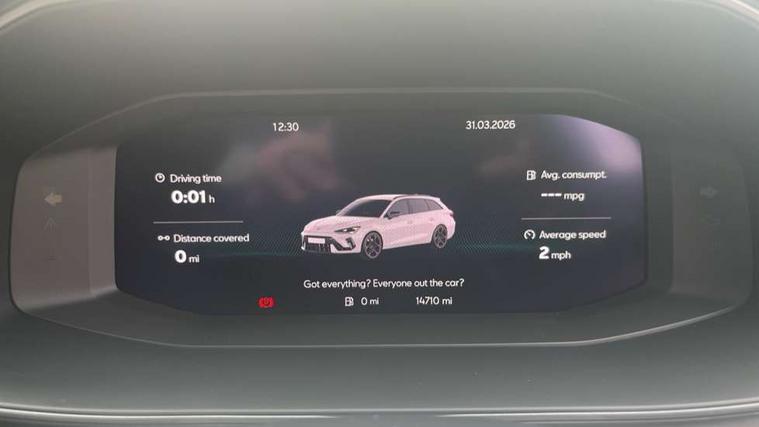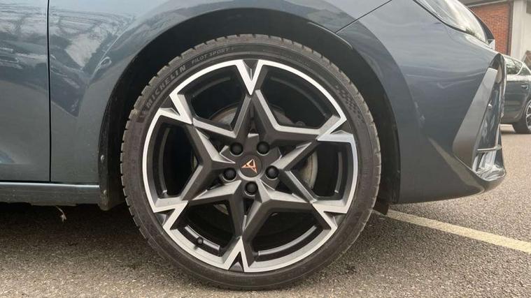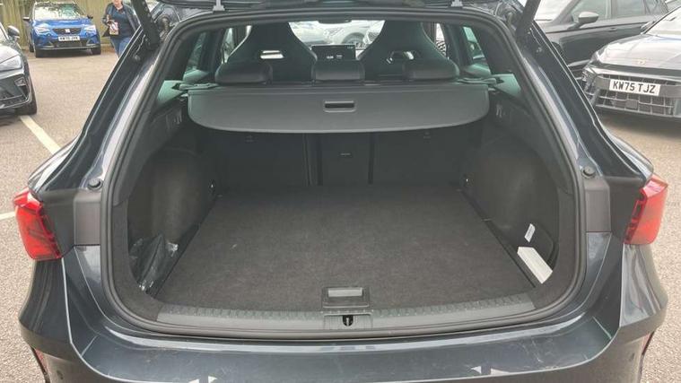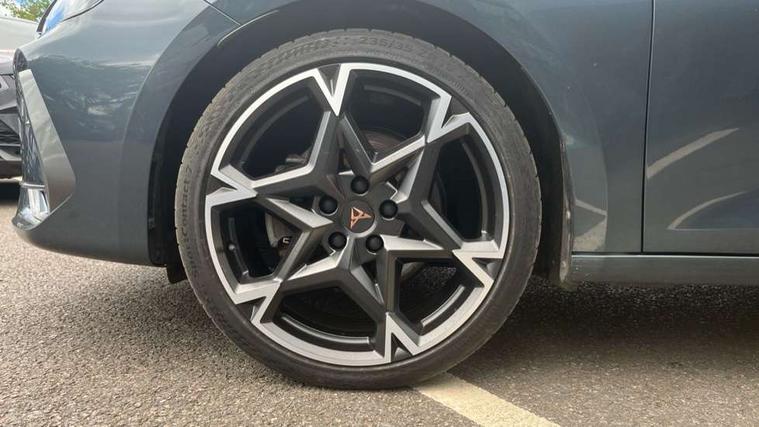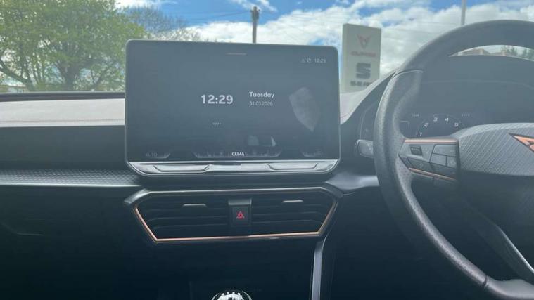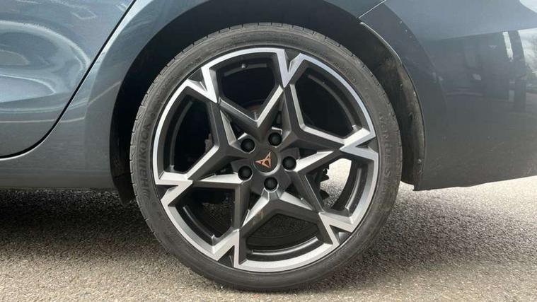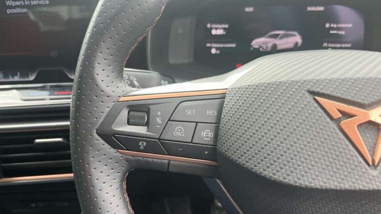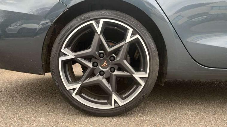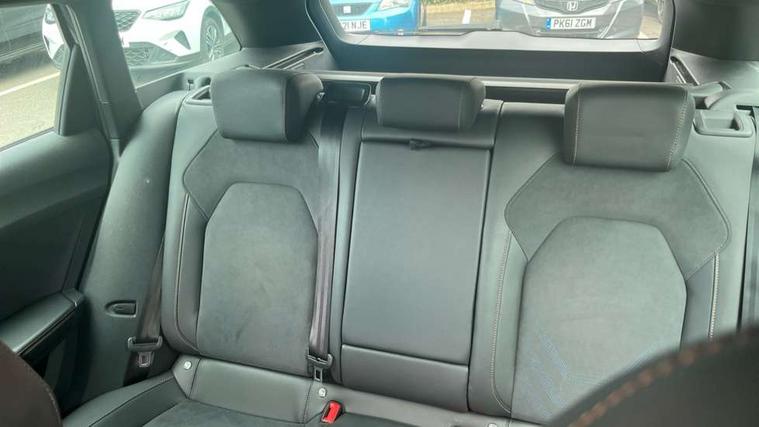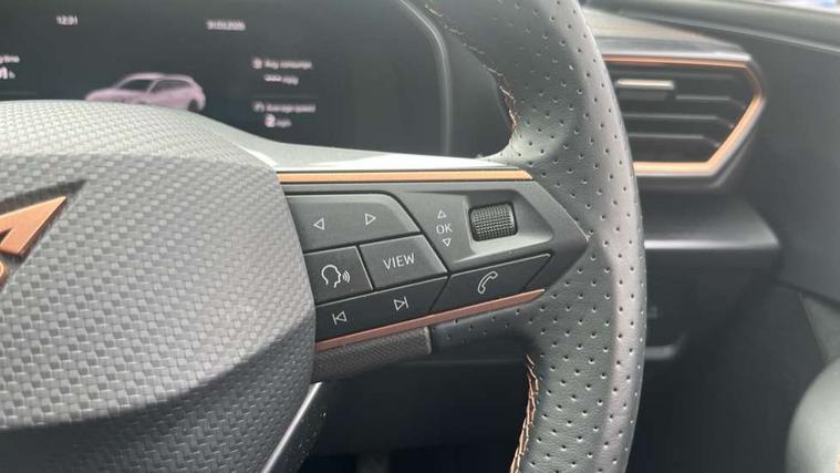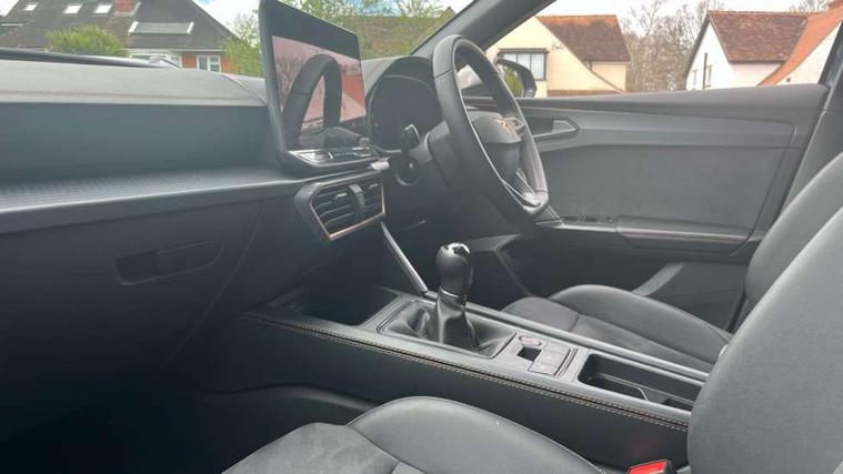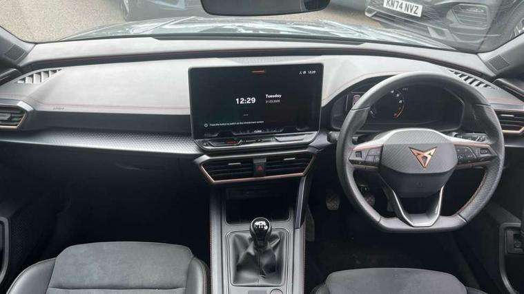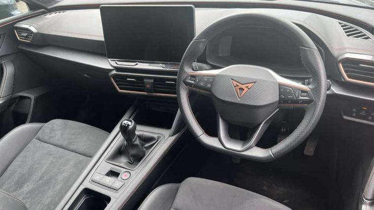 Adaptive cruise control with follow-to-stop and speed limiter, CUPRA drive profile selection with (Comfort/Sport/Individual), throttle response and gearshift mode, Digital cockpit, Dynamic road sign display, E-call, Front and rear parking sensors, Front assist with forward collision warning braking reaction to vehicles, pedestrians and cyclists, Full link smartphone integration with Mirror Link, wireless Apple CarPlay and wired Google Android Auto, Lane assist, Lockable tailgate, Rear view camera, RPM, trip computer, outside temp gauge, instrument light brightness, low fuel warning light, lights on reminder, gearshift indicator, Service interval indicator, Start/stop system with regenerative braking, Virtual pedal with electric tailgate, Wireless phone charger, Auxiliary input socket, Auto dimming rear view mirror, Body colour door handles, Body coloured bumpers, Cupra sports bumpers, Dark tinted rear windows, Electric front/rear windows, Electrically adjustable, heated and folding door mirrors, Gloss black roof rails, High beam assist, LED front fog lamps with cornering function, LED headlights with dynamic turn signals, tail lights, rear fog lights with rear coast to coast lighting, LED rear fog lamp, Rain sensing wipers, Rear side wing doors, Rear wash/wipe, Separate daytime running light with automatic headlight control and coming home feature, Third brake light, Welcome light with logo projector in door mirrors, 12v power supply in centre console, 3 seat bench in 2nd row, 5 headrests, 60/40 split rear bench seat with armrest, Ambient lighting (glovebox, footwell, ambient lighting multicoloured), Black headlining, CUPRA Leather flat bottomed, heated, perforated steering wheel, Dinamica cloth upholstery, Electrically adjustable driver seat and lumbar support with memory function + manually adjustable passenger seat, Four x USB Type C ports (2 in front and 2 in rear), Front and rear reading lights X 4, Front centre armrest, Heated front seats, Height/reach adjust steering wheel, Illuminated interior front door sills, Interior wraparound lighting, ISOFIX points in outer rear seats with top tether anchorage points, Single front passenger seat, Sliding boot cover, Storage pockets on rear of front seats, Sunvisors with illuminated mirror, Three zone climate control, Dynamic and comfort pack - Leon Cupra, Media system plus with 12.9" display + navigation pack - Leon Cupra, 3 point seatbelts on all rear seats, ABS, Brake control system - ESC and brake booster, Child proof door locks, Cupra black brake calipers, Driver and front passenger airbags with front passenger airbag de-activation, front side and curtain airbags, Electronic parking brake, Hill hold control, Rear disc brakes, Seat belt reminder for front and rear seats, Tiredness recognition system, Tyre pressure monitoring system, Anti theft alarm system with interior monitoring in cab, backup horn and towing protection, KESSY Advanced - Keyless start, keyless entry, Locking wheel bolts, Chrome and copper interior detailing, 19" Polar machined sport black and silver alloy wheel with 91Y tyres, Tool kit,