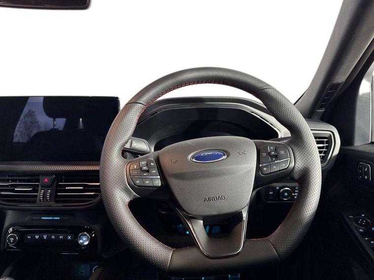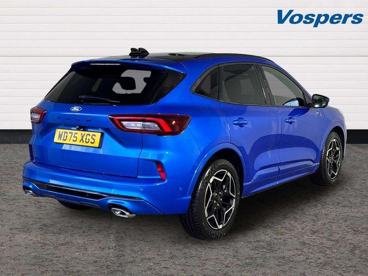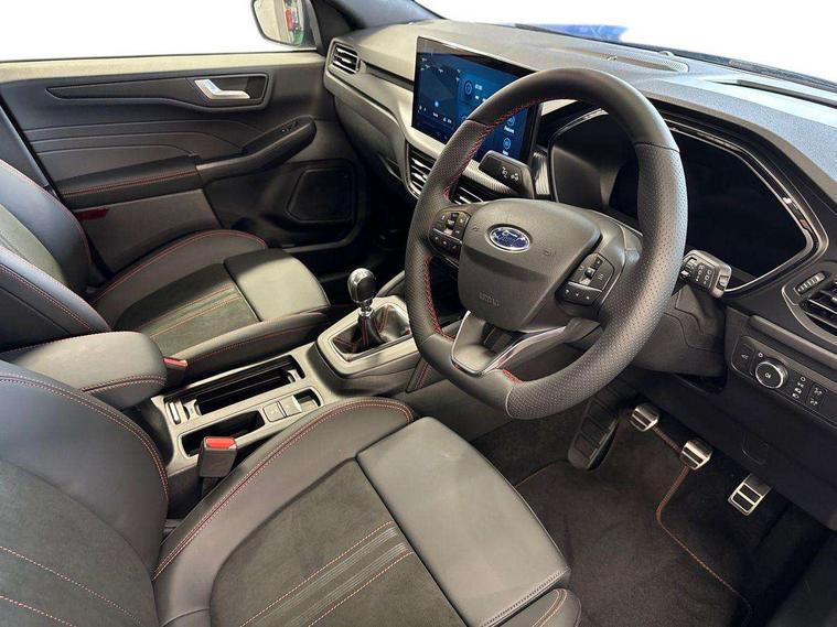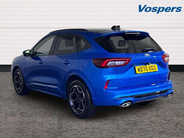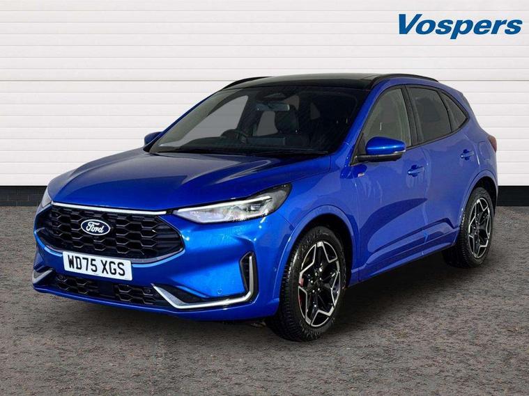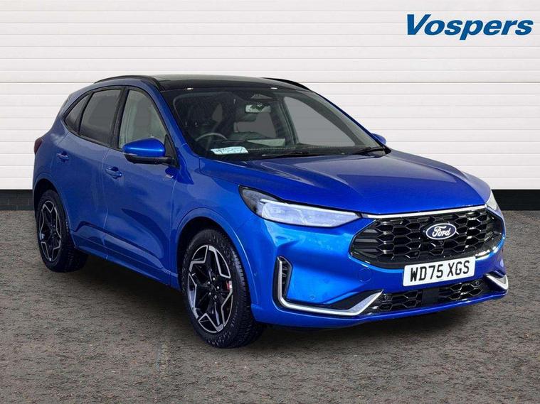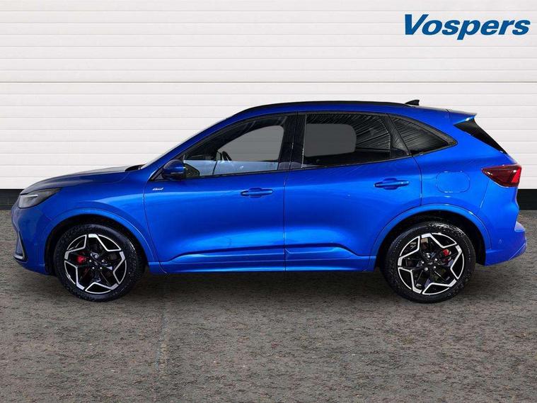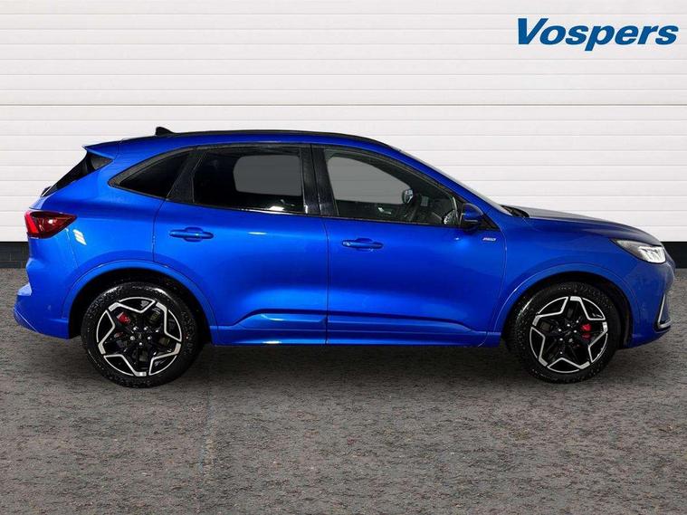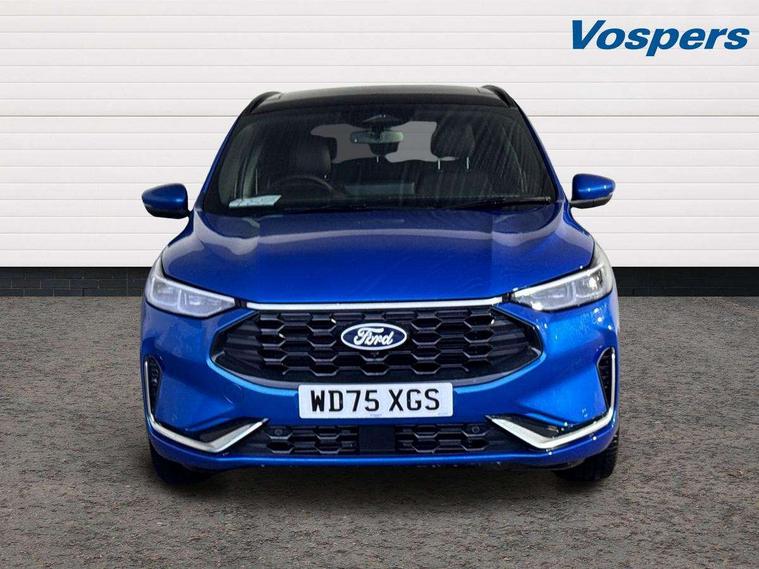 12.3" digital colour instrument cluster, 360 degree view camera, Cross traffic alert with active braking, e-Call (emergency call), Ford easy fuel, Ford SYNC 4 Navigation with 13" touchscreen, DAB radio, emergency assistance, Andriod Auto/Apple CarPlay, 5G modem & Ford Pass connect, Front and rear parking sensors, Hands free power tailgate, Lane keeping aid with lane departure warning, Power assist steering, Selectable drive modes, Service interval indicator, Sports suspension, B&O premium audio system with 10 speakers, subwoofer and 2 USB ports, Auto headlamps with high and low beam, Black roof rails, Body colour bumpers, Front LED fog lamps, Large rear spoiler, LED daytime running lights, LED rear lights, LED third brake light, Pop out door edge protectors, Power front/rear windows with global close, Power heated folding door mirrors with puddle lights, memory function and camera, Power opening panoramic roof, Quickclear heated windscreen, Rain sensing wipers, Rear privacy glass, Rear side wing doors, Rear wiper, ST-Line body styling kit, 2nd row sliding seats, Electronic automatic temperature control (EATC), Front and rear head restraints, Partial premium touch sensico upholstery, Rear centre head restraint, Single front passenger seat, Sports seats, Driver assistance pack - Kuga Manual, Winter pack - Kuga, 3x3 point rear seatbelts, Airbags - front driver/passenger, front and rear curtain, Drivers knee airbag, Dynamic brake support, Electronic stability control (ESC) and ABS, Evasive steering assist, Ford MyKey Gen 2 safety system, Manual child proof rear door locks, Pre collision assist with autonomous emergency braking, Rear seat Occupancy alert, Red brake calipers, Tyre pressure monitoring system, Engine immobiliser, Keyless entry and Ford power start button (Keyless start), Locking wheel nuts, Remote powered central double locking doors, Thatcham category 1 alarm,