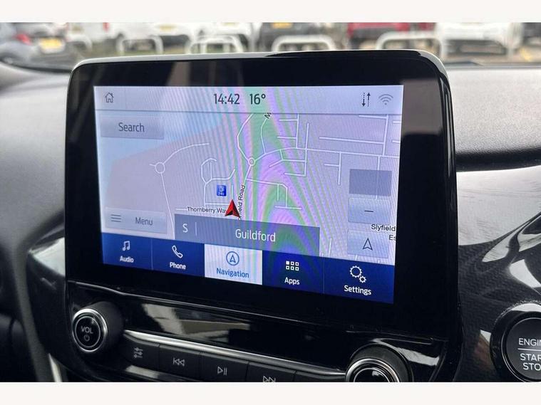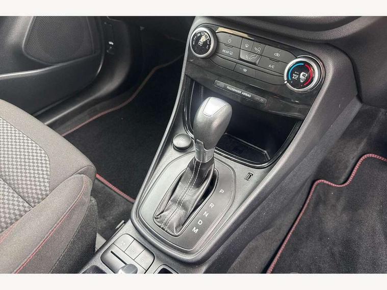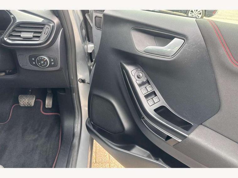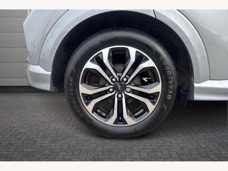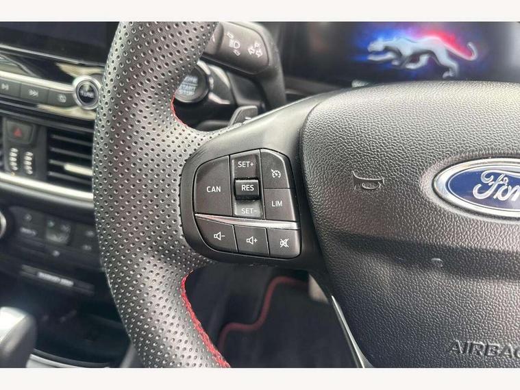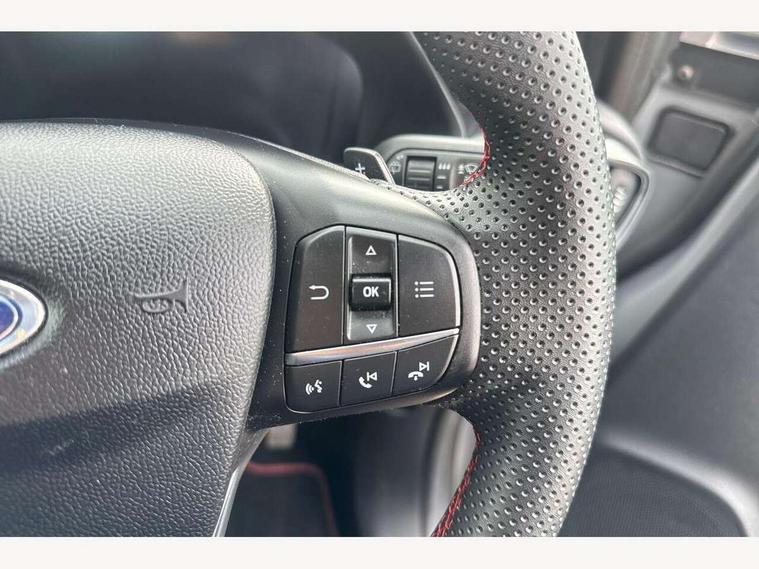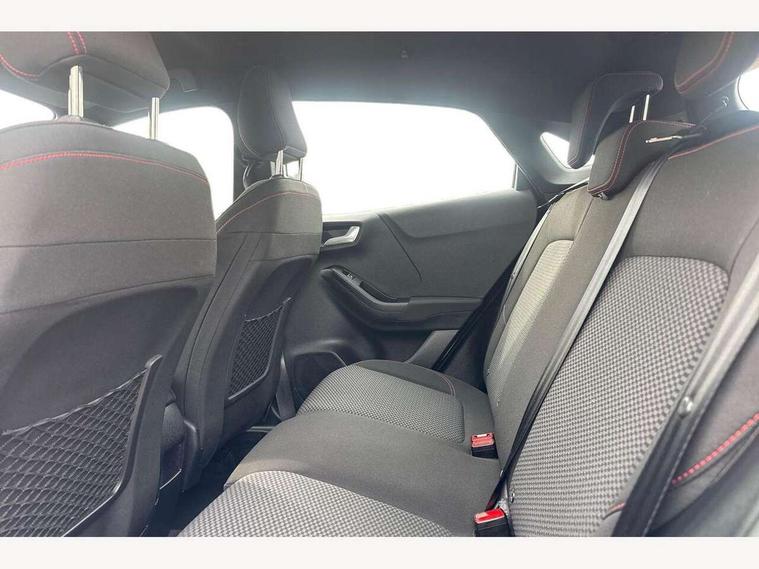 Driver impairment monitor, Emergency call service, Ford easy fuel, Full digital 12.3" instrument cluster, Lane keeping aid with lane departure warning, Power assist steering, Power start button, Rear parking sensor, Selectable drive modes(Normal, Eco, Sport, Slippery and Trail), Speed sign recognition, Sport suspension, Automatic headlights with auto high beam, Automatic rain sensing wipers, LED rear lamps, Power foldable heated door mirrors with puddle lamps, Projector headlamps with LED day time running lights and front fog lamps, Quickclear heated windscreen, Rear side wing doors, Rear wiper, ST-Line body styling kit with unique grille and large body colour rear spoiler, Third brake light, 3 seat bench in 2nd row, Centre console with armrest and stowage, Ford megabox extended bootspace, Front and rear head restraints, Front floor mats, Manual 2 way passenger seat adjustment, Manual 4 way driver seat adjust with lumbar adjustment, Single front passenger seat, ST- Line cloth trim with red stitching, ST-Line flat bottomed sensico leather steering wheel with leather handbrake and aluminium gear knob, Ford SYNC 3 navigation pack - Puma, 3 rear seatbelts, Child safety lock, Electronic stability control (ESC) and hill start assist, Pedestrian/cyclist detection & post-collision braking, Pre collision assist system, Tyre pressure monitoring system (TPMS), Thatcham alarm,