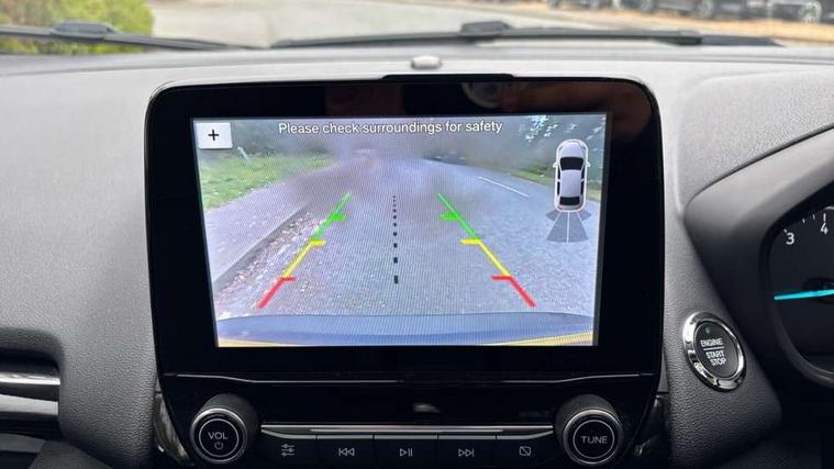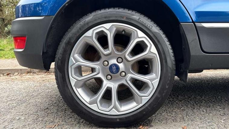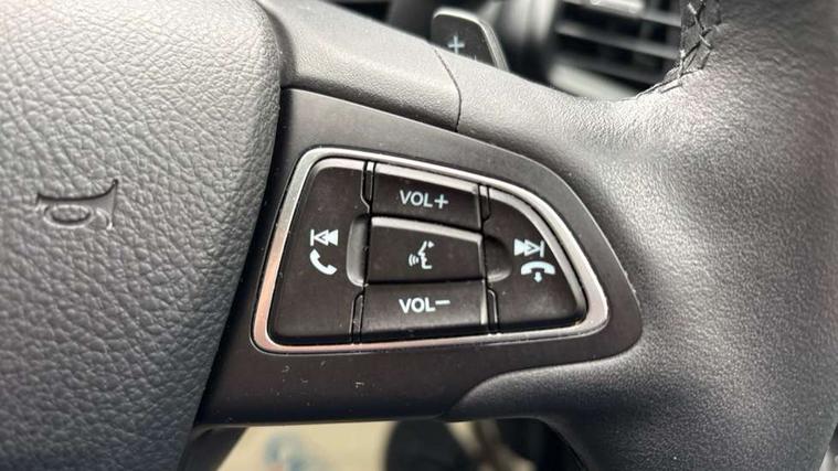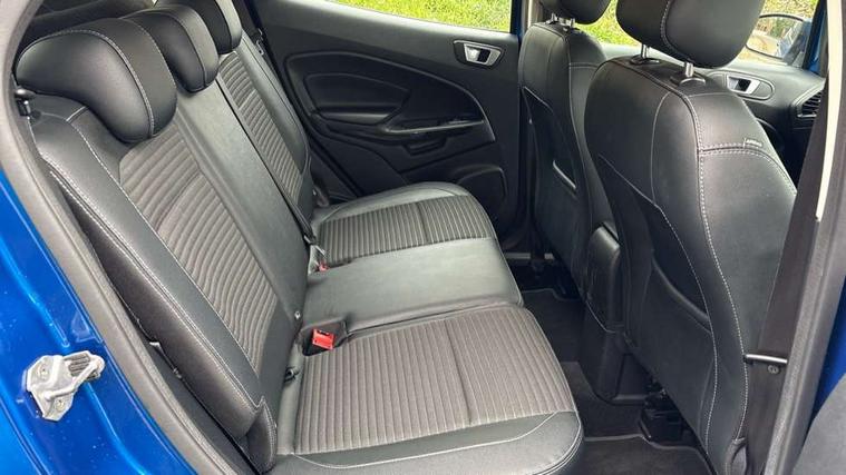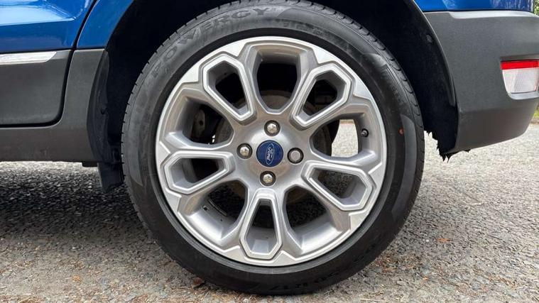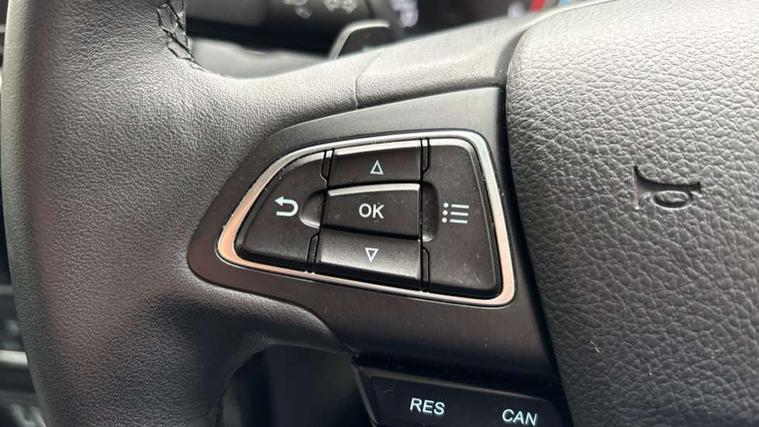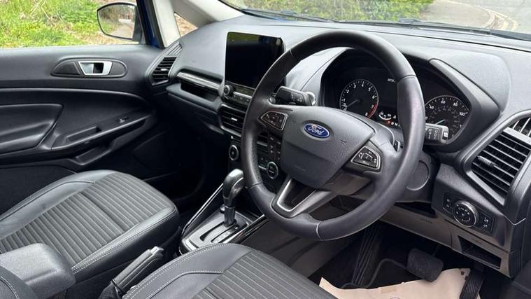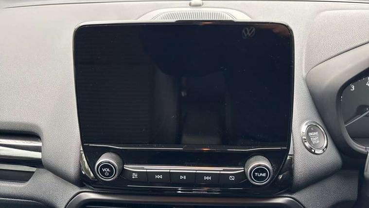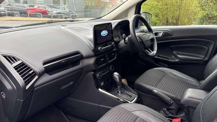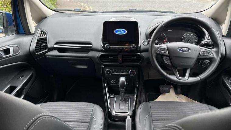Cruise control, Easy fuel capless refuelling system, PAS, SYNC 3 nav system with DAB radio, 8" screen, voice control, emergency assistance, Apple car play/Android auto, 2x USB, Ford pass connect, Trip computer, 'Quickclear' heated windscreen/heated washer jets, Auto dimming rear view mirror, Automatic headlights, Body colour door handles, Body coloured bumpers, Electrically adjustable and heated door mirrors, Front door threshold plates, Front fog lights, Front grille with chrome trim surround, Headlamps with LED day running lights, Headlight levelling control, Power foldable door mirrors with puddle lights, Power front and rear windows with global opening/closing, Rain sensing front wipers, Rear wiper, 12V socket in front and rear, 60/40 split rear seats, 7 shade adjustable ambient lighting, Centre console with sliding front armrest, Cooled glovebox, Courtesy lights with map reading light, Driver seat height/lumbar adjust, Driver's side glovebox, Driver/passenger sunvisors and lidded vanity mirrors, EATC - Electronic Auto Temperature control, Folding grab handles, Footwell ambient lighting, Front head restraints, Front seat back map pockets, Front/rear floor mats, Groove cloth/leather upholstery, Illuminated glovebox, Illuminated luggage compartment, Isofix system on outer rear seats, Leather gear knob and handbrake grip, Leather steering wheel with audio controls, Luggage compartment carpet, Overhead console with sunglasses holder, Rake adjustable rear seats, Reach + rake adjustable steering column, Rear headrests, Steering wheel with chrome inserts, Storage drawers under front seats, Tie down hooks, Variable boot floor, Rear view camera pack - Ecosport, 3x3 point rear seatbelts, ABS, Child locks on rear doors, Curtain airbags, Driver airbag, Drivers knee airbag, Electronic Stability Programme with hill launch assist, Emergency brake assist, Front passenger airbag deactivation, Front side airbags, Passenger airbag, Seatbelt reminder for driver and front passenger, Traction control, Tyre pressure monitoring system, Immobiliser, MyKey system, Remote central locking, Thatcham 1 volume sensing alarm, Tyre inflation kit,