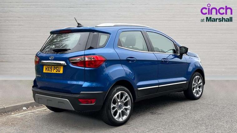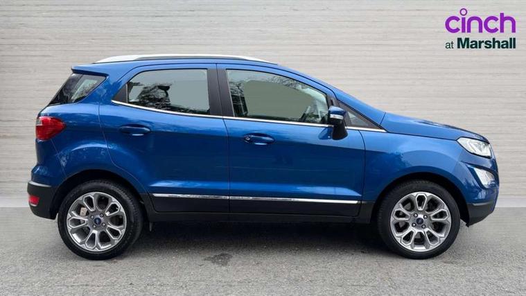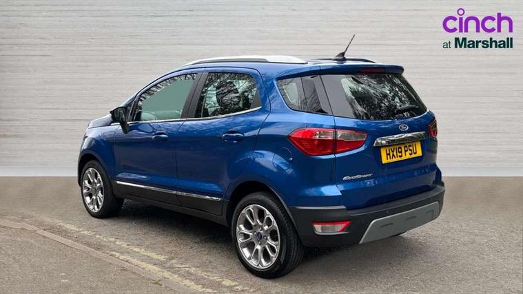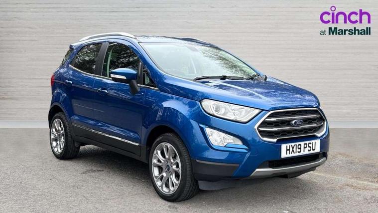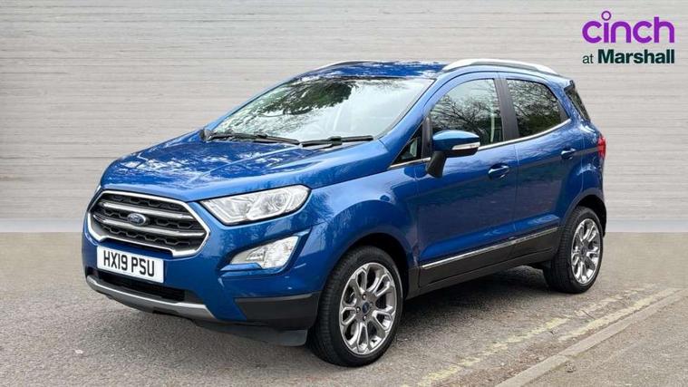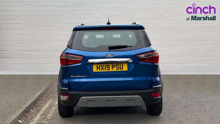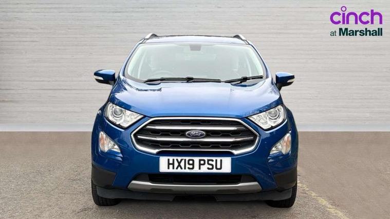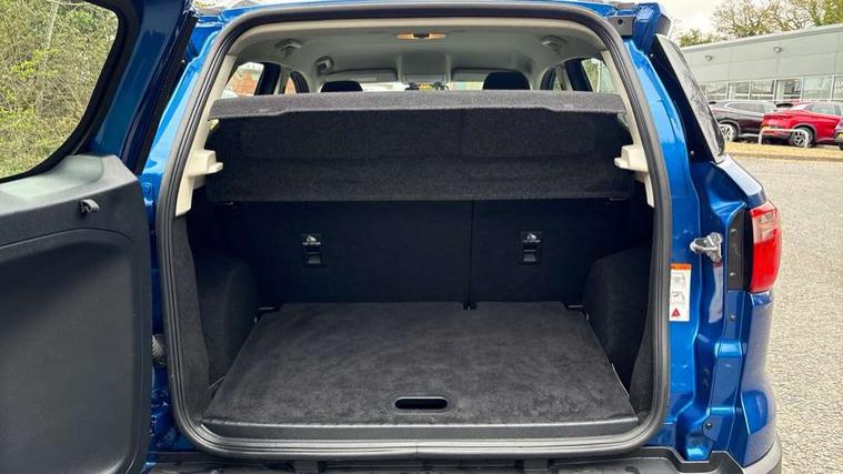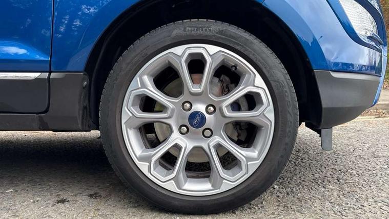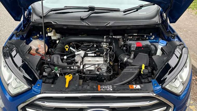 Cruise control, Easy fuel capless refuelling system, PAS, SYNC 3 nav system with DAB radio, 8" screen, voice control, emergency assistance, Apple car play/Android auto, 2x USB, Ford pass connect, Trip computer, 'Quickclear' heated windscreen/heated washer jets, Auto dimming rear view mirror, Automatic headlights, Body colour door handles, Body coloured bumpers, Electrically adjustable and heated door mirrors, Front door threshold plates, Front fog lights, Front grille with chrome trim surround, Headlamps with LED day running lights, Headlight levelling control, Power foldable door mirrors with puddle lights, Power front and rear windows with global opening/closing, Rain sensing front wipers, Rear wiper, 12V socket in front and rear, 60/40 split rear seats, 7 shade adjustable ambient lighting, Centre console with sliding front armrest, Cooled glovebox, Courtesy lights with map reading light, Driver seat height/lumbar adjust, Driver's side glovebox, Driver/passenger sunvisors and lidded vanity mirrors, EATC - Electronic Auto Temperature control, Folding grab handles, Footwell ambient lighting, Front head restraints, Front seat back map pockets, Front/rear floor mats, Groove cloth/leather upholstery, Illuminated glovebox, Illuminated luggage compartment, Isofix system on outer rear seats, Leather gear knob and handbrake grip, Leather steering wheel with audio controls, Luggage compartment carpet, Overhead console with sunglasses holder, Rake adjustable rear seats, Reach + rake adjustable steering column, Rear headrests, Steering wheel with chrome inserts, Storage drawers under front seats, Tie down hooks, Variable boot floor, Rear view camera pack - Ecosport, 3x3 point rear seatbelts, ABS, Child locks on rear doors, Curtain airbags, Driver airbag, Drivers knee airbag, Electronic Stability Programme with hill launch assist, Emergency brake assist, Front passenger airbag deactivation, Front side airbags, Passenger airbag, Seatbelt reminder for driver and front passenger, Traction control, Tyre pressure monitoring system, Immobiliser, MyKey system, Remote central locking, Thatcham 1 volume sensing alarm, Tyre inflation kit,