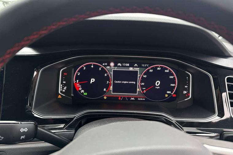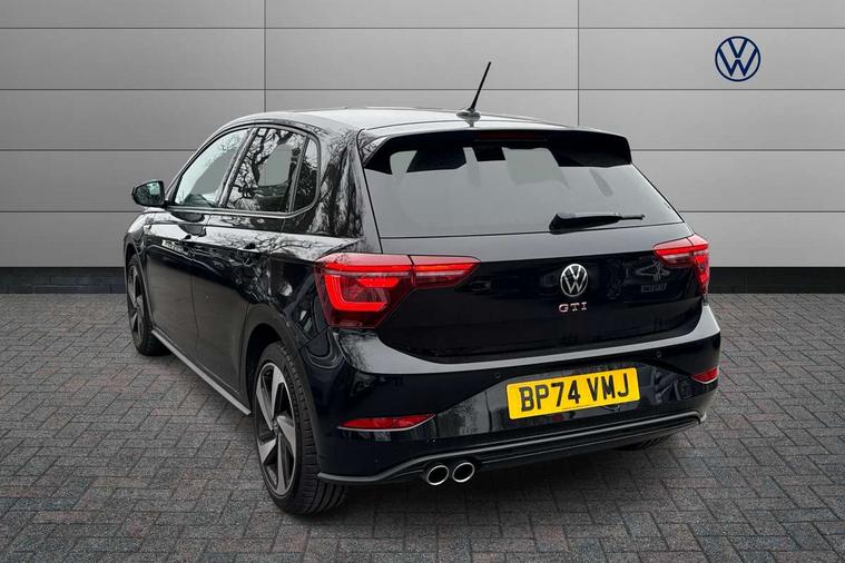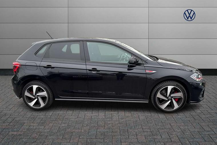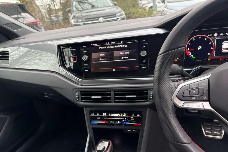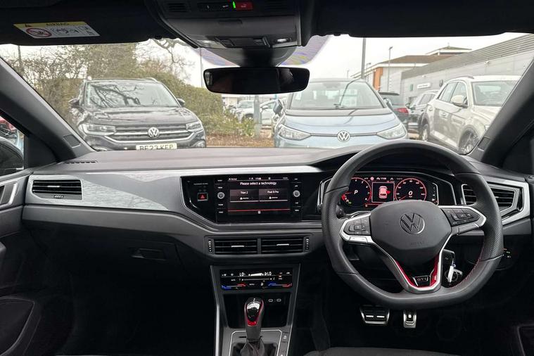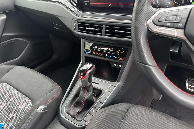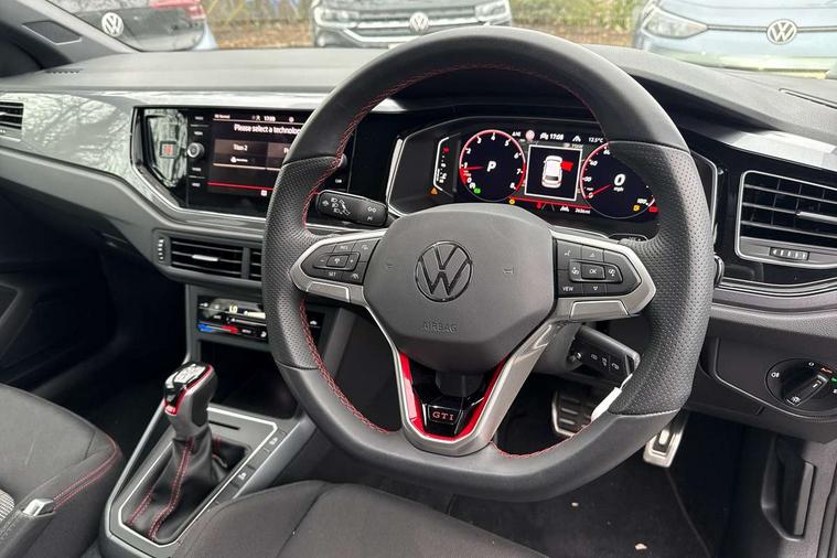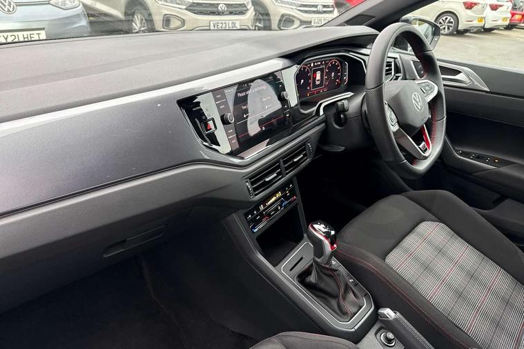 Adaptive cruise control with follow-to-stop and speed limiter, Advanced driver attention and drowsiness monitor, Bluetooth mobile phone interface, Digital Cockpit Pro with 10.25" Display, Dynamic road sign display, Eco mode, Emergency call service, Multifunction camera, Power assisted speed sensitive steering, Preparation for We connect and We connect plus, Speedo and rev counter, electronic odometer, trip, service interval display and fuel gauge, Travel Assist - Lane keeping system and traffic jam assist, Travel assist including emergency assist, Trip computer, Warning signal and warning light for front and rear seatbelts not fastened, Washer fluid level indicator, Wireless app connect, Adaptive chassis control, Front wheel drive, Heavy duty rear axle, Rear shock absorpion sports version, Sports select suspension lowered by 15mm, Start-stop system with battery regeneration (recuperation - energy recovery during braking), DAB Digital radio, Diversity antenna for FM reception, Front and rear 6 speakers, Body colour bumpers, Body colour door handles, Electric front windows, Front scuff plates in aluminium with GTI logo, Heat insulating glass windscreen, Power folding adjustable/heated exterior mirrors and front passenger exterior mirror lowering function, Rain sensor, Rear electric windows, Rear fog light, Rear side wing doors, Rear windscreen washer and wiper with interval delay, Sport bumpers with air intakes with honeycomb structure, Third brake light, Twin chrome exhaust tailpipes, 12V power socket in centre console, 2 USB-C ports in the front, 2 USB-C charging sockets on the center console in the rear, 3 rear head restraints, 60/40 split folding rear seat and rear seat bench not split, Air care climatronic air conditoning system with active combination filter and 2-zone temperature control, Black roof lining, Carpet mats, front and rear, Chrome plated radiator grille inserts, air vent surrounds and light switch surrounds, Door and side trim panel, Driver and front passenger seat height adjustment, Driver/passenger sunvisors with illuminated vanity mirrors, Front centre armrest, Front footwell illumination, Front seat backrest storage pockets, GTI sports gearshift knob in aluminium leather, Handbrake lever handle in leather, Headliner in recycled material, Isofix child seat preparation easy-fit (for two outer rear seats, and front passenger seat) compatible with I-size, LED interior light with switch off delay and dimmer, 2 reading lights front and rear, Luggage compartment cover, Luggage compartment floor, Luggage compartment lighting, Lumbar adjustment for front seats, Single front passenger seat, Stainless steel pedals, Standard pedal cluster, Three spoke leather wrapped multifunction sports steering wheel with shifting paddles, IQ LED matrix headlights pack - Polo, Light and sight pack - Polo GTI, 3 point height adj front seatbelts + pretensioners, 3x3 point rear seatbelts, ABS, Driver and front passenger airbag with front passenger airbag deactivation, Drivers and front passengers safety optimised head restraints, ESC (Electronic stability control) + EDL (Electronic Differntial lock) and ASR (Traction control), Extended and predictive pedestrian/ cyclist protection, Front and rear disc brakes with red brake calipers, Front curtain and side airbags with center airbag, Hill hold control, Manual child lock in rear doors, Two tone horn, Tyre pressure loss indicator, Alarm with interior protection, Anti-theft alarm system with interior monitoring, backup horn, and towing protection, Anti-theft wheel bolts, Electronic engine immobiliser, Chrome applications on rotary light, mirror adjustment, window regulator switches, outlet with frame in black, Low rolling resistance tyres,