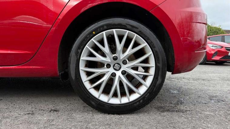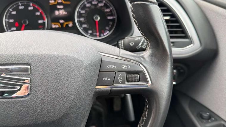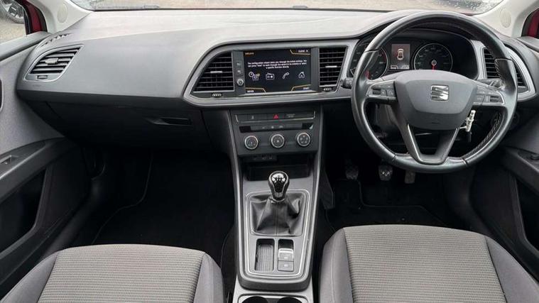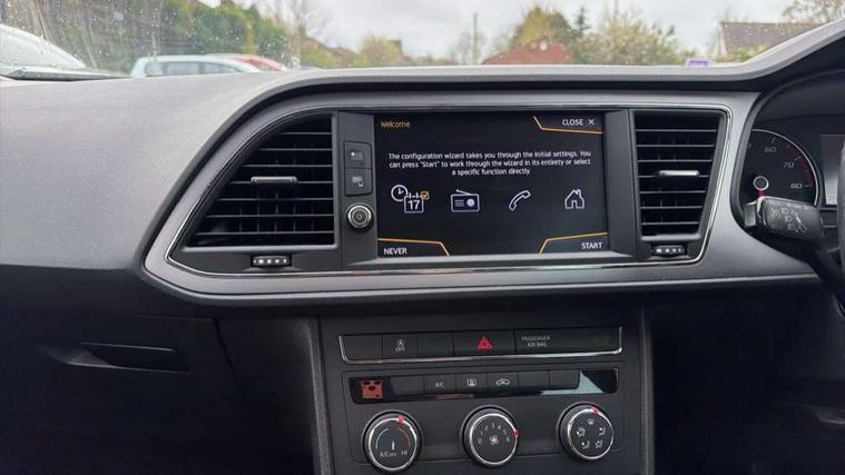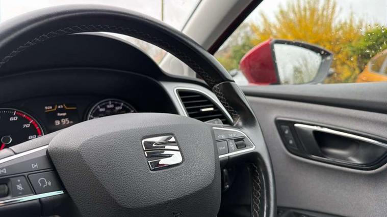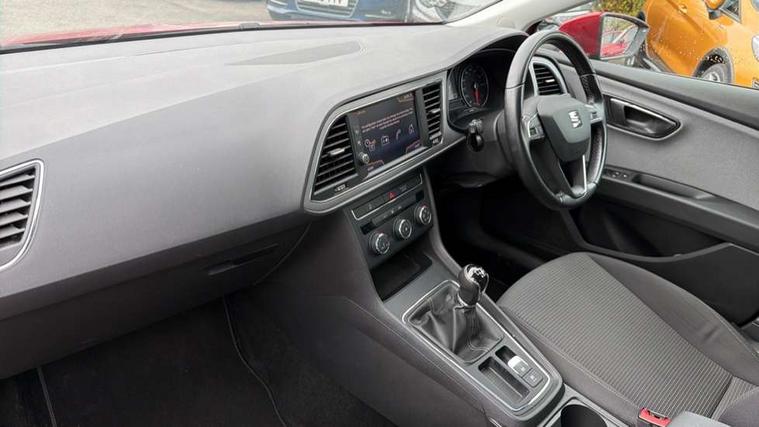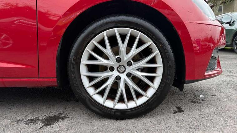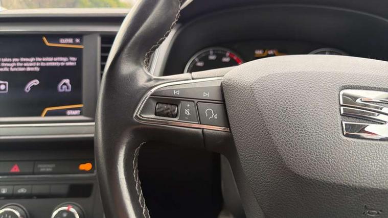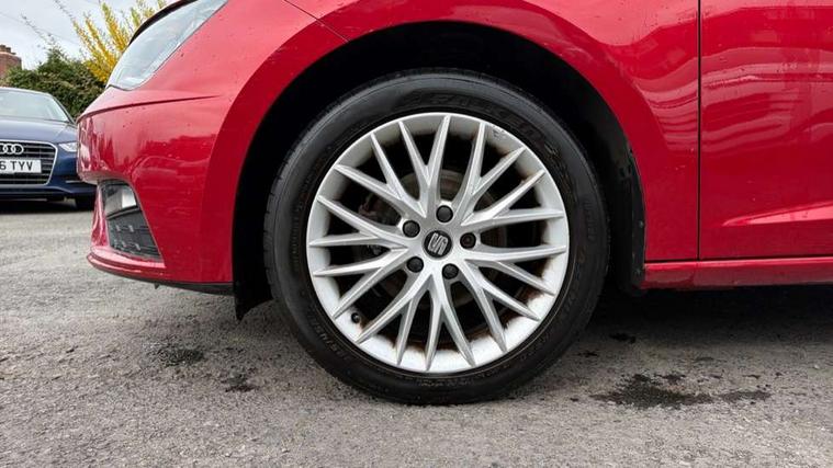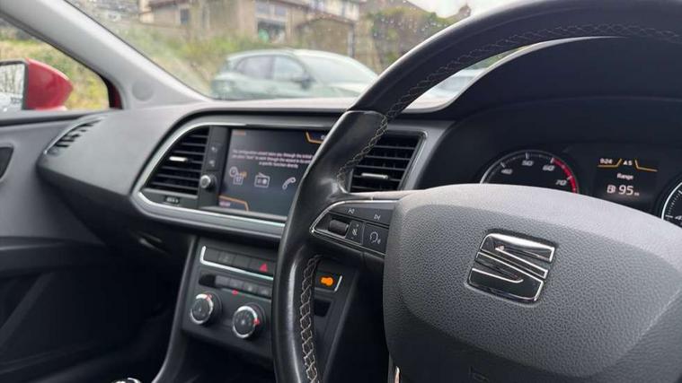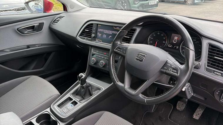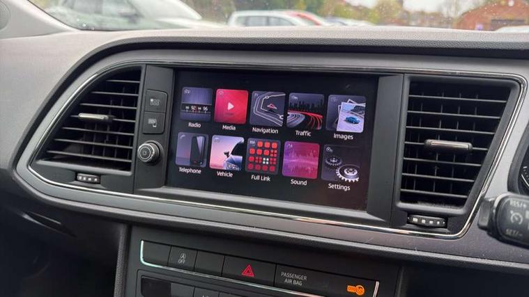 'Lights On' Reminder warning buzzer, 8" touch screen, Bluetooth Handsfree Phone Connection, Electro-mechanical PAS, Low fuel warning light, Outside temperature gauge, Rear parking sensors, Remote fuel flap release, SEAT logo boot release, Service interval indicator, Trip computer, Voice control system, Comfort suspension, XDS electronic differential lock, 2 USB ports, 2 USB sockets in rear, 2x SD card slot, Auxiliary input socket, Bluetooth audio streaming, DAB Digital radio, Radio/CD + MP3, Steering wheel mounted audio/phone controls, Black grille with chrome surround, Body colour door handles, Body coloured bumpers, Body coloured door mirrors, Dark tinted rear windows, Electric front/rear windows with one touch/auto up/down, Electric headlamp adjustment, Electrically adjustable door mirrors, Heated door mirrors, High gloss black finish B and C pillars, LED daytime running lights, LED indicators in door mirrors, Rear wash/wipe, 12v power point in centre console, 3 height adjustable rear headrests, 60/40 split folding rear seat, Active head restraints, Additional heating and ventilation outlet in rear of centre console, Boot net, Cloth upholstery, Driver seat height adjust, Driver seat lumbar adjustment, Dust/pollen filter, Front armrest with storage box, Front comfort seats, Front cupholders x 2, Front seat and rear pockets, Front/rear floor mats, Height/reach adjust steering wheel, Instrument lighting with brightness control, Leather handbrake, Leather steering wheel and gear knob, Luggage tie-down hooks, Passenger seat height adjuster, Rear top tether child seat ISOFIX attachment, Storage box under drivers seat, Seat navigation pack - Leon, 3 point seatbelts on all rear seats, ABS + traction control, Active pedestrian safety system, Child proof door locks, Collision mitigation braking system, Curtain airbags, Driver/Front Passenger airbags, Drivers knee airbag, Electronic parking brake with auto hold, ESP+EBA, Front assist including city emergency braking, Front seatbelt pretensioners, Front Seatbelt warning, Front side airbags, Hill hold control, Manual passenger airbag deactivation function, Tyre pressure monitoring system, 2 folding remote keys with window open/close function, Engine immobiliser, Locking wheel bolts, Remote central locking + deadlocks, Volumetric alarm with back up horn, Chrome interior trim, 17" Dynamic alloy wheels 30/3,