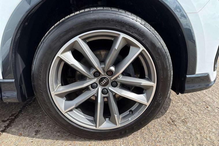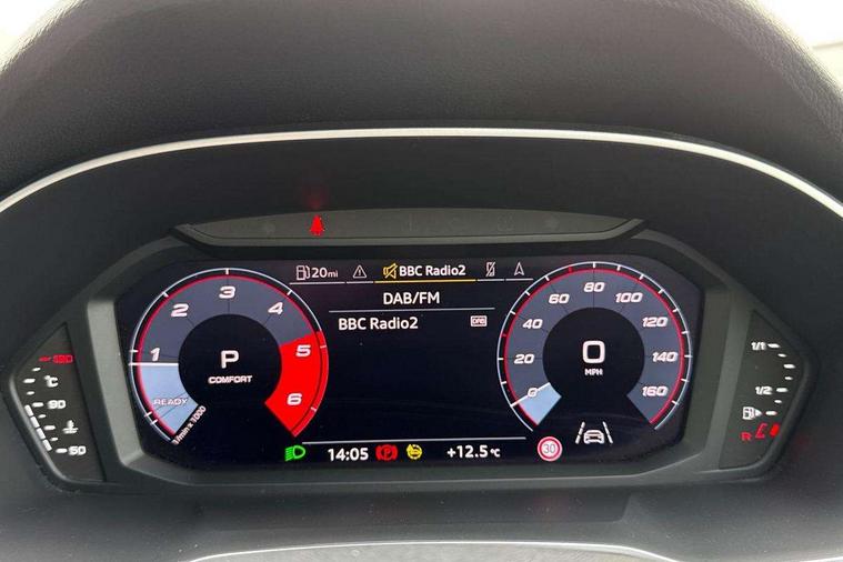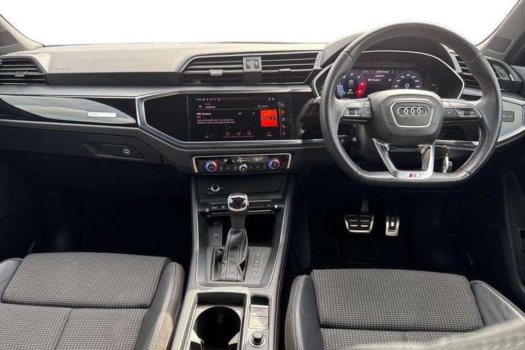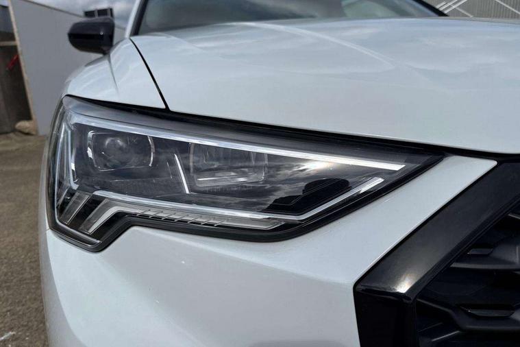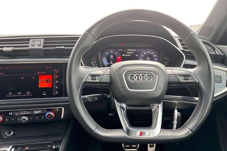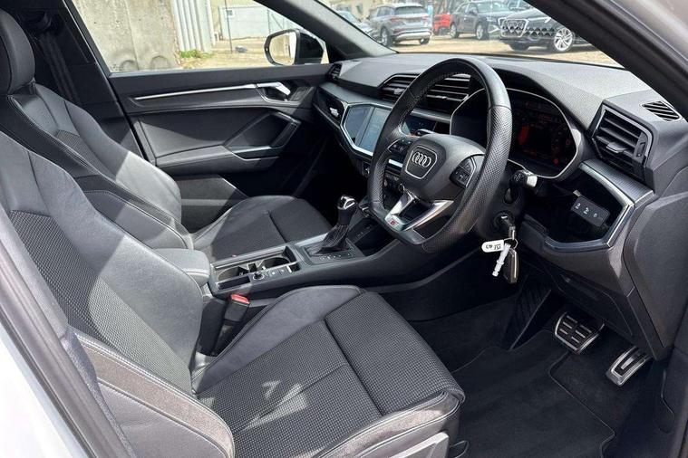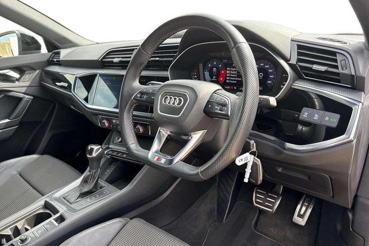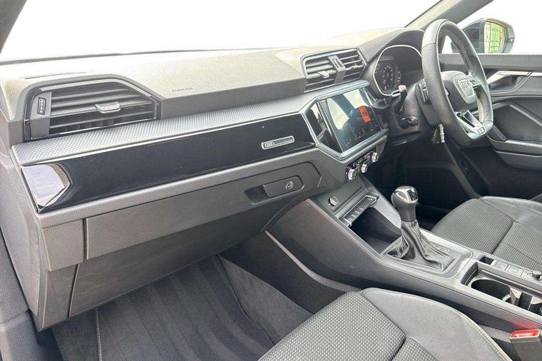 Audi connect safety and service (e-call), Audi drive select, Audi lane departure warning, Audi smartphone interface includes wireless Apple carplay/Android Auto, Audi Virtual Cockpit - 10.25" display, Bluetooth interface, Camera based traffic sign recognition, MMI Navigation Plus with high resolution 10.1 inch touchscreen colour display, Power operated tailgate, Progressive steering, Service interval indicator, Start stop system with recuperation, Voice control system with natural language interaction, Diesel particulate filter, Sports suspension, 2 USB-C ports with charge and data functions, 6 passive loudspeakers, DAB digital radio module, Acoustic windscreen, Auto dimming frameless rear view mirror, Bumpers and underbody protection in contrasting manhattan grey paint finish, Diffuser grille in grained matt black, Diffuser trim in selenite silver, Electrically folding, adjustable and heated door mirrors with integrated LED side indicators and kerb view function for passenger side, Front and rear electric windows, Front fog lights, Front side air inlets in selenite silver, High gloss black finish B and C pillars, LED headlights with LED daytime running lights and dynamic rear indicator, LED rear lights, Privacy glass dark tinted rear and rear-side windows (from B-pillar backwards), Rain and light sensors, Rear underbody protection in matt black, 12V socket in rear centre console, 40:20:40 folding with manual adjustment for 60:40 forwards/backwards position and backrest angle, Adjustable rear seat bench/backrest with centre armrest and cupholder, Black cloth headlining, Dual zone electronic climate control, Front and rear black floor mats with contrast stitching, Front and rear headrests, Front and rear roof module including reading lights, Front centre armrest, Glove compartment lighting, Height and reach adjustable steering wheel, Illuminated door sill trims with S logo, ISOFIX child seat mounting for front passenger with airbag deactivation and outer rear seat including top tether attachment point for outer rear seats, Luggage compartment light, Manual front seats with height adjustment, Perforated leather gearknob, Stainless steel luggage compartment sill finisher, Stainless steel pedals, Black styling pack - Q3, Non smoking pack - Q3, 3x3 point rear seatbelts, 6 airbags - Driver, front passenger, curtain and side windows, Electrically operated child locks on rear doors, Electromechanical parking brake, Electronic stabilisation control including ABS, ASR and EDL, Hill descent control, Hill hold assist, Pre sense basic, Seatbelt monitoring, Tyre pressure warning, Warning triangle and first aid kit, Anti theft alarm, Anti theft wheel bolts, Audi pre-sense front with pedestrain and cyclist recognition, Remote central locking, Black dashboard, Leatherette door armrest, MMI touch colour display in glass look, black with surround in aluminium look, Piano black inlay,