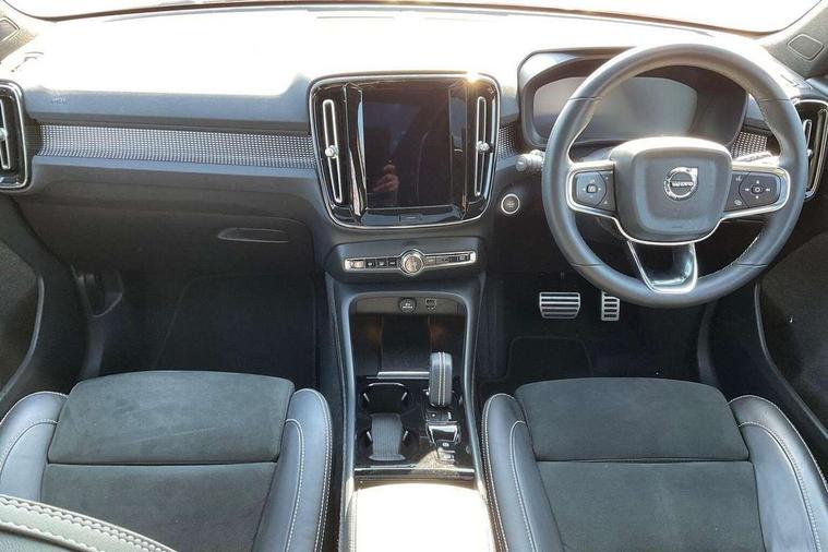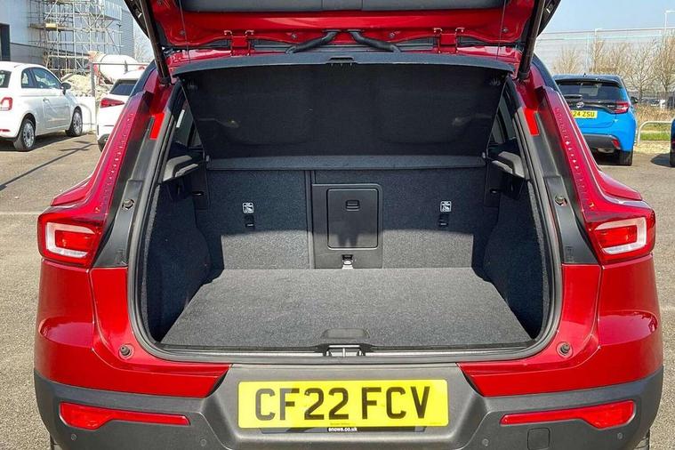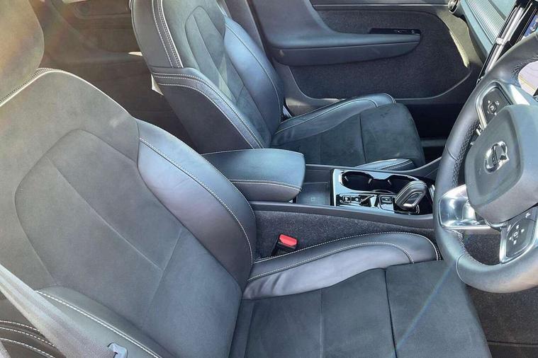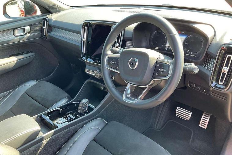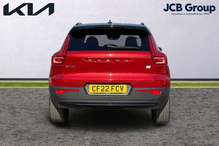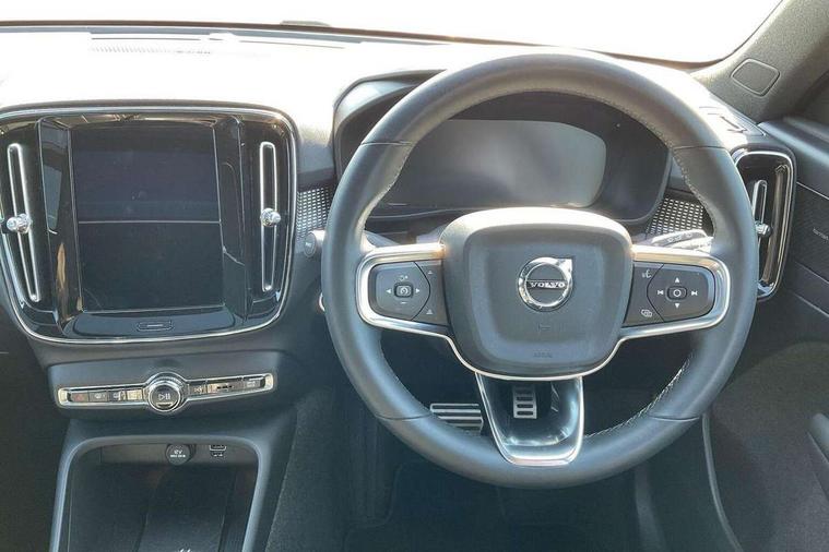 12.3" Active TFT crystal driver's instrument display, 9" centre console portrait touch screen, Adjustable steering wheel force, Bluetooth hands free telephone kit, Drive mode selector, E-call, Lane keep assist with driver alert control, Oncoming Lane Mitigation, Power operated tailgate, Sensus navigation with European mapping and traffic information, Speed limiter, Speed sensitive steering, Voice activated control for key functions, Volvo on call, 7m 10amp charge cable with 3 pin plug and 7m 1 phase 16amp type 2/mode 3 charge cable, Electric front axle drive, Recharging port located in nearside front wing, Sports chassis, DAB Digital radio, Low speed exterior sound speaker, Steering wheel mounted remote controls, Adaptive brake lights with high level LED brake lights, Auto dimming interior mirror, Automatic headlamp levelling, Automatic LED Headlights + Active high beam incorporating daytime running lights, Dark tinted windows for rear door side windows and cargo compartment, Electric adjustable/heated/auto folding door mirrors, Front aluminium tread plates, Front and rear electric windows, Heated front windscreen, High gloss black front and rear skid plate, High gloss black lower front bumper, High gloss black mesh front grille with high gloss black surround, High gloss black sensus surround deco, High gloss black window trim, Home safe and approach lighting, Integrated roof rails in high gloss black, Rain sensor with automatic windscreen wiper activation, Rear side wing doors, Rear wiper, Roof antenna, Roof spoiler, Visible VIN plate, 12V socket in front tunnel console and cargo compartment, 2 zone electronic climate control and rear air vent, 3 seat bench in 2nd row, 60/40 versatile split folding rear seat, A-pillar parking ticket holder, Bright metal luggage threshold, Centre console cupholders and storage, Charcoal headlining, Front footwell illumination, Front headrests, Front reading light and theatre lighting, Front seat cushion extensions, Glovebox bag hook, Heated front seats, Height/reach adjustable steering column, Height/tilt adjustable driver's seat, High gloss centre tunnel deco, Illuminated glovebox, Illuminated luggage compartment, Illuminated vanity mirrors, Isofix attachments on rear seats, Leather gearknob, Load protection net, Multi directional lumbar support, Power driver seat with memory + exterior mirrors memory, Rear armrest / integral cup holders / storage tray, Rear coat hook, Single front passenger seat, Sports floor mats, Sports pedals, Sports tailored steering wheel, Underfloor cargo storage, Vanity mirror with ticket holder, Lighting pack - XC40, 3x3 point rear seatbelts, City safety includes pedestrian, cyclist and large animal detection and front collision warning with full auto brake, Drivers knee airbag, Dual stage driver/passenger airbags, Electronic parking brake with auto hold, First aid kit, Front and outer rear seatbelt reminder and pretensioners, Front seats SIPS airbags, Hill descent control, Hill start assist, Inflatable curtain, Passenger airbag cut-off device, Road sign information display, Run off Road Mitigation, Run off Road Protection, SIPS (Side Impact Protection System), Slippery road and hazard light alert, Stability and Traction Control with Spin control, Engine Drag Control and Corner Traction Control, Tyre pressure monitoring system, Vehicle deceleration control with Anti-lock Brake System, Electronic Brake Distribution and Emergency Brake Assist, Warning triangle, WHIPS whiplash protection system - front, Anti-theft alarm including immobiliser/volume sensor + level sensor, Care key with user defined top speed, Key integrated remote control central locking + fuel flap with deadlocking system and auto open/close power windows, Locking wheel nuts, Private locking for tailgate, Cutting edge aluminium inlay, Lower dashboard, tunnel console and door panel in charcoal, 20'' 5 double spoke diamond cut/high gloss black alloy wheels,