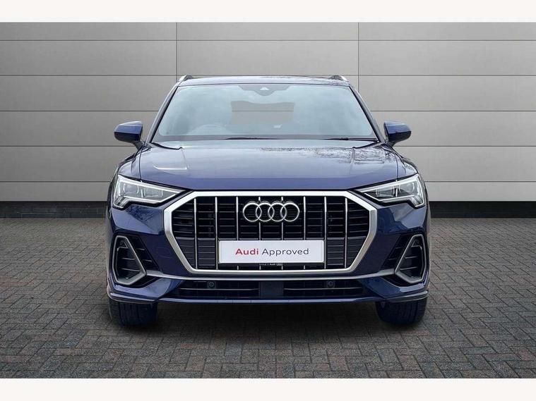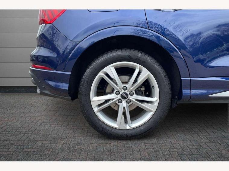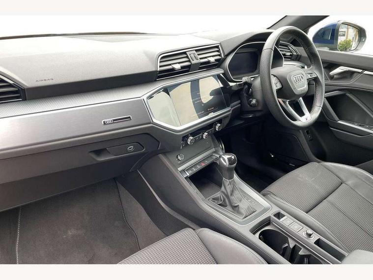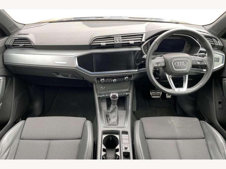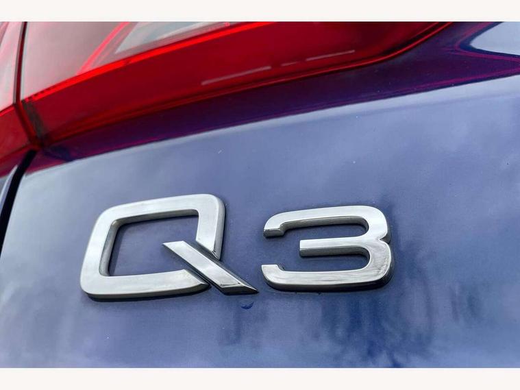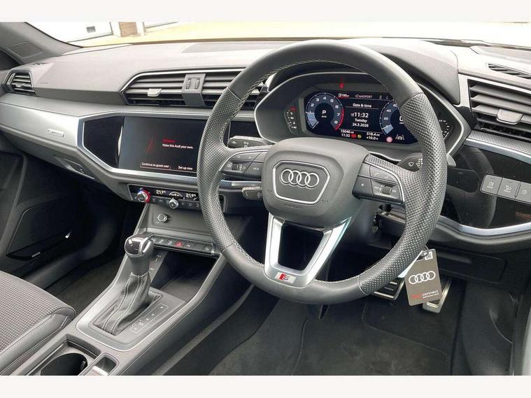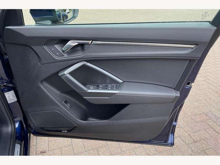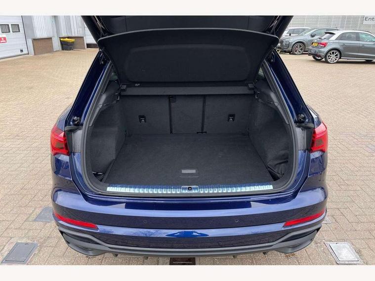 Amazon alexa Integration, Audi drive select, Audi lane departure warning, Audi Virtual Cockpit - 10.25" display, Bluetooth interface, Camera based traffic sign recognition, Legal emergency call, MMI Navigation Plus with high resolution 10.1 inch touchscreen colour display, Power operated tailgate, Progressive steering, Service interval indicator, Smartphone interface includes wireless Apple carplay/Android Auto, Start stop system with recuperation, Voice control system with natural language interaction, Sports suspension, 2 USB-C ports with charge and data functions, 6 passive loudspeakers, DAB digital radio module, Acoustic windscreen, Aluminium roof rails, Aluminium window trim, Auto dimming frameless rear view mirror, Body colour front spoiler blade, Body coloured bumpers, Electrically folding, adjustable and heated door mirrors with integrated LED side indicators and kerb view function for passenger side, Front and rear electric windows, Front fog lights, Front side air inlets in matt platinum grey, Grille vertical bars in aluminium silver/Matt, High gloss black finish B and C pillars, LED Dynamic rear indicators, LED headlights with LED daytime running lights, LED rear lights, LED third brake light, Privacy glass dark tinted rear and rear-side windows (from B-pillar backwards), Rain and light sensors, Rear diffuser grille in grained matt black, Rear diffuser strip in matt titanium black, Rear side wing doors, Rear wiper, S line badges on front wings, S Line front and rear bumpers, Side skirt insert in matt Platinium grey, Titanium black radiator grille, Variable front intermittent wipers, 12V socket in rear centre console, 3 seat bench in 2nd row, 40:20:40 folding with manual adjustment for 60:40 forwards/backwards position and backrest angle, Adjustable rear seat bench/backrest with centre armrest and cupholder, Black cloth headlining, Dual zone electronic climate control, Front and rear black floor mats with contrast stitching in rock grey, Front and rear headrests, Front and rear roof module including reading lights, Front centre armrest, Glove compartment lighting, Height and reach adjustable steering wheel, Illuminated door sill trims with S logo, ISOFIX child seat mounting for front passenger with airbag deactivation and outer rear seat including top tether attachment point for outer rear seats, Luggage compartment light, Manual front seats with height adjustment, Perforated leather gearknob, Single front passenger seat, Stainless steel luggage compartment sill finisher, Stainless steel pedals, Ambient lighting pack - Q3, Non smoking pack - Q3, 3x3 point rear seatbelts, 6 airbags - Driver, front passenger, curtain and side windows, Audi pre-sense front with pedestrain and cyclist recognition, Electrically operated child locks on rear doors, Electromechanical parking brake, Electronic stabilisation control including ABS, ASR and EDL, Front seatbelt reminder, Hill descent control, Hill hold assist, Pre sense basic, Seatbelt monitoring, Tyre pressure warning, Warning triangle and first aid kit, Anti theft alarm, Anti theft wheel bolts, Immobiliser, Remote central locking, Dark matt brushed aluminium inlay, Detail dashboard around MMI touch colour display in glass look, black with surround in aluminium look, Leatherette door armrest,
