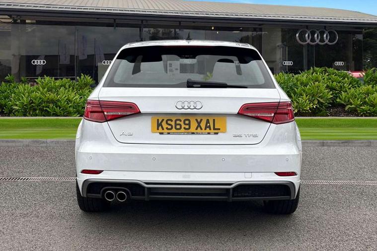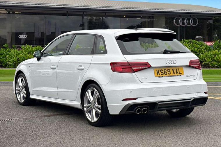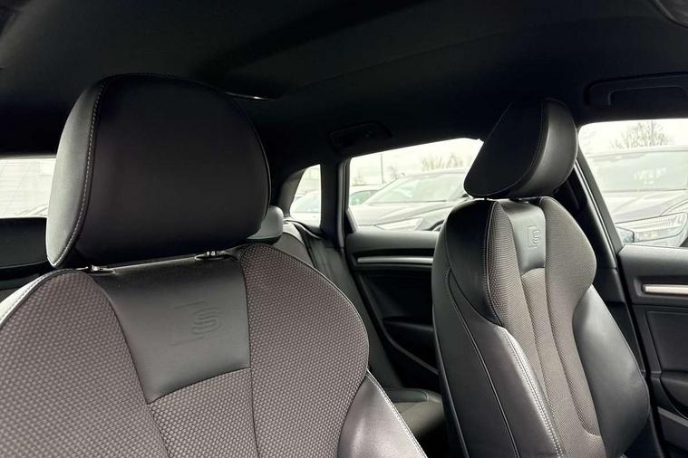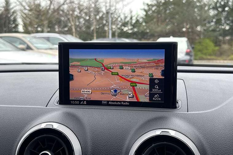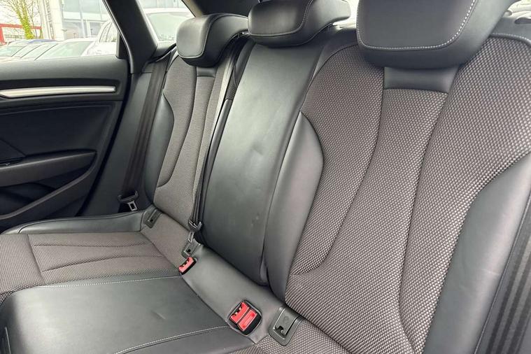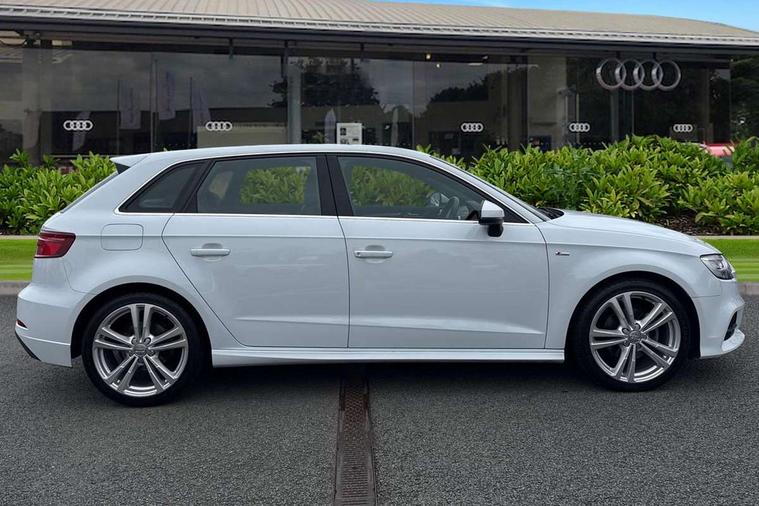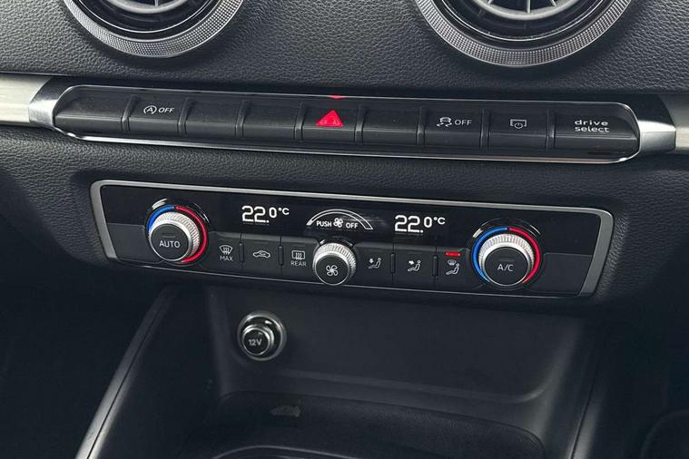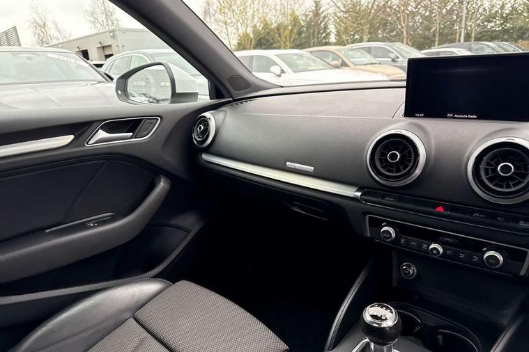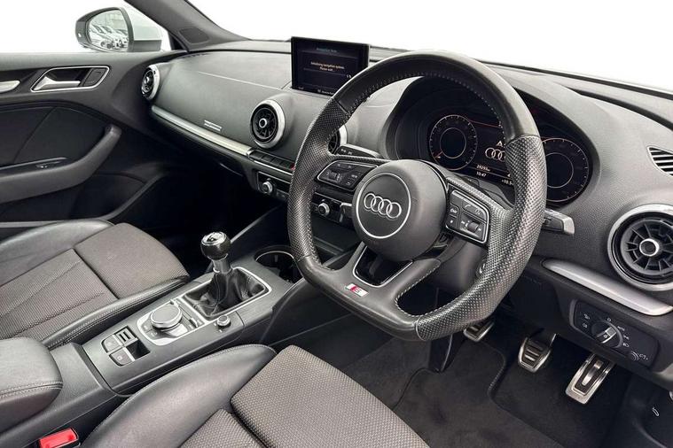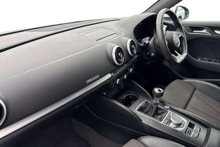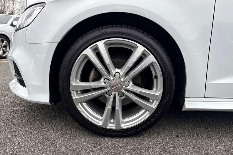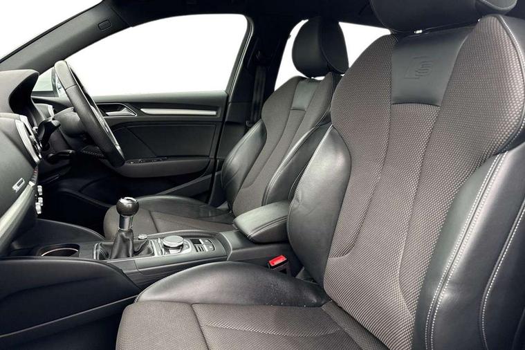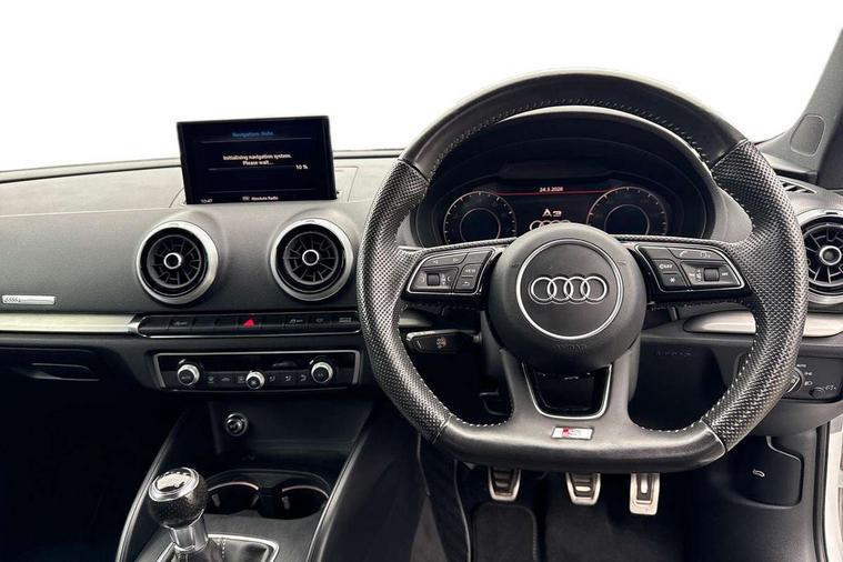 Audi drive select, Audi smartphone interface, Automatic start/stop system, Colour driver's information system display, Electro - mechanical power assisted steering, Mobile telephone preparation - bluetooth interface, SD card based MMI navigation, Service interval indicator, Speed limit display, Voice control system, Voice recognition for navigation system, Sports suspension, 2 USB interfaces and Aux-In jack, Audi music interface, CD player, DAB Digital radio, MMI radio plus with 7" colour MMI screen and MMI controller, Online entertainment, Aluminium window trim, Auto dimming interior rear view mirror, Body colour door mirrors, Chrome exhaust tailpipes, Electric front windows, Electric rear windows, Electrically adjustable and heated door mirrors with integrated LED side indicators, Heated windscreen washer jets, LED daytime running lights, Light and rain sensors, Matt black radiator grille, Rear wiper, S line badges on front wings, S Line body styling with front & rear bumpers and side skirts, radiator grille and rear diffuser insert, roof spoiler, Sport specific side air inlet grille and diffuser insert, 3 adjustable rear headrests, 3 spoke flat bottomed multi-function leather sport steering wheel, 60/40 split folding rear seat, Adjustable front centre armrest, Black cloth headlining, Dual zone electronic climate control, Front and rear interior lights with delay, Front/rear floor mats, Height and reach adjustable steering wheel, Illuminated door sill trims with S logo, Isofix child seat preparation for front passenger/outer rear seats inc passenger airbag deactivation including top tether, Lashing point in luggage compartment, Manual height adjustable front seats, Stainless steel pedals, Storage compartments in doors side trims, centre console and under front drivers seat, LED interior light pack - A3/RS3, Non smoking pack - A3, Storage and luggage pack - A3/RS3, 3 point seatbelts on all seats, ABS/EBD, Active bonnet, Active front headrests, Airbags - front driver/passenger, front & rear side, curtain, drivers knee, ASR, EDL, Electromechanical parking brake, ESC - Electronic Stability Control + traction control, Front passenger airbag deactivation, Hill hold assist, Manual rear child locks, Multi-Collision braking, Seatbelt warning, Tyre pressure warning, Warning triangle and first aid kit, Anti theft alarm, Anti-theft wheel bolts, Remote control central locking, Thatcham category 1 alarm + immobiliser, Aluminium air vent surrounds, Aluminium trim elements, Matt brushed aluminium inlays, Tool kit, Tyre repair kit,