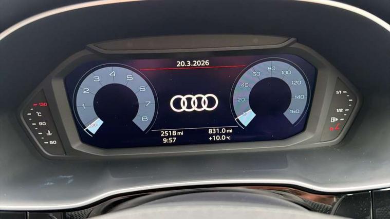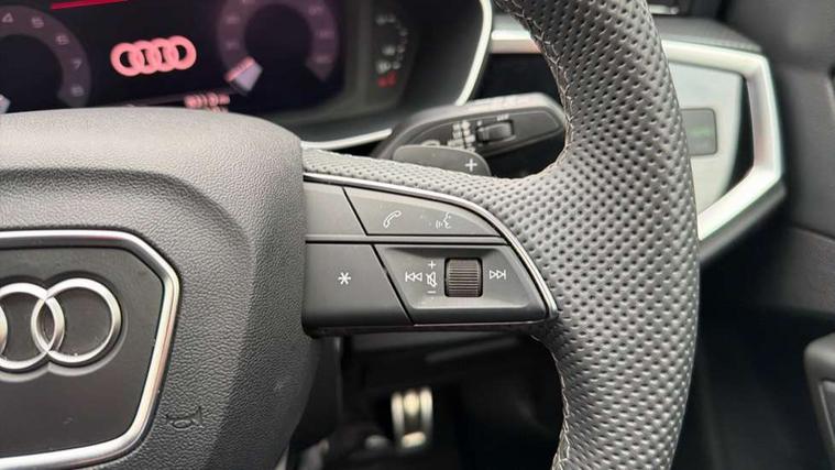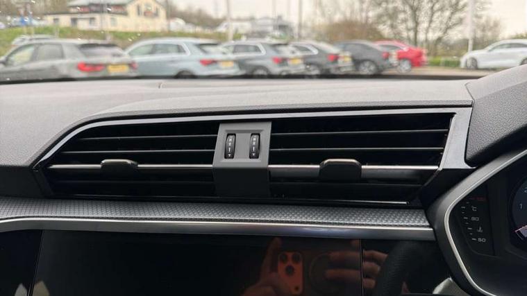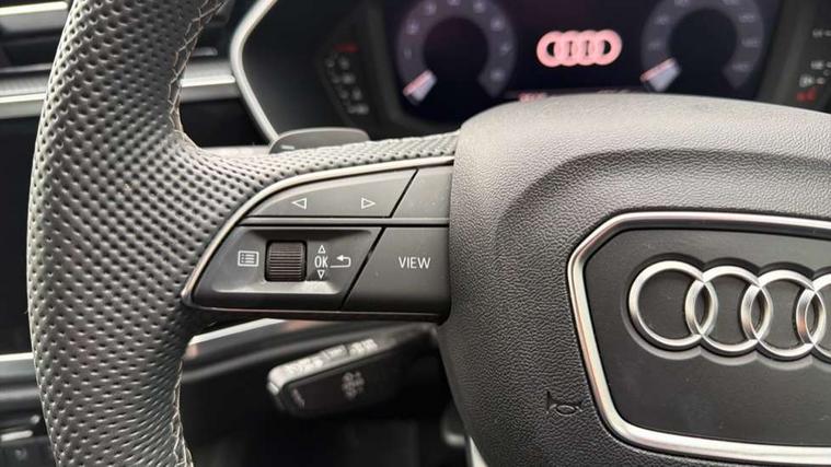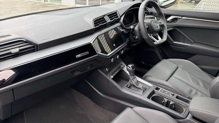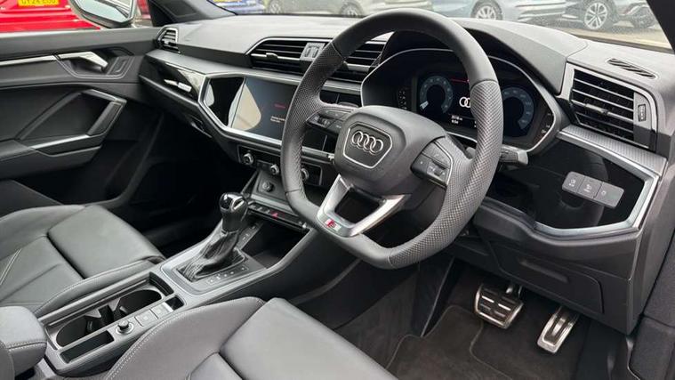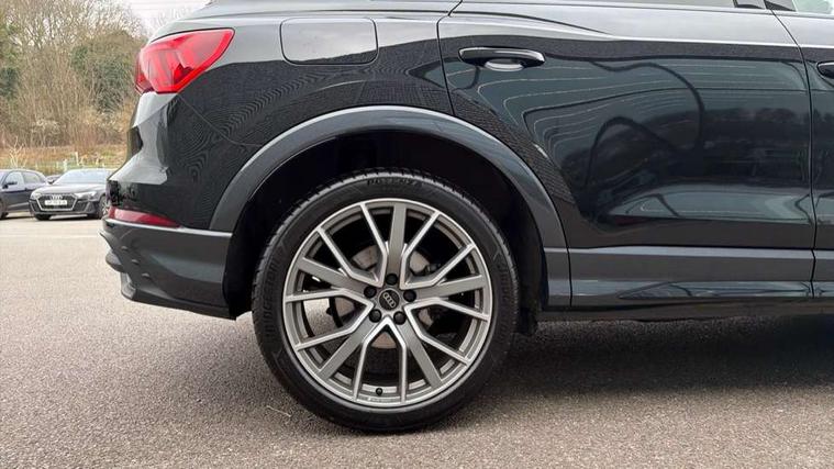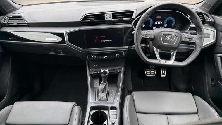 Amazon alexa Integration, Audi connect safety and service, Audi drive select, Audi lane departure warning, Audi Virtual Cockpit - 10.25" display, Bluetooth interface, Camera based traffic sign recognition, Distraction and Fatigue warning, Legal emergency call, MMI Navigation Plus with high resolution 10.1 inch touchscreen colour display, Power operated tailgate, Progressive steering, Service interval indicator, Smartphone interface includes wireless Apple carplay/Android Auto, Start stop system with recuperation, Voice control system with natural language interaction, Sports suspension, 2 USB-C ports with charge and data functions, 6 passive loudspeakers, DAB digital radio module, Acoustic windscreen, Anthracite black radiator grille, Audi Beam uses LEDs to project the Audi logo onto the ground as you exit your Q3, Auto dimming door mirrors, Auto dimming frameless rear view mirror, Black roof rails, Electrically folding, adjustable and heated door mirrors with integrated LED side indicators and kerb view function for passenger side, Front and rear electric windows, Front fog lights, Grille vertical bars in aluminium silver/Matt, High gloss black finish B and C pillars, LED Dynamic rear indicators, LED headlights with LED daytime running lights, LED rear lights, LED third brake light, Privacy glass dark tinted rear and rear-side windows (from B-pillar backwards), Rain and light sensors, Rear diffuser grille in grained matt black, Rear diffuser strip in matt anthracite black, Rear side wing doors, Rear wiper, S line bumpers in contrasting Manhattan grey, Variable front intermittent wipers, 12V socket in rear centre console, 3 seat bench in 2nd row, 40:20:40 folding with manual adjustment for 60:40 forwards/backwards position and backrest angle, Adjustable rear seat bench/backrest with centre armrest and cupholder, Black carpet mats, Black cloth headlining, Dual zone electronic climate control, Electric lumbar support, Front and rear black floor mats with contrast stitching in rock grey, Front and rear headrests, Front centre armrest, Height and reach adjustable steering wheel, Illuminated door sill trims with S logo, ISOFIX child seat mounting for front passenger with airbag deactivation and outer rear seat including top tether attachment point for outer rear seats, Luggage compartment sill protection in stainless steel, Manual front seats with height adjustment, Perforated leather gearknob, Single front passenger seat, Stainless steel pedals, Twin leather upholstery with front sport seats + S embossing, Black styling pack - Q3, Non smoking pack - Q3, 3x3 point rear seatbelts, 6 airbags - Driver, front passenger, curtain and side windows, Audi pre-sense front with pedestrain and cyclist recognition, Electrically operated child locks on rear doors, Electromechanical parking brake, Electronic stabilisation control including ABS, ASR and EDL, Front seatbelt reminder, Hill descent control, Hill hold assist, Pre sense basic, Seatbelt monitoring, Tyre pressure warning, Warning triangle and first aid kit, Anti theft wheel bolts, Immobiliser, Remote central locking, Thatcham approved category 1 anti theft alarm, Aluminium look interior elements, Detail dashboard around MMI touch colour display in glass look, black with surround in aluminium look, Leatherette door armrest, Piano black inlay,