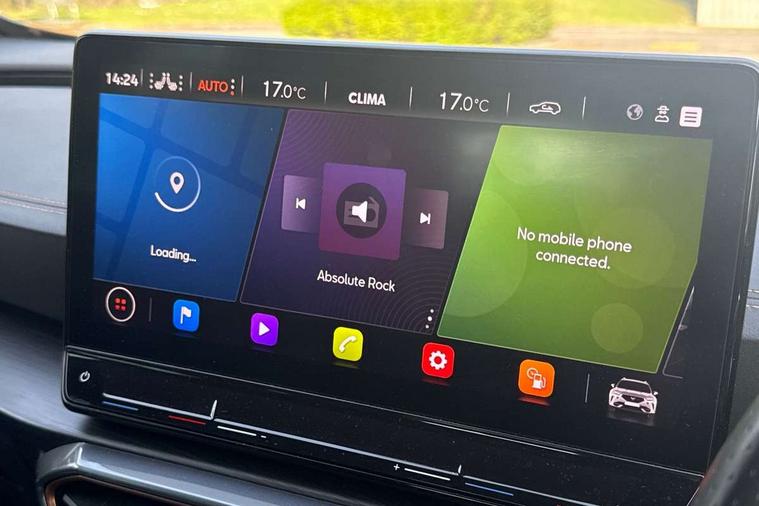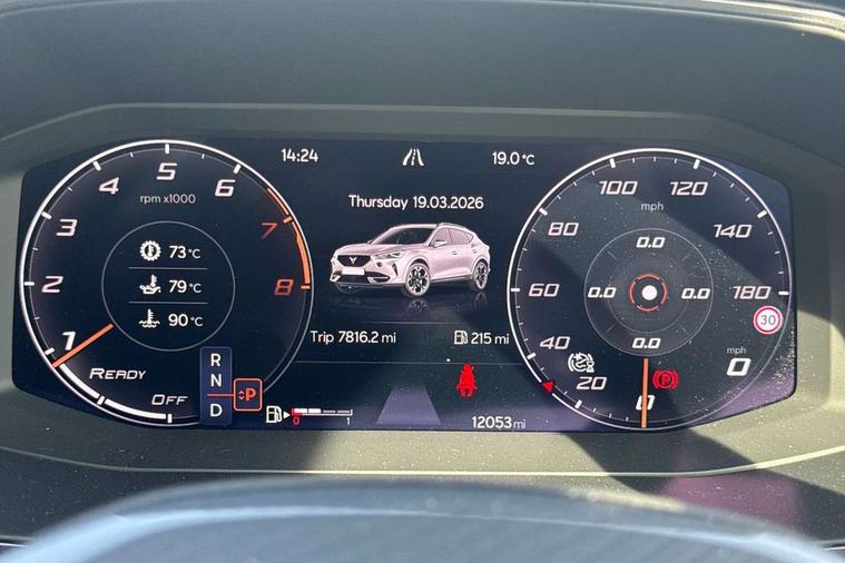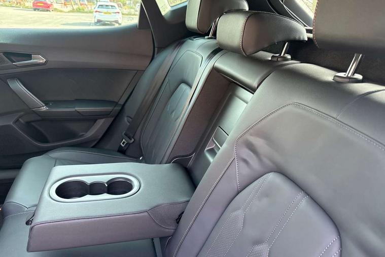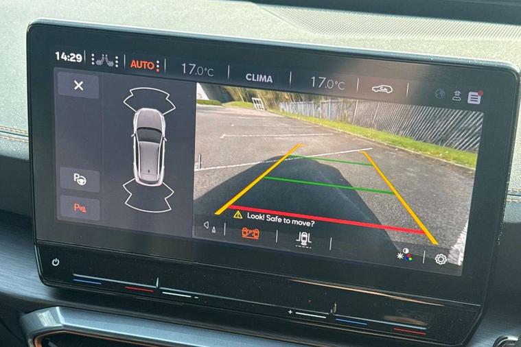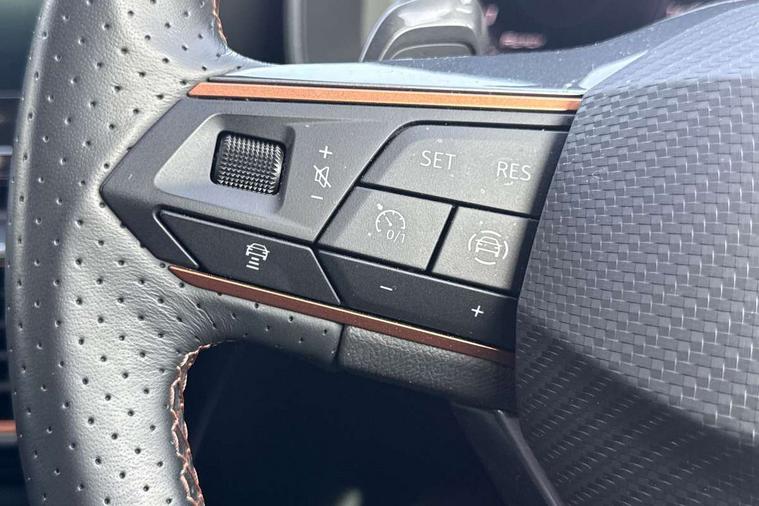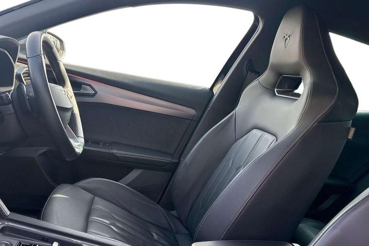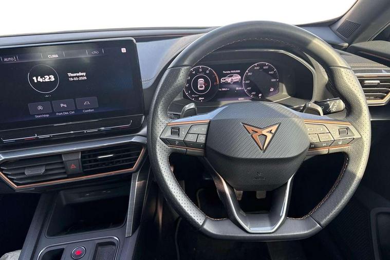 Digital cockpit and configurable dashboard, Driver alert system, Driving profile selection, Forward collision warning with automatic braking, Lane assist, Navigation system with 12'' Touchscreen Display, Park assist (inc front/rear parking sensors), PAS, Predictive adaptive cruise control with speed limiter, Rear view camera, RPM, trip computer, outside temp gauge, instrument light brightness, low fuel warning light, lights on reminder, gearshift indicator, Service interval indicator, Start/stop system with regenerative braking, Voice control system, Wired Android Auto, Wireless apple carplay, Wireless phone charger, Electronic locking differential and dynamic traction support, Standard suspension, 2 front and 2 rear USB type C sockets, Auxiliary input socket, DAB radio, Auto dimming rear view mirror, Body colour door handles, Body coloured bumpers, Dark grey wing mirror, Daytime running light with automatic headlight control and coming home feature, Dynamic headlight range control, Electric front/rear windows, Electrically adjustable heated and folding door mirrors with memory function, Front fog lamps with cornering function, Gloss black roof rails and window surrounds, LED Headlights, LED Taillights with dynamic indicator, Rain sensing wipers, Rear diffuser with black simulated exhaust pipes, Rear side wing doors, Rear wash/wipe, Third brake light, Tinted rear windows, Welcome lights, 12v power supply in centre console, 12V socket, 12v socket in loadspace, 2 front and 2 rear reading lights, 230V socket, 3 seat bench in 2nd row, 60/40 split rear bench seat with armrest and mechanical seat release, Black headlining, Dust/pollen filter, Front and rear head restraints, Front centre armrest, Height/reach adjust steering wheel, Illuminated interior front door sills, Illuminated sunvisor with mirror, Isofix, Leather multi function heated steering wheel with gear shift paddles, Luggage tie-down hooks, Single front passenger seat, Three zone climate control with control panel in rear, Variable luggage/load compartment floor, Wraparound lighting, Genuine Nappa leather Pack - Cupra, 3 point seatbelts on all rear seats, ABS, Brake control system - ESC and brake booster, Child proof door locks, Driver and front passenger airbags with front passenger airbag de-activation, Electronic parking brake, Front and rear disc brakes, Front side curtain airbags, Hill hold control, Public e-call, Seat belt reminder for front and rear seats, Tyre pressure monitoring system, Anti theft alarm system, Keyless entry and start system (KESSY), Locking wheel bolts, Copper and aluminium interior detailing, 19" 'Exclusive' machined sport matte black and silver alloy wheels,