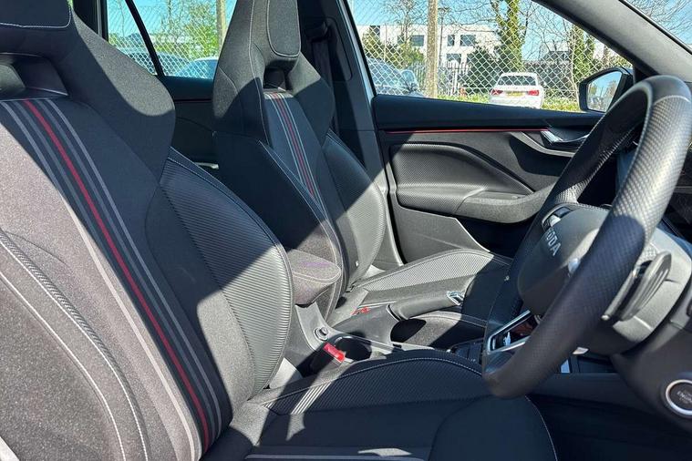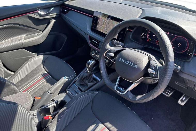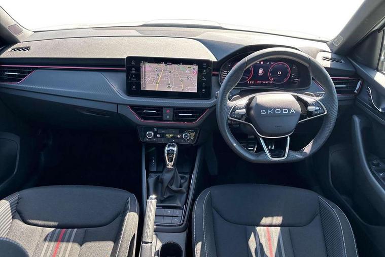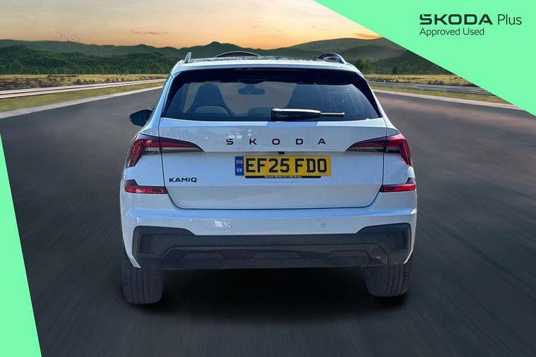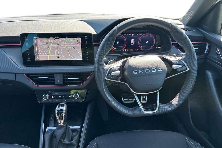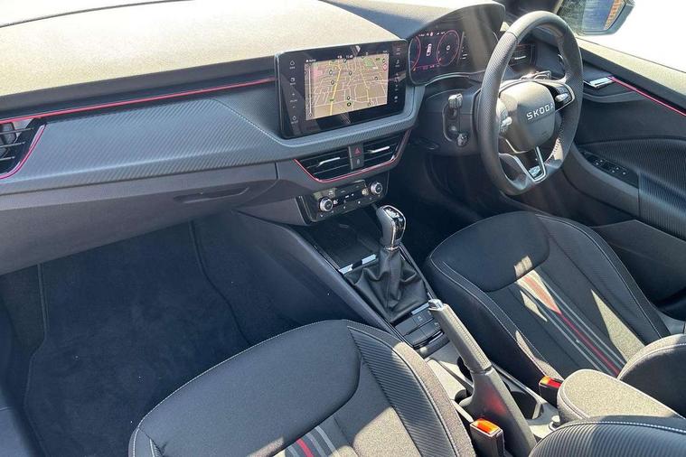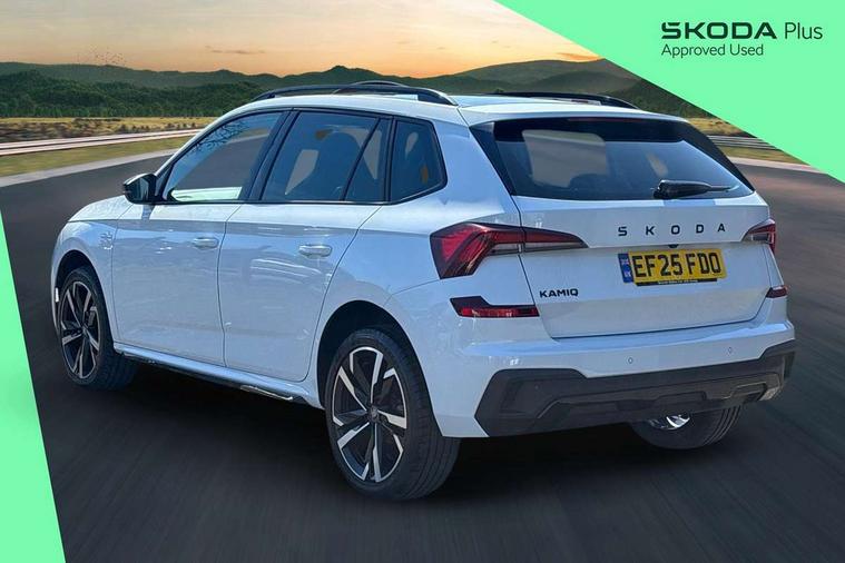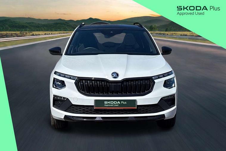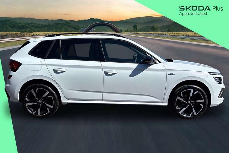 Advanced driver attention and drowsiness monitor, Bluetooth system, E-call, Front assist system, PAS, Rear parking sensors, Rear view camera, Service indicator, Speed limiter, Traffic sign recognition, Virtual cockpit with 10.25" display, Voice control system, Wireless smartlink, 4 USB C ports, 8 Speakers, 9.2" Skoda navigation display, DAB Digital radio, Auto dimming rear view mirror, Automatic headlight control with coming home and leaving home feature, Black door mirrors, Black radiator grille, Black rear diffuser, Black roof spoiler, Body colour bumpers, Body colour door handles, Boot lettering in black, Extended tailgate glass, Fixed panoramic sunroof with black roof rails, Front and rear electric windows, Heated rear window, LED daytime running lights, LED high beam, LED low beam, LED third brake light, Light sensors, Monte carlo plaque, Privacy glass, Rear side wing doors, Rear wiper, Ticket holder inside windscreen, 12V socket in luggage compartment, 3 seat bench in 2nd row, Aluminium pedals, Ambient lighting in white/red, Art leather carbon decor inserts, Art leather carbon door inserts, Black roof lining, Cargo elements, Chrome inner door handles, Driver and passenger sun visors with vanity mirror, Dual zone climate control, Front and rear roof lights, Front centre armrest, Front head restraints, Glove compartment with illumination, Height adjustable driver seat, Height adjustable front passenger seat, Ice scraper, Inner circulation control with pollen filter, ISOFIX on front passenger seat, Isofix preparation for back seats, Leather gearknob and handbrake lever, Manual lumbar support for front seats, Monte Carlo cloth upholstery, Net package and top tether hooks in boot space, Net under rear shelf, Pocket on the back of both front seats include mobile phone pockets, Rake/reach adjustable steering wheel, Reading lights, Rear centre armrests, Red hotstamping, Single front passenger seat, Sports seats, Textile floor mats, Third rear headrest, Top tether for front passenger seat, Umbrella in driver's door, Light and view plus package - Kamiq, 3x3 point rear seatbelts, Airbags - driver and front passenger, Disc brakes, ESP, Extended and predictive pedestrian/cyclist protection, Front passenger airbag deactivation switch, Front side airbags with curtain airbags, Hill hold control, Manual leather parking brake, Manual rear child locks, One tone horn, Seatbelt reminder for driver an co-driver, Traction control, Tyre pressure monitor, Anti-theft alarm system with interior monitoring, backup horn, towing protection and remote central locking with SAFE system, Anti-theft wheel bolts, Electronic engine immobilizer, 18" Ursa black diamond cut alloy wheels,