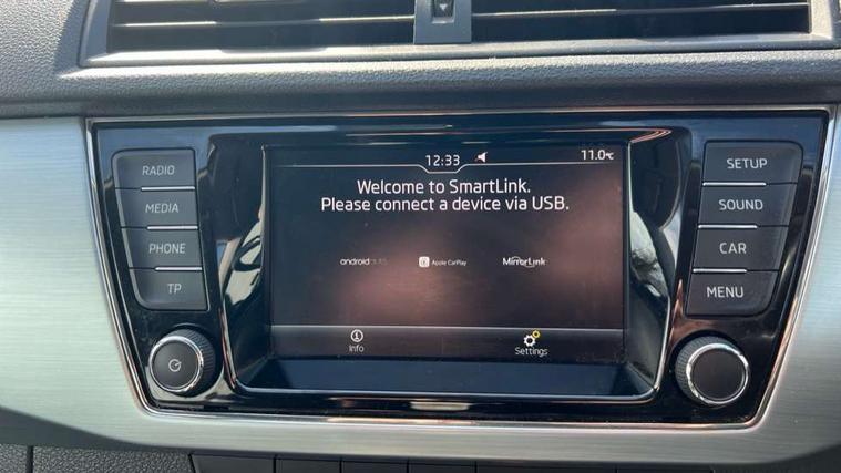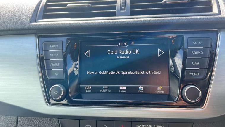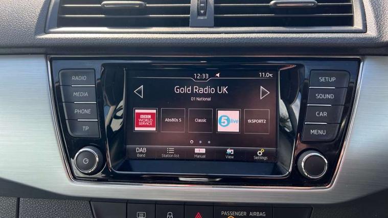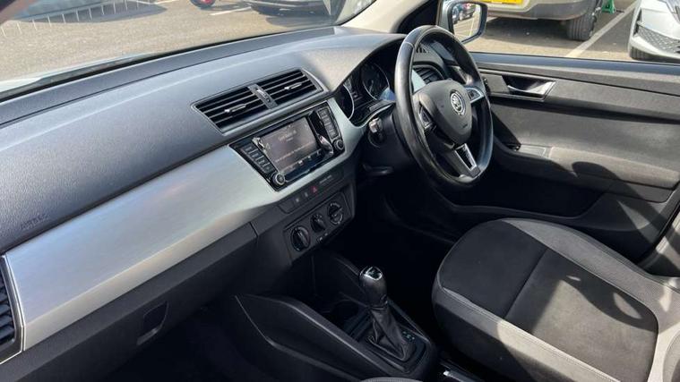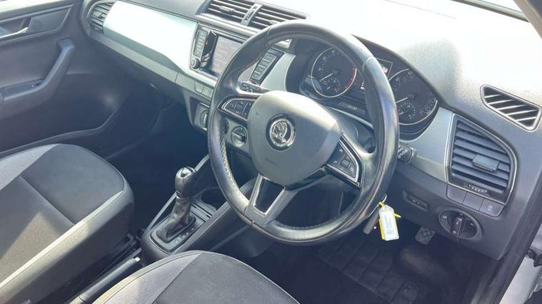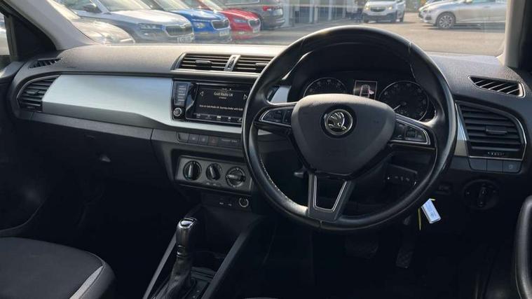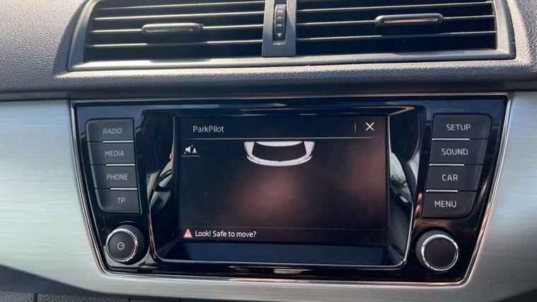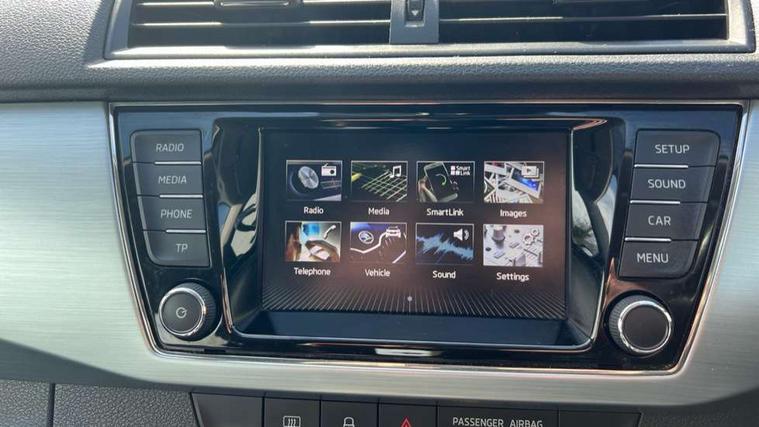 Bluetooth system, Exterior temperature gauge, Front assistant collision mitigation, Multi function trip computer, PAS, Service interval indicator, SmartLink, 6.5" touchscreen, Auxiliary socket for external MP3 player, Bolero Radio, DAB Digital radio, SD card slot, USB interface, Body colour bumpers, Body colour door handles, Chrome grille surround, Electric front windows, Electrically adjustable and heated door mirrors, Heated rear window, Height adjustable headlamps, Intermittent rear wash/wipe, Tinted rear windows, Tinted windscreen, 1.5L bottle holder in front door panels, 2 height adjustable rear headrests, 60/40 split folding rear seat, Boot stowage box, Cargo area storage tray, Driver + passenger vanity mirrors, Folding grab handles, Front reading lights, Height adjustable driver's seat, Height adjustable front headrests, Height adjustable passenger seat, Height/reach adjust steering wheel, Interior light with delay, Leather gearshift, Leather handbrake, Lower glovebox cover, Luggage load hooks, Parcel shelf, Pollen filter, Rear courtesy light, Rear storage trays, Ticket holder, Two rear outer seat isofix location points, Umbrella under front passenger seat, Arkamys surround sound pack - Fabia, Chrome Pack - Fabia, 3x3 point rear seatbelts, ABS, Curtain airbags, Driver and passenger airbags, Driver and passenger side airbags, EDS, ESC with ASR, Front seatbelt pretensioners, Hill hold control, Hydraulic Brake Assist (HBA), Motor Slip Regulation (MSR) - Engine Drag Torque Control, Passenger airbag deactivate switch, Seatbelt warning, Tyre pressure monitor, Alarm with interior monitoring, Immobiliser, Locking wheel bolts, Remote central locking,