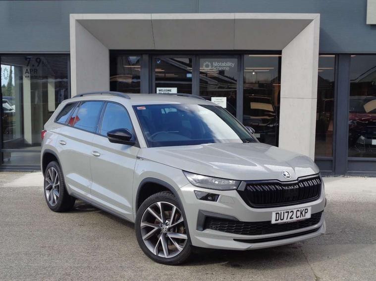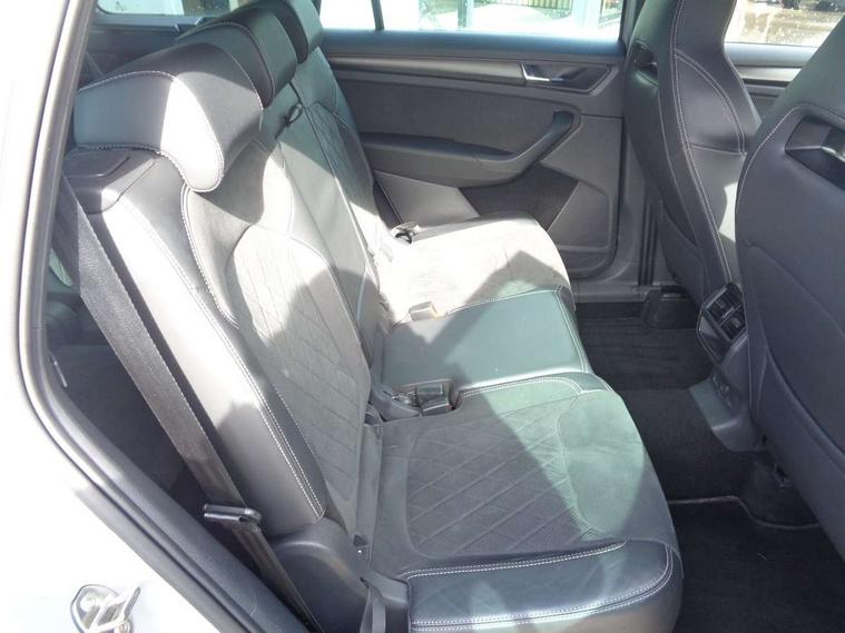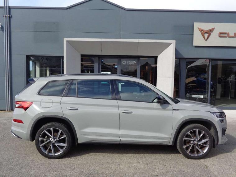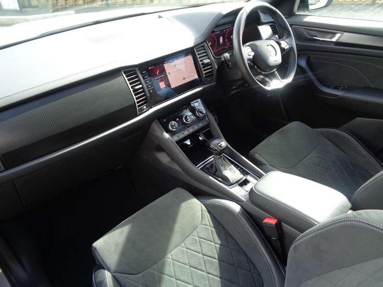 Bluetooth system, Columbus satellite navigation with 9.2" touchscreen, integrated Wi-Fi, web radio, Digital voice enhancement, E-call, ECO Stop/start function, Exterior temperature indicator, Progressive steering, Rear view camera, Smartlink wireless for apple carplay and wired for android auto, Speed limiter, Tailgate unlocking from outside, USB C Port x 2 in front centre console, Wireless charging, 8 Speakers, DAB Digital radio, Aero front windscreen wipers with intermittent function, Aero rear window wiper, Auto dimming rear view mirror, Black roof rails, Black sports styling including front grille and window surrounds, Black wheel arch surrounds, Body colour bumpers, Body colour door handles, Electric adjustable/heated/folding door mirrors, driver side auto dimming with boarding sports and memory function, Electric front and rear windows, Extended rear spoiler with finlets in gloss black, Front fog lights, Full LED matrix headlights with AFS (adaptive front light system), cornering function and AWL (all weather lighting system), Gloss black door mirrors, Headlight washers, Heated rear window, Invisible tailpipe, LED daytime running lights, LED rear fog light, LED third brake light in rear spoiler, Light assistant (coming/leaving home/tunnel light), Off-road style lower front bumper element, Privacy glass, Rain and light sensors, Rear diffuser, Rear LED lights (high functionality) with welcome effect and dynamic indicators, Rear side wing doors, Safety reflectors on front and rear doors, Sportline badge on front fender, Sports front and rear bumpers including lower rear chrome strip, Tailgate lettering in Black, Window control switches with black trim, Without engine designation, 12V socket in boot, 2 rails with 2 hooks, 2 seat bench in 3rd row, 3 seat bench in 2nd row, 4 foldable roof handles with rear coat hooks, 60:40 foldable rear seat with sliding adjustment and backrest angle adjustment, Aluminium pedals, Black roof headlining, Bottle holders in door panel in the 1.5 litre front and 1 litre rear, Cargo storage compartments, Chrome headlight control button, Chrome interior door handles, Coat hooks on B pillar, Covered storage compartment on driver side, Front centre armrest with storage compartment, cup holder and 12V socket, Front courtesy lights, Gear shift lever with chrome frame and black gloss insert, Grey stitching in front and rear armrests and door armrests + door inserts, Height adjustable front headrests, Illuminated and cooled glovebox, Illuminated luggage compartment, Isofix child seat fittings in outer rear seats with top tether, Manually adjustable steering column, Microsuede door panels, Net programme in boot (1x horizontal Net, 2x vertical Nets), Overhead glasses storage compartment, Pollen filter, Rear centre armrest with cupholders, Single front passenger seat, Sliding trunk cover, Small Bags on the inner sides of the front backrests, Sports seats, Sunvisors with illuminated vanity mirrors, Three rear height adjustable headrests, Ticket holder on A Pillar, Umbrella in door panel, Variable boot floor, LED Interior light pack - Kodiaq, Auto door release and activation of warning lights in the event of an accident, Child locks on rear doors, Driver and front passenger airbag with knee airbag and front passenger airbag deactivation, Electronic parking brake with hill start assist, Emergency rear braking signal, ESC (incl. ABS+MSR+ASR+EDS+HBA+DSR+RBS+MKB), Front assist with autonomous emergency braking, Front side airbags with curtain airbags, Fuel cut off safety device, Height adjustable front 3 point seatbelts + pretensioners, Hill hold control, Rear disc brakes, Safety vest holder in door, Seat belt reminder for all seats, Three point rear seat belts, Two tone horn, Tyre pressure monitor, Alarm with interior monitoring and tilt sensor with safe function, Anti-theft wheel bolts, Immobiliser, Keyless entry and start system (KESSY), Remote central locking with 2 keys, Black air vent surround, Carbon finish dashboard and door inserts, Grey stitching in dashboard, 20" Vega Anthracite alloy wheels, Temporary spare wheel (space saver),