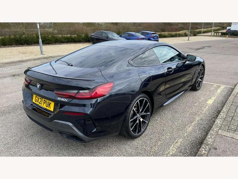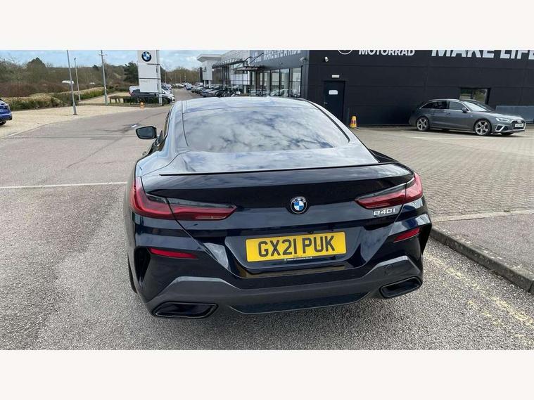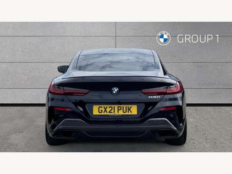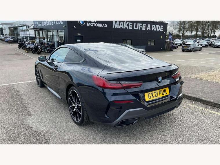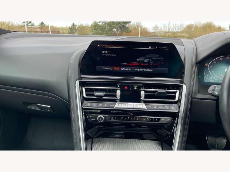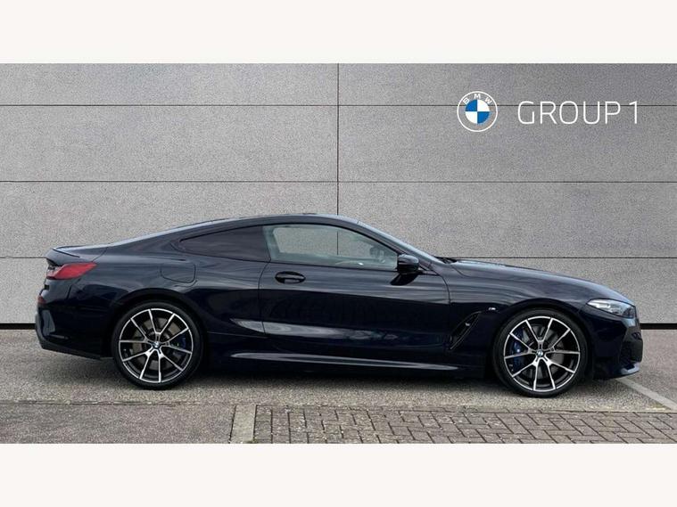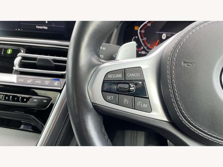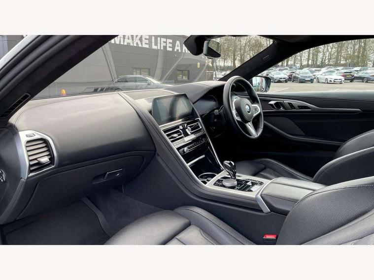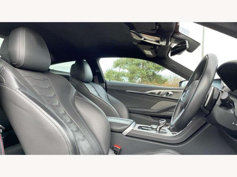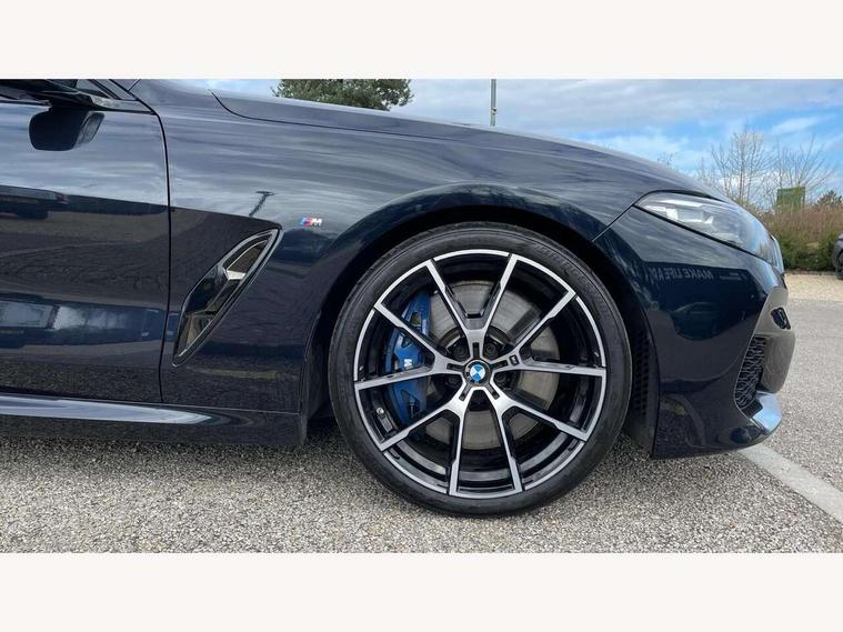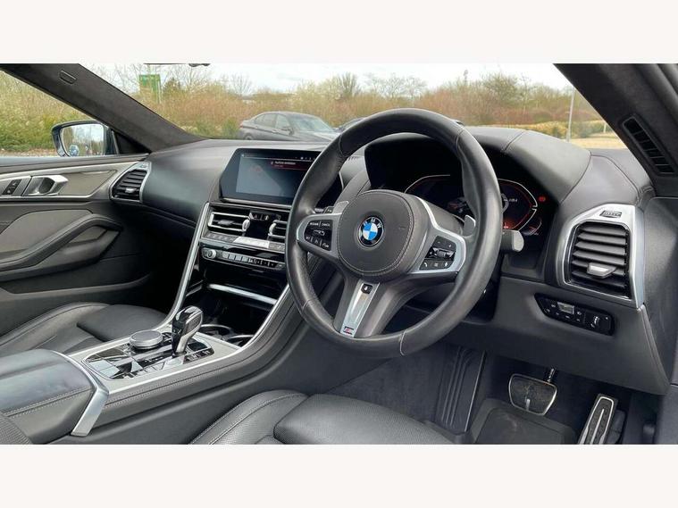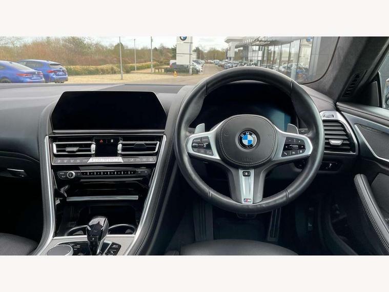 BMW legal emergency call, BMW Teleservices, Brake pad wear indicator, Check control system, Condition based service, Drive experience control with Sport, Comfort, Eco Pro and Adaptive modes, Enhanced bluetooth with wireless charging, Head up Display, iDrive touch controller with shortcut buttons, Instrument and upper door panel in walknappa leather, Integrated owners handbook, Oil sensor for level and grade, On board computer, Outside temperature display, Powered tailgate operation, Run flat indicator, Service interval indicator, Wifi hotspot preparation, Adaptive M suspension, Double wishbone front axle, Dynamic Damper Control, Eight speed sport automatic transmission with gearshift paddle switches, M Sport differential, Petrol Particulate Filter, DAB Digital radio, Favourite buttons, USB/audio interface, Bright chrome kidney grille, Carbon core, Chrome M designation on front side panel, left and right, Climate comfort windscreen, Dynamic brake lights, Electrically adjustable, heated, folding exterior mirrors, Follow me home headlight function, Frameless interior mirror, Front and rear bumper system with replaceable deformation elements, Front electric windows, Heated windscreen washer jets, High beam assistant, Illuminated door handles, LED rear lights, Model logo on right tailgate, Rain sensor with automatic headlight activation, Satinised aluminium kidney struts, Thermally insulated windscreen, Third LED technology brake light in rear window, Welcome lights in interior and door handle area, 2 cup holders in front, 2 rear head restraints, 2 X front 12v power sockets, 50/50 split folding rear seat, Automatic air conditioning with 2-zone control, Dynamic ambient interior lighting, Electric front seat adjustment with driver memory, Front entry lights doors, Front reading lights, Front seat heating, Front sun visors with ticket holder and illuminated mirror, Illuminated M door sill finishers, Lockable glove compartment with light, M Pedals, M sport leather steering wheel including multifunction controls, Microfilter and active carbon filter, Steering column with adjustable height and length and activation via control on the steering column, Velour floormats, BMW Live cockpit professional pack - 8 Series, Connected professional pack - 8 Series, M sport exterior styling aerodynamics pack - 8 Series, ABS/EBD, Active front seat headrests, Active protection, Airbags - Driver and front passenger airbag with seat occupancy detection, knee, side and front passenger seat airbag deactivation, Child seat ISOFIX attachment rear outer seats, Cornering brake control (CBC), Crash sensor activating central locking release, hazard warning lights, fuel cut off, interior lighting, safety battery terminal clamp and airbags, DSC - Dynamic Stability Control, Dynamic brake control, Dynamic Traction Control - DTC, Electromechanical parking brake with automatic drive away release and auto hold function, Front and rear brake discs with interior ventilation, Front and rear head airbags, Front three point with pyrotechnical belt latch tensioner seat belts, belt force limiter and belt stopper, Hill start assist, Rear three point with pyrotechnical belt latch tensioner seat belts and belt force limiter, Side impact protection, Two tone horn, Tyre pressure monitoring system (TPMS), Warning triangle and first aid kit, Alarm system (Thatcham 1) with electronic engine immobiliser, Centre lock switch, Closing system with central locking, Comfort access system, Keyless engine start, Locking wheel bolts, Vehicle key with exclusive M designation,