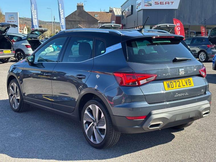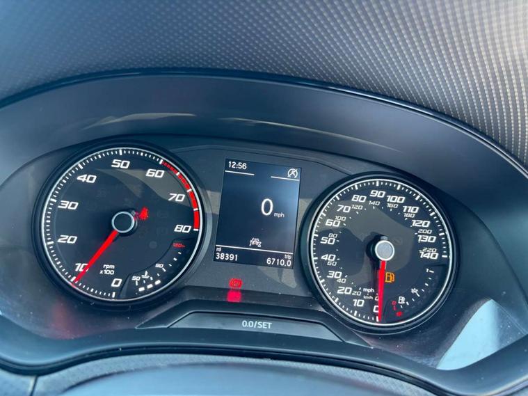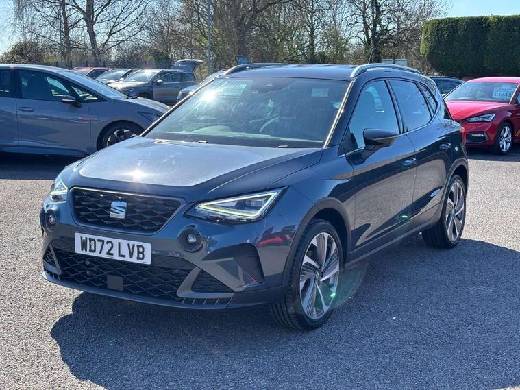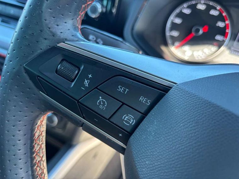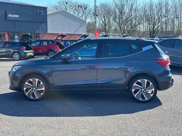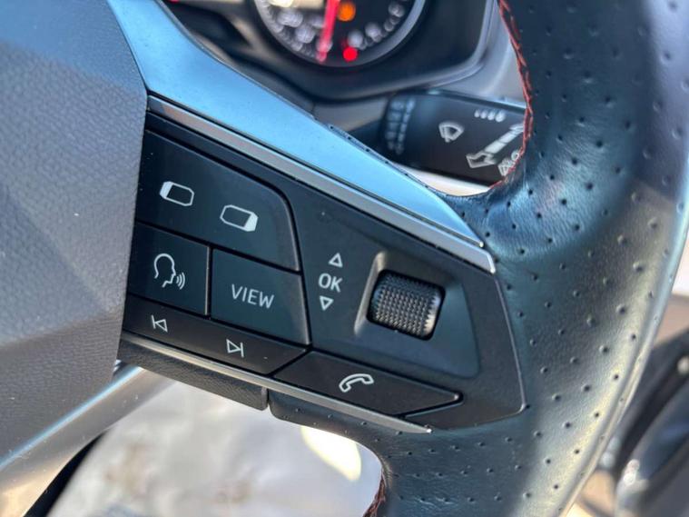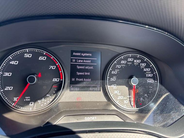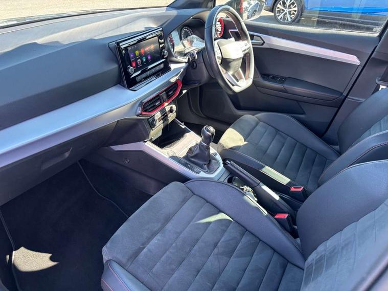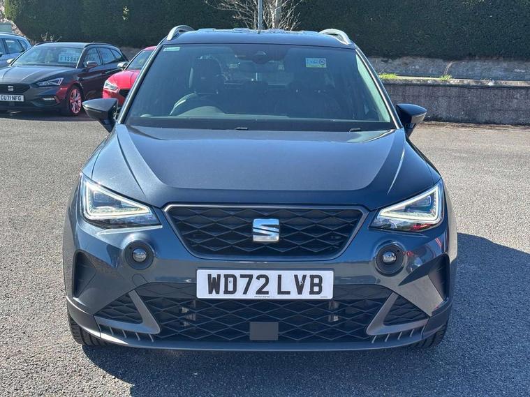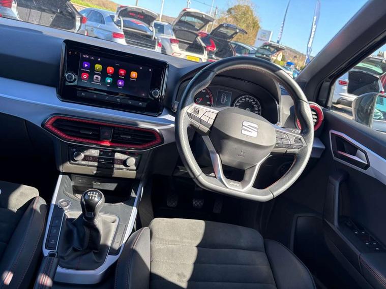 'Lights On' Reminder warning buzzer, Analogue cockpit with physical dials, Digital clock, E-call, Electric speed sensitive power steering, Full Link Smartphone Integration with Mirror Link, Apple Car Play, Google Android Auto with USB Type C cable for Apple and Android compatibility, Lane keeping system, Low fuel warning light, Outside temperature display, Rear parking sensor, RPM counter, Seat connect with safety, service and remote, SEAT Drive profile - Four different models normal-sport-eco-individual, steering response, throttle response, Trip computer, Wireless phone charger, Bluetooth interface for hands free and audio streaming, DAB digital radio and AM/FM radio, Media system with 8.25" colour touchscreen with USB port (type c), Steering wheel mounted audio controls, Anti theft roof antenna, Automatic activation of hazard warning lights, Body coloured bumpers, Body coloured door handle inserts, Chrome roof rails and window surrounds, Dark tinted rear windows, Dimming rear view mirror, Electric front/rear windows, Electrically adjustable and heated door mirrors, Front fog lights with cornering function and rear fog light, FULL LED automatic headlights with dynamic headlight range control, coming and leaving home, LED daytime running lights, LED rear tail lights and licence plate lights, Protective side mouldings, Rear side wing doors, Rear spoiler, Rear window wash/wipe, Roof colour door mirrors, Third brake light, Twin exhaust pipe styling hidden exhaust pipe, Visible VIN plate, Windshield wiper with intermittent control and potentiometer, 2 cupholders, 3 seat bench in 2nd row, 60/40 split folding rear seat, Aircare filter, Black interior roof, Double boot floor, Driver sunvisor with covered mirror + card holder, Dual zone climate control, Front comfort seats, Front courtesy light with 2x front and 2x rear reading lights, Gear shift indicator, Height adjustable front seats, Height/reach adjustable steering column, Illuminated boot, Instrument lighting with brightness control, Interior ambient lighting, Interior light in footwell, central console and door panel, ISOFIX points in outer rear seats with top tether anchorage points, Microsuede cloth upholstery, Passenger sunvisor with vanity mirror, Perforated flat bottomed leather steering wheel/gear knob/handbrake with red stitching and FR logo, Single front passenger seat, Two front and three rear height adjustable headrests, Interior chrome pack - Arona, 3 point seatbelts on all rear seats, ABS, Active front headrests, Child locks on rear doors, Driver and front passenger airbags with front passenger airbag de activation, front side and curtain airbags, Electronic stability control, Emergency Brake Assist (EBA) and front assist, Front and rear seatbelt reminder, Hill hold control, Multi-Collision braking, Tiredness recognition system, Traction control, Tyre pressure monitoring system, Alarm with back-up horn, Electronic engine immobiliser, KESSY Keyless entry and go, Locking wheel bolts, Remote central locking + deadlocks, Tow away protection, Titan black dashboard,