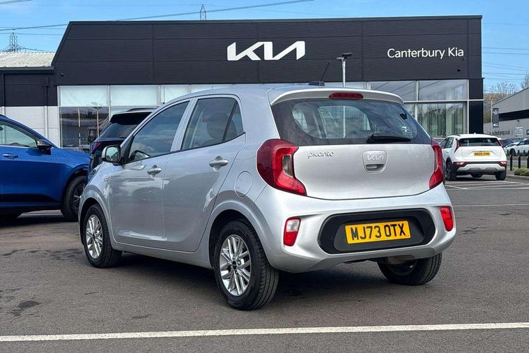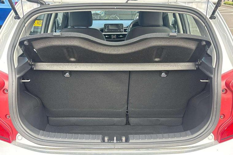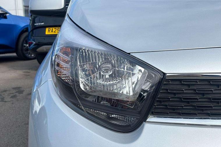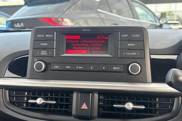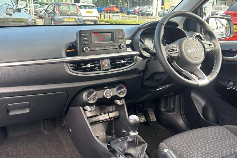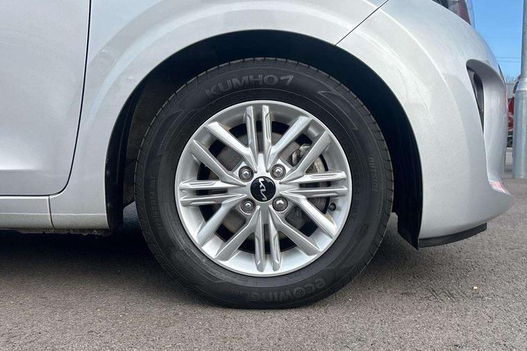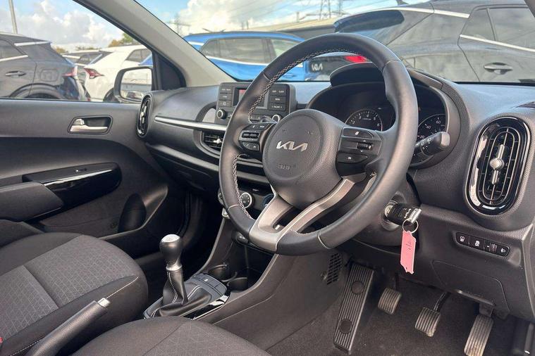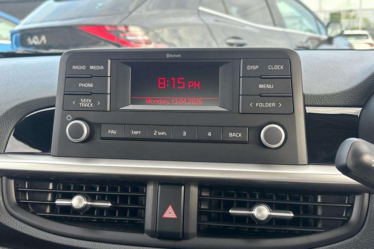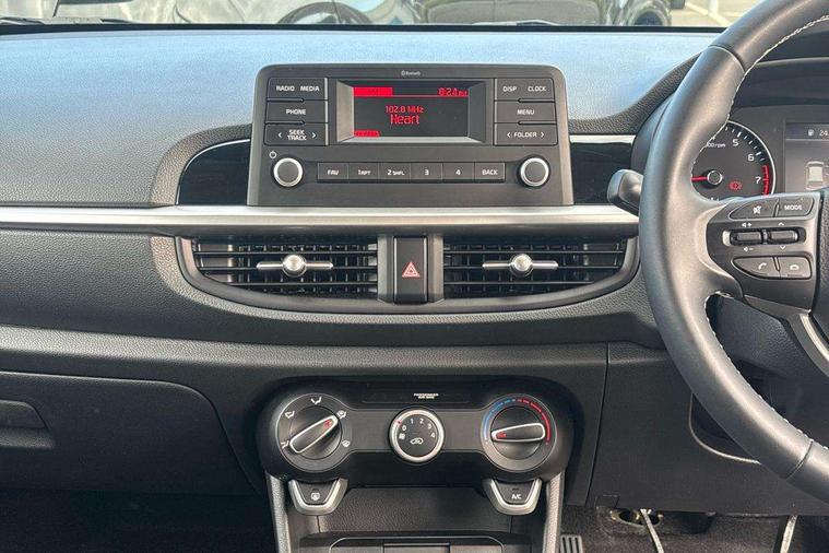 3.8" monochrome audio display with RDS and DAB, 4.2" supervision monochrome cluster display, Emergency call service, Emergency stop signalling system, External temperature gauge, Forward Collision-Avoidance Assist (FCA) - City, Motor driven power steering, Tachometer, Tailgate, Trip computer, 4 speaker audio system, Bluetooth with music streaming, Steering wheel mounted controls, USB ports for connection of a media device, Automatic headlight control system, Black radiator grille with chrome surround, Body colour bumpers, Body colour mirrors and door handles, Day/night rear view mirror, Daytime running lights, Electric adjustable heated door mirrors, Front and rear electric windows with drivers's auto up/down function, Headlamp levelling, Heated rear window, High mount brake light, MFR - Multi Focus Reflector halogen headlights with black bezel, Rain sensor, Rear fog lights, Rear side wing doors, Rear wash/wipe, Speed variable front wipers, Tinted glass, Visible VIN plate, Welcome and follow-me home light functionality, 1 x rear coat hook, 12V power point front, 2 seat bench in 2nd row, 3 x passenger assist grips, 60/40 split/folding 2nd row of seats, All round height adjustable headrests, Cupholders in centre console, Driver and front passenger sunvisor with vanity mirror, Driver seat height adjust, Front cabin lights, Glovebox, High gloss lower centre fascia trim, door armrest and air vents, ISOFIX Child seat top tethers and anchor fixings, Leather trimmed steering wheel and gearshift, Luggage area light, Luggage area parcel shelf, Manual air conditioning, Passenger front seatback pockets, Premium cloth upholstery, Silver paint finished interior door handles, Single front passenger seat, Slide/reclining front seats, Tilt adjustable steering wheel, Advanced Driver Assistance Pack - Picanto, 2 x 3-point rear seatbelts, ABS/EBD, Automatic unlocking of doors in case of impact, ESC + BAS + VSM + HAC, Front passenger airbag cut-off switch, Front seatbelt height adjusters, Front seatbelt pretensioners, Hill hold control, Hill start assist control (HAC), Knee airbags, Rear child proof door locks, Seatbelt warning, Side impact protection, Torque vectoring brake based and straight line stability (SLS), Traction control, Twin curtain airbags, Twin front airbags, Twin front side airbags, Tyre pressure monitoring system, Anti theft alarm, Engine immobiliser, Folding key, Locking wheel nuts, Remote central door locking, 14" alloy wheels, Tyre mobility kit,