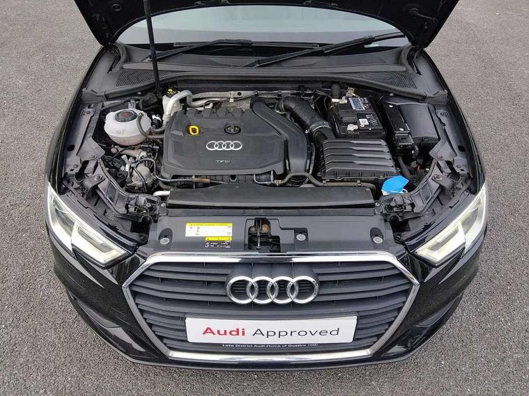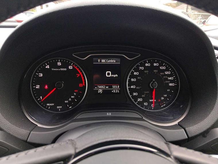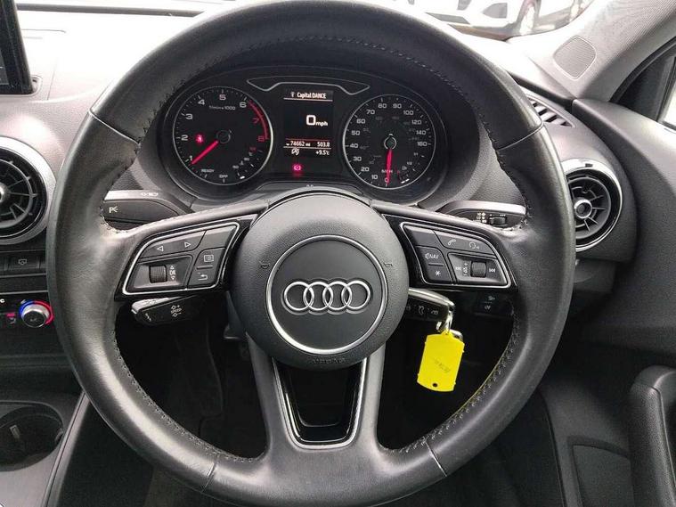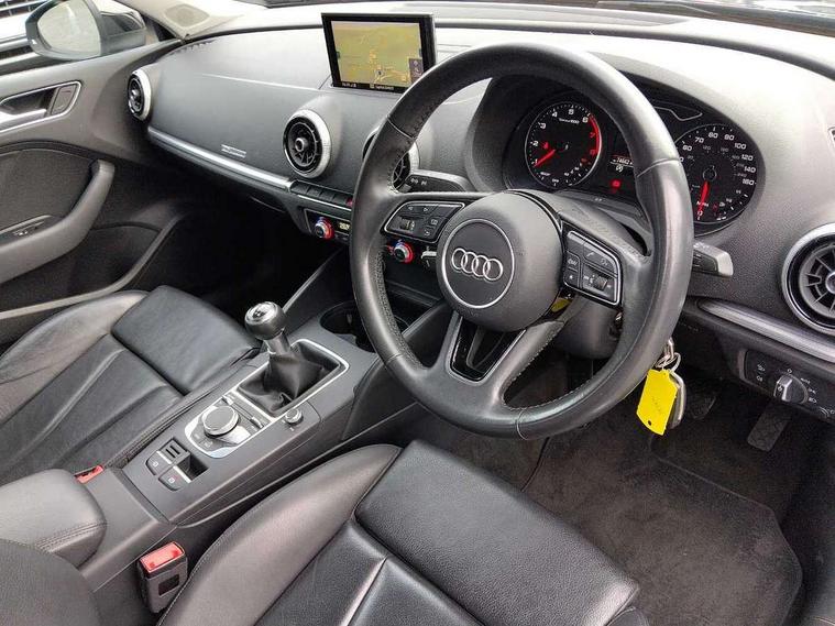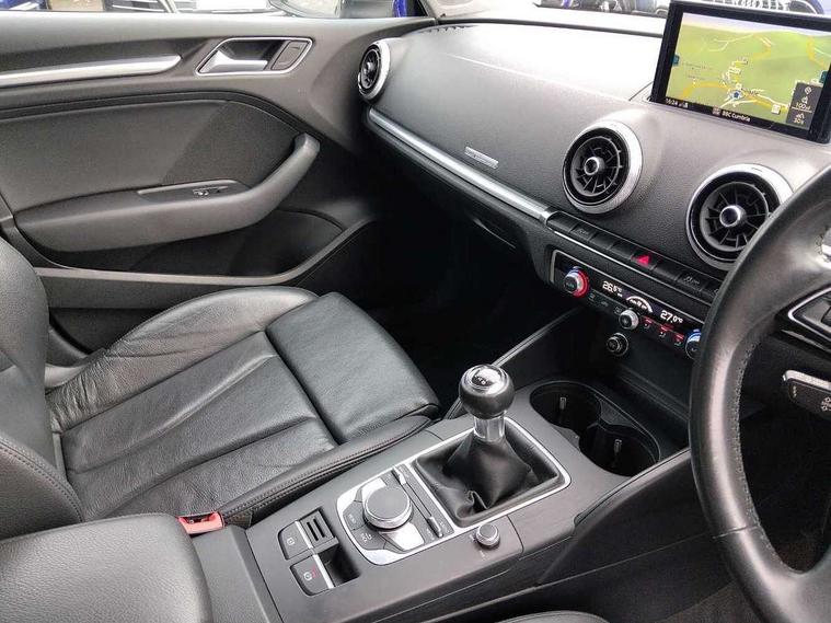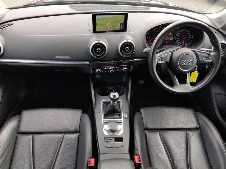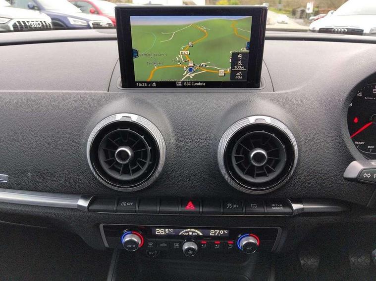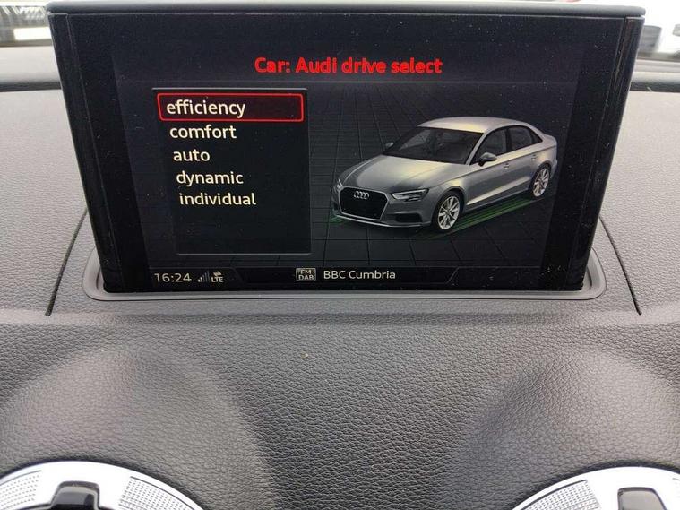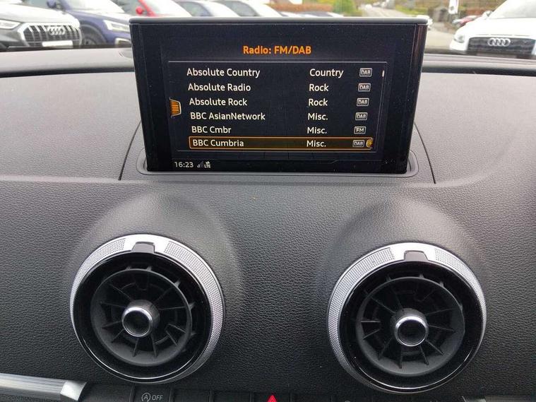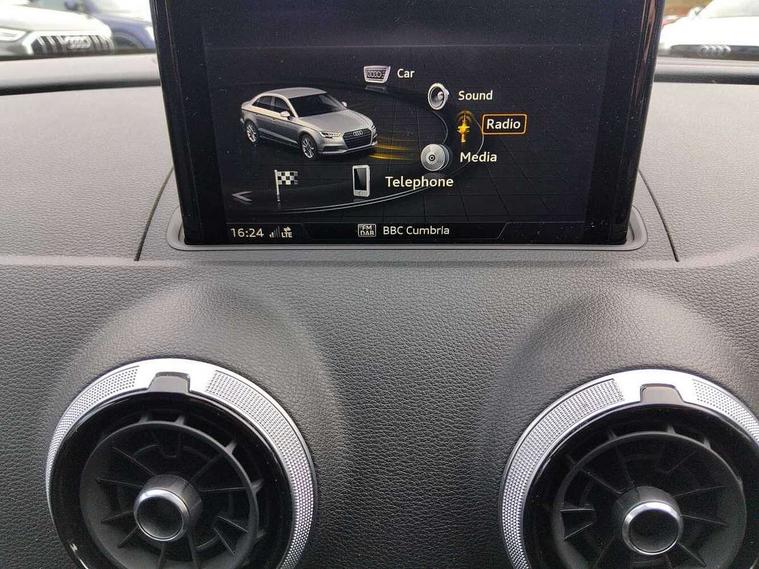Audi connect, Audi drive select, Audi smartphone interface, Automatic start/stop system, Bluetooth interface, Colour driver's information system display, Electro-mechanical PAS, SD card based MMI navigation, Service indicator, Voice control system, 2 USB interfaces and Aux-In jack, CD player, DAB Digital radio, MMI radio plus with 7" colour MMI screen and MMI controller, Two SDXC card slots, Aluminium side window trim, Auto dimming rear view mirror, Automatic lights and wipers, Body colour bumpers, Body colour door mirrors, Body colour roof spoiler, Dual branch chrome-plated exhaust tailpipe, Electrically adjustable and heated door mirrors with integrated LED side indicators, Front and rear electric windows, Heated rear window, Heated windscreen washer jets, Illuminated roof module, Passive door reflectors, Sport specific side air inlet grille and diffuser insert, Xenon headlights with LED Daytime running light, 3 adjustable rear headrests, 4 lashing points to secure luggage, Adjustable front centre armrest, Aluminium door sill trims, Cloth headlining, Driver/passenger sunvisors, Dual zone electronic climate control, Front and rear interior lights with delay, Front sports seats, Front/rear floor mats, Height/depth adjustable steering column, Illuminated glovebox, Illuminated luggage compartment, ISOFIX child seat mounting and Top Tether with front passenger airbag deactivation, Storage compartments in doors side trims, centre console and under front drivers seat, Tool kit, Non smoking pack - A3, Storage and luggage pack - A3/RS3, 3 point seatbelts on all seats, ABS/EBD, Airbags - front driver/passenger, front & rear side, curtain, drivers knee, ASR, EDL, Electromechanical parking brake, ESC - Electronic Stability Control + traction control, Hill hold assist, Predictive pedestrian protection, Seatbelt warning, Tyre pressure warning, Warning triangle and first aid kit, Anti theft alarm, Anti-theft wheel bolts, Immobiliser, Remote control central locking, Aluminium air vent surrounds, Aluminium mistral silver inlay, Aluminium trim elements, Tyre repair kit,