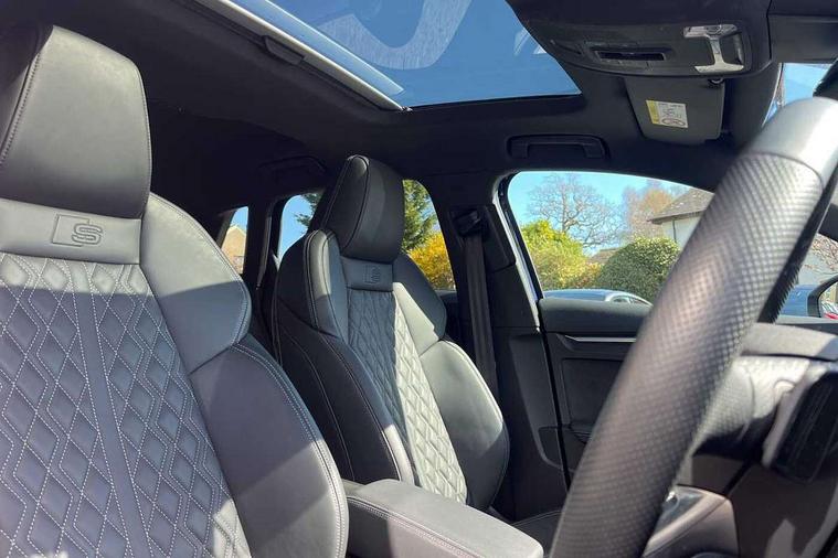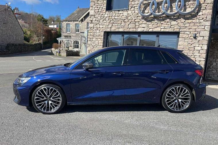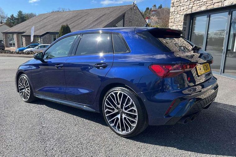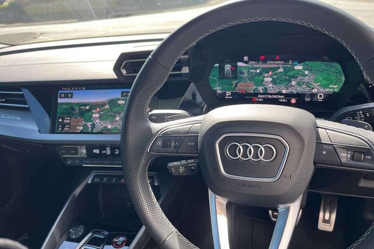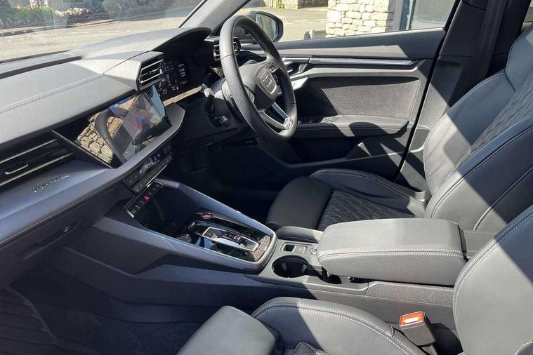 Adjustable speed limiter, Audi drive select, Audi smartphone interface with app store includes wireless Apple carplay, Android auto and Amazon alexa integration, Audi virtual cockpit plus - 12.3" full HD resolution dynamic digital instrument cluster, Automatic start/stop system with recuperation, Bluetooth interface, Camera based traffic sign recognition, Collision avoidance assistant, Distraction and Fatigue warning, e-Call (emergency call), Electromechanical power speed sensitive steering, Lane departure warning system, MMI Navigation Plus with high resolution 10.1" colour touch screen display, Park Assist with parking system Plus, Progressive steering, Service indicator, Tailgate, Trip computer, Voice control system with natural language interaction, S suspension with damper control, Audi Phonebox light with wireless charging, DAB Digital radio, USB ports with charging function in the rear, 3rd brake light, Anthracite grey Audi rings (front and rear), Audi Beam uses LEDs to project Vorsprung onto the ground as you exit your S3, Auto dimming frameless rear view mirror, Black accents front and rear bumpers including air inlets, Black accents in front grille and frame, Black accents window trims strips, Carbon door mirror housings, Electrically adjustable/heated/folding/auto dimming door mirrors with integrated LED indications + kerb view function for passenger side, Exterior model badging, Front electric windows, Headlight washers, Heat insulating glass windscreen, Illuminated door sills with aluminium inserts at the front with S logo, LED daytime running lights, Light and rain sensors, Panoramic roof, Privacy glass - dark tinted rear window, rear door and side windows, Rear electric windows, Rear side wing doors, Rear wiper, S grille, S3 front bumper with S specific air intake grilles, S3 roof spoiler, 12V socket and storage compartment in front centre console, 3 seat bench in 2nd row, 3 spoke leather multifunction steering wheel with gear shift paddles, 3-zone deluxe automatic air conditioning, 4 way electrically adjustable lumbar support for driver and front passenger, 40/20/40 split folding rear seat bench, Black cloth headlining, Fine Nappa leather upholstery with front sports seats S embossed logo, Front and rear centre armrest in artificial leather, Front and rear headrests, Front/rear floor mats, Heated front seats, Height and reach adjustable steering wheel, Manual boot compartment lid, Rear cup holders, S badging on the steering wheel, Seat side bolsters, Single front passenger seat, Stainless steel pedals and front footrest in black, Aluminium interior elements pack - A3 Sportback, Extended ambient lighting package Pro - S3, Storage package - A3, Technology package pro - A3 S Tronic, 3x3 point rear seat belts, Driver and front passenger airbag with passenger airbag deactivation, Electronic Stabilisation Control (ESC) including ABS, ASR and EDL, First aid kit with warning triangle and 2 safety vests, Front side airbags with head airbags and interaction airbag, Hill hold assist, Pre-sense front with pedestrian and cyclist detection, Seatbelt monitoring, Tyre pressure loss indicator, Anti theft alarm, Anti-theft wheel bolts, Electronically operated child locks, Immobiliser, Remote central locking with safelock, Dash & door inlays in carbon atlas structure, 19" Multi spoke S design gloss turned alloy wheels in anthracite black,