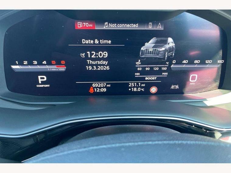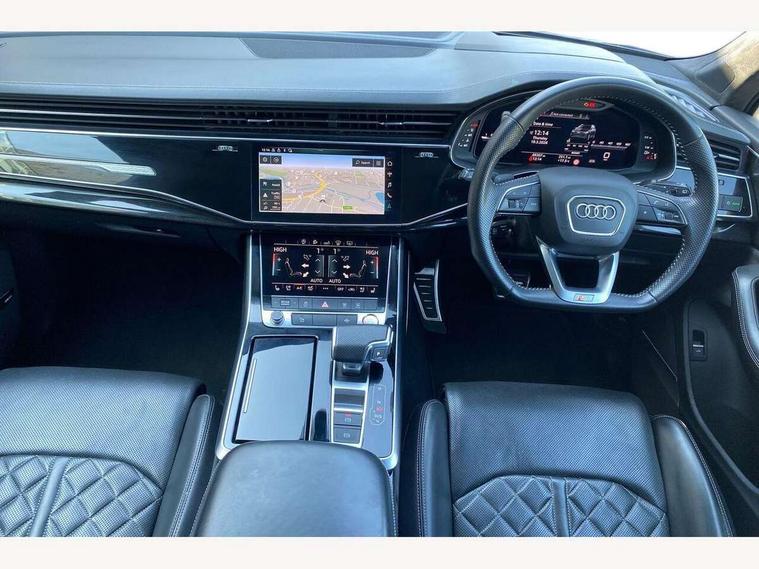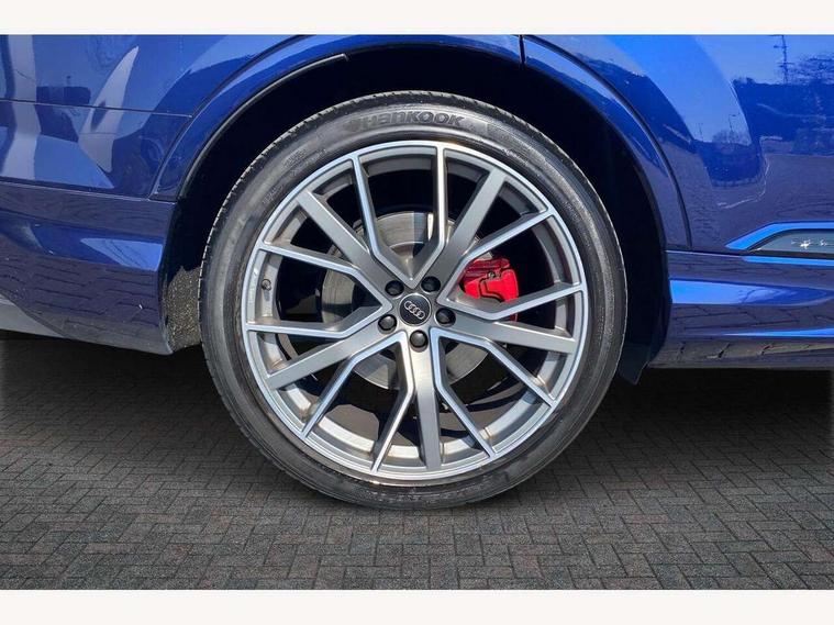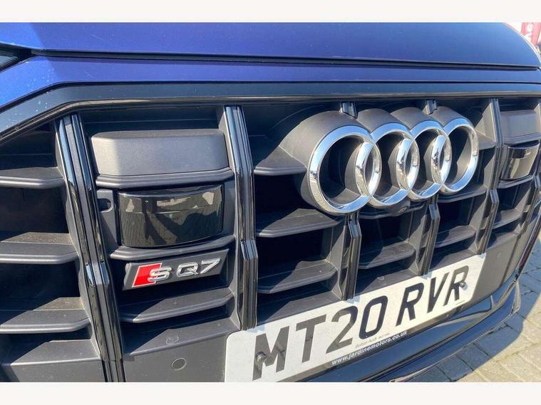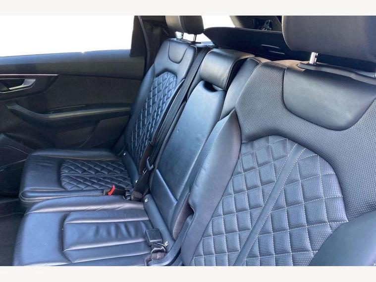 All wheel steering, Audi connect safety and service (e-call), Audi drive select (Auto, Comfort, Dynamic, Efficiency, Individual, Off-road and All road), Audi phone box with wireless charging, Audi virtual cockpit - 12.3" high-resolution LCD display with fully customisable instrument cluster, Camera based traffic sign recognition, Head up Display, MMI navigation plus with MMI touch screens includes 10.1" and 8.6" screens with haptic feedback, Natural voice recognition, PAS, Power door closure, Power operated tailgate, Smartphone interface includes wireless Apple carplay/Android Auto, Start/stop system, 48V Mild hybrid technology, 85 litre fuel tank, Quattro all wheel drive with self locking centre differential, S specific adaptive air sport suspension, 2 USB-C ports with charging functionality in the rear, DAB digital radio module, Audi Beam uses LEDs to project Vorsprung logo, Audi HD matrix LED headlights with Audi laser light + dynamic front and rear indicators, Auto dimming frameless rear view mirror, Black roof rails, Electric panoramic glass sunroof, Electrically adj heated/folding + automatically dimming exterior mirrors with memory + automatic kerb side function for passenger side exterior mirror, Headlight washers, Heat insulating glass in windshield, LED daytime running lights, LED rear tail lights, Privacy glass - dark tinted rear and rear side windows from B-pillar backwards, S front and rear bumpers, S specific rear bumper with 4 exhaust pipes, 3 spoke flat bottomed high multi-function leather sport steering wheel with gearshift paddles, 4 zone deluxe automatic climate control, 7 seat layout with ISOFIX points for the front passenger seat and rear passenger seat, Black alcantara headlining includes double sun visors with extendable driver and front passenger side illuminated vanity mirrors, Comfort front centre armrest, Electric height/reach adjustable steering column with memory + auto easy-entry and exit function, Folding rear seats, Front head restraints, Front/rear floor mats, Heated front and outer rear seats for second row, LED interior ambient lighting, Rear head restraints, Seat ventilation and massage function in the front, Stainless steel pedals, Valcona leather upholstery with front super sport seat + S embossed, electric adj front seats/backrest bolsters, lumbar support, memory functionality, City assist pack - Q7, Comfort and sound pack with Bang + Olufsen premium sound system - Q7, Extended leather pack with upper and lower interior elements in leather - Q7, Titanium black styling pack - Q7, Tour pack with Adaptive cruise assist - Q7, 3 point seatbelts on all rear seats, Audi pre sense front, Driver and front passenger, front side and curtain airbags, Electromechanical parking brake, Electronic Stabilisation Control (ESC) including ABS, ASR and EDL, Extended pedestrian protection measures, Hill hold assist, Seatbelt monitoring, Tyre pressure loss indicator, Warning triangle and first aid kit, Anti theft alarm, Anti-theft wheel bolts and wheel loosening detection, Keyless go with remote central locking, Polished oak trim with grey finish inlay, Tool kit, Tyre repair kit,