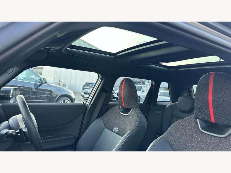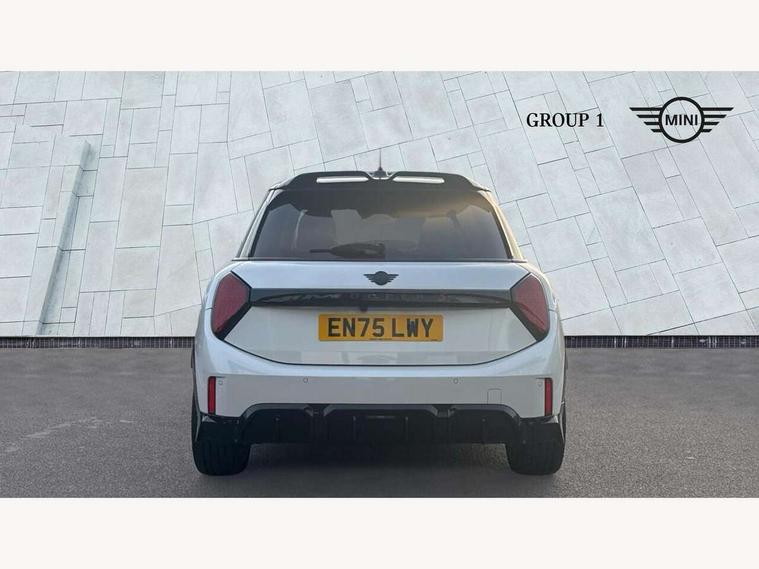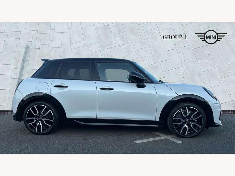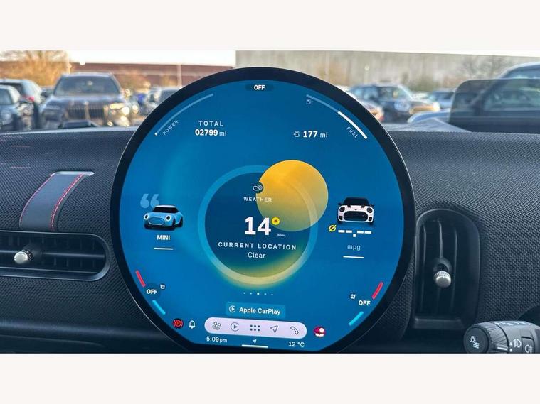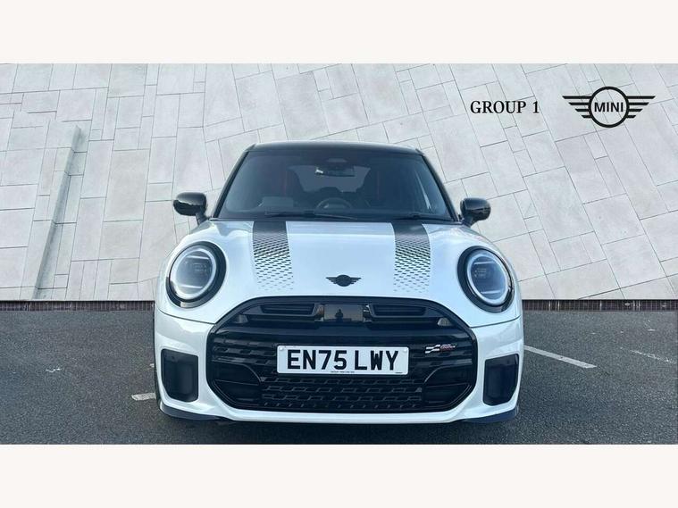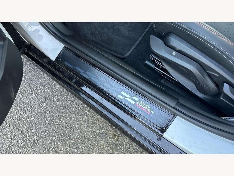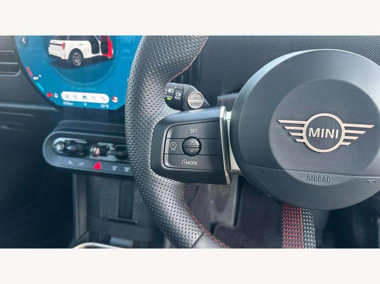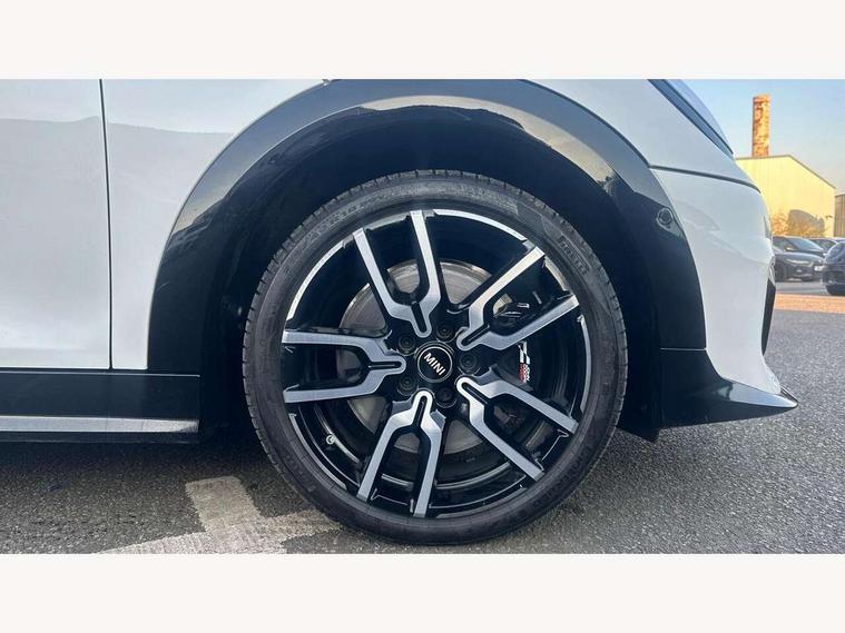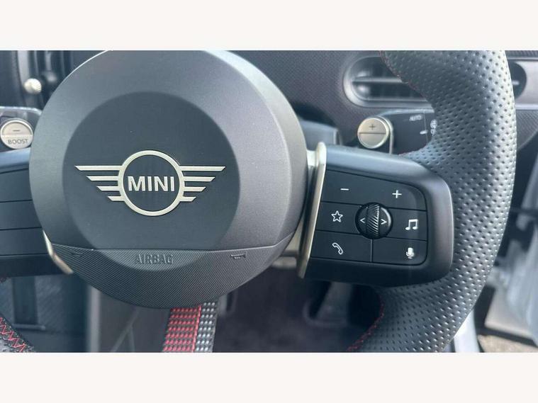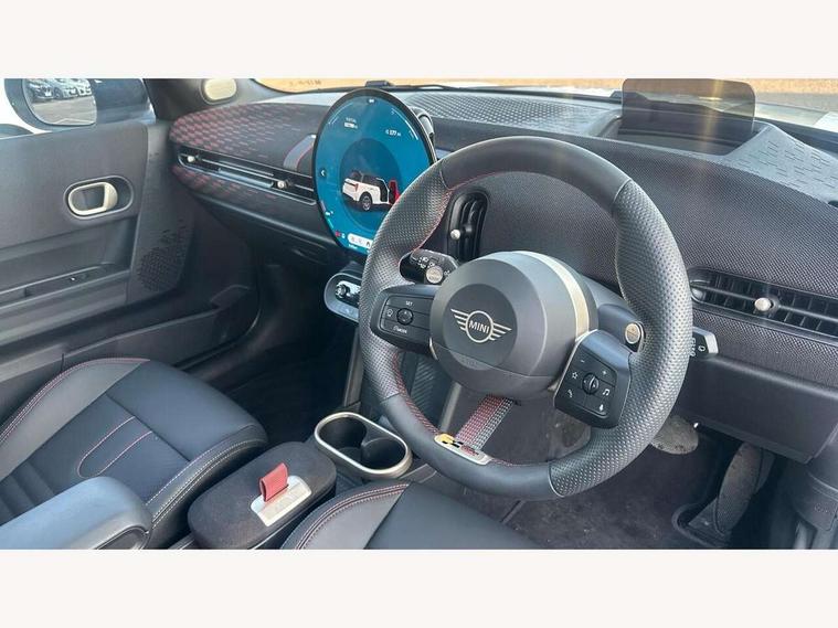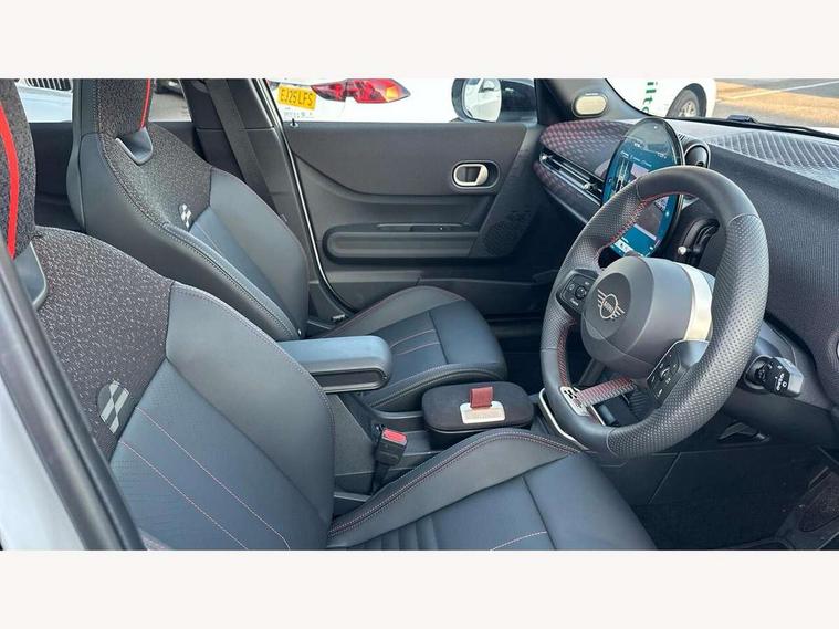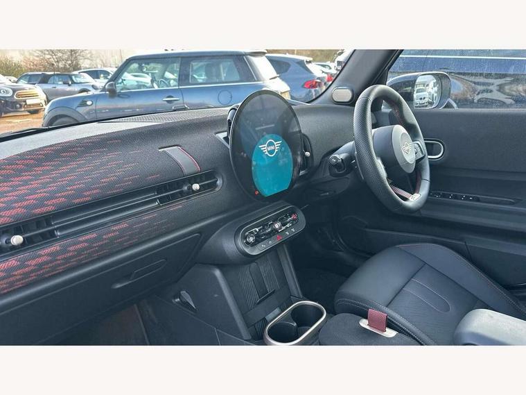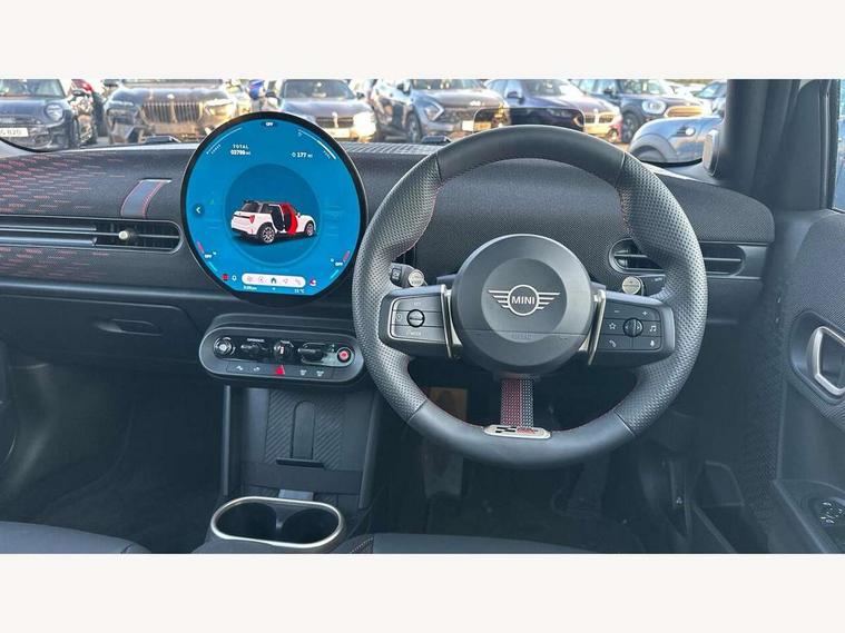 Central toggle bar, Circular OLED Screen, Compatible mobile phone bluetooth with audio streaming, Cruise control, Digital instrument cluster, Electro-mechanical speed dependant steering assistance, Emergency call service, Gaming controller with intelligent personal assistant voice update, MINI Experience Modes, Mini navigation system, On board computer, Service interval indicator, Tailgate, 7 speed sport transmission with double clutch, Adaptive suspension, DAB Digital radio, Front USB charger, Personal eSim, Rear USB charger, Adaptable light signatures, Auto headlights, Electric adjustable heated door mirrors, Electric front+rear windows, Front and rear apron, Heated rear window, Heated windscreen washer jets, High gloss hexagonal patterned grille surround, Jet black mirror caps, LED 3rd brake light, LED daytime running lights, LED indicator lights, LED rear lights, Rain sensor window wipers, Rear fog lights, Rear roof spoiler with airblades, Rear side wing doors, Rear window wiper, 2 zone automatic air conditioning, 3 seat bench in 2nd row, 60/40 rear seat bench, Ambient lighting, Black lower band in high gloss, Cupholders, Dark headliner, Floor mats, Front and rear head restraints, Front compact armrest, Heated steering wheel, Height adjustable passenger seat, Lidded storage box in Black/Red knit, Luggage compartment lighting, Partially perforated vescin steering wheel with red accent, black/red decorative strap, Single front passenger seat, Steering wheel paddle shift, Sunvisors with vanity mirrors, Driving assistant pack - Cooper Hatchback, Level 1 pack - Mini Hatchback, Park assistant pack - Cooper Hatchback, 3 point seatbelts on all five seats, 6 Airbags - front, side, head and seat belt tensioners, Anti-lock braking system (ABS), Brake caliper in Black with JCW badge, Child locks on rear doors, DSC - Dynamic Stability Control, Electronic parking brake, Front and rear disc brakes, Front ISOFIX (iSize), Front passenger airbag deactivation, JCW Sport Brakes, Traction control, Tyre pressure monitoring system, Alarm, Immobiliser, Remote central locking, Black/Red decorative dash strap, Tyre repair kit,