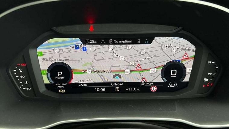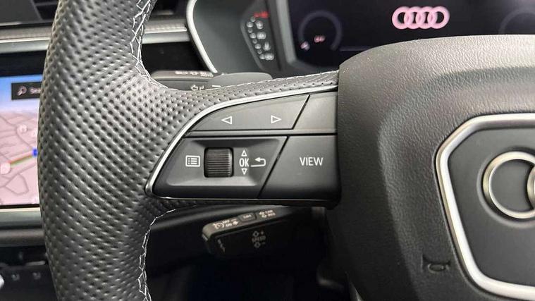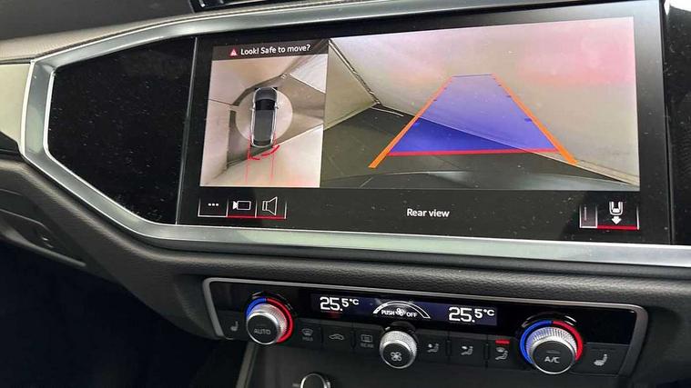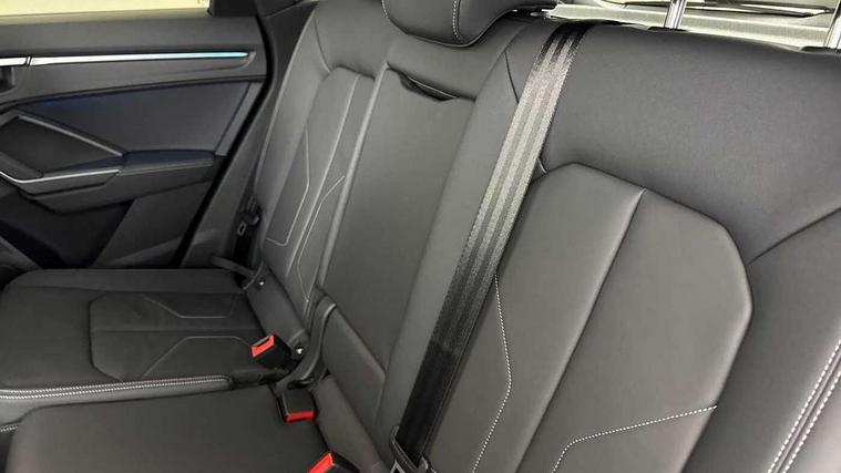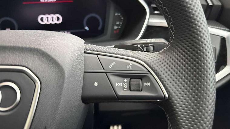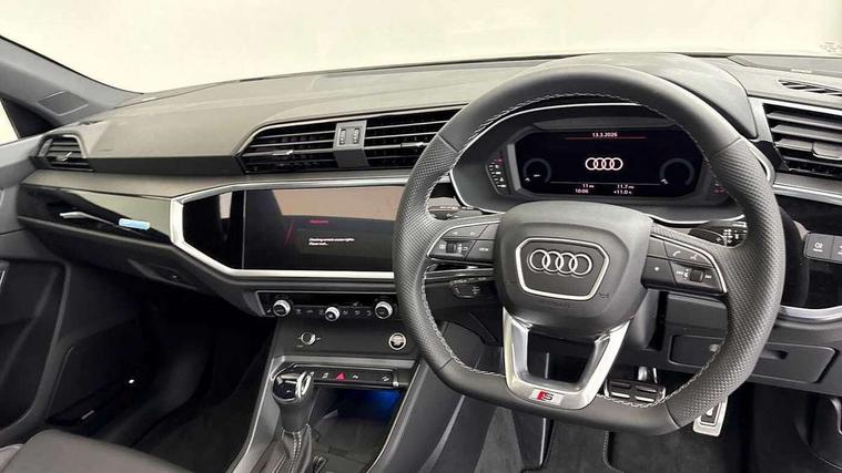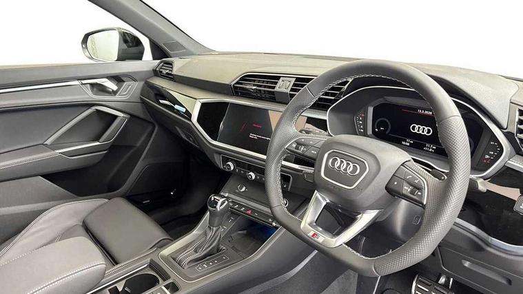 Audi connect safety and service, Audi drive select, Audi lane departure warning, Audi Virtual Cockpit - 10.25" display, Bluetooth interface, Camera based traffic sign recognition, Distraction and Fatigue warning, Legal emergency call, MMI Navigation Plus with high resolution 10.1 inch touchscreen colour display, Power operated tailgate, Progressive steering, Service interval indicator, Smartphone interface includes wireless Apple carplay/Android Auto, Start stop system with recuperation, Voice control system with natural language interaction, Diesel particulate filter, Sports suspension, 2 USB-C ports with charge and data functions, 6 passive loudspeakers, DAB digital radio module, Acoustic windscreen, Audi Beam uses LEDs to project the Audi logo onto the ground as you exit your Q3, Auto dimming door mirrors, Auto dimming frameless rear view mirror, Electrically folding, adjustable and heated door mirrors with integrated LED side indicators and kerb view function for passenger side, Front and rear electric windows, Front fog lights, Front underbody protection in manhattan grey paint finish, High gloss black finish B and C pillars, Honeycomb design radiator grille in matt anthracite black, LED Dynamic rear indicators, LED headlights with LED daytime running lights, LED rear lights, LED third brake light, Privacy glass dark tinted rear and rear-side windows (from B-pillar backwards), Rain and light sensors, Rear diffuser grille in grained matt black, Rear diffuser strip in matt anthracite black, Rear side wing doors, Rear underbody protection in matt black, Rear wiper, S line front and rear bumpers and side skirts in contrasting Manhattan grey paint finish, Variable front intermittent wipers, 12V socket in rear centre console, 3 seat bench in 2nd row, 40:20:40 folding with manual adjustment for 60:40 forwards/backwards position and backrest angle, Adjustable rear seat bench/backrest with centre armrest and cupholder, Black carpet mats, Black cloth headlining, Dual zone electronic climate control, Electric lumbar support, Front and rear black floor mats with contrast stitching in rock grey, Front and rear headrests, Front centre armrest, Height and reach adjustable steering wheel, Illuminated door sill trims with S logo, ISOFIX child seat mounting for front passenger with airbag deactivation and outer rear seat including top tether attachment point for outer rear seats, Luggage compartment sill protection in stainless steel, Manual front seats with height adjustment, Perforated leather gearknob, Single front passenger seat, Stainless steel pedals, Twin leather upholstery with front sport seats + S embossing, Black styling pack - Q3, Non smoking pack - Q3, 3x3 point rear seatbelts, 6 airbags - Driver, front passenger, curtain and side windows, Audi pre-sense front with pedestrain and cyclist recognition, Electrically operated child locks on rear doors, Electromechanical parking brake, Electronic stabilisation control including ABS, ASR and EDL, Front seatbelt reminder, Hill descent control, Hill hold assist, Pre sense basic, Seatbelt monitoring, Tyre pressure warning, Warning triangle and first aid kit, Anti theft wheel bolts, Immobiliser, Remote central locking, Thatcham approved category 1 anti theft alarm, Aluminium look interior elements, Detail dashboard around MMI touch colour display in glass look, black with surround in aluminium look, Leatherette door armrest, Piano black inlay,
