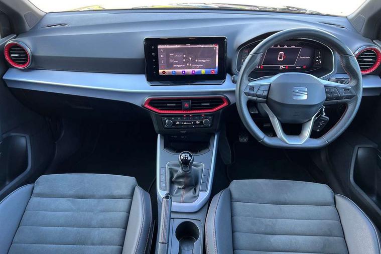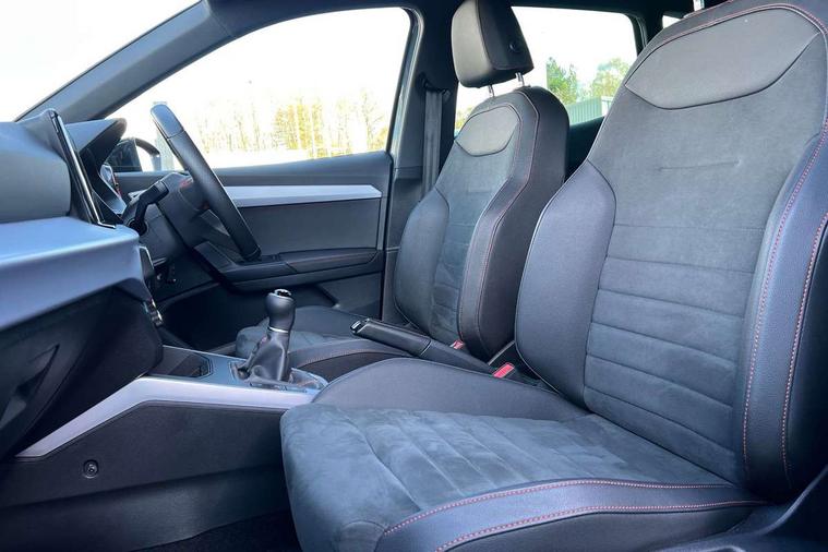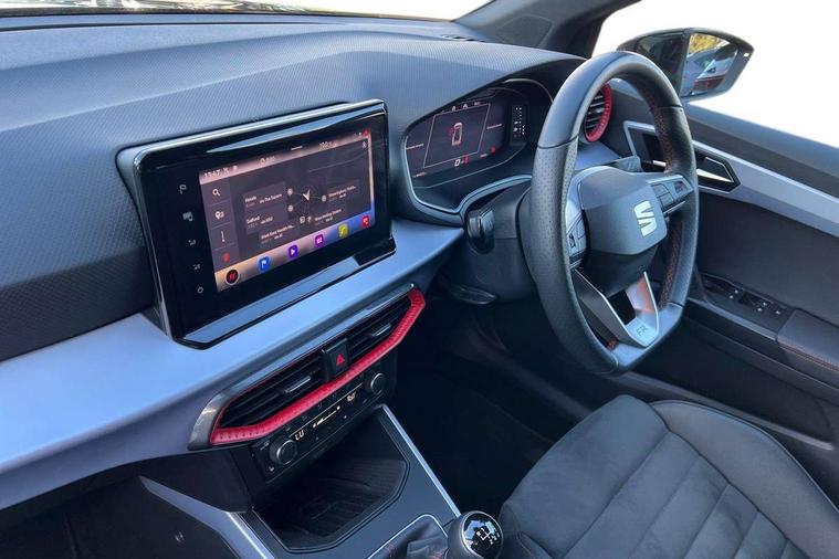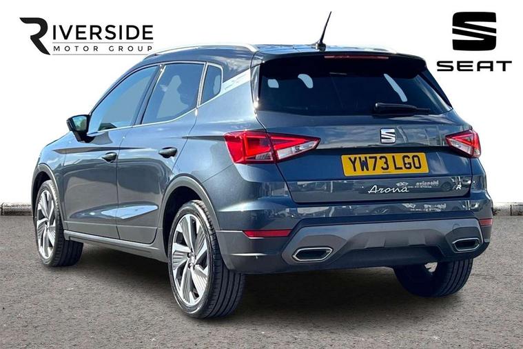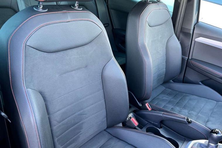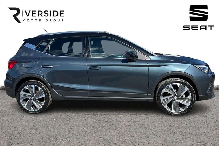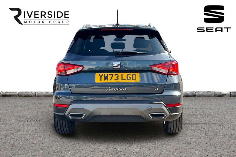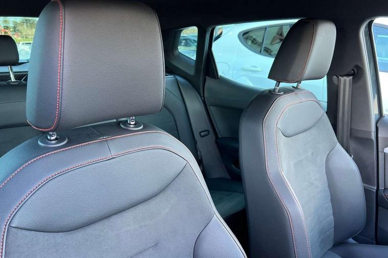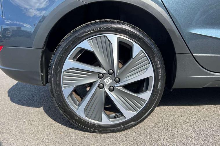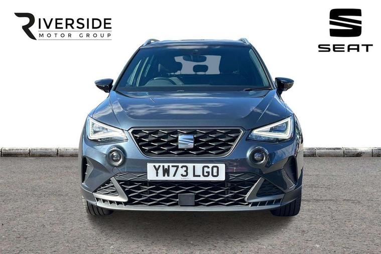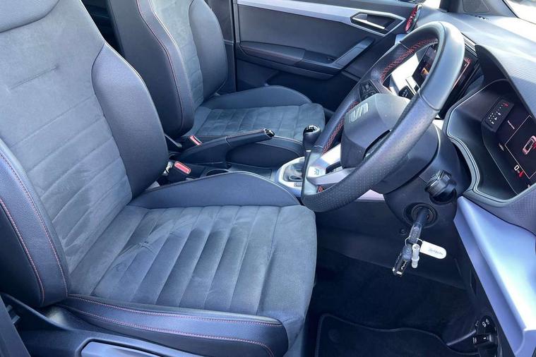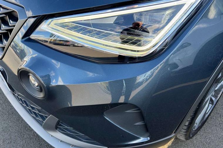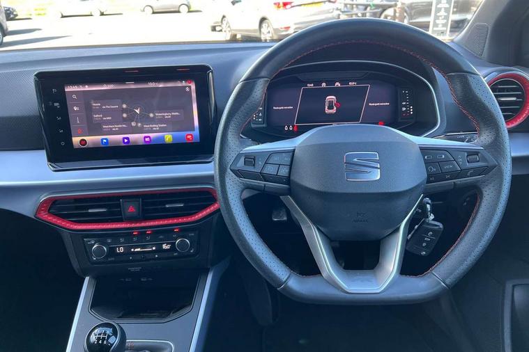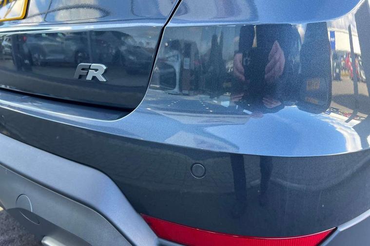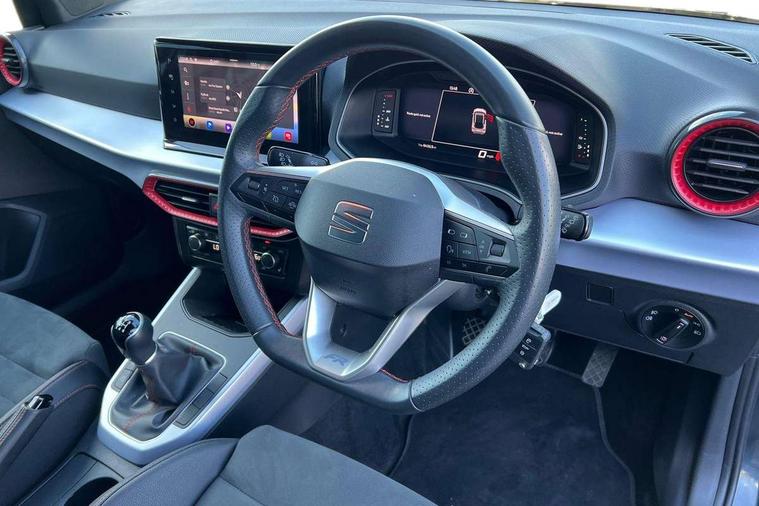 'Lights On' Reminder warning buzzer, 10" Digital cockpit, Digital clock, E-call, Electric speed sensitive power steering, Full Link Smartphone Integration with Mirror Link, Apple Car Play, Google Android Auto with USB Type C cable for Apple and Android compatibility, Low fuel warning light, Outside temperature display, Rear parking sensor, RPM counter, Seat connect with safety, service, remote and online, SEAT Drive profile - Four different models normal-sport-eco-individual, steering response, throttle response, Trip computer, Wireless phone charger, 9.2" colour touchscreen with navigation system, voice control and USB port (type c), Bluetooth interface for hands free and audio streaming, DAB digital radio and AM/FM radio, Steering wheel mounted audio controls, Anti theft roof antenna, Auto dimming interior rear view mirror, Automatic activation of hazard warning lights, Body coloured bumpers, Body coloured door handle inserts, Chrome roof rails and window surrounds, Dark tinted rear windows, Electric front/rear windows, Electrically adjustable, heated and folding door mirrors, Front fog lights with cornering function and rear fog light, FULL LED automatic headlights with dynamic headlight range control, coming and leaving home, LED daytime running lights, LED rear tail lights and licence plate lights, Protective side mouldings, Rain sensing wipers, Rear side wing doors, Rear spoiler, Rear window wash/wipe, Roof colour door mirrors, Third brake light, Twin exhaust pipe styling hidden exhaust pipe, Visible VIN plate, Windshield wiper with intermittent control and potentiometer, 2 cupholders, 3 seat bench in 2nd row, 60/40 split folding rear seat, Aircare filter, Black interior roof, Double boot floor, Driver sunvisor with covered mirror + card holder, Dual zone climate control, Front comfort seats, Front courtesy light with front reading lights, Front seat back storage pockets, Gear shift indicator, Heated front seats, Height adjustable front seats, Height/reach adjustable steering column, Illuminated boot, Instrument lighting with brightness control, Interior ambient lighting, Interior light in footwell, central console and door panel, ISOFIX points in outer rear seats with top tether anchorage points, Microsuede cloth upholstery, Passenger sunvisor with vanity mirror, Perforated flat bottomed leather steering wheel/gear knob/handbrake with red stitching and FR logo, Single front passenger seat, Two front and three rear height adjustable headrests, Interior chrome pack - Arona, 3 point seatbelts on all rear seats, ABS, Active front headrests, Child locks on rear doors, Driver and front passenger airbags with front passenger airbag de activation, front side and curtain airbags, Electronic stability control, Emergency Brake Assist (EBA) and front assist, Front and rear seatbelt reminder, Hill hold control, Multi-Collision braking, Tiredness recognition system, Traction control, Tyre pressure monitoring system, Alarm with back-up horn, Electronic engine immobiliser, Locking wheel bolts, Remote central locking + deadlocks, Tow away protection, Titan black dashboard, 18" Performance Cosmo grey matt alloy wheels,