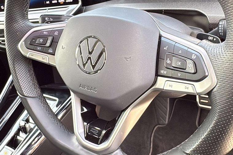 Activated carbon canister, Adaptive cruise control (ACC), Advanced driver attention and drowsiness monitor, Dynamic road sign display, Dynamic steering, E-Sim card for online connectivity, eCall emergency call system, Multi-color Digital cockpit pro, selection of different info profile possible, Multifunction front facing camera for distance control, Navigation system, Oncoming vehicle braking when turning including swerve support, Preparation for light assist system, Speed limiter, Speedo, rev counter, electronic odometer, trip, service interval display, exterior temperature and fuel gauge, Traffic jam assist, Voice enhancer and voice control, Warning signal and warning light for front and rear seatbelts not fastened, We connect plus preparation, We connect preparation, Wireless app connect, Diesel particulate filter, Hybrid propulsion system, Start-stop system with battery regeneration (recuperation - energy recovery during braking), XDS electronic differential lock for improved traction and handling, 2 USB C ports in front, 2 USB charging sockets on the centre console in the rear charging capacity upto 45W, Comfort telephony + wireless charging, without wireless aerial connection, Digital radio reception (DAB), Diversity antenna for FM reception, Gaming platform via car app, Infotainment system with 12.9" display, Mobile phone interface with inductive charging feature, 3rd brake light, Auto headlights, Automatic headlamp activation with Coming home and Leaving home feature, Body colored bumpers in R-Line style, Body colour door handles, Exterior ambient lighting with illuminated door handles, Exterior mirrors convex on the left and aspherical on the right, Front and rear electric windows, Heat insulating windshield made of laminated glass, LED daytime running lights, Rear exhaust tailpipe, Rear fog light on one side and reversing lights on both sides, Rear side wing doors, Rear windscreen washer and wiper with interval delay, Remote electrically foldable door mirrors, puddle lights and reverse activated passenger's door mirror, Welcome light with surround lighting, 12V socket in front centre console, 12V socket in luggage compartment, 3 rear head restraints, 3 seat bench in 2nd row, Ambient lighting with 30 colour including LED light unit in front footwell with selectable light colour, Brushed stainless steel pedals, Carpet mats, front and rear, Chrome plated radiator grille inserts, air vent surrounds and light switch surrounds, Front centre armrest, Integrated front head restraints, ISOFIX anchors for child seats on outer rear bench seats and on front passanger seat compatible for i-Size, Luggage compartment lighting, Plastic gear knob, Premium sports seats in front, Rear cupholder and loadthough, Single front passenger seat, Soul black instrument panel, Split folding backrest with centre armrest and unsplit rear seat bench, Storm grey roof lining, Sun visors with illuminated vanity mirrors, 3 point height adj front seatbelts + pretensioners, 3 rear three point seatbelts, ABS, Autonomous emergency braking front assist with pedestrian and cyclist monitoring, Child locks on rear doors, Driver and front passenger airbag with front passenger airbag deactivation, Electronic parking brake with auto hold, ESC (Electronic Stability Control), Extended pedestrian protection measures, Hill start assist, Rear disc brakes, Two tone horn, Tyre pressure loss indicator, Volkswagen roadside assistance, Anti theft wheel bolts, Preparation for alcohol interlock, Decorative inserts carbon grey for dashboard and front door trim panels,