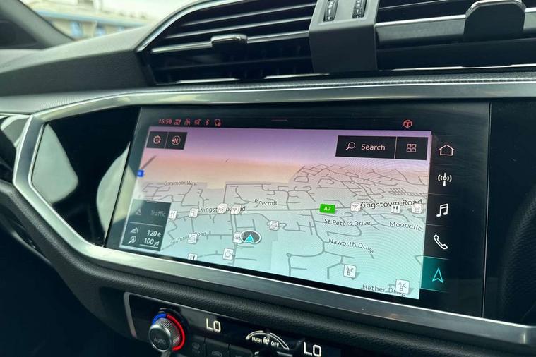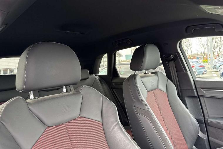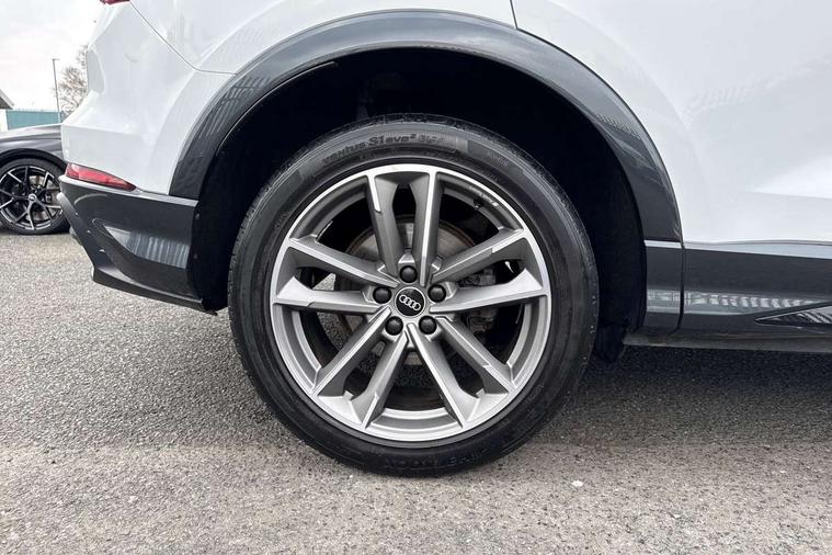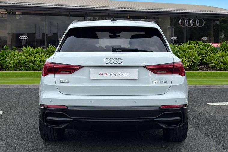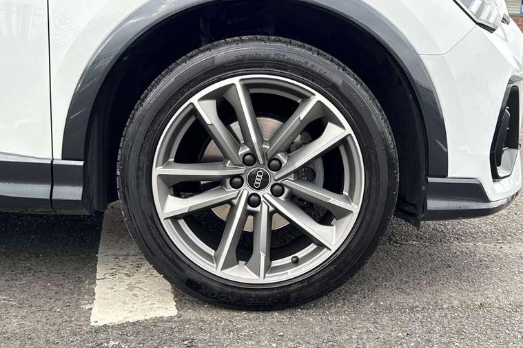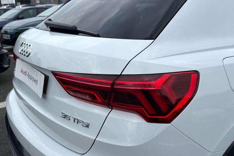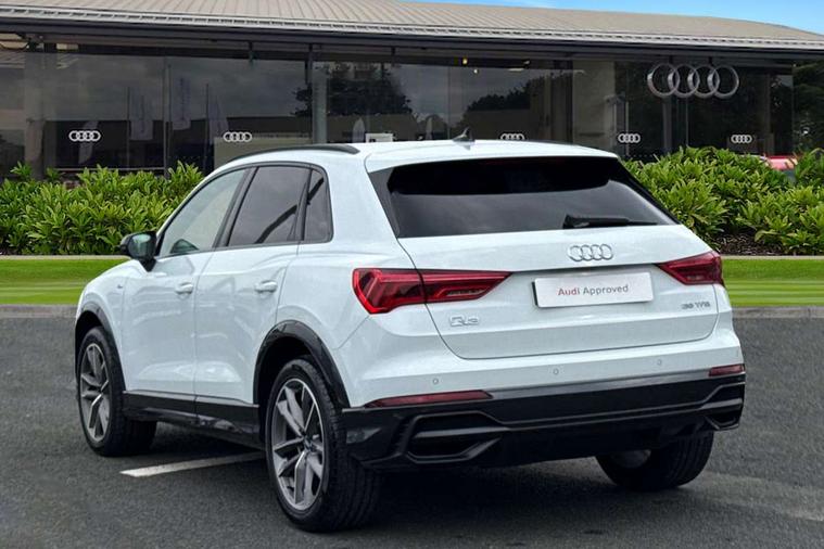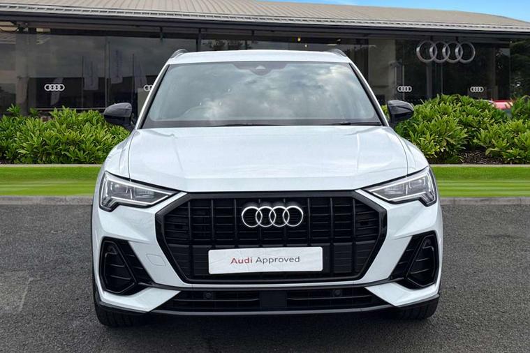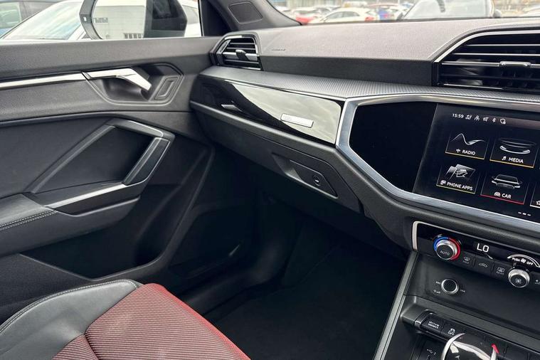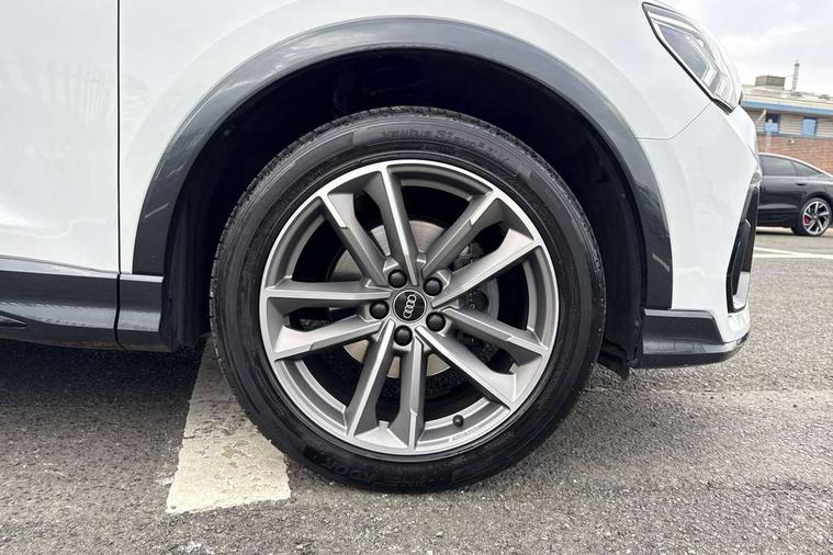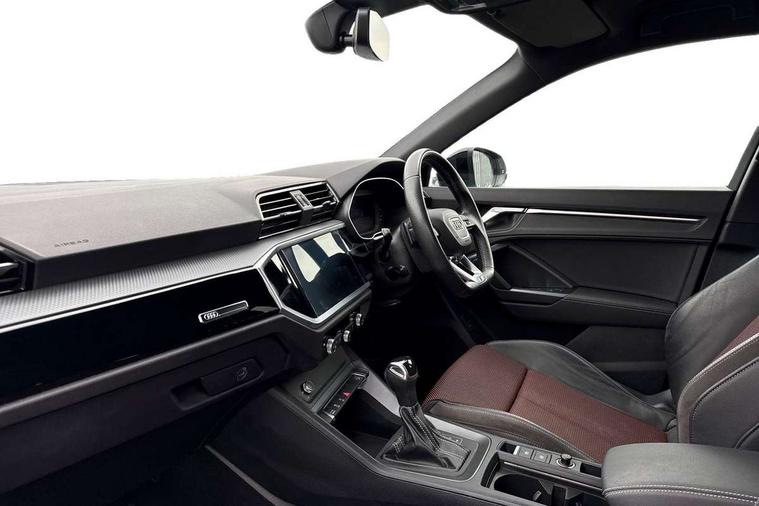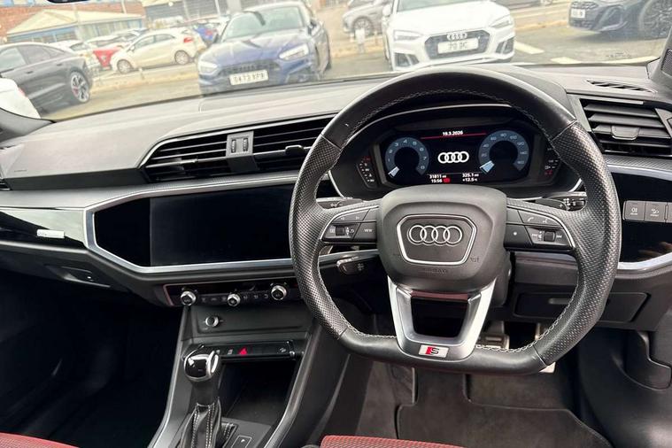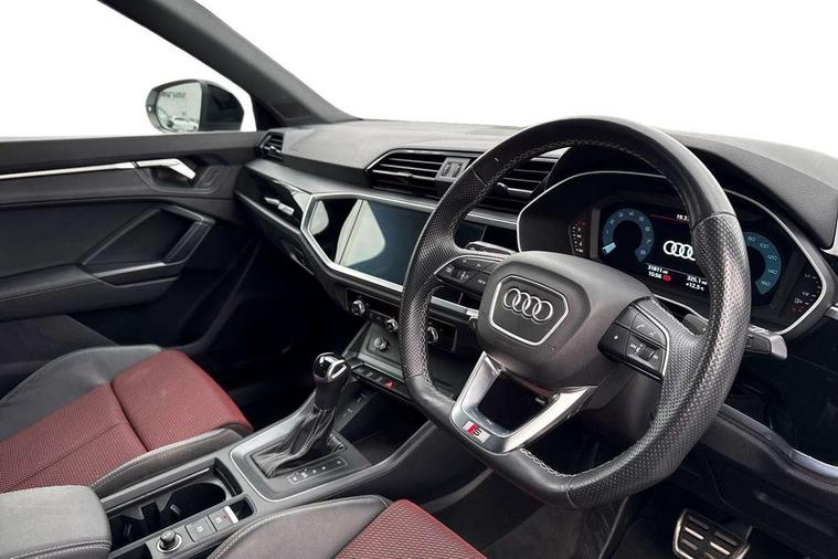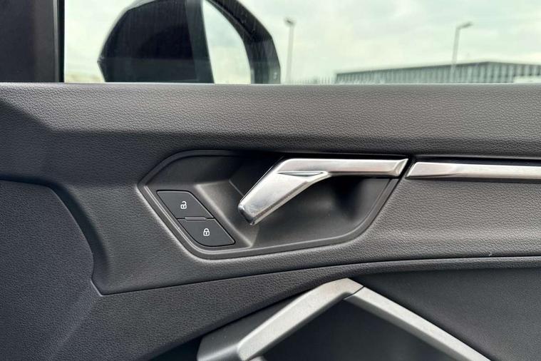 Leatherette door armrest, MMI touch colour display in glass look, black with surround in aluminium look, Piano black inlay, Black styling pack - Q3, Non smoking pack - Q3, Tyre repair kit, Anti theft alarm, Anti theft wheel bolts, Audi pre-sense front with pedestrain and cyclist recognition, Remote central locking, 2 USB-C ports with charge and data functions, 6 passive loudspeakers, DAB digital radio module, 3x3 point rear seatbelts, 6 airbags - Driver, front passenger, curtain and side windows, Electrically operated child locks on rear doors, Electromechanical parking brake, Electronic stabilisation control including ABS, ASR and EDL, Hill descent control, Hill hold assist, Pre sense basic, Seatbelt monitoring, Tyre pressure warning, Warning triangle and first aid kit, Acoustic windscreen, Auto dimming frameless rear view mirror, Black roof rails, Electrically folding, adjustable and heated door mirrors with integrated LED side indicators and kerb view function for passenger side, Front and rear electric windows, Front fog lights, Grille vertical bars in aluminium silver/Matt, High gloss black finish B and C pillars, LED headlights with LED daytime running lights and dynamic rear indicator, LED rear lights, Privacy glass dark tinted rear and rear-side windows (from B-pillar backwards), Rain and light sensors, Rear diffuser strip in matt titanium black, S line bumpers in contrasting Manhattan grey, 12V socket in rear centre console, 40:20:40 folding with manual adjustment for 60:40 forwards/backwards position and backrest angle, Adjustable rear seat bench/backrest with centre armrest and cupholder, Black cloth headlining, Dual zone electronic climate control, Front and rear black floor mats with contrast stitching in rock grey, Front and rear headrests, Front and rear roof module including reading lights, Front centre armrest, Glove compartment lighting, Height and reach adjustable steering wheel, Illuminated door sill trims with S logo, ISOFIX child seat mounting for front passenger with airbag deactivation and outer rear seat including top tether attachment point for outer rear seats, Luggage compartment light, Manual front seats with height adjustment, Perforated leather gearknob, Stainless steel luggage compartment sill finisher, Stainless steel pedals, Tool kit, Amazon alexa Integration, Audi connect safety and service (e-call), Audi drive select, Audi lane departure warning, Audi smartphone interface includes wireless Apple carplay/Android Auto, Audi Virtual Cockpit - 10.25" display, Bluetooth interface, Camera based traffic sign recognition, MMI Navigation Plus with high resolution 10.1 inch touchscreen colour display, Power operated tailgate, Progressive steering, Service interval indicator, Start stop system with recuperation, Voice control system with natural language interaction, 48V Mild hybrid technology, Sports suspension,