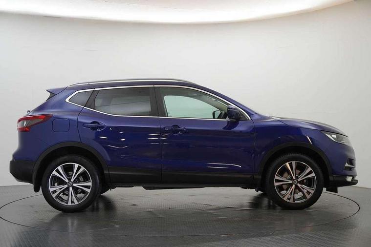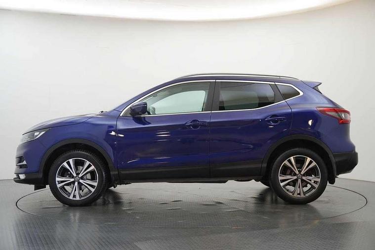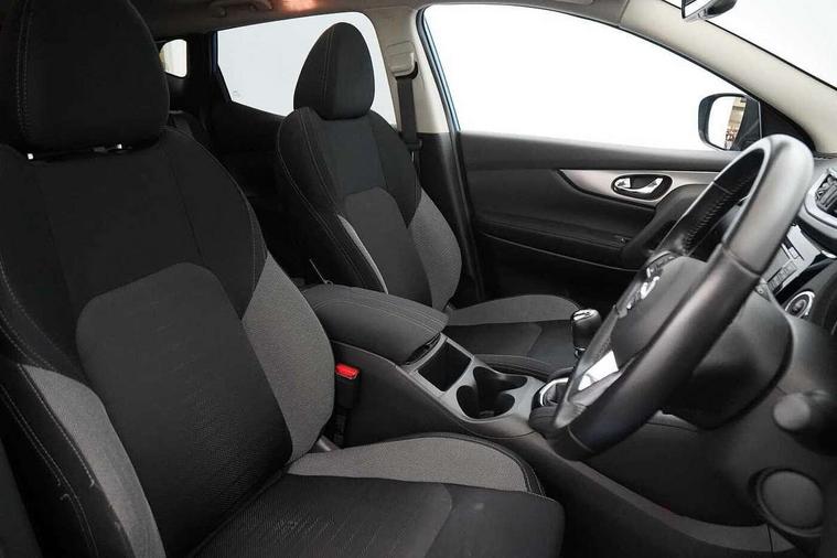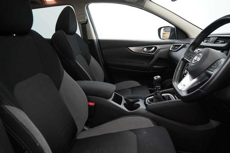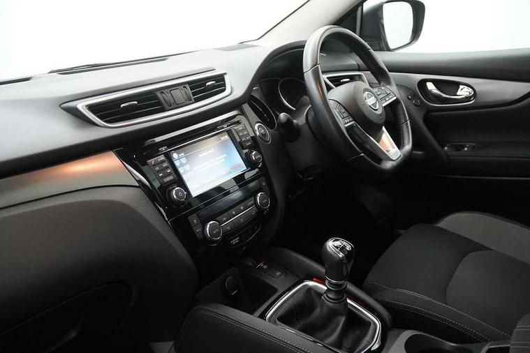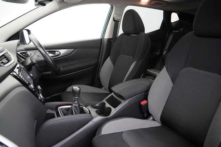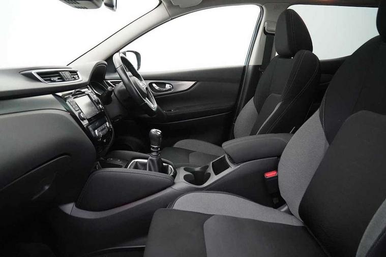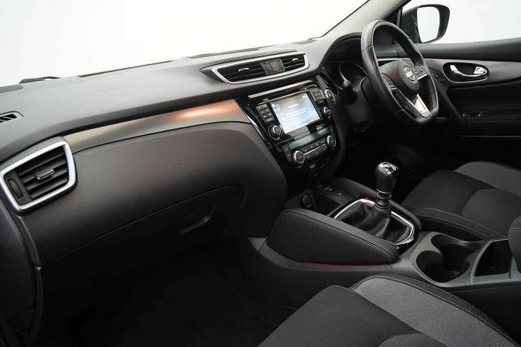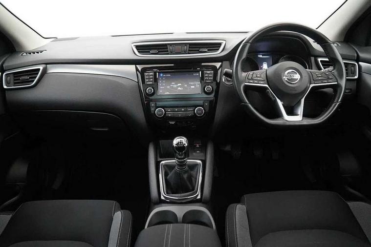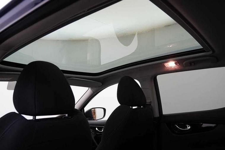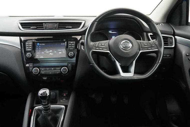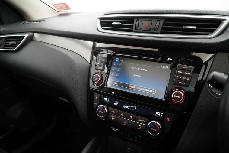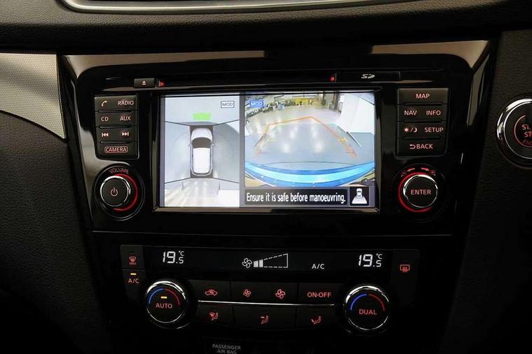 5" TFT driver information centre, Around View Monitor, Bluetooth phone integration system, Cruise control, Electric speed sensitive power steering, Front and rear parking sensors, Lane departure warning system, Nissan connect sat nav system, Outside temperature display, Push button starter, Rear view camera, Service interval indicator, Speed limiter, Traffic sign recognition, Trip computer, 'Shark fin' mobile antenna, 6 speakers, DAB Digital radio, Radio/CD, Smartphone apps, Steering wheel mounted audio controls, USB/aux input socket, Automatic headlamp activation, Body colour bumpers, Body colour door handles, Body colour door mirrors, Chrome window surround, Electric folding and heated door mirrors, Front fog lights, High beam assist, Interior mirror with auto anti dazzle, LED indicators in door mirrors, Matt silver roof rails, One touch electric front/rear windows, Privacy glass, Rain sensor windscreen wipers, Rear roof spoiler, Rear wiper, 2 X front 12v power sockets, 60/40 split folding rear seat, Ambient interior lighting, Centre console with armrest, Chrome interior door handles, Cloth upholstery, Configurable luggage board system, Driver + front passenger lumbar support, Dual zone climate control, Front and rear door pockets with bottle holders, Front headrests, Front seat belt pre-tensioners with load limiters, Height adjustable driver's seat, Height adjustable passenger seat, Illuminated electric window switch, Isofix child seat preparation, Leather gearknob, Leather interior door handles, Leather knee rest, Leather steering wheel, Luggage compartment lighting, Parcel shelf, Pollen filter, Rake/reach adjustable steering wheel, Rear armrest with 2 cupholders, Rear headrests, ABS, brake assist and EBD, Child locks on rear doors, Curtain airbags, Driver/front passenger airbag, Electronic parking brake, ESP + traction control, Forward emergency braking, Front passenger airbag deactivation, Height adjustable front seatbelts, Hill start assist, Seatbelt warning, Side airbags, Three 3 point rear seatbelts, Tyre pressure monitoring system, Alarm, Immobiliser, Intelligent Key, Remote central locking, Piano black interior trim, 18" Bi-colour alloy wheels, Tyre puncture repair kit,