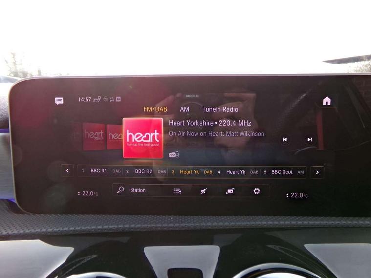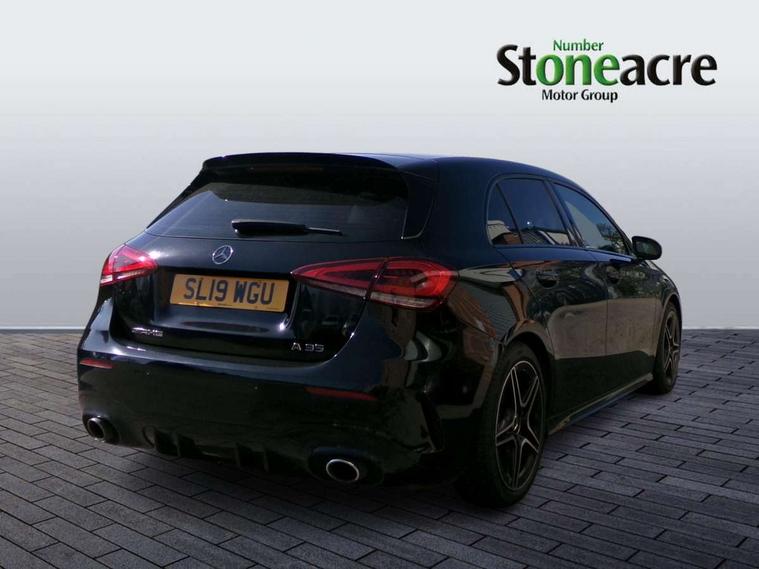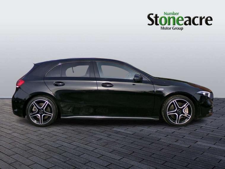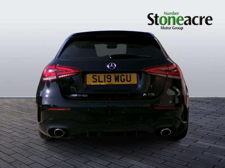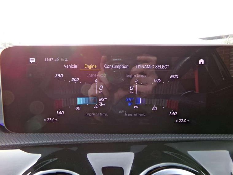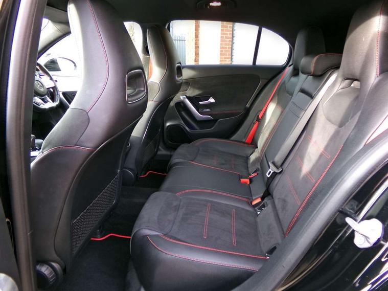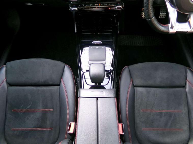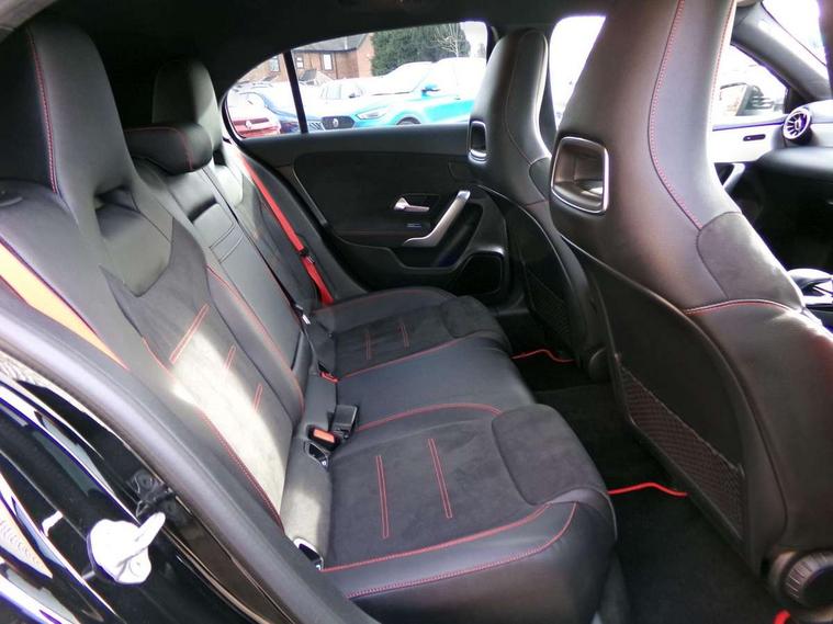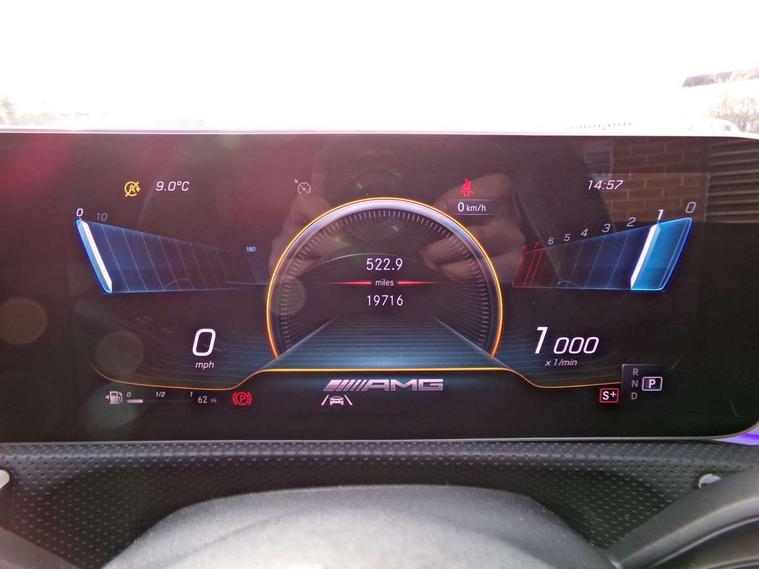 10.25" Digital instrument cluster display screen, 180 degree rear view camera with parking guidelines, Active lane keep assist, Active park assist with parktronic system including front and rear parking sensors, Attention assist, Brake pad wear indicator warning light, Direct steering, Direction indicators with lane change function, DYNAMIC SELECT with driving programs (Slippery, Comfort, Sport, Sport+ and Individual), Fluid level warning indicator for fuel, oil, coolant and washer fluid, Hard-disk navigation, Lamp failure indicator, MBUX multimedia system with DAB digital radio and touchpad including satellite navigation, Mercedes me connect including emergency call system, accident recovery, breakdown management and maintenance, Outside temperature gauge, Radio aerial integrated into roof spoiler, Service indicator (ASSYST), Speed sensitive power steering, Stop/start system, Trip computer, Voice activation, DAB Digital radio, Dual bluetooth interface, 2 USB ports (type C), Mid-range sound system, Adaptive brake lights, AMG front, rear apron and side skirts, AMG radiator grille with twin louvre, Blue tinted glass, Body colour bumpers, Body colour door handles, Body colour side skirt, Body coloured door mirrors, Chrome beltline trim, Electric adjustable and heated door mirrors with integrated LED side indicators, Electric front windows, Electric rear windows, Headlamp assist automatic headlamp activation, Heated glass rear windscreen + timer control, LED high performance headlamps with integrated LED daytime running lights, LED tail lamp, LED third brake light, Rain sensor windscreen wipers, Rear fog lights, Rear wiper, Two round tailpipes attached to rear apron, Wider wheel arches for AMG wheels, 12V socket, 40:20:40 split folding rear seats, Air vents surround and cruciform nozzle in silver chrome, AMG floor mats with red stitching, AMG leather on door centre panels, AMG Performance steering wheel in nappa leather, Auto Mercedes-Benz child seat recognition sensor, Beltline double topstitching, Black roof lining, Brushed stainless steel sports pedals with rubber studs, Controller on centre console with chrome surround, Cup holder and stowage compartment lighting, Front centre armrest with storage compartment, Front door sills with Mercedes benz lettering, Front footwell lights, Front reading lamps, Front seat backs luggage nets, Front seat cushion length adjustment, Front signal exit lamp, Front vanity lights, Gearshift paddles on steering wheel, Handle recess/closing light, Heated front seats, Height/reach adjustable steering column, Illuminated glovebox, Interior lighting - 64 colour Ambient lighting, ISOFIX Child seat top tethers and anchor fixings, Load securing rings in luggage compartment, Luggage compartment cover, Manual height adjustable front seats, Oddments tray lighting, Rear armrest, Rear head restraints, Rear Reading Lamps, Seat occupancy sensor for front passenger seat, Sports seats with integrated headrests, Storage compartment under load area floor, Sunvisors with illuminated vanity mirrors, Touchpad, Touchpad illumination, Twin front cupholders, Two zone thermotronic luxury automatic climate control, Mirror package - A Class, Seat comfort pack - A Class, 3 rear 3 point seatbelts, ABS with Brake Assist, Active bonnet, Adaptive brake assist with hold function and hill start assist, Brake calipers with Mercedes-Benz lettering + perforated brake discs, Childproof locks manually operated for rear doors and electrically operated for rear power windows, Crash responsive emergency lighting, Driver and passenger head and side airbags, Drivers knee airbag, Dual stage driver/passenger airbags, Electronic parking brake, ESP curve dynamic assist, ESP with ASR, Front and rear seatbelt reminder, Tyre pressure monitoring system, Warning triangle and first aid kit, Window airbags, Alarm system/interior protection/immobiliser, Keyless go lock/unlock, Remote central locking and crash sensor with emergency opening function, Light aluminium with longitudinal grain interior trim, Tirefit sealant kit,