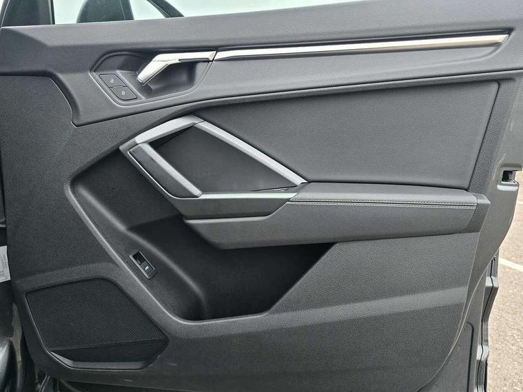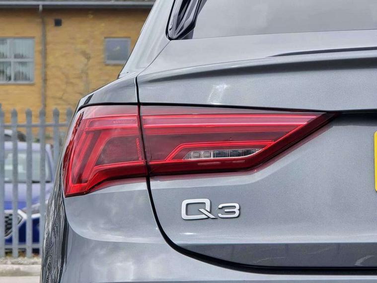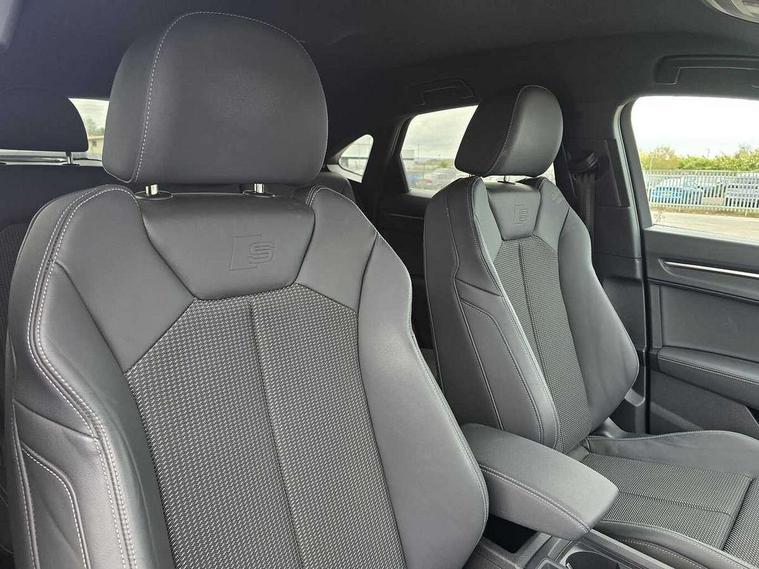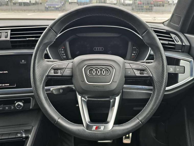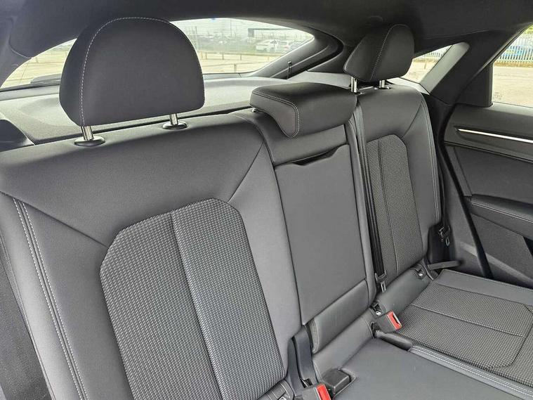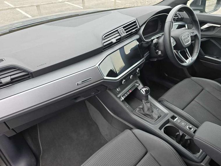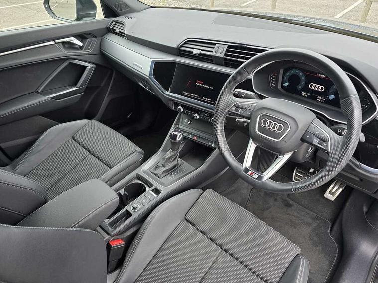 Audi drive select, Audi lane departure warning, Audi Virtual Cockpit - 10.25" display, Bluetooth interface, Camera based traffic sign recognition, Legal emergency call, MMI Navigation Plus with high resolution 10.1 inch touchscreen colour display, Power operated tailgate, Progressive steering, Service interval indicator, Smartphone interface includes wireless Apple carplay/Android Auto, Start stop system with recuperation, Voice control system with natural language interaction, Sports suspension, 2 USB-C ports with charge and data functions, 6 passive loudspeakers, DAB digital radio module, Acoustic windscreen, Aluminium window trim, Auto dimming frameless rear view mirror, Diffuser grille in grained matt black, Diffuser trim in selenite silver, Electrically folding, adjustable and heated door mirrors with integrated LED side indicators and kerb view function for passenger side, Front and rear electric windows, Front fog lights, Front side air inlets in selenite silver, Front underbody protection in manhattan grey paint finish, Grille surround in aluminium silver matt, High gloss black finish B and C pillars, LED Dynamic rear indicators, LED headlights with LED daytime running lights, LED rear lights, LED third brake light, Privacy glass dark tinted rear and rear-side windows (from B-pillar backwards), Radiator grille in anthracite black with inlay in matt aluminium silver, Rain and light sensors, Rear side wing doors, Rear underbody protection in matt black, Rear wiper, S line badges on front wings, S line front and rear bumpers and side skirts in contrasting Manhattan grey paint finish, Side skirt insert in matt Platinium grey, Variable front intermittent wipers, 12V socket in rear centre console, 3 seat bench in 2nd row, 3 spoke leather multifunction steering wheel features S badging and grips in perforated leather with contrast stitching, 40:20:40 folding with manual adjustment for 60:40 forwards/backwards position and backrest angle, Adjustable rear seat bench/backrest with centre armrest and cupholder, Black cloth headlining, Dual zone electronic climate control, Front and rear black floor mats with contrast stitching, Front and rear headrests, Front and rear roof module including reading lights, Front centre armrest, Glove compartment lighting, Height and reach adjustable steering wheel, Illuminated door sill trims with S logo, ISOFIX child seat mounting for front passenger with airbag deactivation and outer rear seat including top tether attachment point for outer rear seats, Luggage compartment light right in white, Luggage compartment sill protection in stainless steel, Manual front seats with height adjustment, Perforated leather gearknob, Single front passenger seat, Stainless steel pedals, Ambient lighting pack - Q3, Non smoking pack - Q3, 3x3 point rear seatbelts, 6 airbags - Driver, front passenger, curtain and side windows, Audi pre-sense front with pedestrain and cyclist recognition, Electrically operated child locks on rear doors, Electromechanical parking brake, Electronic stabilisation control including ABS, ASR and EDL, Front seatbelt reminder, Hill descent control, Hill hold assist, Pre sense basic, Seatbelt monitoring, Tyre pressure warning, Warning triangle and first aid kit, Anti theft alarm, Anti theft wheel bolts, Immobiliser, Remote central locking, Aluminium look interior elements, Black dashboard, Dark matt brushed aluminium inlay, Detail dashboard around MMI touch colour display in glass look, black with surround in aluminium look, Leatherette door armrest,