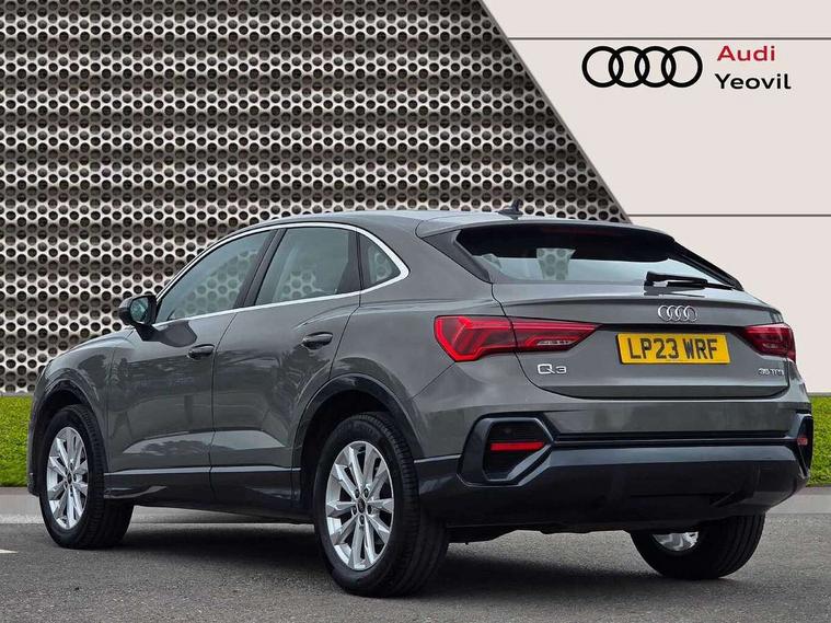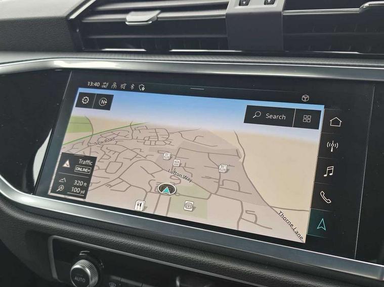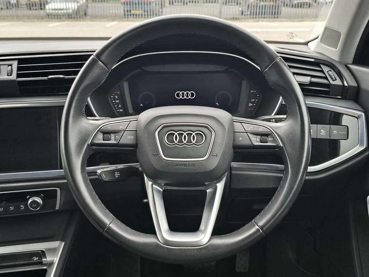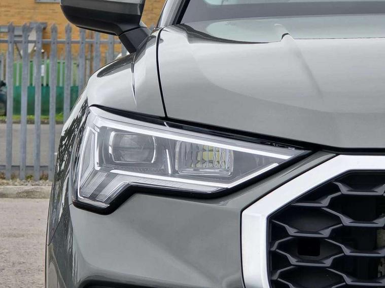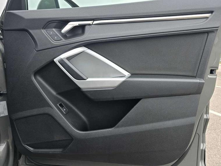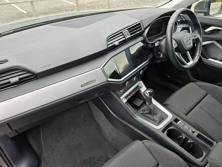 Audi drive select, Audi lane departure warning, Audi smartphone interface includes wireless Apple carplay/Android Auto, Audi Virtual Cockpit - 10.25" display, Bluetooth interface, Camera based traffic sign recognition, Legal emergency call, MMI Navigation Plus with high resolution 10.1 inch touchscreen colour display, Power operated tailgate, Progressive steering, Service interval indicator, Start stop system with recuperation, Voice control system with natural language interaction, Sports suspension, 2 USB-C ports with charge and data functions, 6 passive loudspeakers, DAB digital radio module, Acoustic windscreen, Aluminium window trim, Auto dimming door mirrors, Auto dimming frameless rear view mirror, Bumpers and underbody protection in contrasting manhattan grey paint finish, Diffuser grille in grained matt black, Diffuser trim in manhattan grey metallic, Door sill trims with illuminated aluminium inlay, Electrically folding, adjustable and heated door mirrors with integrated LED side indicators and kerb view function for passenger side, Front and rear electric windows, Front fog lights, Front side air inlets in Manhattan grey metallic, Grille surround in aluminium silver matt, High gloss black finish B and C pillars, Honeycomb design radiator grille in matt anthracite black, LED headlights with LED daytime running lights, LED third brake light, Rain and light sensors, Rear side wing doors, Rear wiper, Variable front intermittent wipers, 12V socket in rear centre console, 3 seat bench in 2nd row, 3 spoke multi-function leather steering wheel, 40:20:40 folding with manual adjustment for 60:40 forwards/backwards position and backrest angle, Dual zone electronic climate control, Electric lumbar support, Front and rear floor mats, Front and rear headrests, Front centre armrest, Height and reach adjustable steering wheel, ISOFIX child seat mounting for front passenger with airbag deactivation and outer rear seat including top tether attachment point for outer rear seats, Luggage compartment sill protection in stainless steel, Lunar silver cloth headlining, Manual front seats with height adjustment, Single front passenger seat, Non smoking pack - Q3, 3x3 point rear seatbelts, 6 airbags - Driver, front passenger, curtain and side windows, Audi pre-sense front with pedestrain and cyclist recognition, Electrically operated child locks on rear doors, Electromechanical parking brake, Electronic stabilisation control including ABS, ASR and EDL, Front seatbelt reminder, Hill descent control, Hill hold assist, Pre sense basic, Seatbelt monitoring, Tyre pressure warning, Warning triangle and first aid kit, Anti theft alarm, Anti theft wheel bolts, Immobiliser, Remote central locking, Aluminium look interior elements, Detail dashboard around MMI touch colour display in glass look, black with surround in aluminium look, Micrometallic silver inlay,