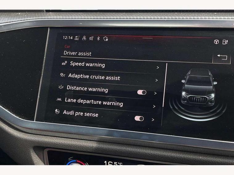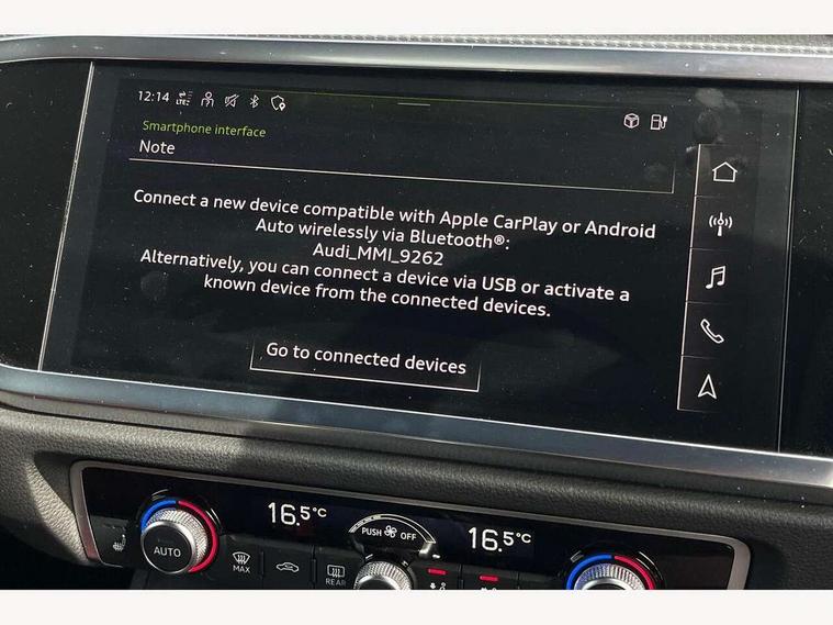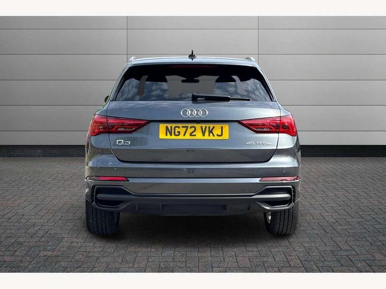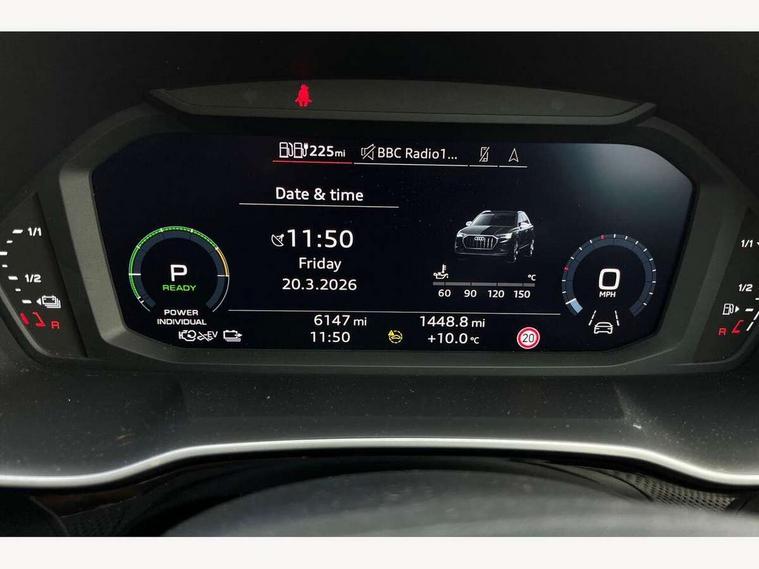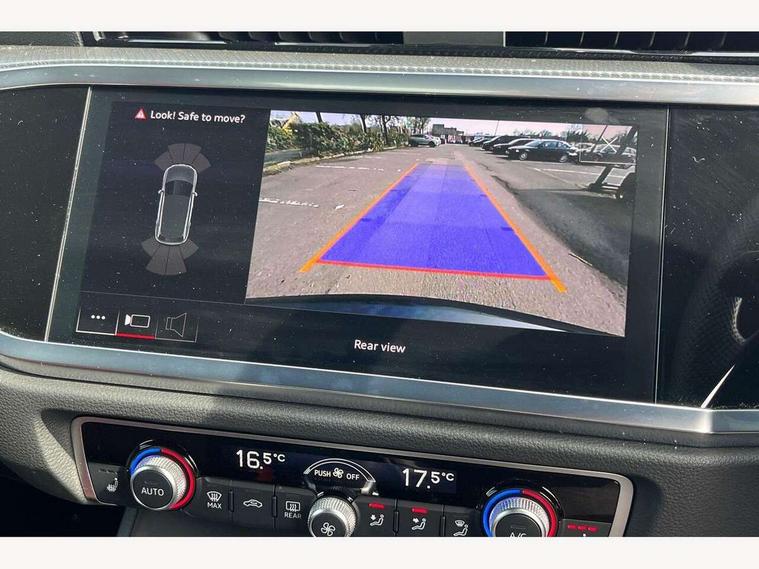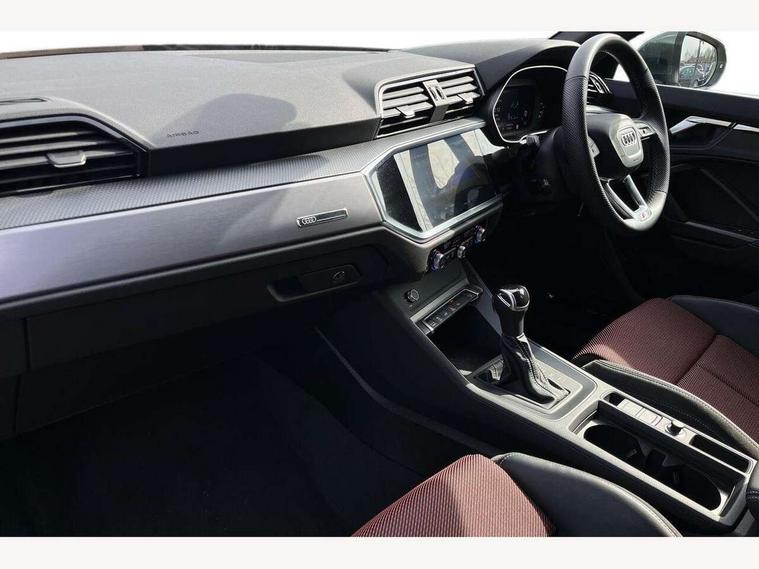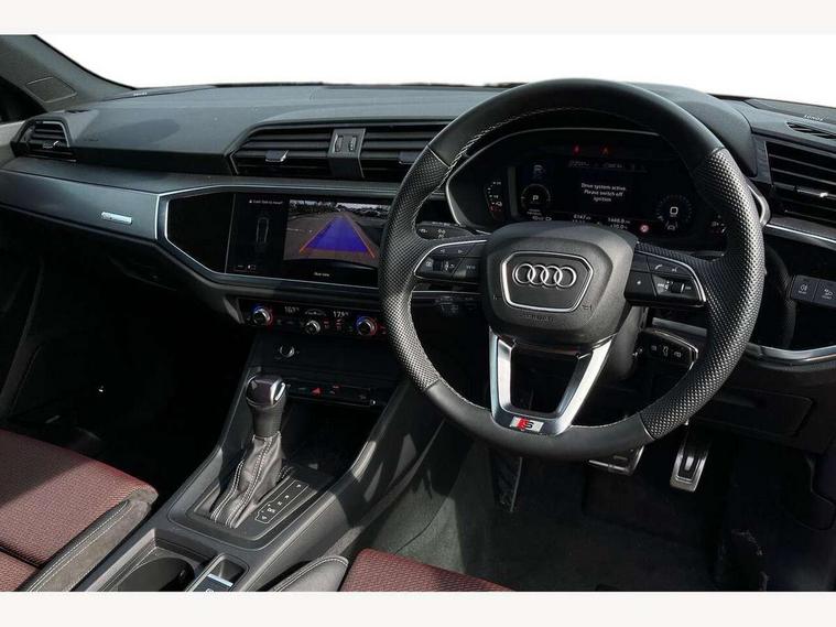 Amazon alexa Integration, Audi drive select, Audi lane departure warning, Audi Virtual Cockpit - 10.25" display, Bluetooth interface, Camera based traffic sign recognition, Legal emergency call, MMI Navigation Plus with high resolution 10.1 inch touchscreen colour display, Power operated tailgate, Progressive steering, Service interval indicator, Smartphone interface includes wireless Apple carplay/Android Auto, Start stop system with recuperation, Voice control system with natural language interaction, 3 pin 10 amp domestic charging cable, 3.6 kw On-board charger, Type 2 mode 3 32 amp charging cable, Type 2 socket for AC charging, 2 USB-C ports with charge and data functions, 6 passive loudspeakers, DAB digital radio module, Acoustic windscreen, Aluminium roof rails, Aluminium window trim, Auto dimming frameless rear view mirror, Body colour front spoiler blade, Body coloured bumpers, Electrically folding, adjustable and heated door mirrors with integrated LED side indicators and kerb view function for passenger side, Front and rear electric windows, Front fog lights, Front side air inlets in matt platinum grey, Grille vertical bars in aluminium silver/Matt, High gloss black finish B and C pillars, LED Dynamic rear indicators, LED headlights with LED daytime running lights, LED rear lights, LED third brake light, Privacy glass dark tinted rear and rear-side windows (from B-pillar backwards), Rain and light sensors, Rear diffuser grille in grained matt black, Rear diffuser strip in matt titanium black, Rear side wing doors, Rear wiper, S line badges on front wings, S Line front and rear bumpers, Side skirt insert in matt Platinium grey, Titanium black radiator grille, Variable front intermittent wipers, 12V socket in rear centre console, 3 seat bench in 2nd row, 40:20:40 folding with manual adjustment for 60:40 forwards/backwards position and backrest angle, Adjustable rear seat bench/backrest with centre armrest and cupholder, Black cloth headlining, Dual zone electronic climate control, Front and rear black floor mats with contrast stitching in rock grey, Front and rear headrests, Front and rear roof module including reading lights, Front centre armrest, Glove compartment lighting, Height and reach adjustable steering wheel, Illuminated door sill trims with S logo, ISOFIX child seat mounting for front passenger with airbag deactivation and outer rear seat including top tether attachment point for outer rear seats, Luggage compartment light, Manual front seats with height adjustment, Perforated leather gearknob, Single front passenger seat, Stainless steel luggage compartment sill finisher, Stainless steel pedals, Ambient lighting pack - Q3, Non smoking pack - Q3, 3x3 point rear seatbelts, 6 airbags - Driver, front passenger, curtain and side windows, Audi pre-sense front with pedestrain and cyclist recognition, Electrically operated child locks on rear doors, Electromechanical parking brake, Electronic stabilisation control including ABS, ASR and EDL, Front seatbelt reminder, Hill descent control, Hill hold assist, Pre sense basic, Seatbelt monitoring, Tyre pressure warning, Warning triangle and first aid kit, Anti theft alarm, Anti theft wheel bolts, Immobiliser, Remote central locking, Dark matt brushed aluminium inlay, Detail dashboard around MMI touch colour display in glass look, black with surround in aluminium look, Leatherette door armrest, Tool kit, Tyre repair kit,