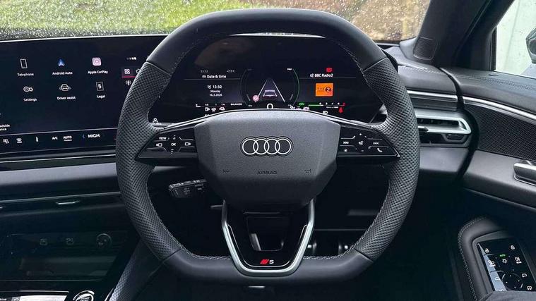 Adaptive cruise control, Attention and drowsiness detection with driver observation, Audi application store, Audi assistant, Audi connect emergency call and service, Audi drive select, Audi virtual cockpit plus with 11.9" OLED colour display, Automatic start/stop system with coasting functionality, Camera based traffic sign recognition, Convenience key, Intersection assist, Lane departure warning, MMI navigation plus with high resolution 14.5" OLED touchscreen colour display, Park assist plus, Parking system plus with 360 display, Progressive steering with servotronic, Rear view camera, Side assist and exit warning, rear cross-traffic assist and rear turn assist, Smartphone interface, Swerve assist and turn assist, Traffic sign based speed limiter, Household plug type G, Hybrid propulsion system, Industrial connector CEE 32A, 230V, long and straight for the e-tron charging system, Mode 3 type 2 AC charging cable 22kW, Sports suspension lowered by 20mm, Audi sound system impressive sound with 8 loudspeakers including centre speaker and subwoofer, 6-channel amplifier with a total output of 180 watts, DAB digital radio reception, Smartphone compartment with wireless charging, Aluminium window trims, Auto dimming rear view mirror, Body colour door handles, Body colour door mirrors, Door mirrors - electrically adjustable, heated, folding and auto dimming on both sides, Front and rear electric windows, Front door sill trims with aluminium inlays, illuminated with 'S' logo, High beam assist, LED headlights Plus incl. digital daytime running lights, turning light, all-weather light, motorway light, manouevring light and intersection light, LED rear lights pro incl. dynamic rear indicators and illuminated light strip with animated coming and leaving home function, LED third brake light, Privacy glass, Rear and side windows with heat insulating glass, Rear boot, Rear side wing doors, S Line badges on the front wings, S line bumpers, radiator grille and diffuser in phantom black and diffuser insert in matt anthracite, White rhombus logo projection light in exterior mirrors, Windscreen with acoustic glazing, 3 rear headrests, 3 seat rear bench, 3 spoke leather steering wheel with multi-function buttons with touch control, flattened on top and bottom, with S badging and contrast stitching, 3-zone automatic climate control, 40:20:40 split folding rear seat bench with centre armrest and cup holders, Auxiliary air conditioning, Comfort front centre armrest, Front and rear floor mats, Front sport seats with integrated headrest and S embossed logo, Headlining in black cloth, i-Size child seat mounting on the front passenger side and outer rear seats, i-Size and top tether on the outer rear seats, Increased charging capacity for USB ports 2X100 Watts in rear, 2X60 Watts in front, Luggage compartment lid, electrically opening and closing, Manual steering column height and depth adjustment, Single front passenger seat, Stainless steel pedals and footrest, Steering wheel grips in perforated leather and shift paddles, Ambient lighting package plus - A5, 3x3 point rear seat belts, Acoustic vehicle alerting system, Driver airbag, Electric child safety locks, First aid kit with warning triangle and vests, Front emergency brake assist, Front passenger airbag, Front passenger airbag deactivation, Front side airbags with head airbag system and front interaction airbag, Hill hold assist, Seat belt monitoring with rear seat occupant reminder, Tyre pressure loss indicator, Anti theft alarm, Anti-theft wheel bolts, Digital key, Keyless Go, Accent surfaces and control buttons in gloss black, Black dashboard with contrast stitching, Inlays in matt brushed aluminium with linear embossing, anthracite, Softwrap in leatherette with contrast stitching, Upper and lower interior elements in leatherette, Tyre repair kit,