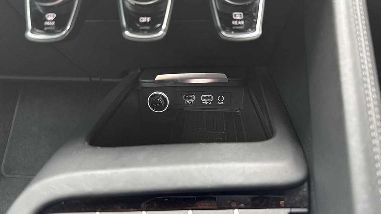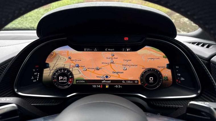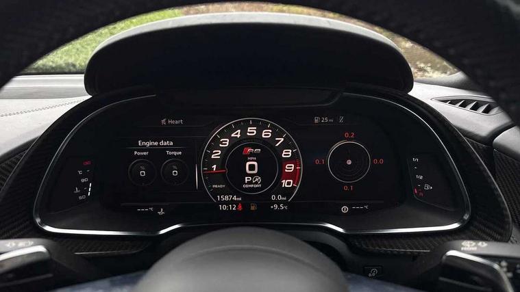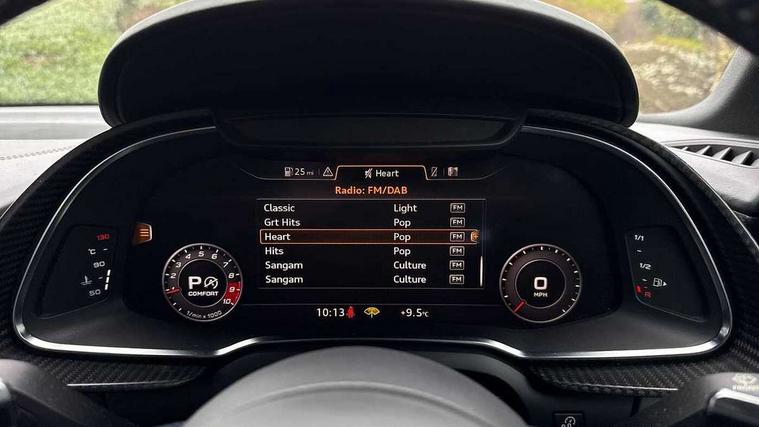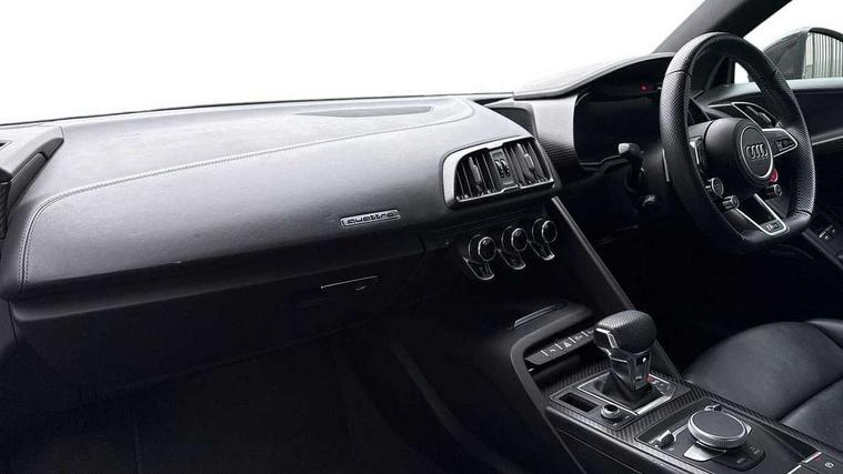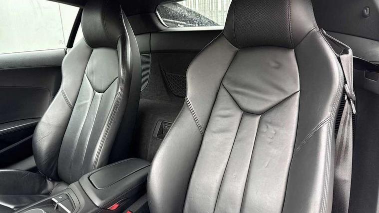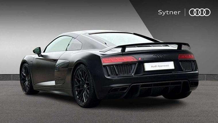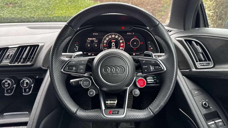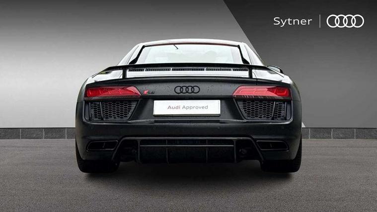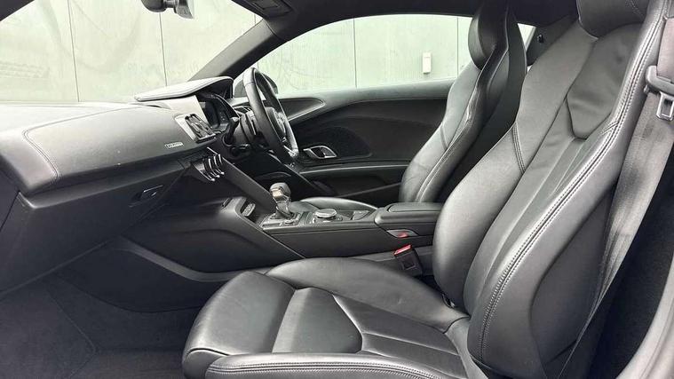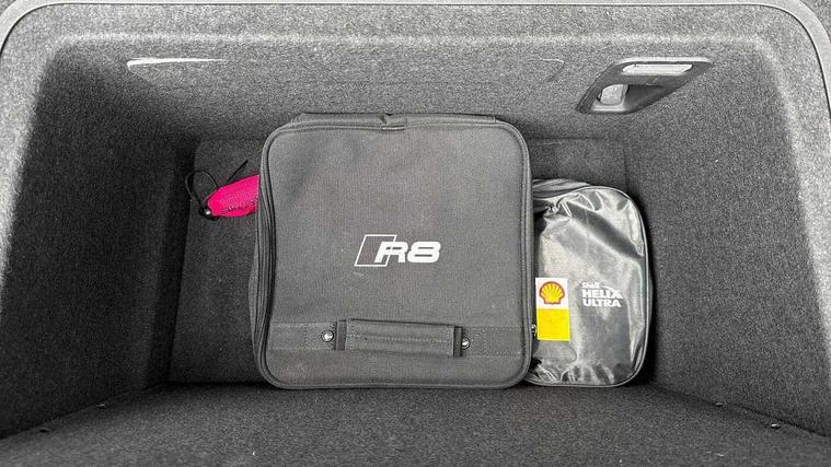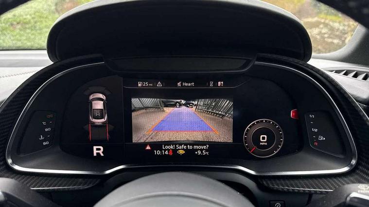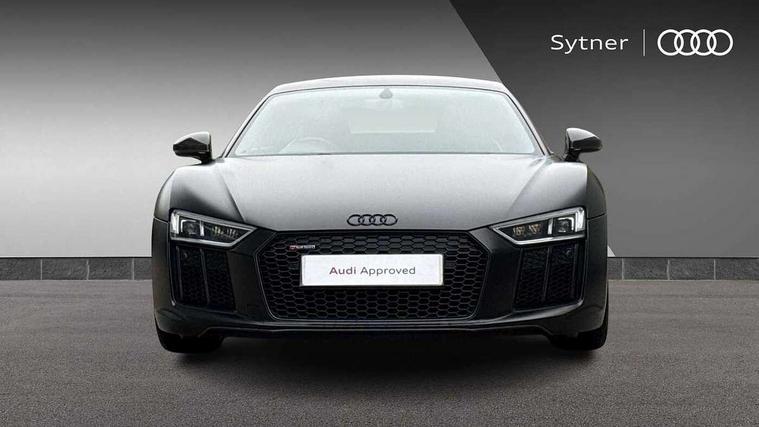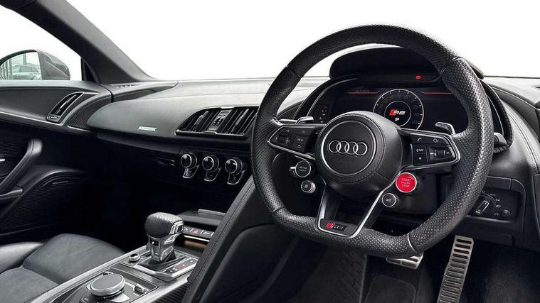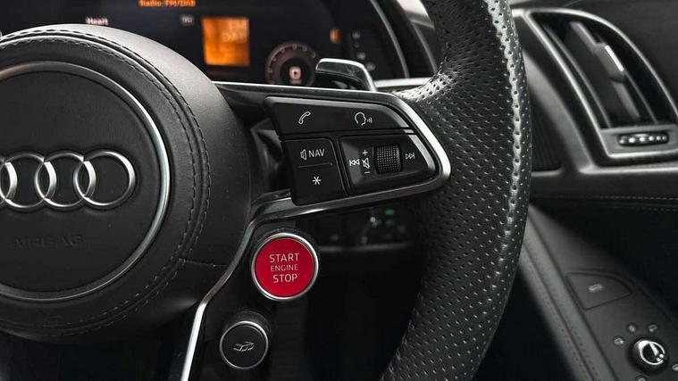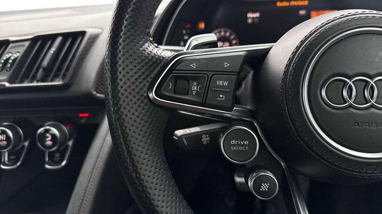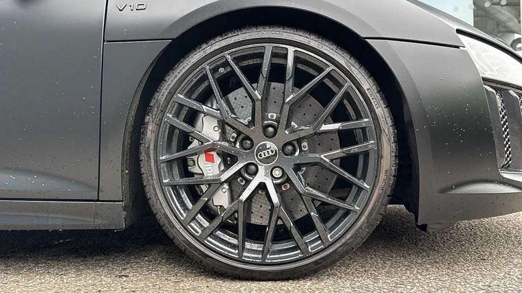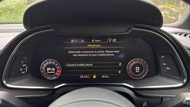 Audi connect, Audi drive select with performance mode, Audi parking system plus with front and rear sensors, Audi virtual cockpit - 12.3" high-resolution LCD display with fully customisable instrument cluster, Bluetooth connectivity with voice control, Cruise control + speed limiter, Driver's information system, MMI navigation plus with DVD, SD card reader, 10GB music storage, MMI touch panel, Service interval indicator, V10 Plus sports suspension, 2 USB ports, Audi music interface, Auxiliary input socket, DAB Digital radio, Air inlet in Anthracite gloss black, Aluminium fuel cap, Audi Beam uses LEDs to project the Audi Sport logo, Auto dimming rear view mirror with light and rain sensors, Body colour bumpers, Electric front windows, Electrically adjustable and heated door mirrors, Folding door mirrors, Gloss anthracite black air outlets, Gloss Carbon rear spoiler, Green tinted glass, Heat insulating glass, Heated rear window, Laminated windscreen, LED daytime running lights, 3 spoke flat bottomed multifunction performance leather steering wheel with 4 operating satellites, Adjustable steering column, Aluminium gear selector, Aluminium gear shift paddles, Ambient lighting, Deluxe climate control, Driver and passenger footwell lighting, Electric front seat height adjustment, Engine Compartment Light, Illuminated door pockets, Illuminated glovebox, Integrated front head restraints, Interior light with delay, Luggage compartment lighting, Reading lights, Stainless steel pedals and foot rest, ABS/EBD, ASR, Ceramic brakes, Curtain Airbag, Driver/front passenger airbag, EDL traction control, ESP, Front passenger airbag deactivation, Front side airbags, Gloss anthracite brake calipers, Hill hold control, Tyre pressure monitoring system, Warning triangle and first aid kit, Advanced key, Anti theft system, Electronic immobiliser, Locking wheel bolts, Preparation for tracking system, Remote central locking, Valet parking key, Extended inlays in matt Carbon surrounded for Audi virtual cockpit and air vents, Matt carbon inlay, Tyre repair kit,