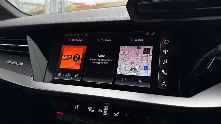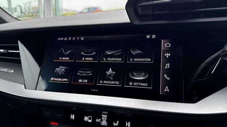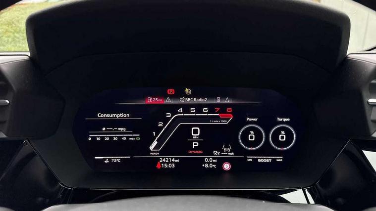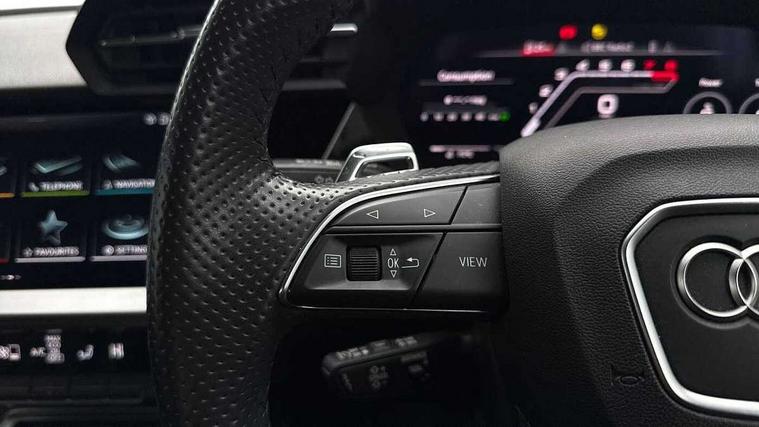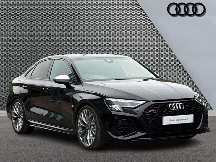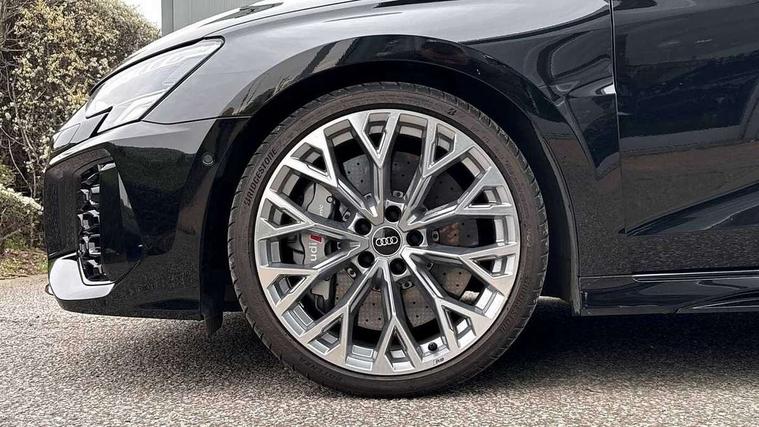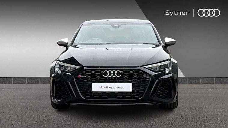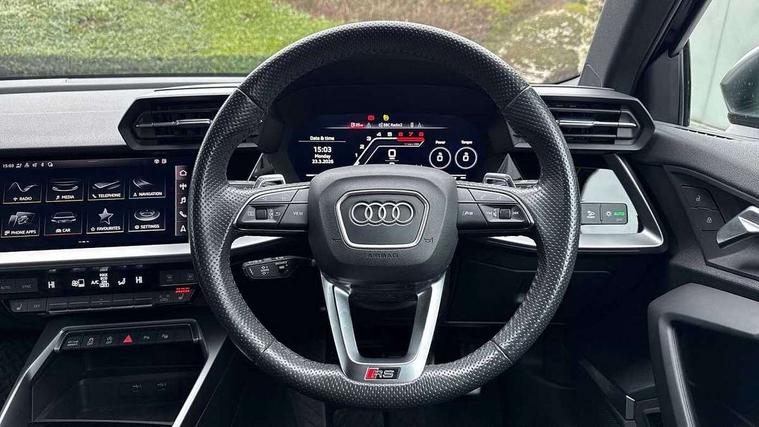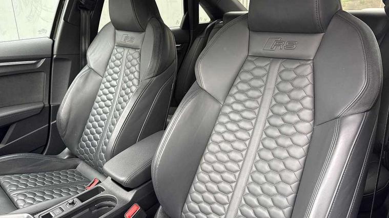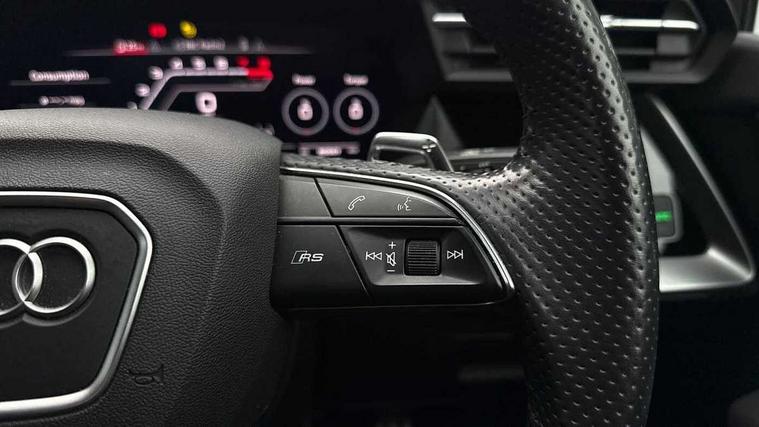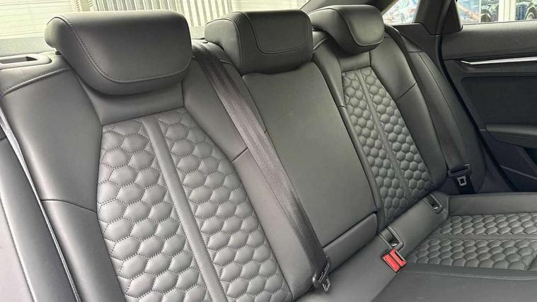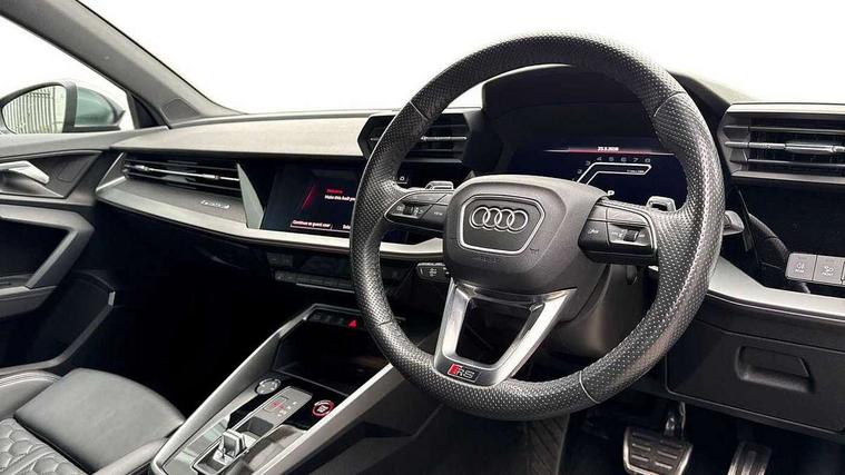 Audi connect emergency call and service, Audi smartphone interface, Audi virtual cockpit with RS specific display 12.3" full colour digital instrument cluster, Automatic start/stop system with recuperation, Bluetooth interface, Collision avoidance assistant, Lane departure warning system, Legal emergency call, Manual boot opening, Parking assist with parking system plus, Progressive power assisted steering, Quattro permanent four wheel drive, Rear suspension, Audi sound system impressive sound with 10 loudspeakers including centre speaker and subwoofer, 6-channel amplifier with a total output of 180 watts, DAB Digital radio, 3rd brake light, Acoustic glass windscreen, Audi beam uses LEDs to project the Audi sport logo onto the ground as you exit your RS 3, Auto dimming rear view mirror, Black side skirts, Body colour roof, Door mirrors - electrically adjustable, heated, folding and auto dimming on both sides, Headlight washers, LED headlights with LED rear lights + dynamic rear indicators, Light and rain sensors, Matt aluminium door mirrors, Matt aluminium window trims, Privacy glass - dark tinted rear and rear side windows from B-pillar backwards, 40/20/40 split folding rear seat bench, Black cloth headlining, Dual zone electronic climate control, Front and rear headrests, Front centre armrest, Front sports seats RS embossed logo, Front/rear floor mats, Heated front seats, Honeycomb stitching and RS embossing, Illuminated door sill trims inlays in aluminium with RS 3 logo, Manually adjustable front seats, RS emblems, Stainless steel pedals and front footrest in black, Aluminium interior elements pack - RS3, Ambient lighting pack - RS3, MMI navigation plus with MMI touch - RS3, RS bodystyling - RS3, Storage Pack - RS3, 3x3 point rear seat belts, ABS/EBD, ASR, Audi pre sense front, Driver/Front Passenger airbags, EDL, ESC - Electronic Stability Control + traction control, Front passenger airbag deactivation, Front side airbags with head airbags and interaction airbag, Hill hold assist, Seat belt reminder with passenger presence detection in rear, Tyre pressure loss indicator, Warning triangle and first aid kit, Anti theft alarm, Anti-theft wheel bolts, Electronically operated child lock, Remote control central locking, Carbon inlays, accent surfaces in the dashboard and centre console in platinum grey silk effect paint finish, 19" 10 Y spoke platinum grey, gloss turned finish alloy wheels, Tool kit, Tyre repair kit,