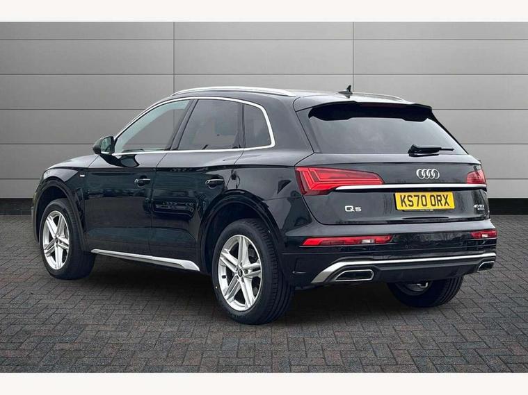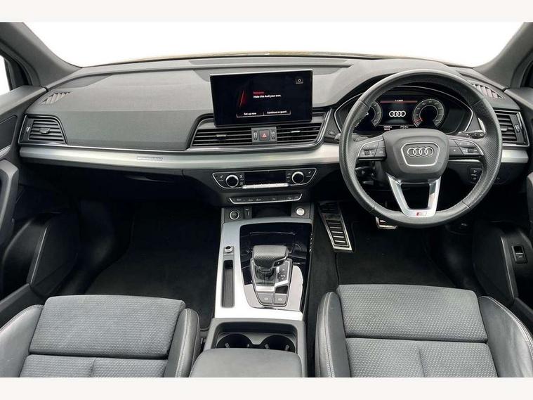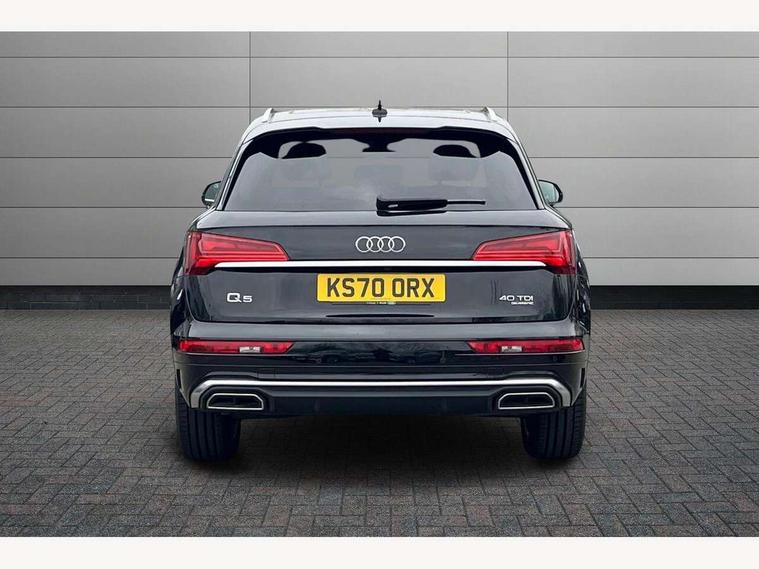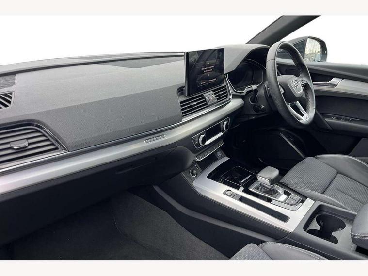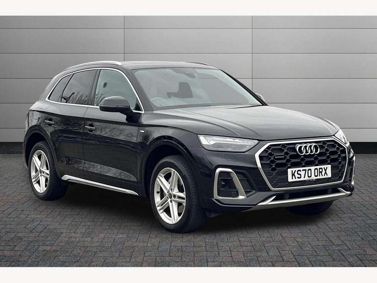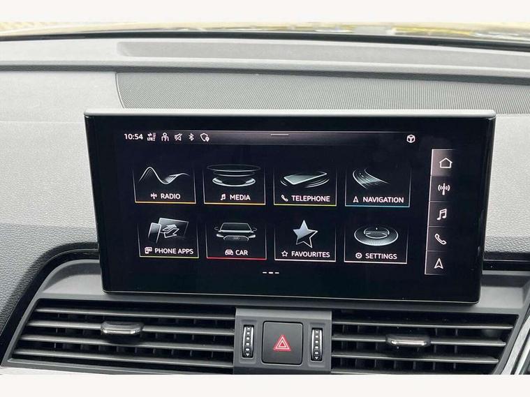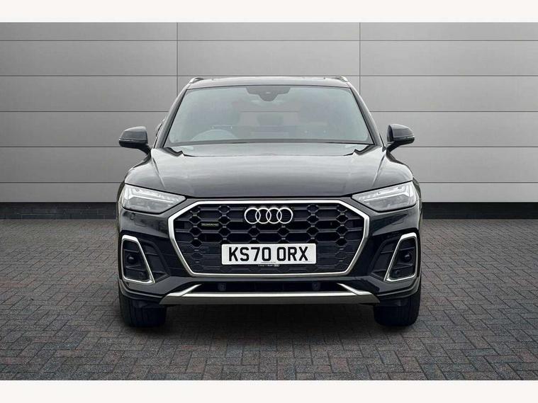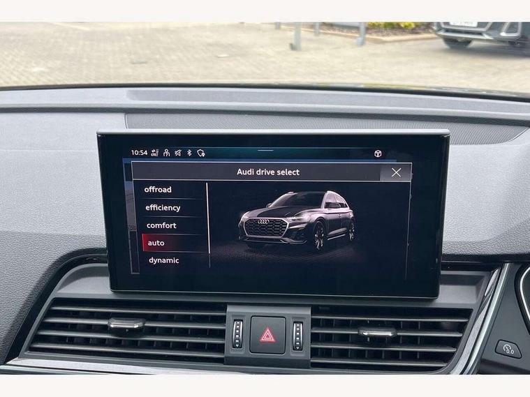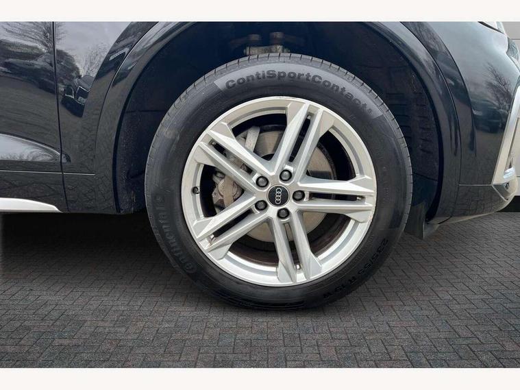 Amazon alexa Integration, Audi connect safety and service (e-call), Audi drive select, Audi virtual cockpit plus with 12.3" screen and three different layout designs, Audi wireless smartphone interface, Automatic start-stop system with coasting functionality and efficiency programme, Electro - mechanical power assisted steering, MMI navigation plus with 10.1" touch screen, Mobile telephone preparation - bluetooth interface, Power tailgate, Service interval indicator, Voice control system with Audi hotword activation "Hey Audi", Diesel particulate filter, Quattro on demand, 2 USB charging ports, DAB Digital radio, Acoustic windscreen, Aluminium roof rails, Audi matrix LED headlights with LED rear lights + dynamic front and rear indicators, Auto dimming rear view mirror, Automatic headlight adjustment, Automatic headlights and windscreen wipers, Body colour bumpers, Body colour door mirrors, Body colour rear diffuser with matt aluminium silver surrounds, Body colour underbody protection, Chrome plated exhaust trims, Door sills in Selenite silver, Electric adjustable/heated/folding door mirrors, Front air inlet surrounds in aluminium, Front and rear electric windows, Front radiator grille in honeycomb design, Headlight washers, Lower bumpers painted in contrast Manhattan grey, Rear chrome trim strip below lights, Rear privacy glass and rear side windows, Rear spoiler, Rear wiper, Roof bars, S Line badges on the front wings, S Line front and rear bumpers, S Line side skirts, 3 rear headrests, 40:20:40 split folding rear seat with rear centre armrest, Black cloth headlining, Contrast stitching on seats, steering wheel and gear lever gaiter, Deluxe 3 zone electronic climate control, Front centre armrest, Front/rear floor mats, Gear lever in black leather, Heated front seats, Height adjustable front head restraints, Height/reach adjustable steering column, Illuminated door sill trims with S logo, ISOFIX child seat mounting and top tether, Manual seat adjustment with 4-way electric lumbar support, Removable luggage compartment floor, Stainless steel pedals, Sunvisors with vanity mirrors, Tool kit, Trunk roller cover, High gloss pack - Q5, LED interior light pack - Q5, 3 point seatbelts on all seats, 6 airbags - Driver, front passenger, curtain and side airbags, Electrically operated child locks on rear doors, Electromechanical parking brake, Electronic stabilisation control including ABS, ASR and EDL, Front passenger airbag deactivation, Hill descent control, Hill hold assist, Multi collision brake assist, Pop-up bonnet for pedestrian protection, Pre sense city, Seat belt force limiter, Seatbelt monitoring, Tyre pressure warning, Warning triangle and first aid kit, Anti theft alarm, Anti-theft wheel bolts, Keyless Go access/ignition system, Matt brushed aluminium inlays,