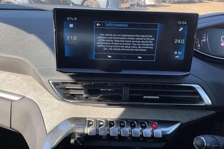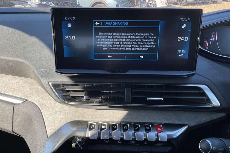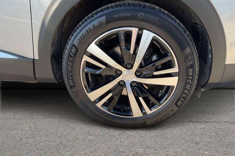 3D connected navigation with 10" HD touchscreen + voice recognition system, Blind spot detection system, Bluetooth telephone facility, Drive modes select (Eco, normal and sport), Driver Attention Alert level 3, Driving Time Warning (DAA1), Emergency services call system, Extended traffic sign recognition, Exterior temperature indicator with ice warning, Lane departure warning system, Lane Keeping Assistance (LKA) with road edge detection, Mirror screen with Apple CarPlay and Android auto, Multi function trip computer, PEUGEOT i-Cockpit with compact sports steering wheel, PEUGEOT i-Cockpit with configurable 12.3" Head-up digital instrument panel, PEUGEOT SOS and assistance, Rear parking sensor, Rear passenger USB charging sockets (x2) (type A), Speed limit recognition and recommendation, Dynamic stability control and electronic anti-skid system, DAB Digital radio, USB socket in front centre console, 2 X Rear number plate lights, Auto self levelling headlights, Automatic hazard light activation upon heavy brake application, Automatic triggered rear windscreen wiper in reverse gear, Black with chrome detailed front wing trim, Body colour door handles, Body colour rear roof spoiler with stainless steel edging trim, Body protectors (wheel arches + protection at bottom of doors) in black, Dark tinted rear side windows + tailgate window, Diamond Black door mirror shells, Electric heated folding door mirrors, Front windscreen wiper with magic wash cleaning system, Full LED headlights with fog mode, Gloss black B and C pillar and aerodynamic deflector trim, Gloss black front bumper air scoops, Gloss black rear cluster connecting strip, Gloss black windscreen trim, GT emblems on tailgate, Headlights left on audible warning, Heated rear windscreen with integrated antenna, High beam assist, LED daytime running lights in fang style, LED front indicator, LED side indicator lights integrated into door mirrors, LED third brake light, One touch electric front/rear windows with pinch protection, Rear LED Peugeot signature 'Claw Effect' lights with clear lens and scrolling LED direction indicators, Rear side wing doors, Twin exhaust effect trim, 1/3 to 2/3 split folding rear seats, 12V Sockets in dashboard, rear cabin and load area, 2 cupholders in front centre console, 2 x Rear reading spotlights, 2x Rear coat hooks, 3x Isofix child seat fittings in the front passenger and outer rear seats, 4 Grab handles retractable and damped, Aikinite stitching in armrest, gear lever and dashboard facia, Aluminium pedals, Blue ambient lighting for connecting zone, Blue ambient lighting to front door panels, central cup holders, Blue ambient lighting to headup instrument panel, Centre front armrest with butterfly wing opening and illuminated storage compartment, Driver seat manual adjustment (longitudinal and back rest angle), Dual zone automatic climate control, e-Toggle compact gear selector, Electric power steering with reach and rake adjustable steering column, Flocked front door pocket interior with blue ambient lighting, Flocked glovebox interior, Foldable front passenger seat with picnic table, Footwell illumination, Front interior light with 2 reading spotlights and rear interior light with timer, Front seat back map pockets, Gear shift indicator, Illuminated glove box, central storage area and load area, Illuminated vanity mirrors, Individual left and right controls in boot for seat folding, LED interior lighting in storage spaces and load area, LED roof interior lighting, Mistral floor mats with Aikinite contrast stitching, Mistral full grain perforated leather steering wheel with aikinite stitch detail and satin chrome 'GT' emblem, Rear armrest with ski flap and two cup holders, Rear bench seat with central armrest and ski hatch, Rear centre console ventilation system, Roof lining - Mistral black, Satin chrome dashboard trim, Satin chrome digital instrument panel, Satin chrome front door panel recess trim, Satin chrome interior door handles, Satin chrome scorpion's tail and toggle switch trim, Seatbelt not fastened audible and visual alert for front seats, Seatbelt unfastened on the move audible and visual alert for front and rear seats, Two position boot floor, Drive assist plus pack with front parking sensors - 3008, Visibility pack - 3008 GT, 3x Rear three-point retractable seatbelts with force limiters in the outer rear seats, ABS (Anti-lock Braking System) with EBD (Electronic Brakeforce Distribution) and EBA (Emergency Braking Assistance), Adaptive driver and front passenger airbags with passenger airbag deactivation function, Driver and front passenger side airbags, Electric child locking functionality on rear windows and doors, Electric parking brake, Front and rear curtain airbags, Front optimised safety headrests and 3 x rear retractable headrests with height adjustable, Front three point retractable seatbelts height adjustable with pre tensioners and force limiters, Front ventilated disc brakes and rear disc brakes, Hill start assist, Two tone horn, Automatic door locking when moving off, Electronic immobiliser, key operated exterior door lock from the left hand door, Perimetric and volumetric alarm with lift and tilt sensor, Peugeot Open and Go System, Remote control central locking with two plip keys, Michelin e-primacy 225/55 R18 102V class A+ tyres, Tyre repair and inflation kit,